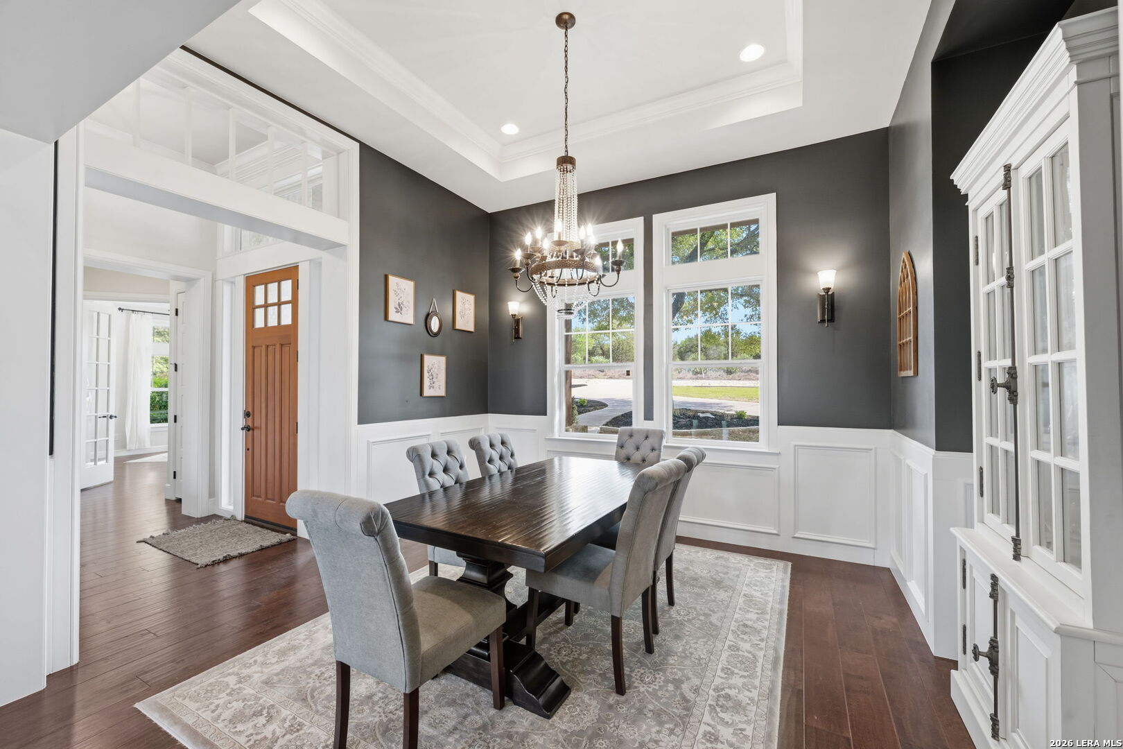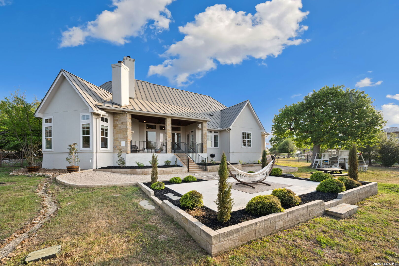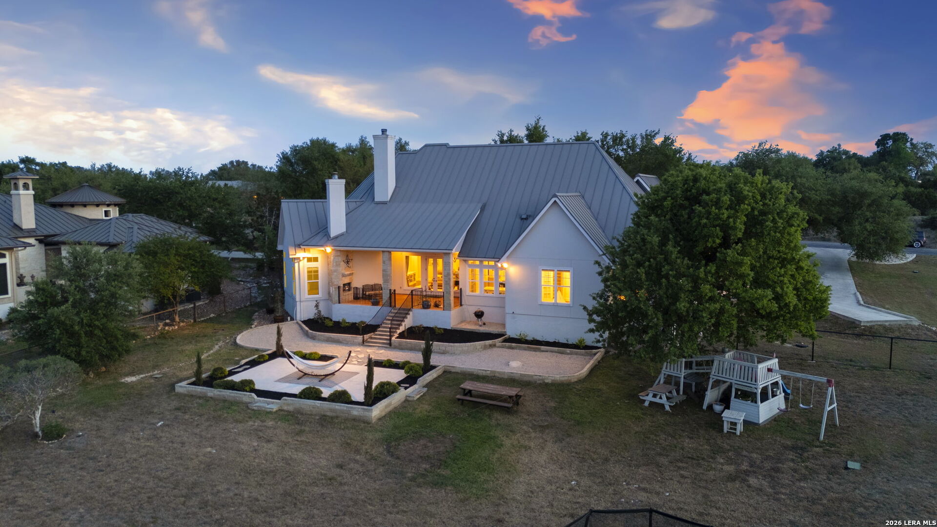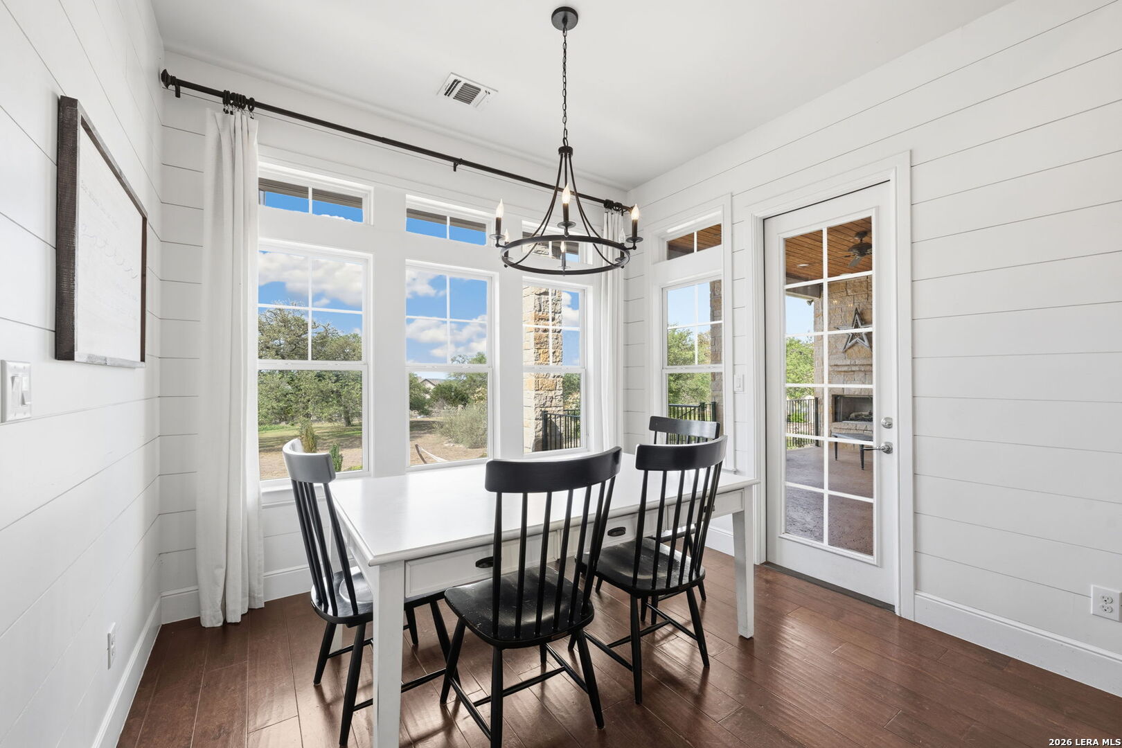 Tucked inside the gated Provence section of Vintage Oaks, this beautifully crafted 4-bedroom, 3.5-bath home offers 3,645 square feet of refined Hill Country living. Set on a private, tree-filled homesite that backs to a serene greenbelt, the property delivers both privacy and a true connection to nature. Inside, the open floor plan is designed for everyday comfort and effortless entertaining, with spacious living areas, abundant natural light, and quality finishes throughout. Rich woodworking details, crown moulding, beamed ceilings, and coffered ceiling treatments add depth and character, while the beadboard ceiling in the kitchen brings a warm, timeless touch. A fireplace anchors the family room, while an outdoor wood-burning fireplace sets the stage for relaxing on those cool Hill Country evenings. The kitchen flows seamlessly into the main living and dining areas, making it ideal for hosting. Upstairs, a large bedroom with a wet bar offers flexibility for a game room, guest retreat, or secondary living space. Outside, mature trees frame the property and enhance the peaceful setting, while the circle driveway provides additional parking and a grand sense of arrival. Located within one of the most sought-after gated sections of Vintage Oaks, this home combines privacy, craftsmanship, and lifestyle in the heart of the Texas Hill Country.