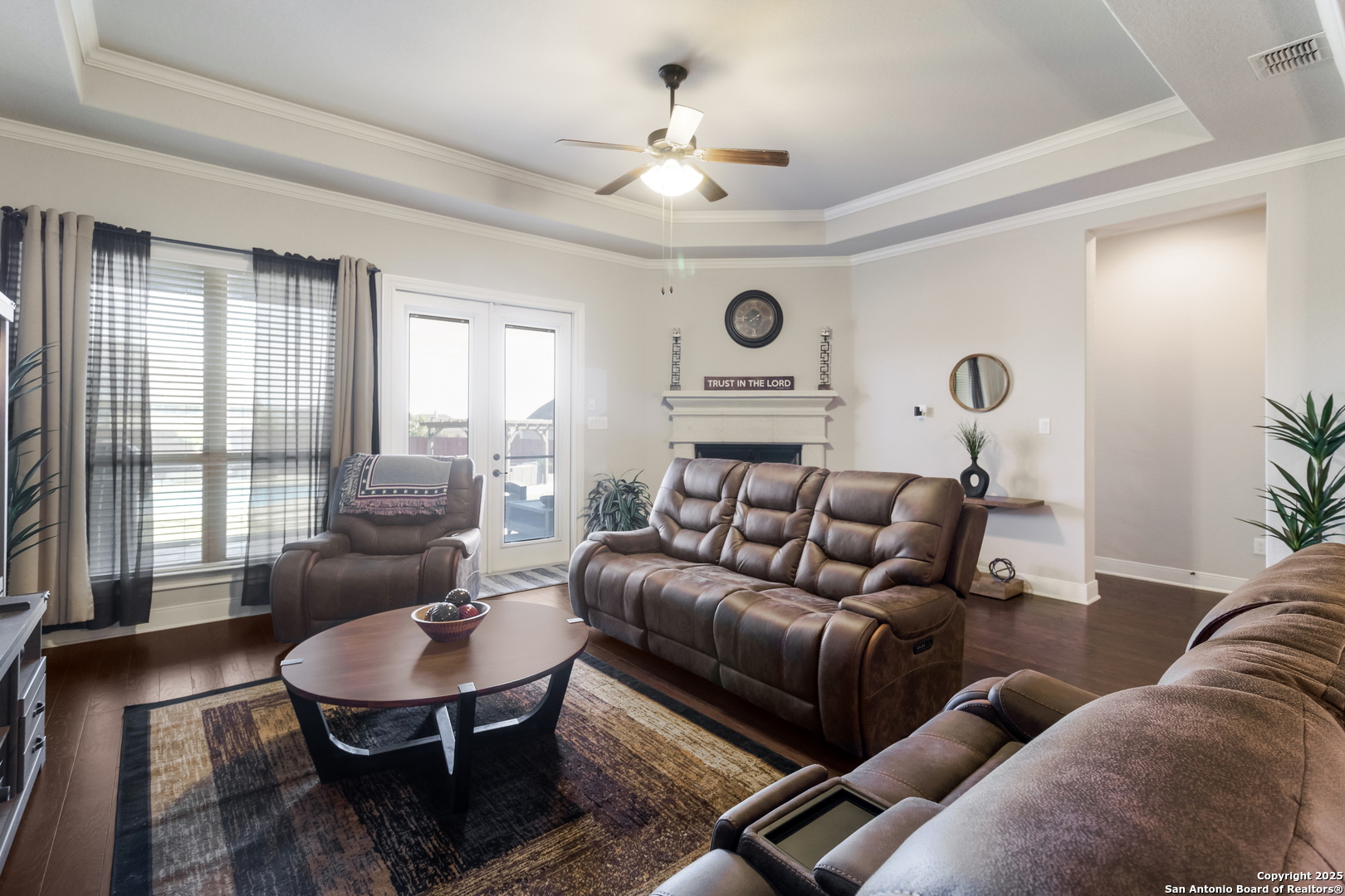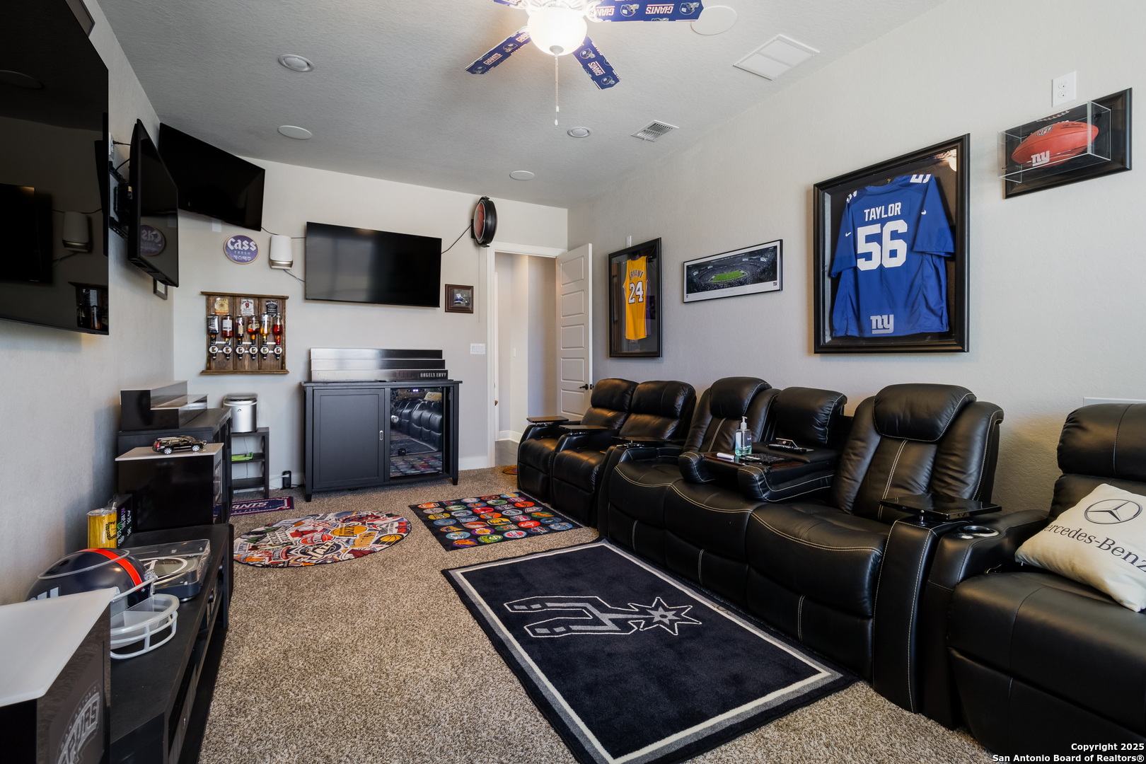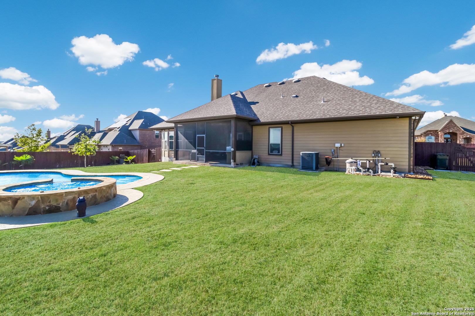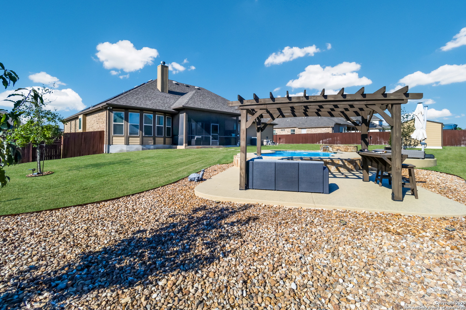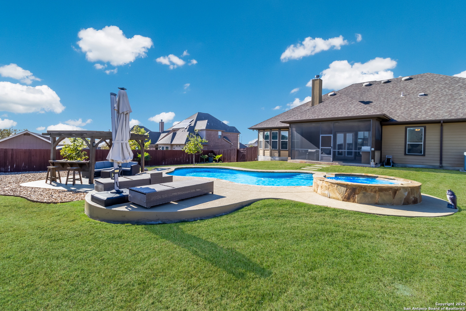 *BACK ON MARKET* This exceptional property is a rare gem and an entertainer's dream that is priced well, ready to sell, and move-in ready! Don't miss out on this opportunity to enjoy luxury living and energy-efficient features with easy access to all that San Antonio has to offer. *HOME INCLUDES A PAID OFF SOLAR PANEL SYSTEM* The Reserve at Schertz is a quiet and sought-after community just outside San Antonio, offering a peaceful retreat while maintaining convenient access to shopping, dining, entertainment, and major military installations like Randolph AFB (10 minutes away) and Fort Sam Houston (less than 20 minutes). This single-story home boasts exceptional curb appeal on just over half an acre lot with a stone facade, lush landscaping, and a custom entryway. Inside, you'll find a thoughtfully designed open floor plan with vaulted ceilings, crown moulding, recessed lighting, and a variety of high-tech upgrades to suit modern living. The private study is located just off the entry behind French doors, while the open concept living area with a fireplace provides an ideal space for hosting. The fully equipped surround sound theater room immerses your senses from the comfort of the 4 movie cinema chairs which come included with the home. The chef's kitchen shines with stainless steel appliances, granite countertops, and an oversized island with a deep double basin sink. The luxurious primary suite is split from the secondary bedrooms for maximum privacy, showcasing a large bay window, tray ceiling, an 85-inch TV, a spa-like ensuite with a garden tub, walk-in shower, separate dual vanities, and a spacious walk-in closet. The secondary rooms include a guest suite with a full bathroom ensuite, two spacious bedrooms, and a studio room with built-in speakers lined with recliners that makes for an amazing place to watch your favorite team. The bedrooms and media rooms have padded plush carpet, the bathrooms are ceramic tiled, and luxury hardwood floors fill the halls and living spaces. Enjoy year-round outdoor activities in this home's expansive backyard with a covered screened-in outdoor kitchen. Take a dip in the entertainer pool, lounge on the sunbathing chairs under the canopy shade, or gather at the hardscaped pergola seating area. Make it a party outdoors with the inground speaker sound system as you bask in the glow of the custom lighting arrangement. This beautiful home is wired for AT&T Fiber and move-in ready with you in mind! This one won't last long, so schedule your showing today!