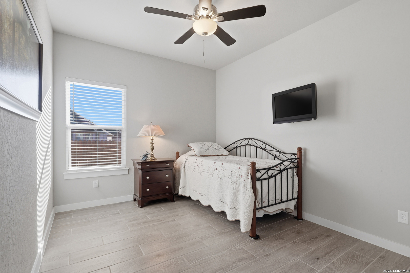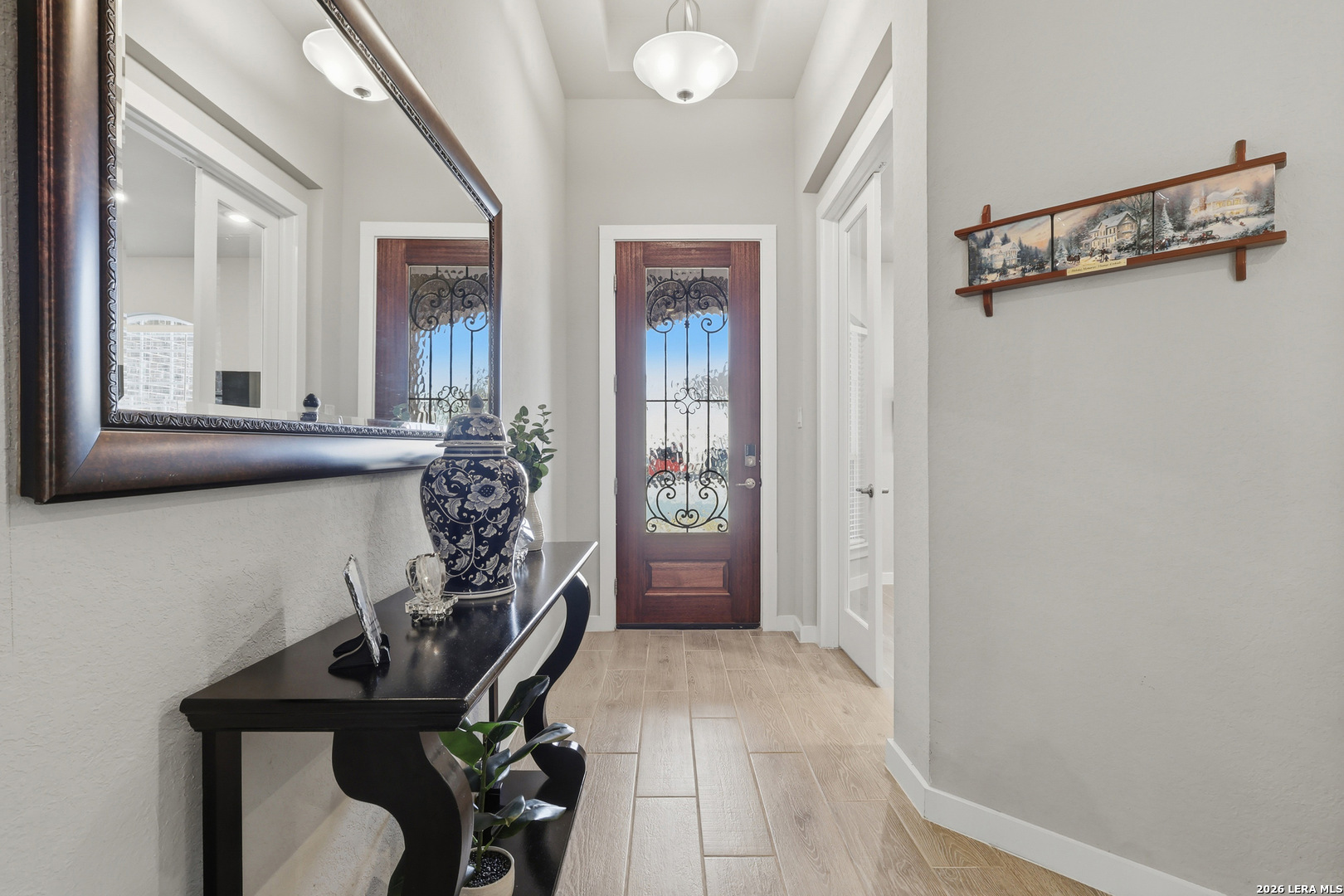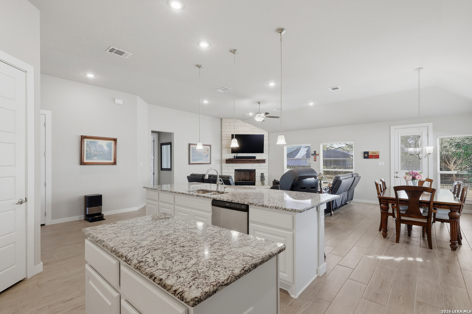 Entering the home, you step into a welcoming foyer where wood-style tile flooring flows through most of the home, creating a cohesive and low-maintenance design. Just off the entry, glass double doors lead to a private study - perfect for a home office or quiet retreat. The home then opens into a spacious living area with soaring ceilings, a striking stone fireplace, and large windows that frame the serene backyard view while allowing comfortable TV placement from the main seating area. The kitchen is designed for gathering and everyday living, featuring stainless steel appliances, abundant cabinetry, granite countertops, and a large island with seating. It opens seamlessly to the dining area and living space, creating an ideal layout for both daily routines and entertainment. The primary suite offers a relaxing retreat with high ceilings and abundant natural light. The ensuite bath includes dual granite vanities, a soaking tub, and a separate walk-in shower. Additional bedrooms provide flexible space for guests, hobbies, or work. Step outside to the enclosed covered patio overlooking the greenspace, where a wrought-iron back fence and wood privacy fencing create a comfortable outdoor setting for barbecues, quiet evenings, or starting your morning with your favorite beverage on the covered patio, listening to birds and enjoying peaceful views of the wooded green space just beyond the backyard. Landscaped beds finished with Arizona rock add color and texture while keeping maintenance simple. Neighborhood amenities - including a pool and workout gym - offer even more ways to enjoy the community. This beautiful one-story home combines natural light, thoughtful design, and peaceful greenspace views to create a truly inviting place to call home. Please be aware that some photos have been virtually staged. Please be aware that some photos have been virtually staged.