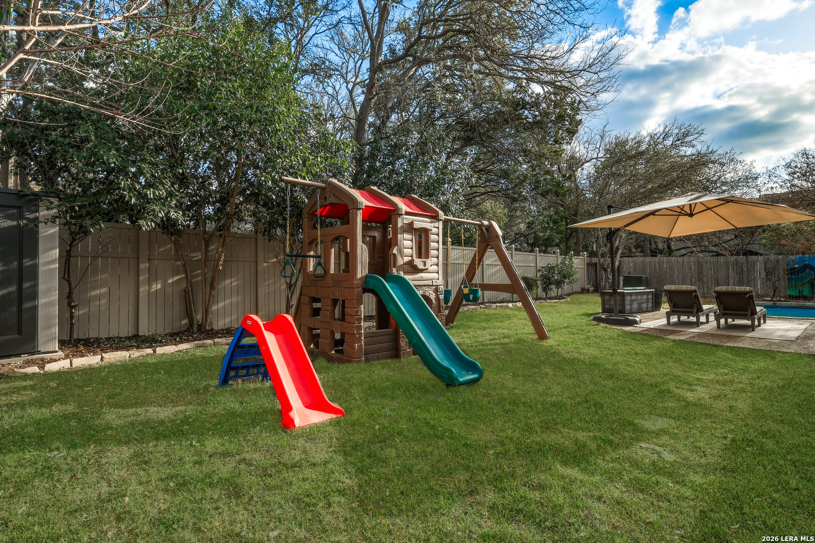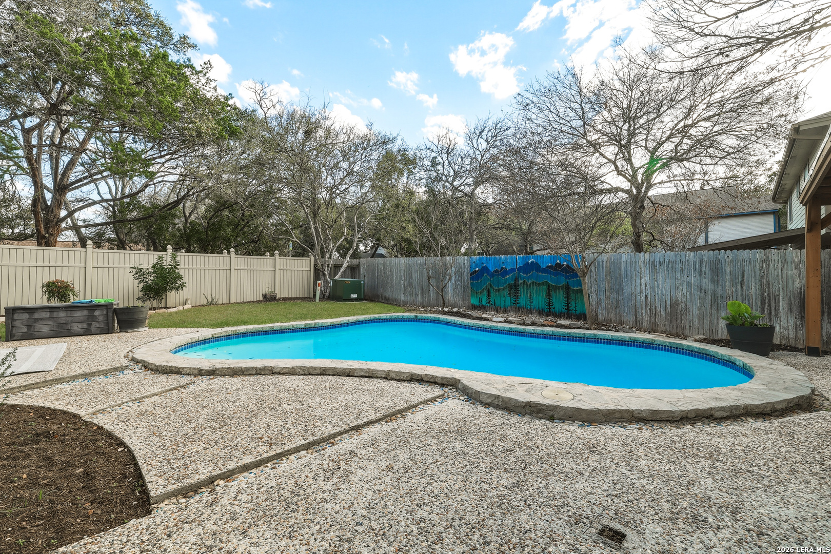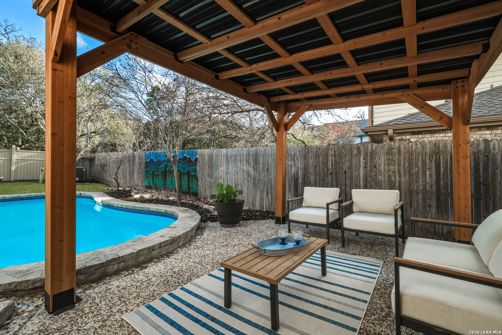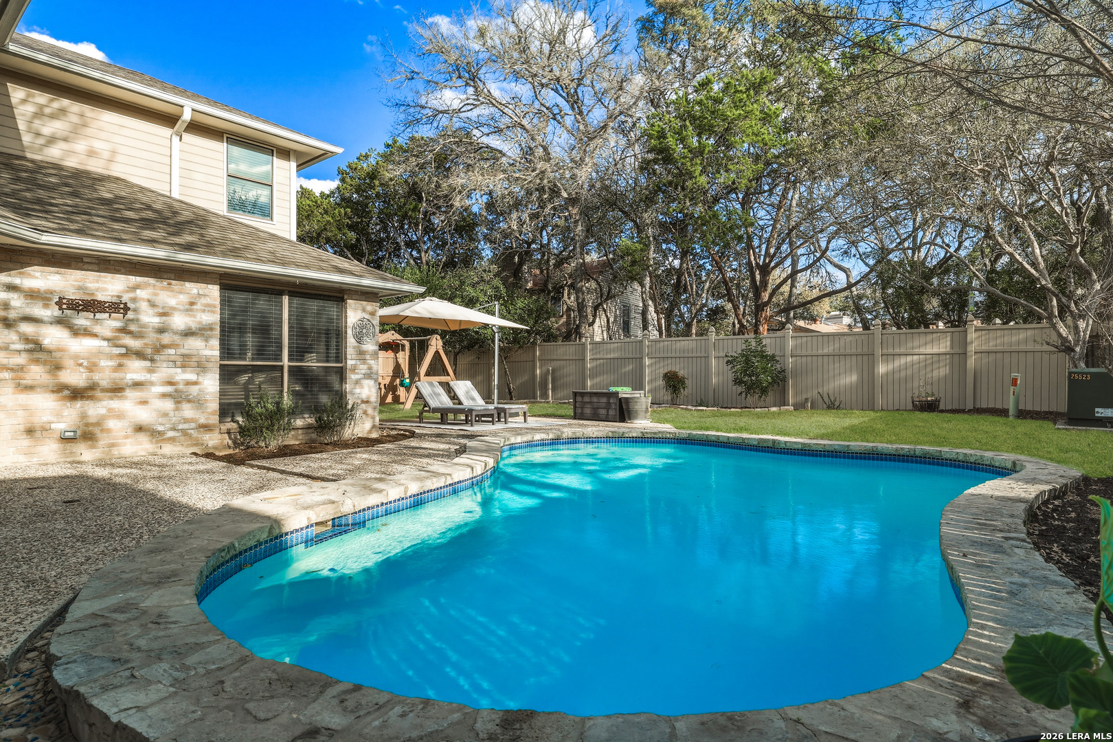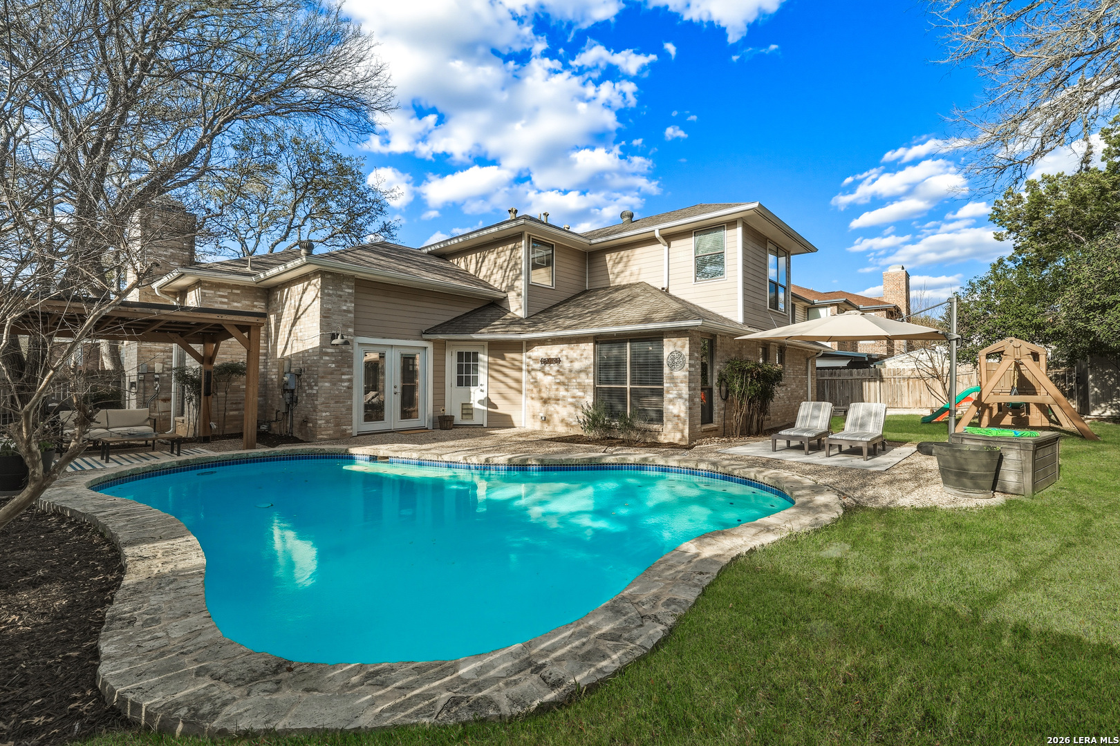 This beautiful Sitterle 3-bedroom, 2.5-bath home offers the perfect blend of comfort, character, and exceptional outdoor living in an unbeatable location-all with no HOA. Step inside to soaring high ceilings that create an open, airy feel filled with natural light. The spacious family room with wet bar is anchored by a stunning brick fireplace, creating a warm and inviting focal point. The separate kitchen offers both functionality and charm, complete with a cozy breakfast area. Just off the kitchen, you'll find a secondary patio ideal for grilling or easy access to your garden. Spacious primary suite with spa-like bathroom downstairs and 2 generous bedrooms upstairs provide both privacy and functionality. Enjoy your backyard retreat featuring a sparkling pool and a newly added gazebo that creates the perfect shaded space for relaxing or entertaining. Easy access to IH35, Loop 1604, The Forum Shopping Center, Randolph Air Force Base, Olympia Hills Golf Course, and numerous entertainment options. New pool pump (2023),New tile flooring in living, dining, primary suite (2022).