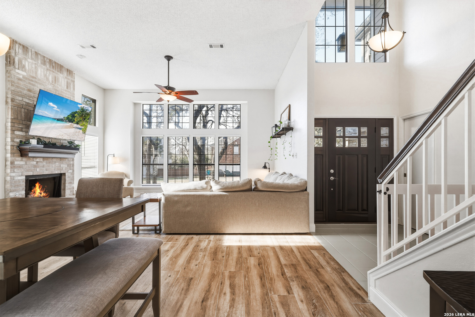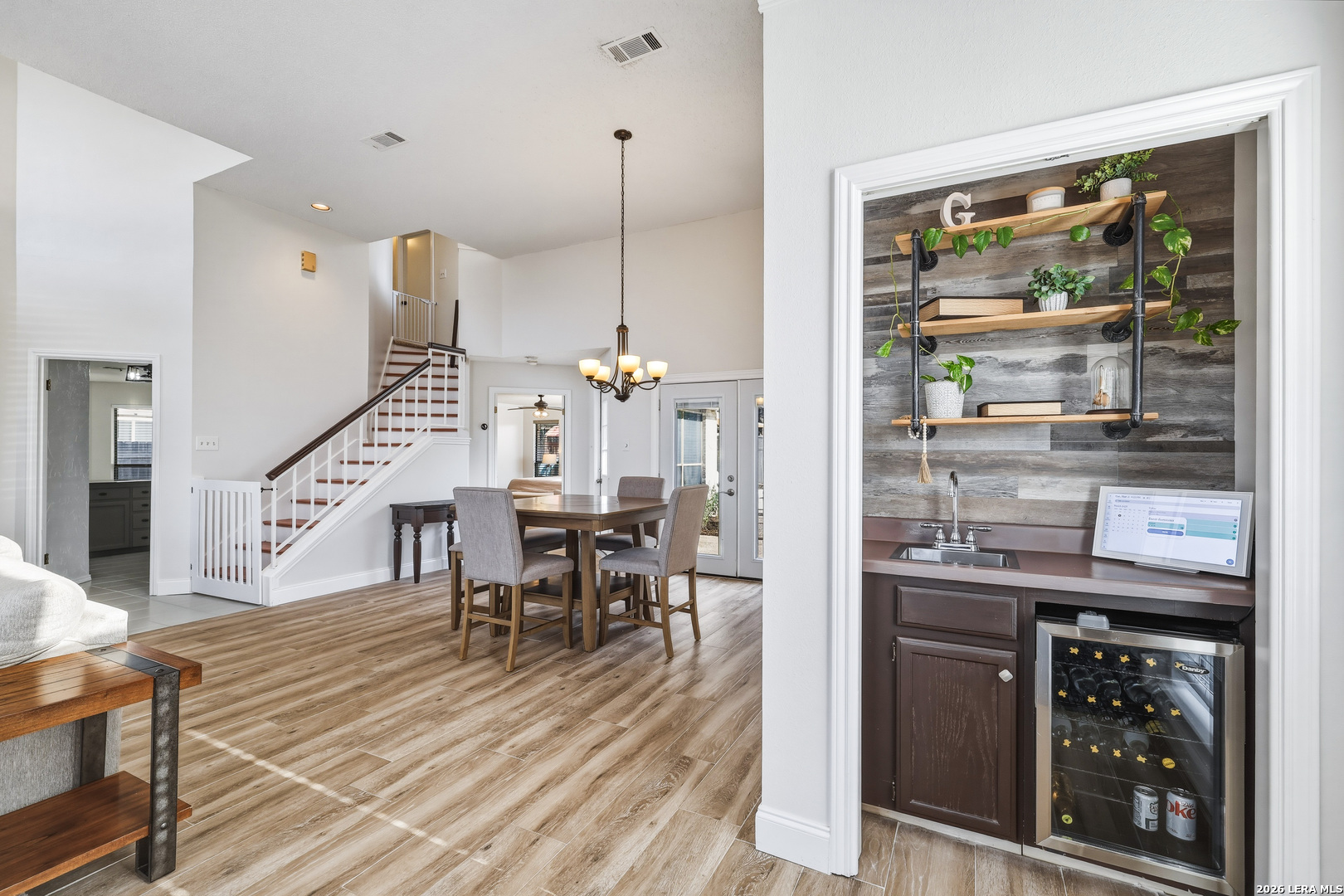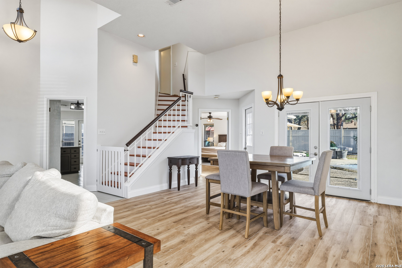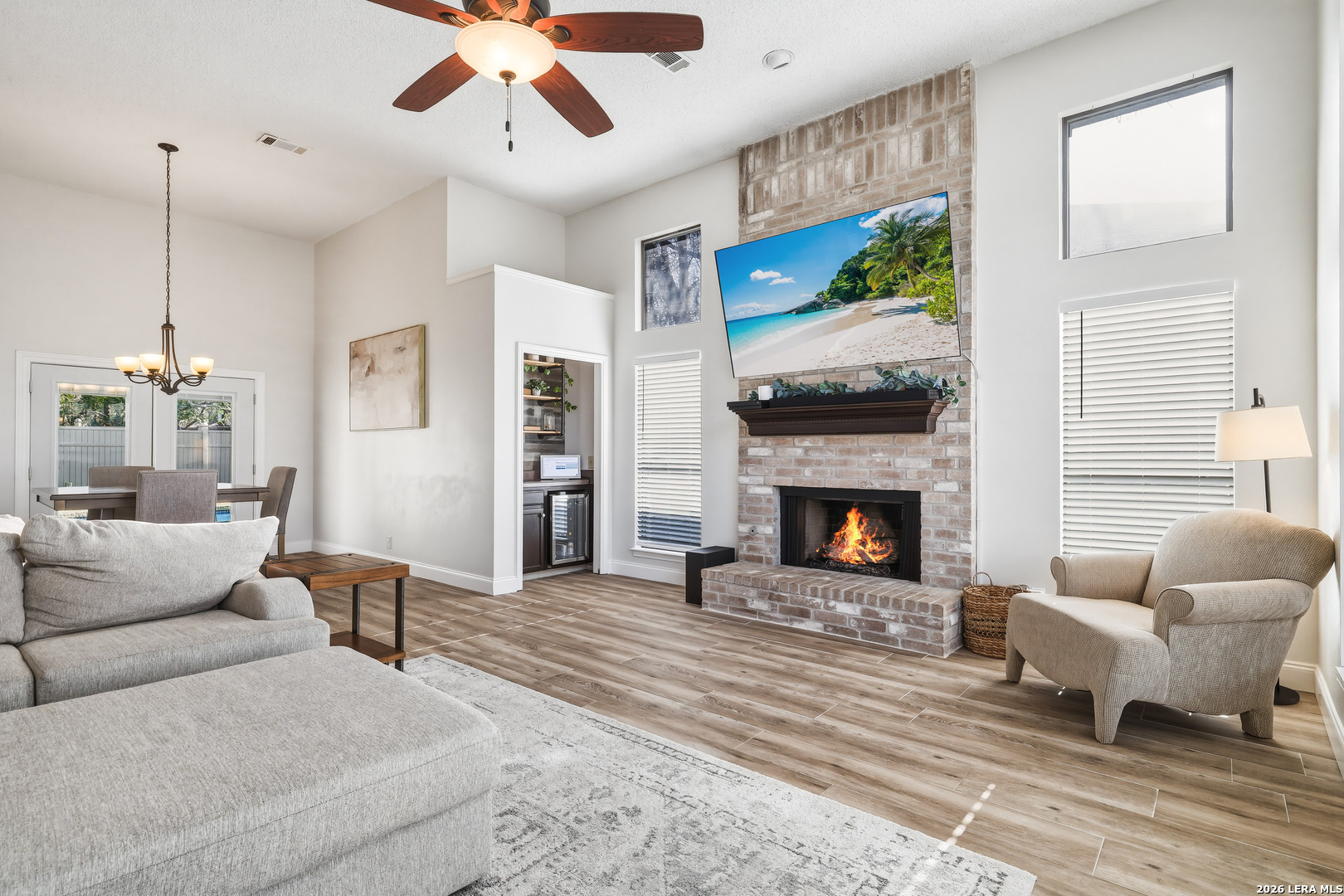 This beautiful Sitterle 3-bedroom, 2.5-bath home offers the perfect blend of comfort, character, and exceptional outdoor living in an unbeatable location-all with no HOA. Step inside to soaring high ceilings that create an open, airy feel filled with natural light. The spacious family room with wet bar is anchored by a stunning brick fireplace, creating a warm and inviting focal point. The separate kitchen offers both functionality and charm, complete with a cozy breakfast area. Just off the kitchen, you'll find a secondary patio ideal for grilling or easy access to your garden. Spacious primary suite with spa-like bathroom downstairs and 2 generous bedrooms upstairs provide both privacy and functionality. Enjoy your backyard retreat featuring a sparkling pool and a newly added gazebo that creates the perfect shaded space for relaxing or entertaining. Easy access to IH35, Loop 1604, The Forum Shopping Center, Randolph Air Force Base, Olympia Hills Golf Course, and numerous entertainment options. New pool pump (2023),New tile flooring in living, dining, primary suite (2022).