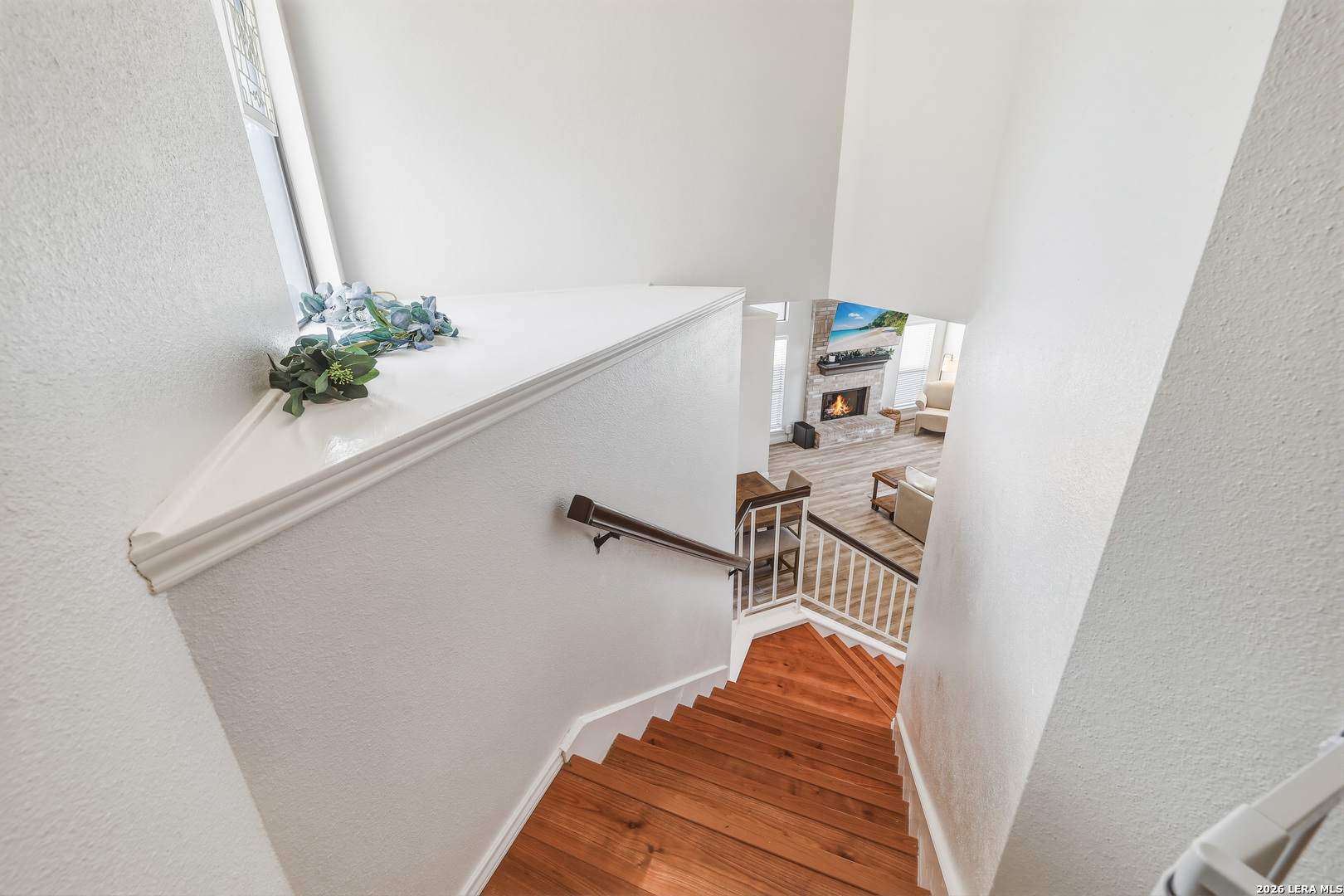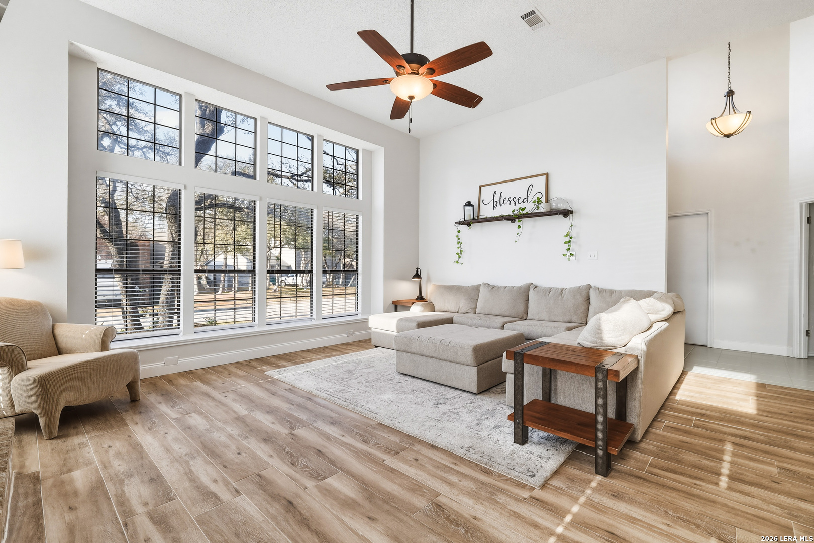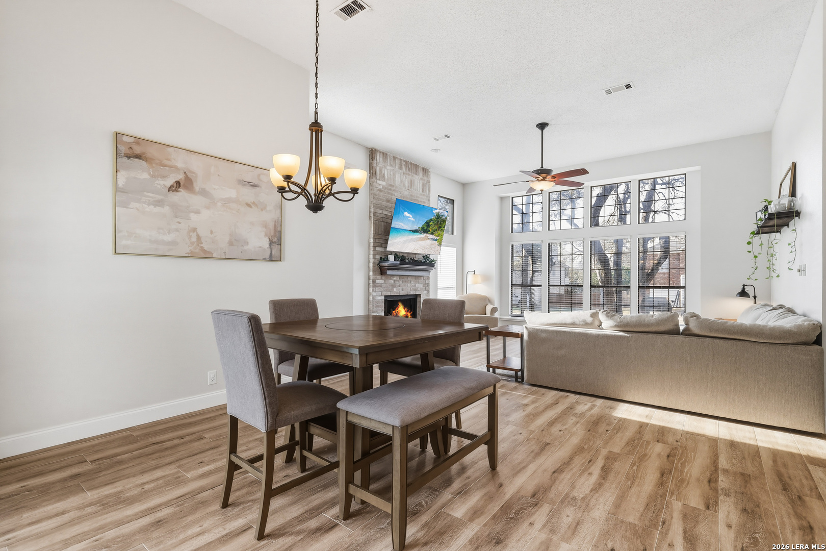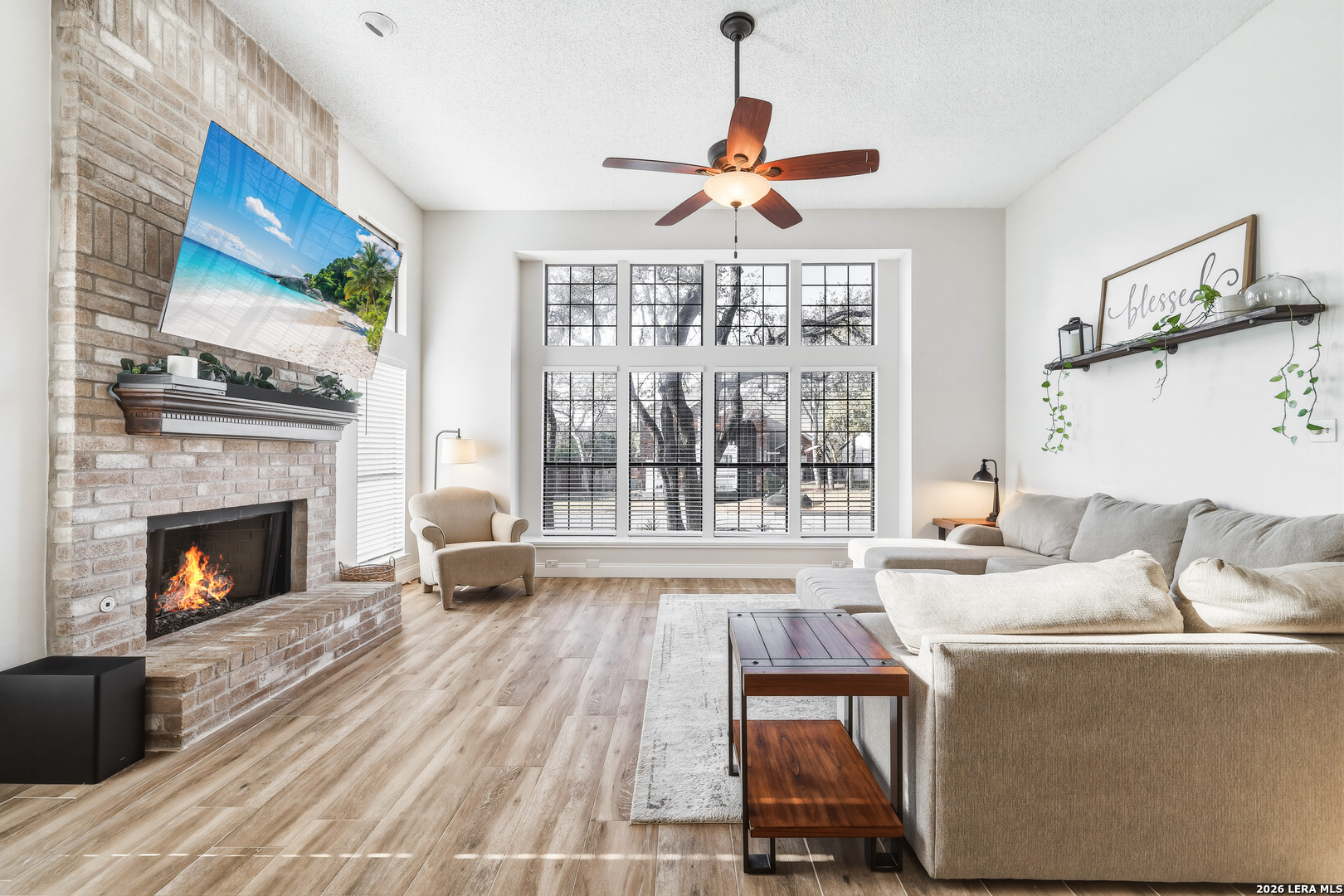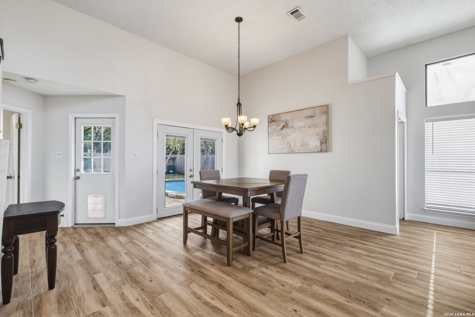 This beautiful Sitterle 3-bedroom, 2.5-bath home offers the perfect blend of comfort, character, and exceptional outdoor living in an unbeatable location-all with no HOA. Step inside to soaring high ceilings that create an open, airy feel filled with natural light. The spacious family room with wet bar is anchored by a stunning brick fireplace, creating a warm and inviting focal point. The separate kitchen offers both functionality and charm, complete with a cozy breakfast area. Just off the kitchen, you'll find a secondary patio ideal for grilling or easy access to your garden. Spacious primary suite with spa-like bathroom downstairs and 2 generous bedrooms upstairs provide both privacy and functionality. Enjoy your backyard retreat featuring a sparkling pool and a newly added gazebo that creates the perfect shaded space for relaxing or entertaining. Easy access to IH35, Loop 1604, The Forum Shopping Center, Randolph Air Force Base, Olympia Hills Golf Course, and numerous entertainment options. New pool pump (2023),New tile flooring in living, dining, primary suite (2022).