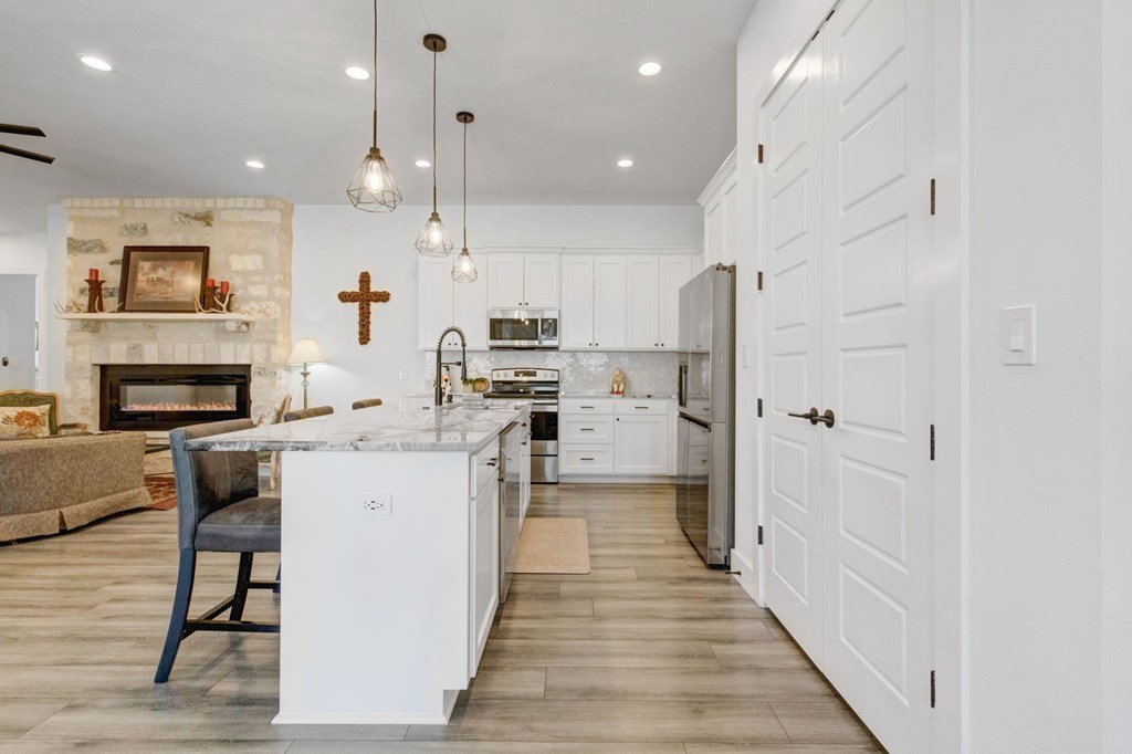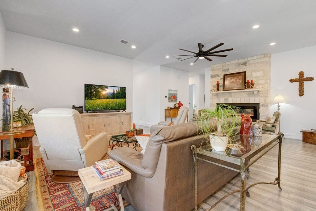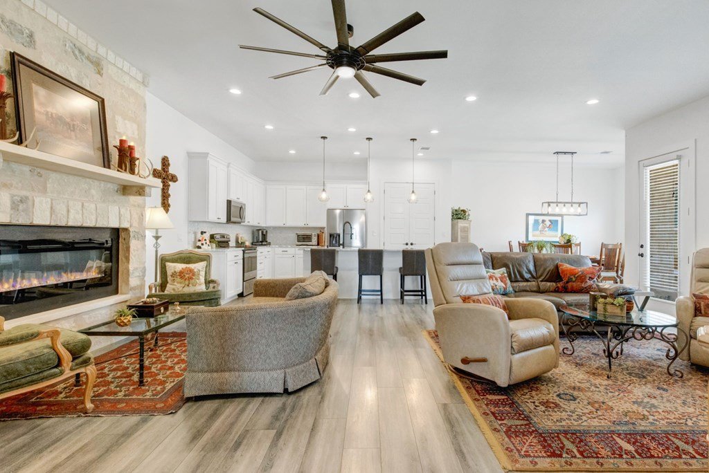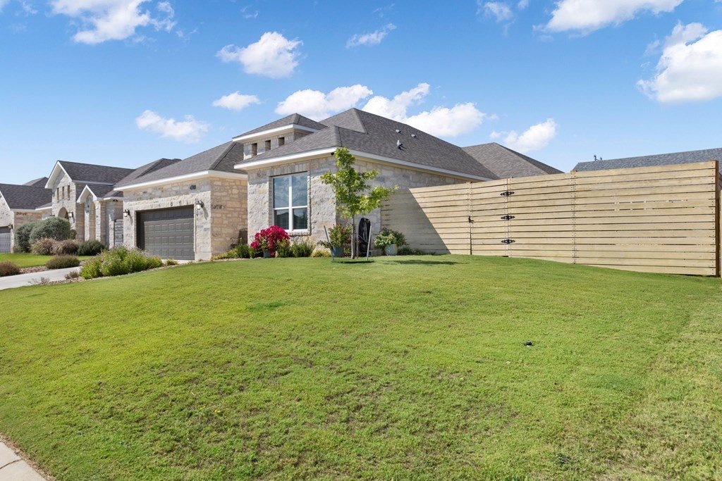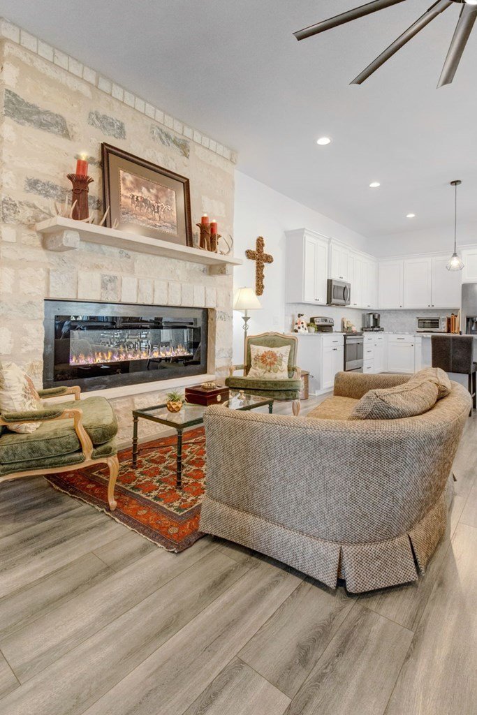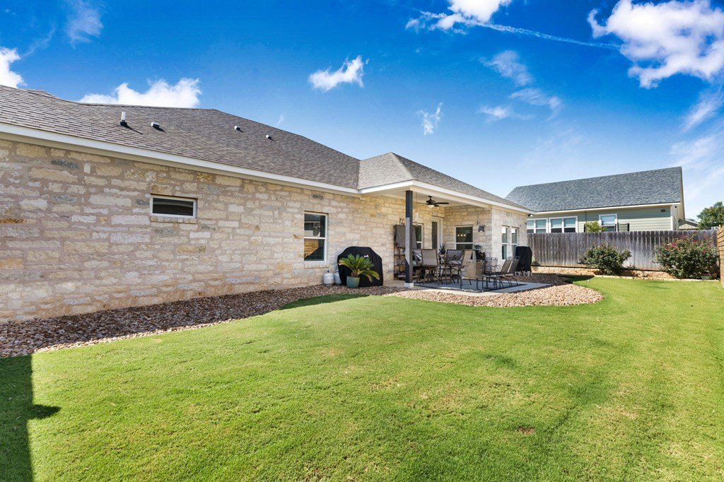 Built in 2021 and situated in a highly desirable neighborhood, this beautifully designed4-bedroom, 3-bathroom homeoffers2,342 square feetof modern living space with an emphasis on sleek finishes, easy flow and everyday livability. The home'sexpansive open-concept floor planconnects the great room, dining area, and kitchen. A strikingfloor-to-ceiling electric fireplaceserves as the centerpiece of the living space, adding an elegant touch and creating natural warmth. The kitchen is equipped withstainless steel appliances, a generous island, and extensive counter space, both practical and inviting for daily cooking, gathering and entertaining. Theprimary suiteprovides a relaxing retreat with ample space, while three additional bedrooms and three full baths ensure room for family, guests or a study with workspace. The oversized layout and design make this home as functional as it is inviting. Outside, enjoy afenced backyard with a covered patio, ideal for outdoor dining, along with aspacious side yard. Anirrigation systemmakes for easy landscape maintenance. Thegray stone exterior with German smear finishlends the home a distinctive Hill Country presence and creates a lovely curb appeal. The location further enhances this property's appeal—adjacent to Heritage School and with quick access to Methodist Hospital, HEB, and all the public school campuses. With modern construction, generous living spaces and proximity to Fredericksburg conveniences this property is a standout opportunity for buyers.