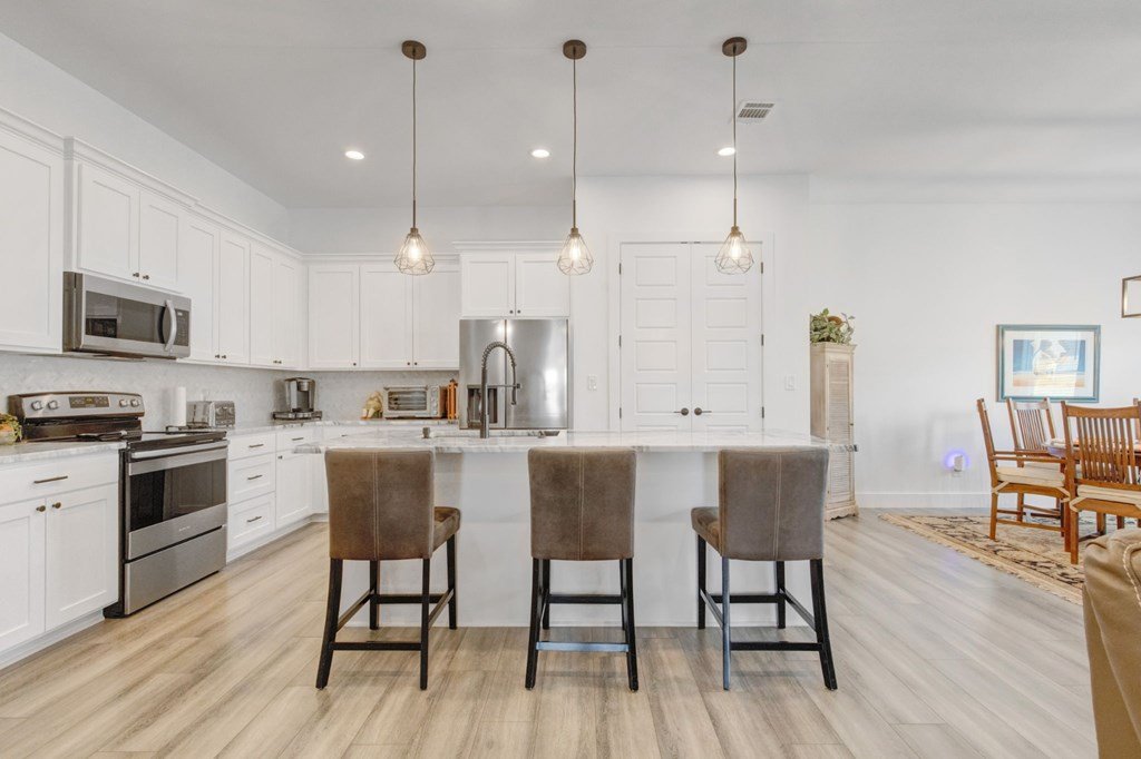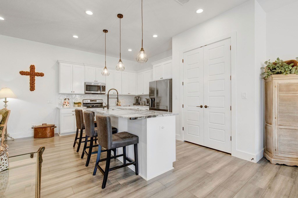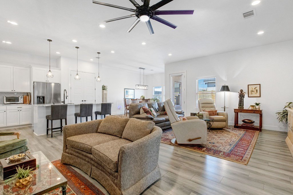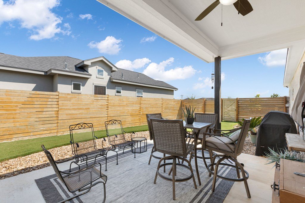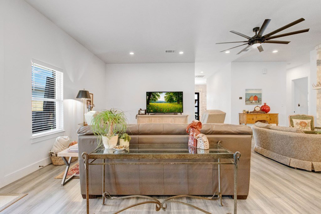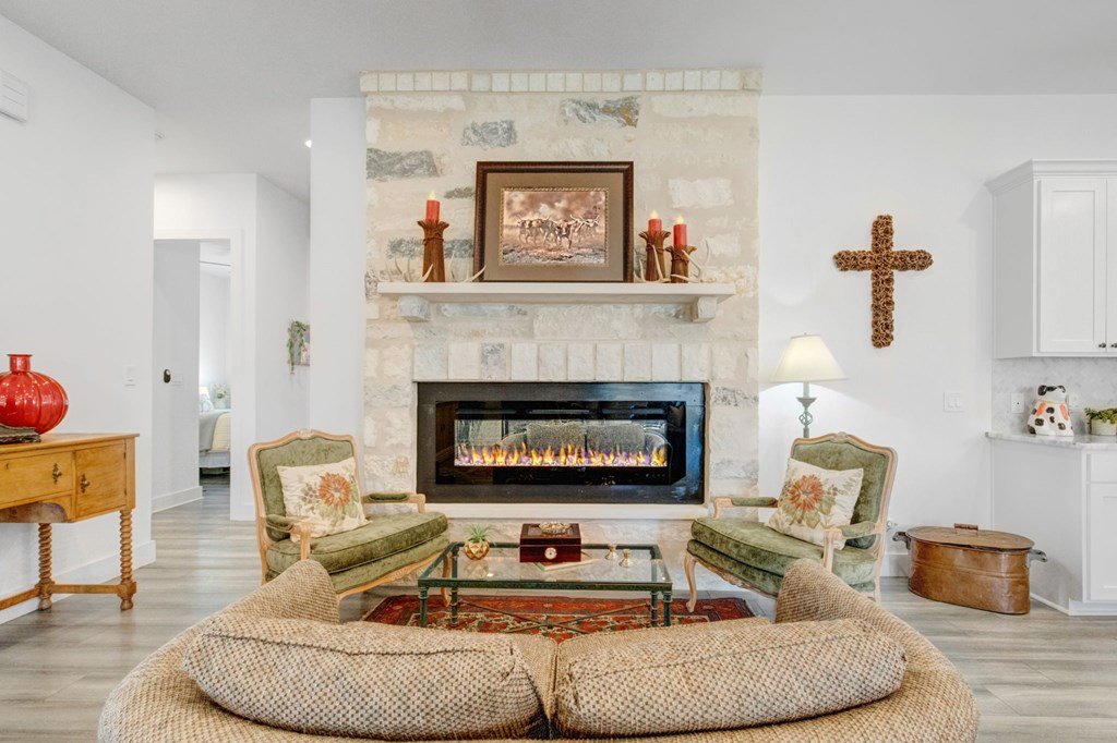 Built in 2021 and situated in a highly desirable neighborhood, this beautifully designed4-bedroom, 3-bathroom homeoffers2,342 square feetof modern living space with an emphasis on sleek finishes, easy flow and everyday livability. The home'sexpansive open-concept floor planconnects the great room, dining area, and kitchen. A strikingfloor-to-ceiling electric fireplaceserves as the centerpiece of the living space, adding an elegant touch and creating natural warmth. The kitchen is equipped withstainless steel appliances, a generous island, and extensive counter space, both practical and inviting for daily cooking, gathering and entertaining. Theprimary suiteprovides a relaxing retreat with ample space, while three additional bedrooms and three full baths ensure room for family, guests or a study with workspace. The oversized layout and design make this home as functional as it is inviting. Outside, enjoy afenced backyard with a covered patio, ideal for outdoor dining, along with aspacious side yard. Anirrigation systemmakes for easy landscape maintenance. Thegray stone exterior with German smear finishlends the home a distinctive Hill Country presence and creates a lovely curb appeal. The location further enhances this property's appeal—adjacent to Heritage School and with quick access to Methodist Hospital, HEB, and all the public school campuses. With modern construction, generous living spaces and proximity to Fredericksburg conveniences this property is a standout opportunity for buyers.