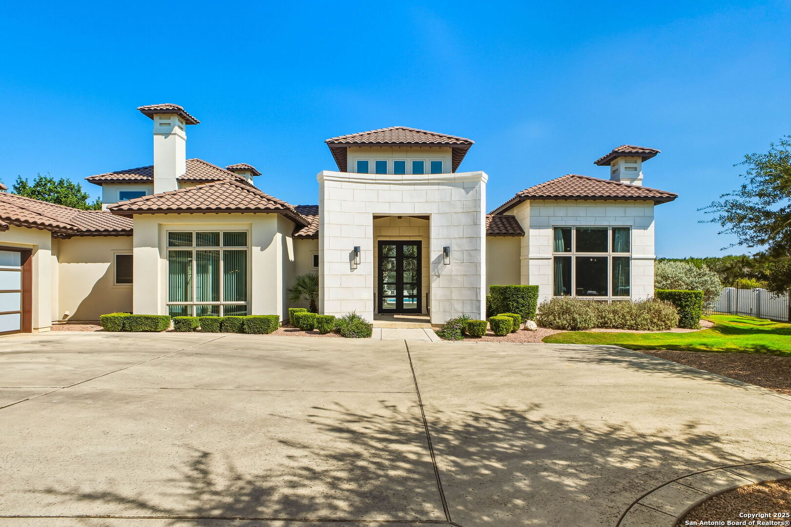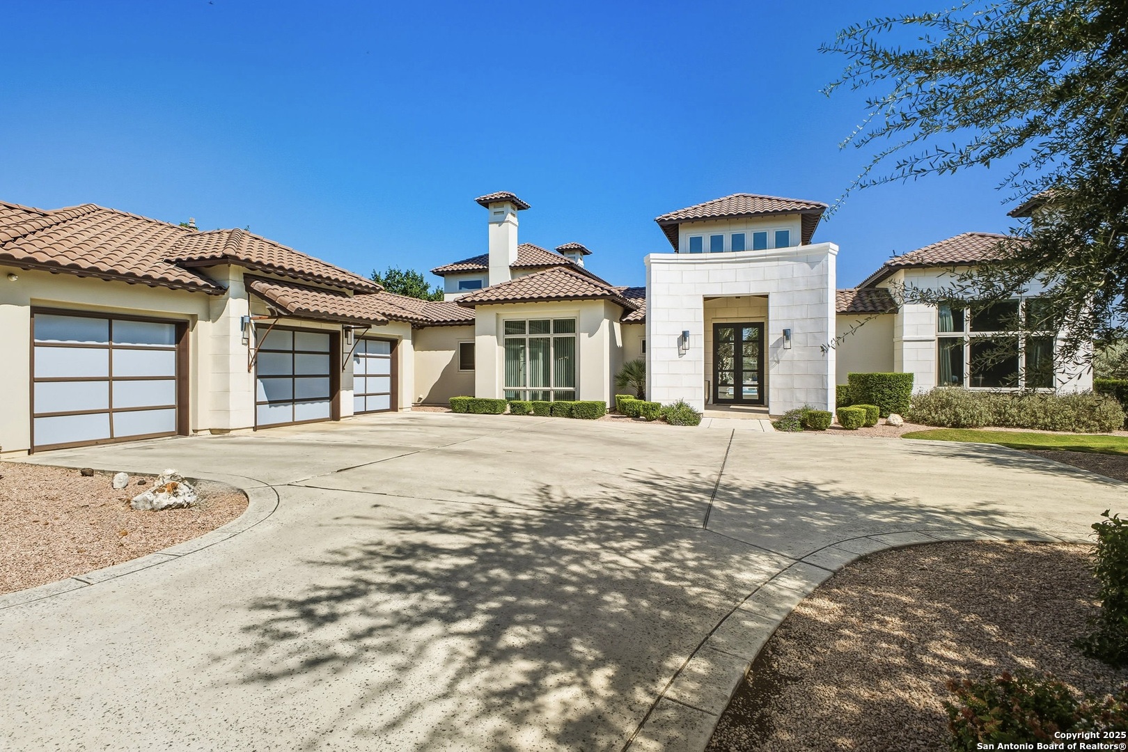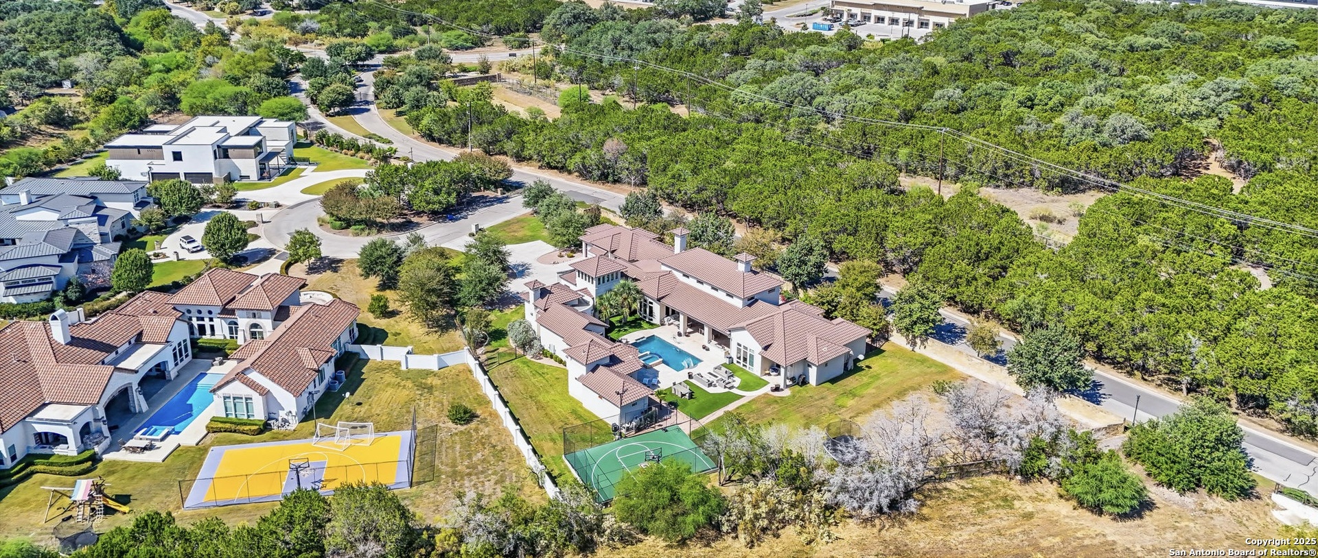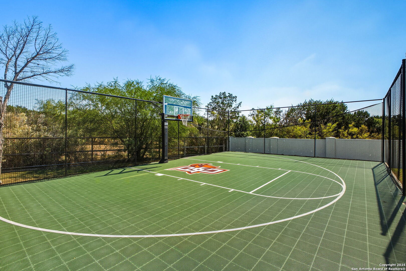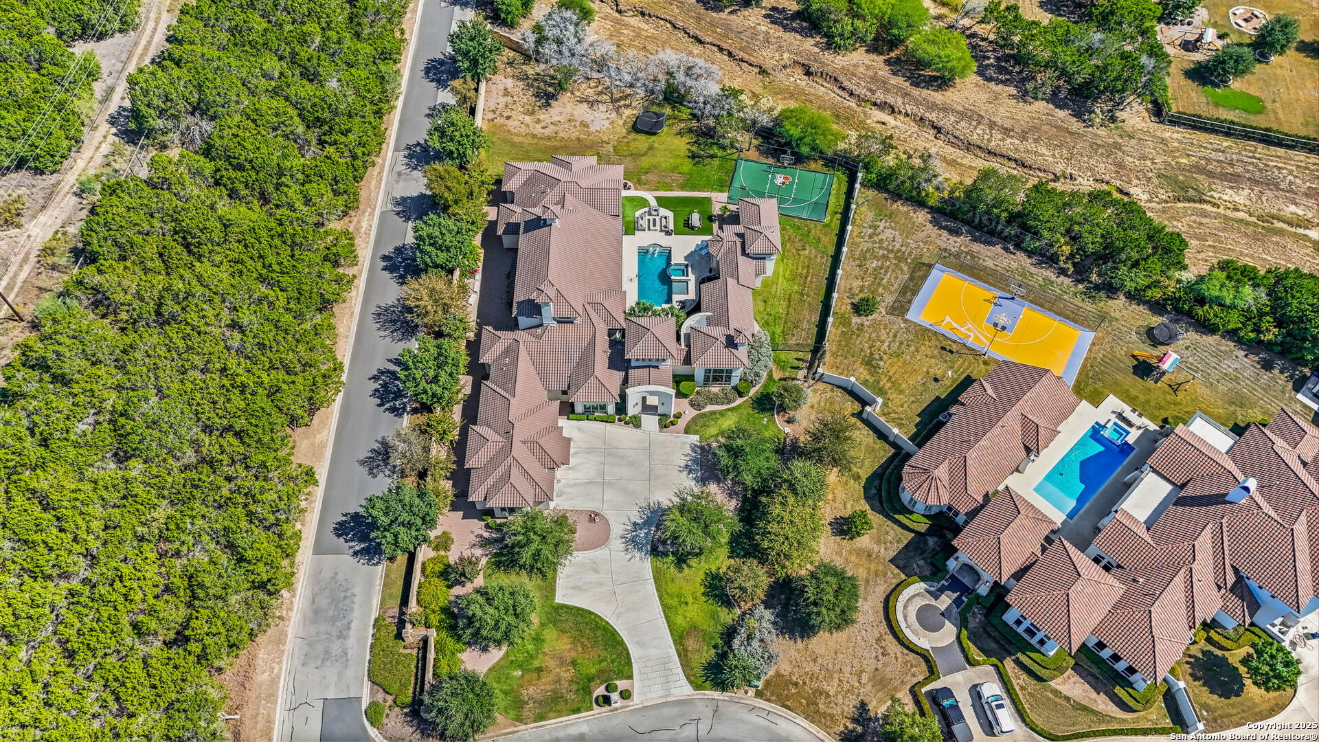 Welcome to this one-story Modern Transitional estate which embodies show stopping detail and sophistication in San Antonio's most prestigious gated communities-Huntington at Shavano Park. This Paul Allen custom home is over 6400 sq/ft and features unsurpassed craftsmanship and design elements that showcase the open floor plan with walls of sliding glass doors that seamlessly integrate indoor and outdoor living. The chef's kitchen features top of the line appliances, an expansive custom island that flows into the living room with custom architectural/ceiling detail, a dramatic fireplace, large separate breakfast and dining areas and a full walk up bar. The interior is detailed with oak floors, smoothly finished walls and designer light fixtures. The oversized master retreat boasts a luxurious spa-like bathroom and a massive walk-in closet with extensive custom cabinetry/built-ins and outdoor access. Impeccable craftsmanship prevails with four spacious guest bedrooms, all with en-suite bathrooms. Additional features include a large office & an oversized game room with a wet bar and patio access leading out to a large covered patio with a full outdoor kitchen. The resort style outdoor area features an oversized patio, a large spacious yard that offers full privacy backing up to a greenbelt, custom pool/spa and a sports court. An oversized 3-car garage offers ample parking and storage. This property must be experienced in person to be able to take in all it has to offer. This desired location offers a private retreat while keeping you close to premier dining, shopping, and entertainment, with effortless access to Loop 1604 and I-10.