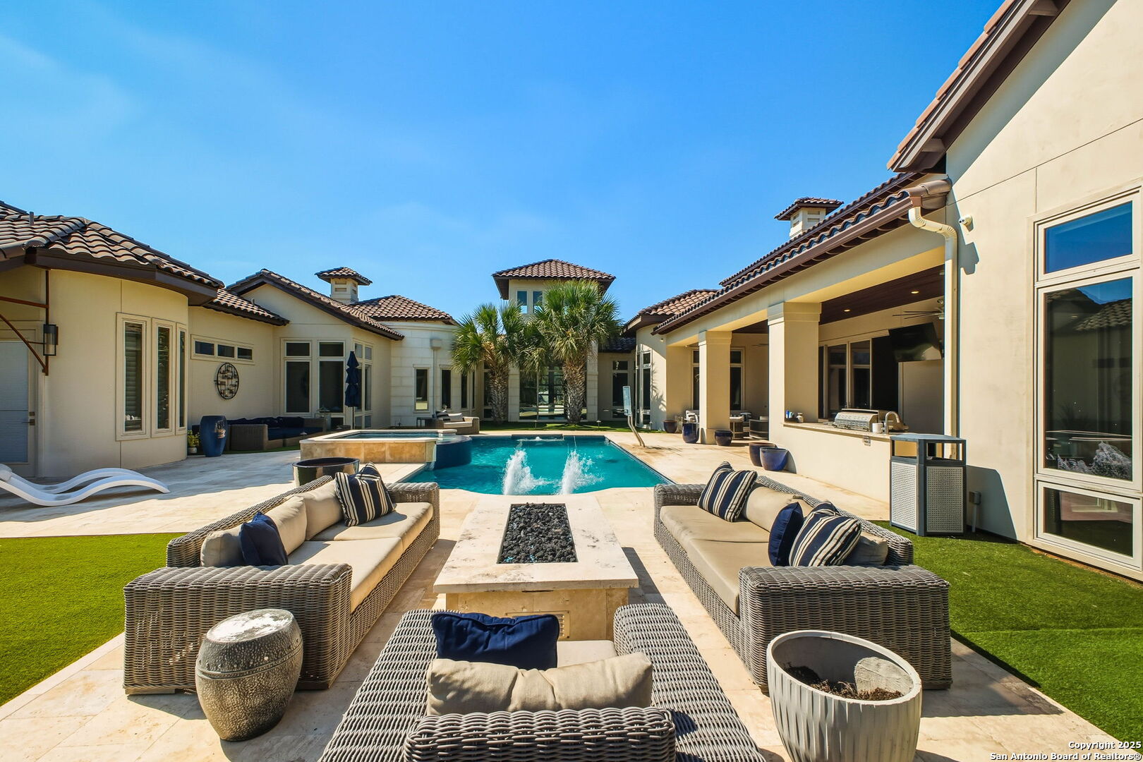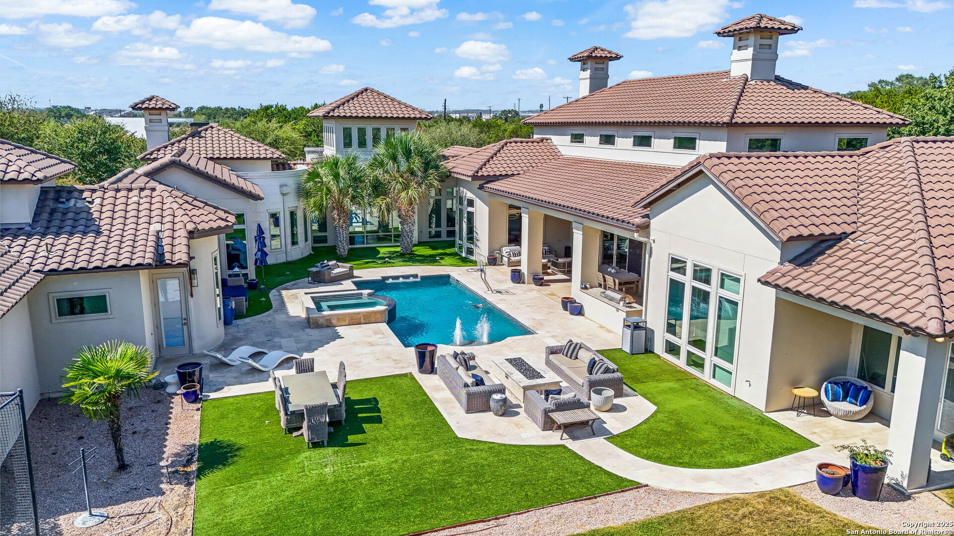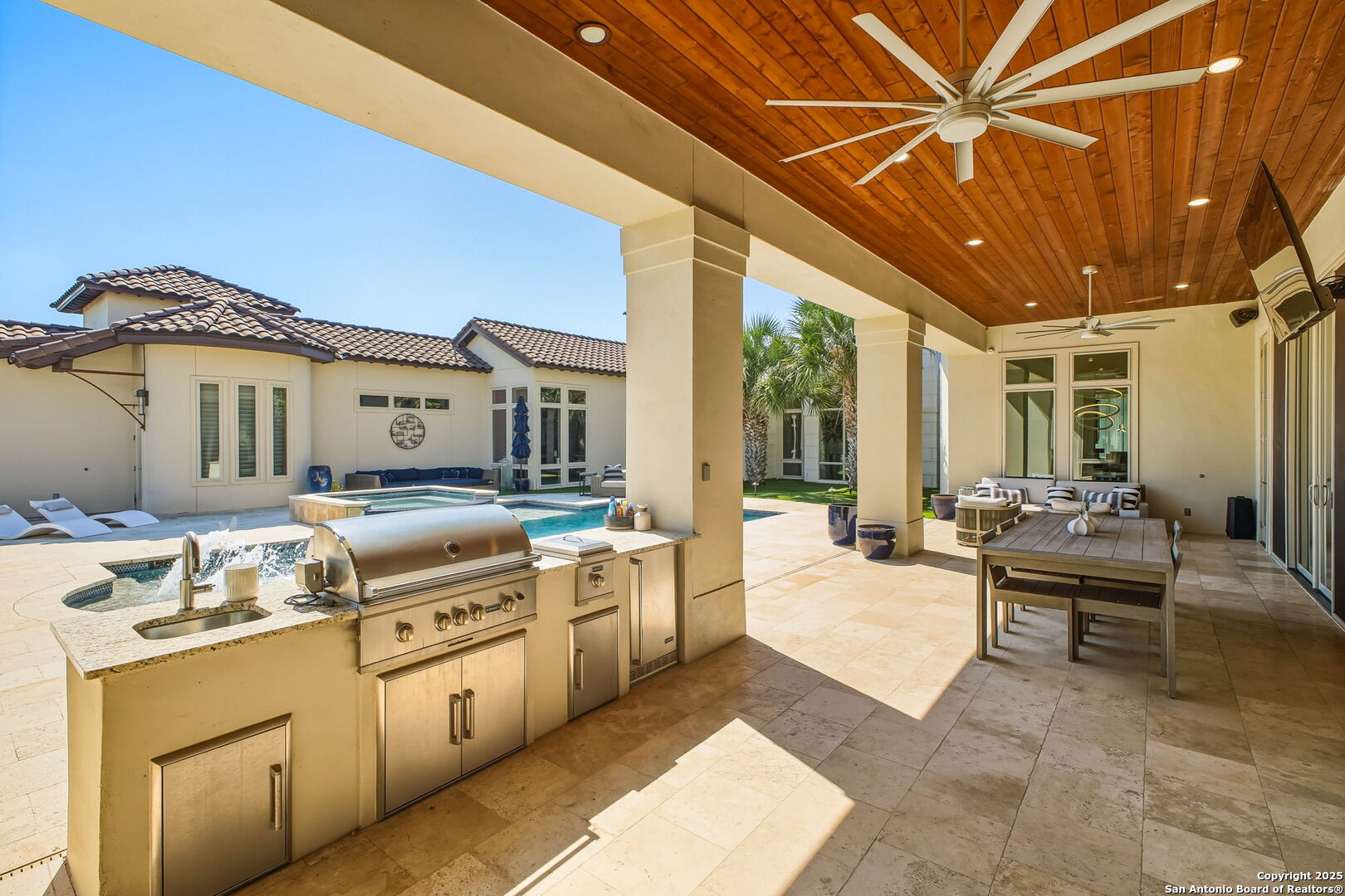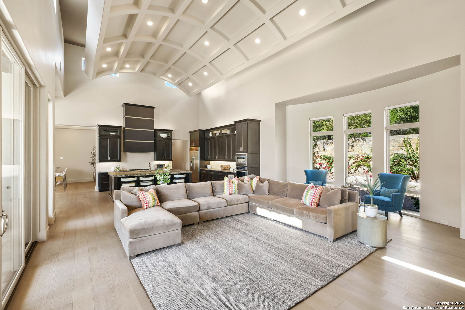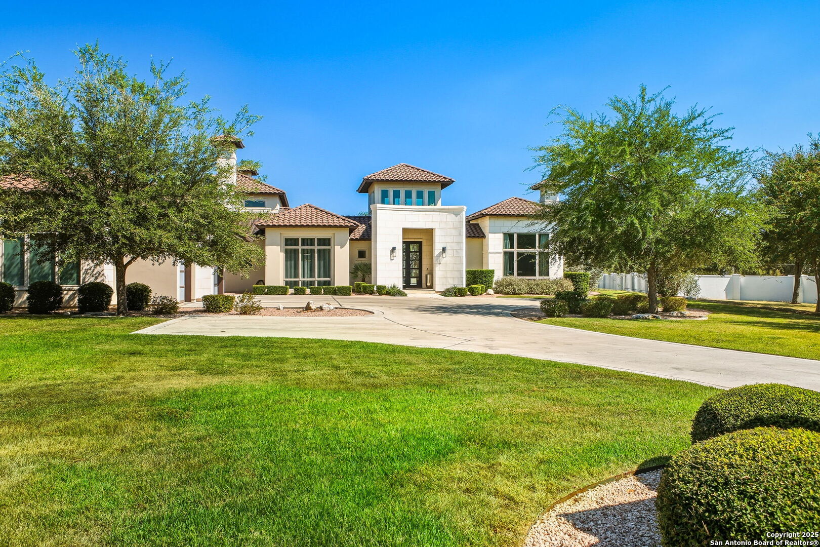 Welcome to this one-story Modern Transitional estate which embodies show stopping detail and sophistication in San Antonio's most prestigious gated communities-Huntington at Shavano Park. This Paul Allen custom home is over 6400 sq/ft and features unsurpassed craftsmanship and design elements that showcase the open floor plan with walls of sliding glass doors that seamlessly integrate indoor and outdoor living. The chef's kitchen features top of the line appliances, an expansive custom island that flows into the living room with custom architectural/ceiling detail, a dramatic fireplace, large separate breakfast and dining areas and a full walk up bar. The interior is detailed with oak floors, smoothly finished walls and designer light fixtures. The oversized master retreat boasts a luxurious spa-like bathroom and a massive walk-in closet with extensive custom cabinetry/built-ins and outdoor access. Impeccable craftsmanship prevails with four spacious guest bedrooms, all with en-suite bathrooms. Additional features include a large office & an oversized game room with a wet bar and patio access leading out to a large covered patio with a full outdoor kitchen. The resort style outdoor area features an oversized patio, a large spacious yard that offers full privacy backing up to a greenbelt, custom pool/spa and a sports court. An oversized 3-car garage offers ample parking and storage. This property must be experienced in person to be able to take in all it has to offer. This desired location offers a private retreat while keeping you close to premier dining, shopping, and entertainment, with effortless access to Loop 1604 and I-10.
