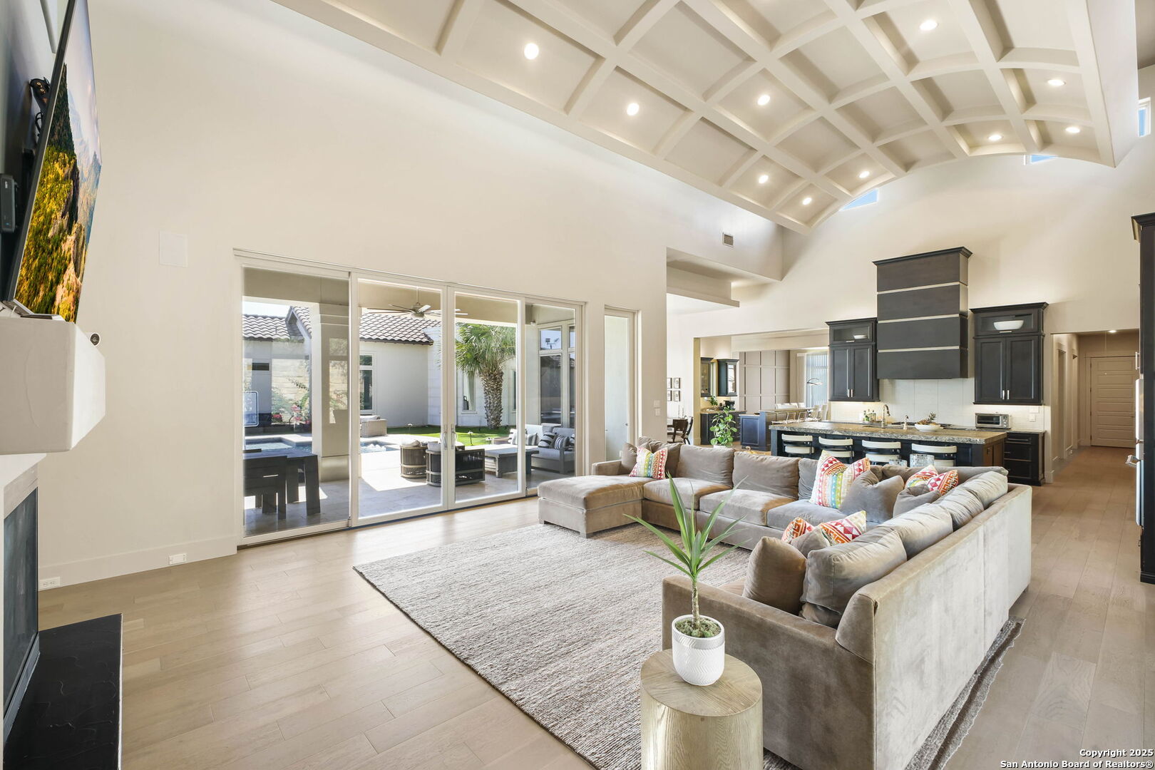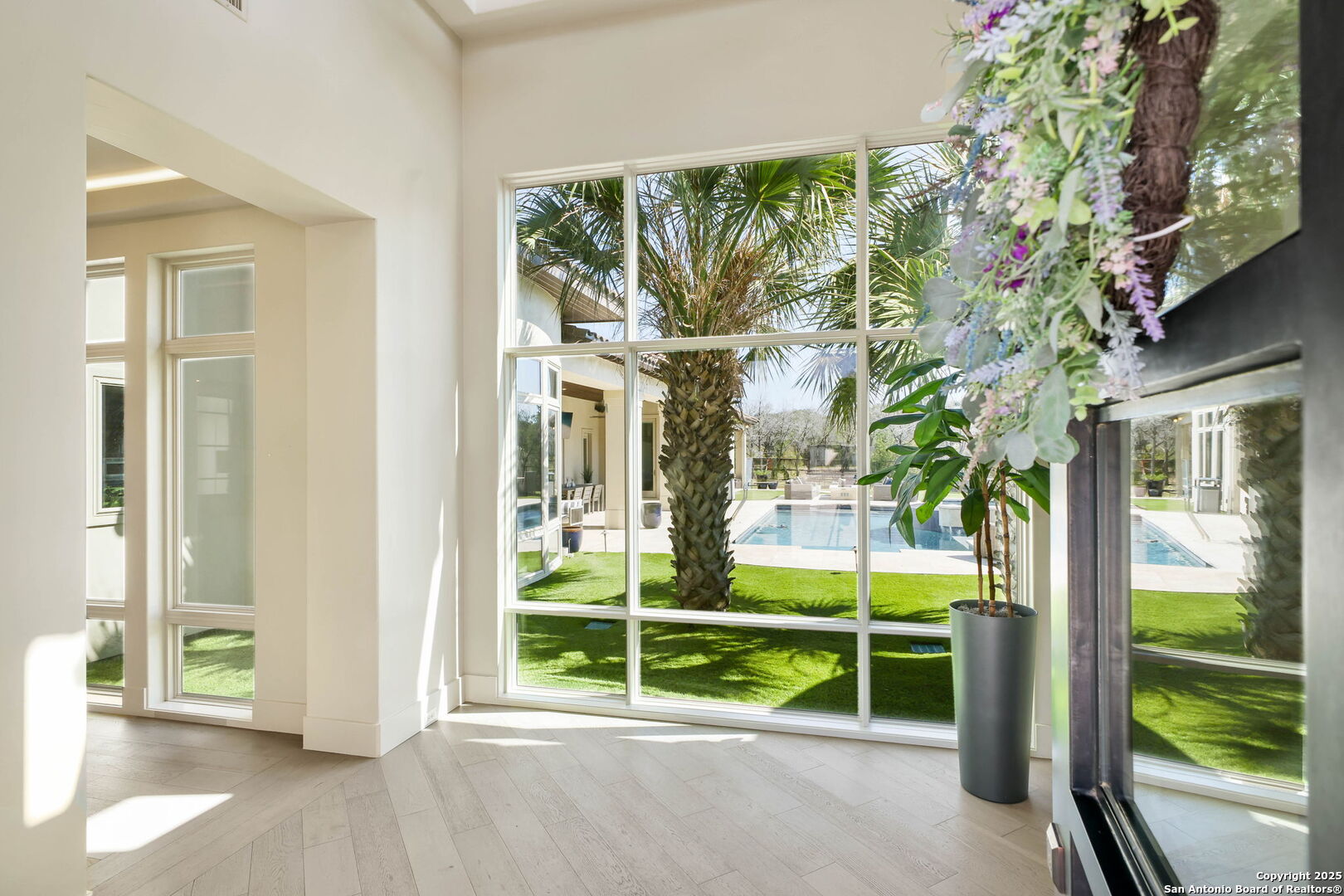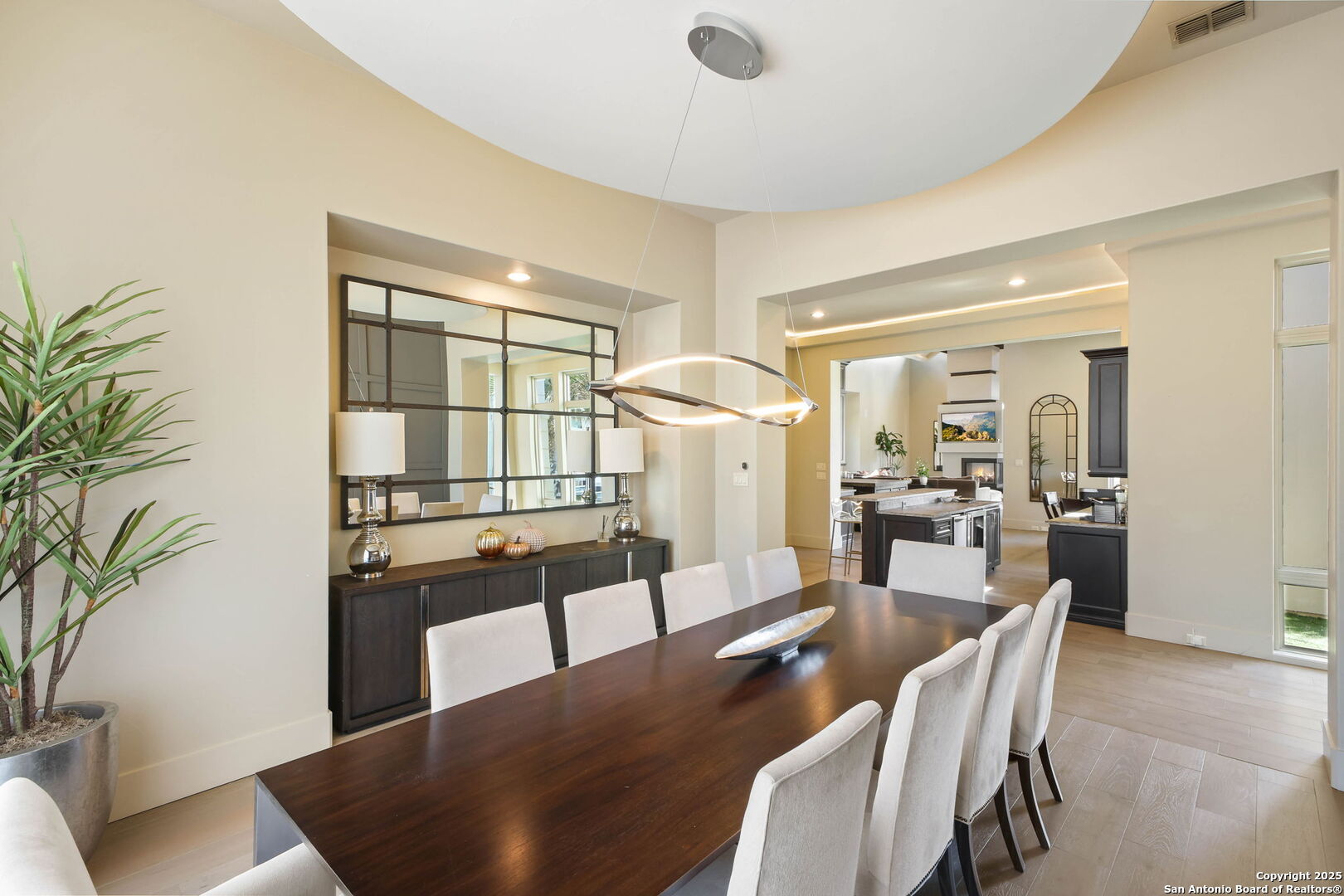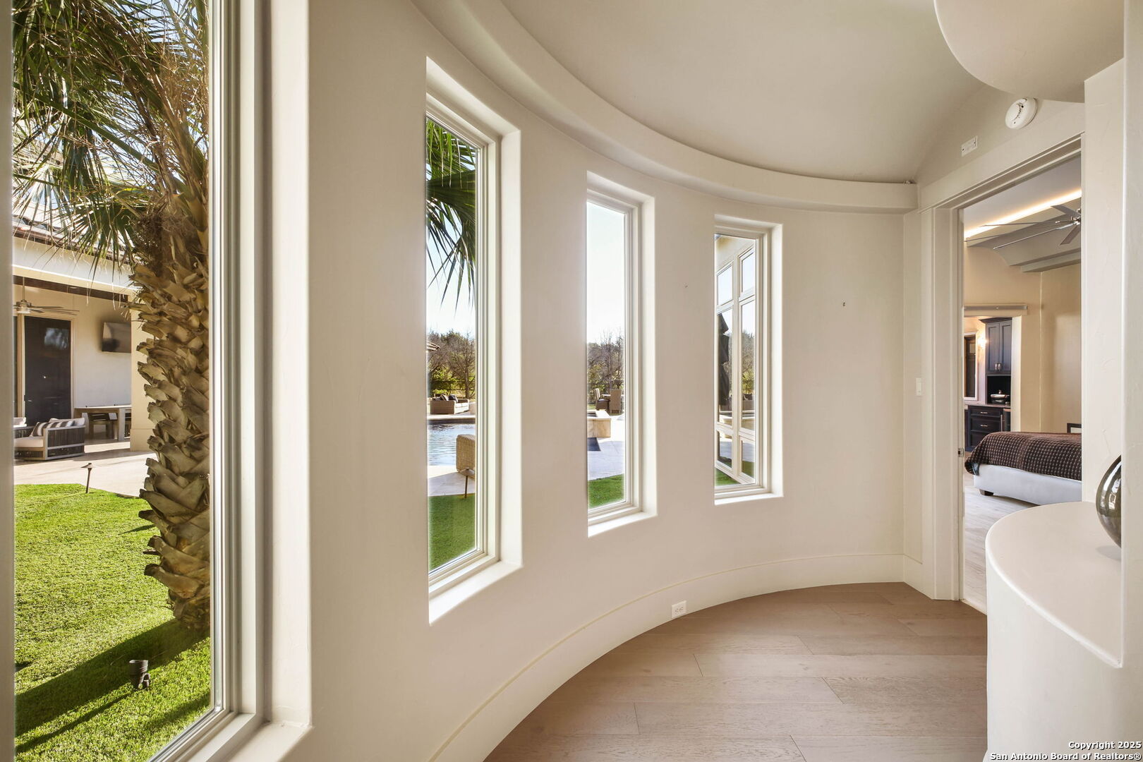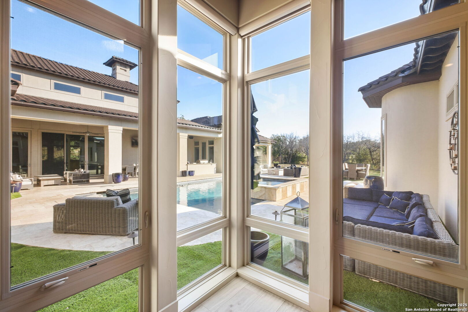 Welcome to this one-story Modern Transitional estate which embodies show stopping detail and sophistication in San Antonio's most prestigious gated communities-Huntington at Shavano Park. This Paul Allen custom home is over 6400 sq/ft and features unsurpassed craftsmanship and design elements that showcase the open floor plan with walls of sliding glass doors that seamlessly integrate indoor and outdoor living. The chef's kitchen features top of the line appliances, an expansive custom island that flows into the living room with custom architectural/ceiling detail, a dramatic fireplace, large separate breakfast and dining areas and a full walk up bar. The interior is detailed with oak floors, smoothly finished walls and designer light fixtures. The oversized master retreat boasts a luxurious spa-like bathroom and a massive walk-in closet with extensive custom cabinetry/built-ins and outdoor access. Impeccable craftsmanship prevails with four spacious guest bedrooms, all with en-suite bathrooms. Additional features include a large office & an oversized game room with a wet bar and patio access leading out to a large covered patio with a full outdoor kitchen. The resort style outdoor area features an oversized patio, a large spacious yard that offers full privacy backing up to a greenbelt, custom pool/spa and a sports court. An oversized 3-car garage offers ample parking and storage. This property must be experienced in person to be able to take in all it has to offer. This desired location offers a private retreat while keeping you close to premier dining, shopping, and entertainment, with effortless access to Loop 1604 and I-10.