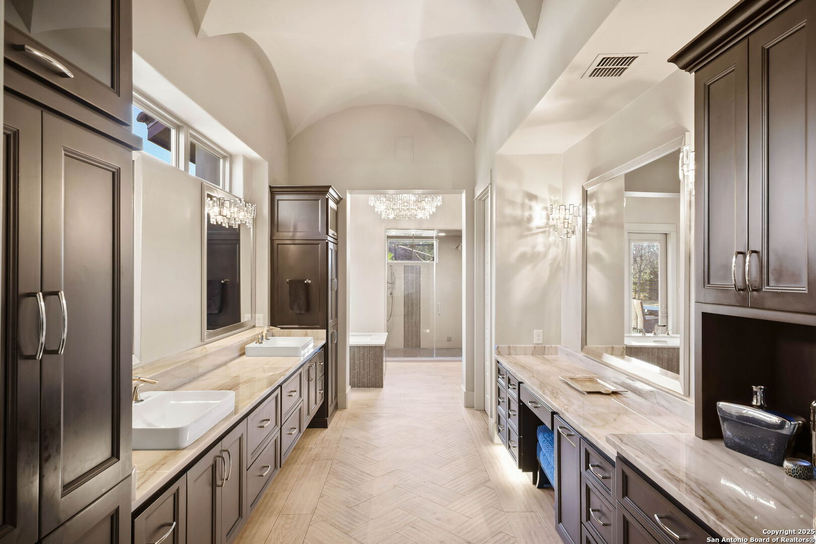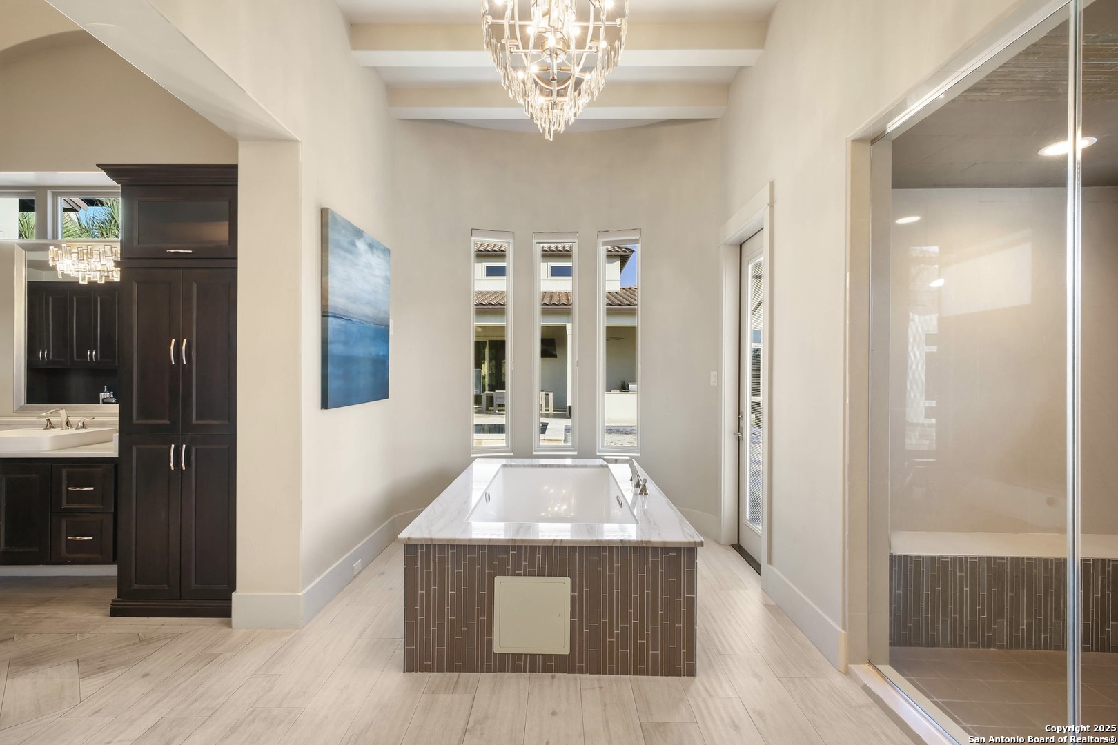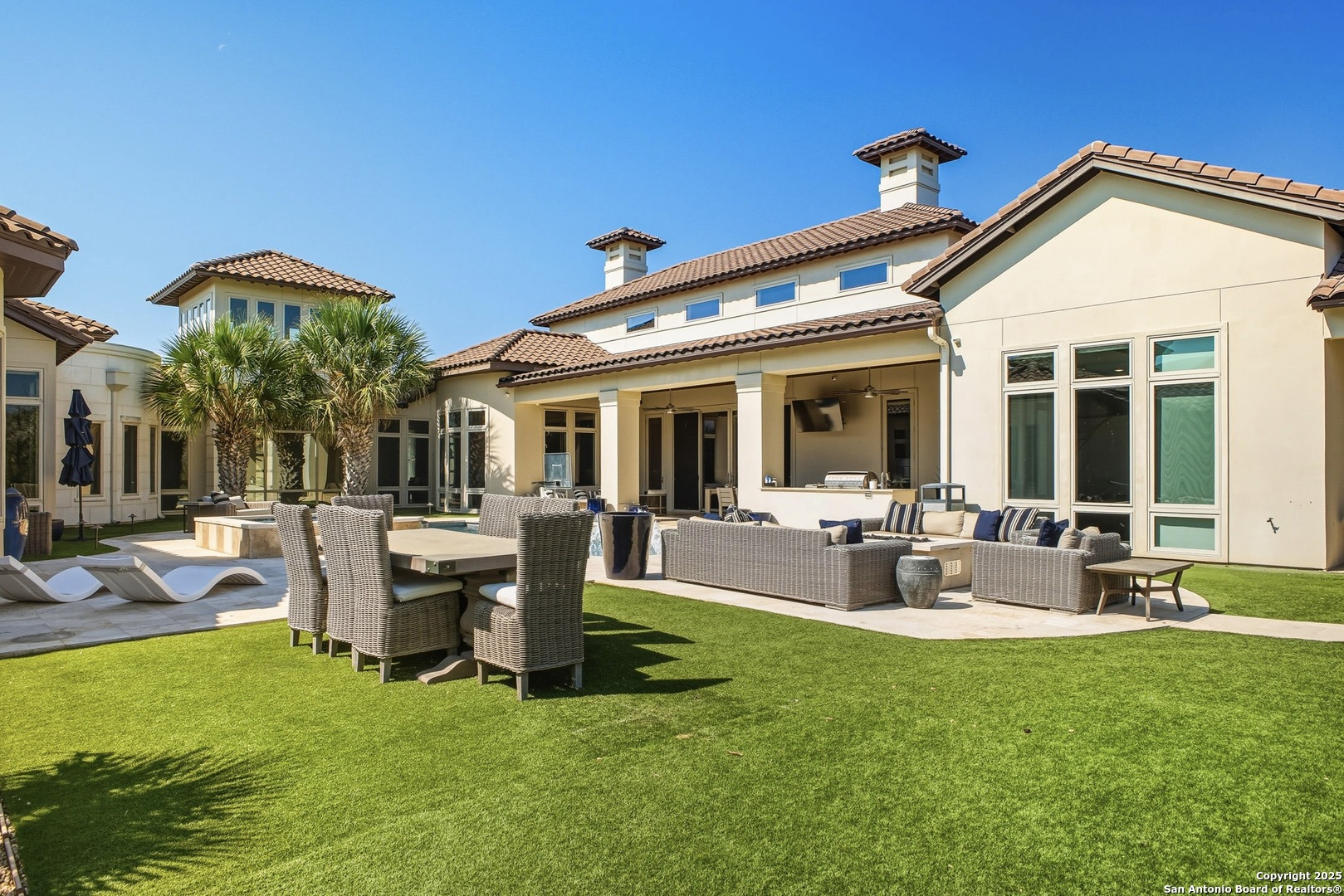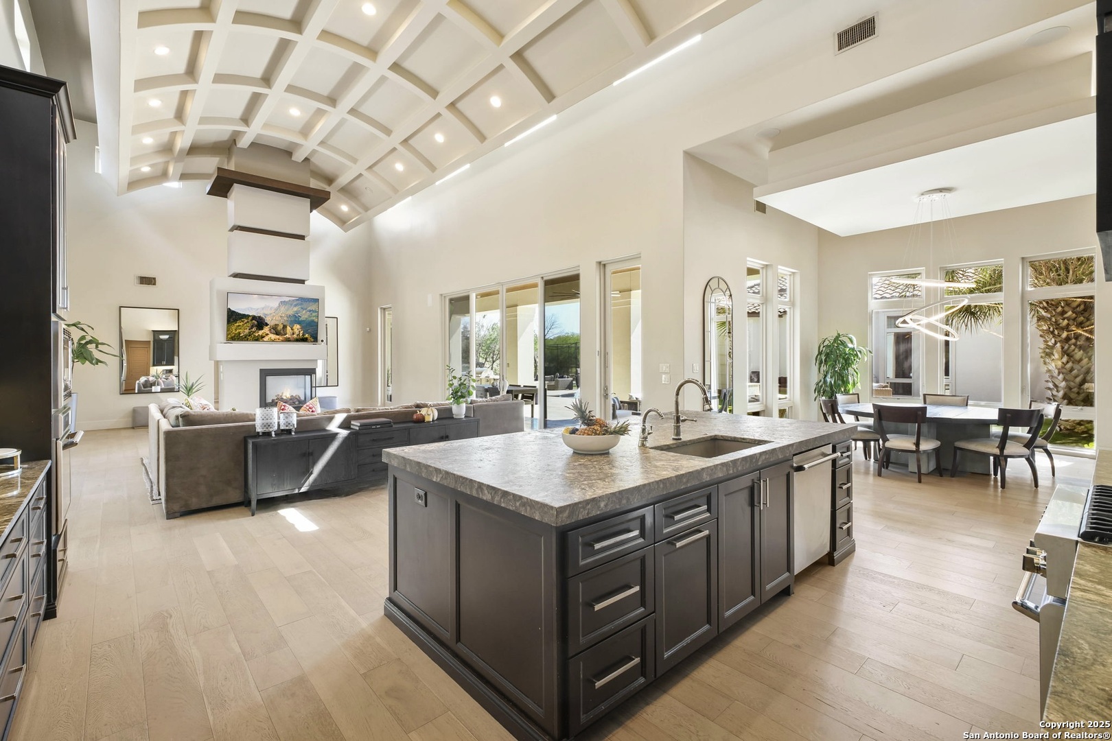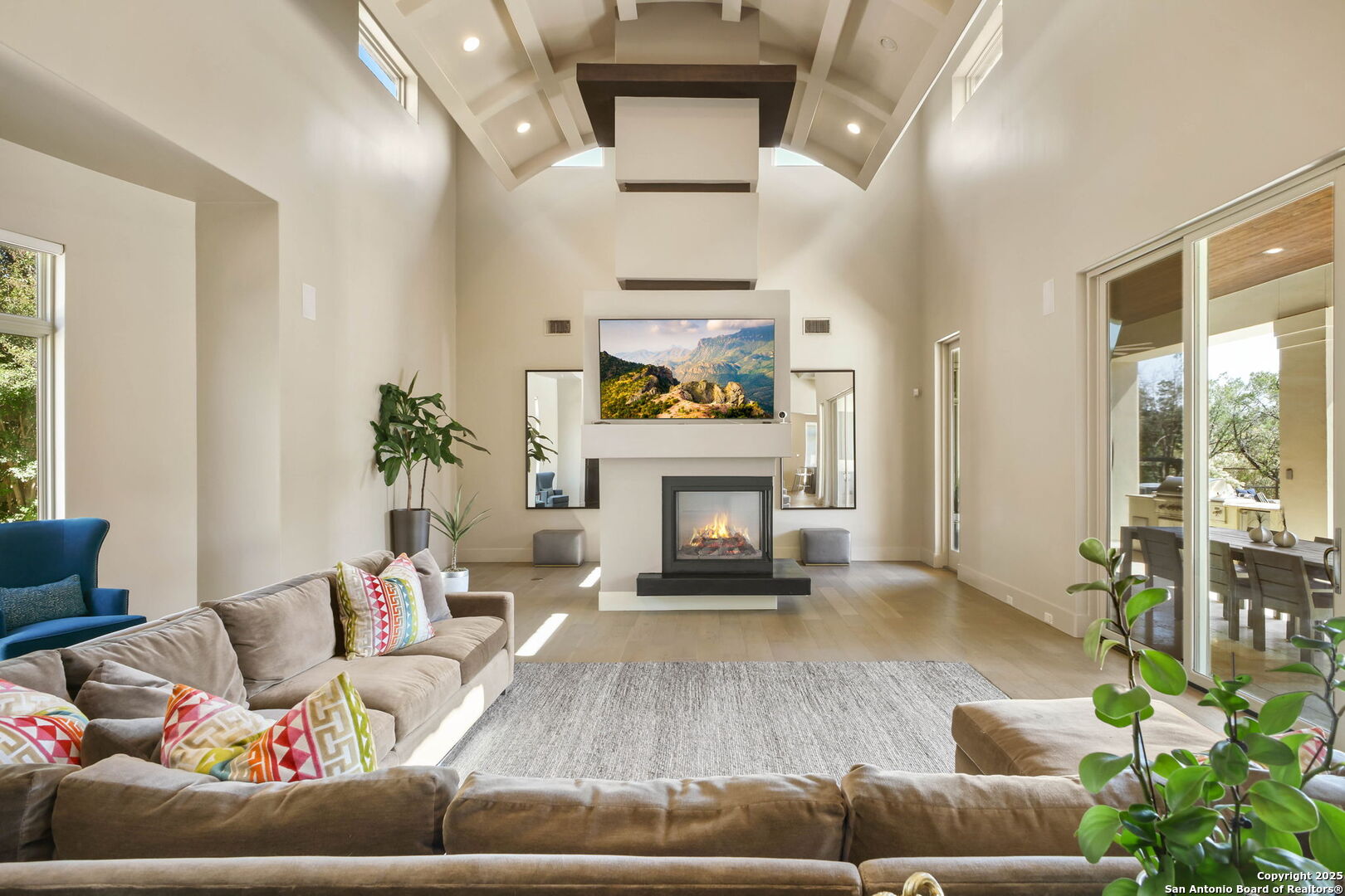 Welcome to this one-story Modern Transitional estate which embodies show stopping detail and sophistication in San Antonio's most prestigious gated communities-Huntington at Shavano Park. This Paul Allen custom home is over 6400 sq/ft and features unsurpassed craftsmanship and design elements that showcase the open floor plan with walls of sliding glass doors that seamlessly integrate indoor and outdoor living. The chef's kitchen features top of the line appliances, an expansive custom island that flows into the living room with custom architectural/ceiling detail, a dramatic fireplace, large separate breakfast and dining areas and a full walk up bar. The interior is detailed with oak floors, smoothly finished walls and designer light fixtures. The oversized master retreat boasts a luxurious spa-like bathroom and a massive walk-in closet with extensive custom cabinetry/built-ins and outdoor access. Impeccable craftsmanship prevails with four spacious guest bedrooms, all with en-suite bathrooms. Additional features include a large office & an oversized game room with a wet bar and patio access leading out to a large covered patio with a full outdoor kitchen. The resort style outdoor area features an oversized patio, a large spacious yard that offers full privacy backing up to a greenbelt, custom pool/spa and a sports court. An oversized 3-car garage offers ample parking and storage. This property must be experienced in person to be able to take in all it has to offer. This desired location offers a private retreat while keeping you close to premier dining, shopping, and entertainment, with effortless access to Loop 1604 and I-10.