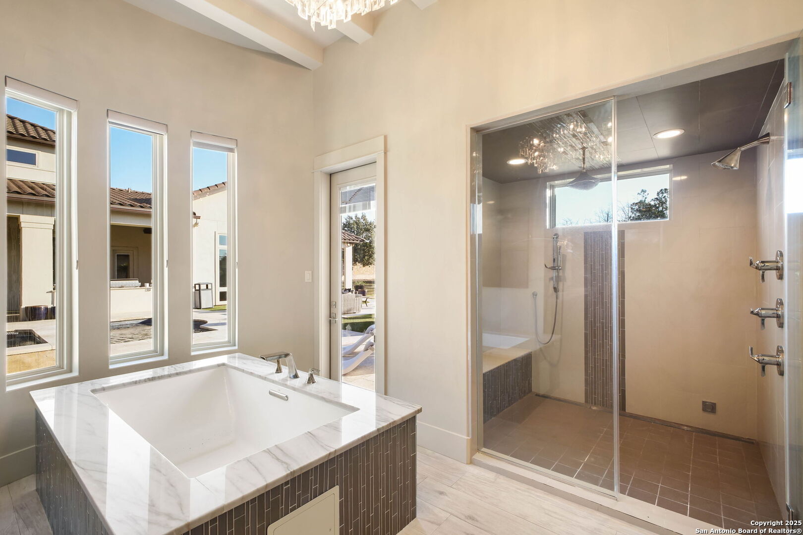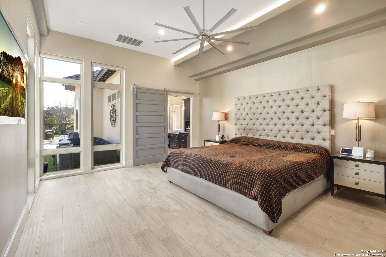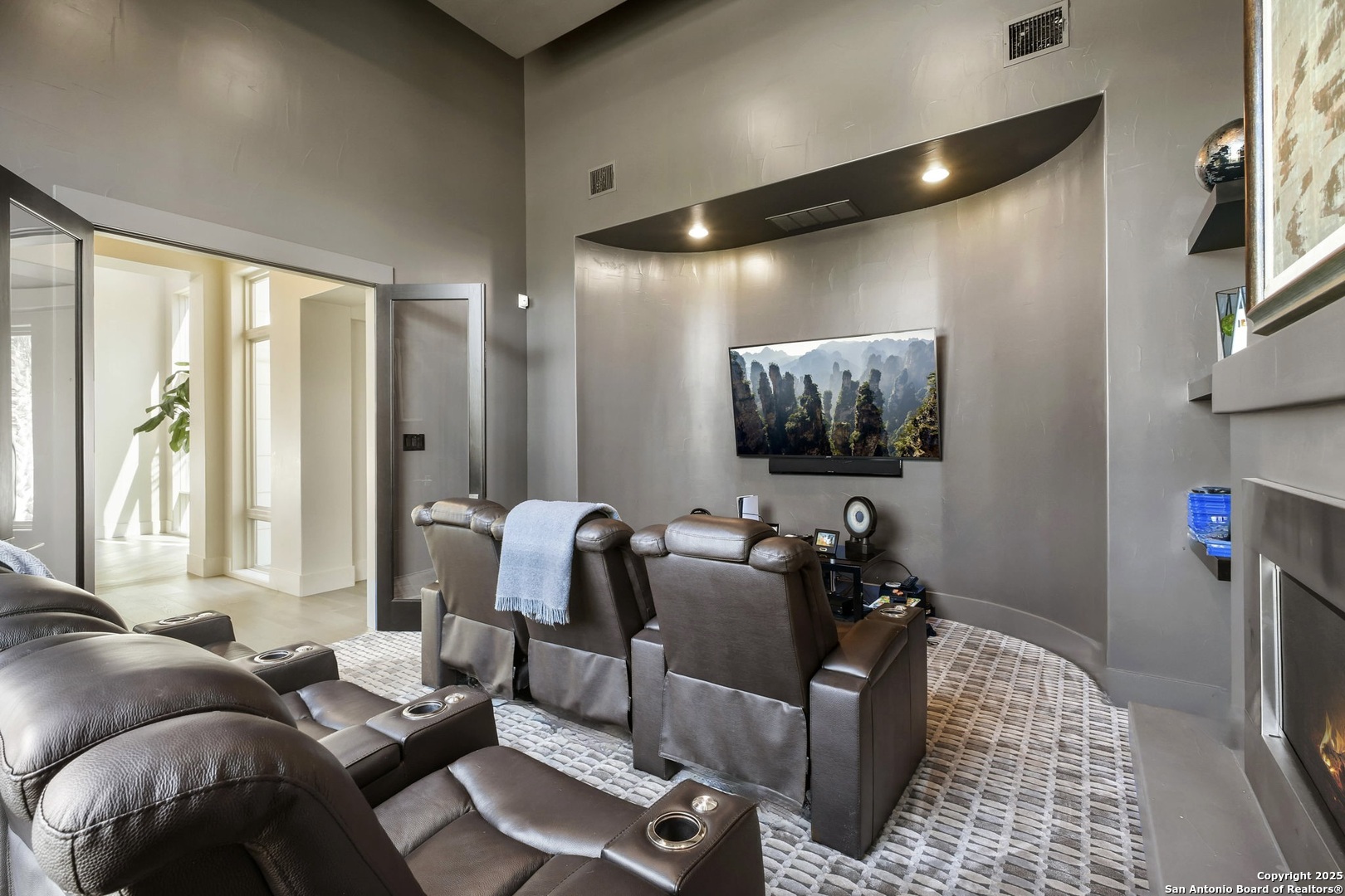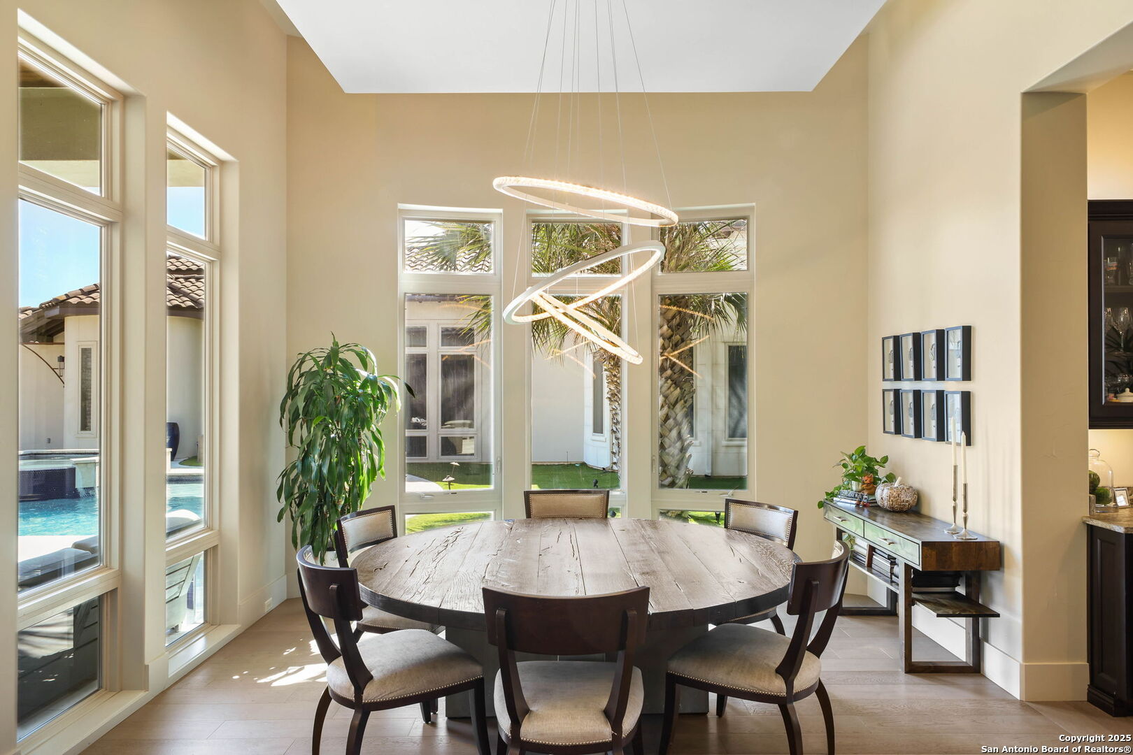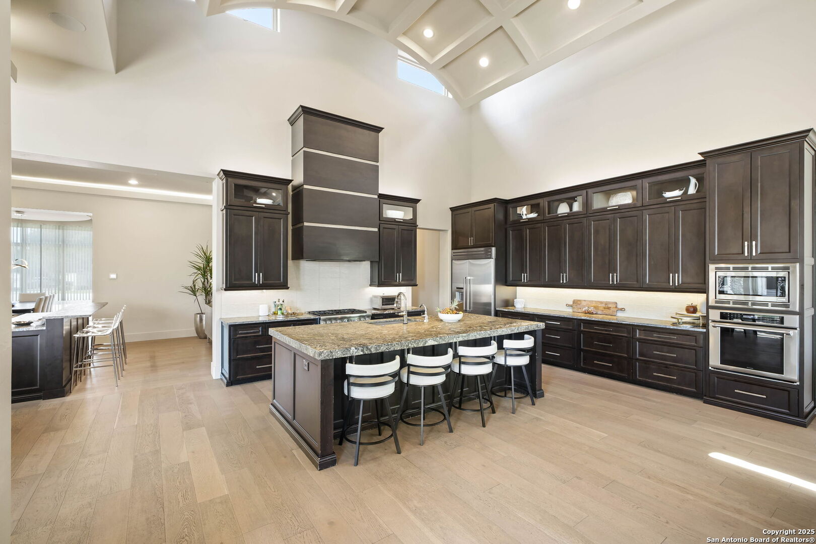 Welcome to this one-story Modern Transitional estate which embodies show stopping detail and sophistication in San Antonio's most prestigious gated communities-Huntington at Shavano Park. This Paul Allen custom home is over 6400 sq/ft and features unsurpassed craftsmanship and design elements that showcase the open floor plan with walls of sliding glass doors that seamlessly integrate indoor and outdoor living. The chef's kitchen features top of the line appliances, an expansive custom island that flows into the living room with custom architectural/ceiling detail, a dramatic fireplace, large separate breakfast and dining areas and a full walk up bar. The interior is detailed with oak floors, smoothly finished walls and designer light fixtures. The oversized master retreat boasts a luxurious spa-like bathroom and a massive walk-in closet with extensive custom cabinetry/built-ins and outdoor access. Impeccable craftsmanship prevails with four spacious guest bedrooms, all with en-suite bathrooms. Additional features include a large office & an oversized game room with a wet bar and patio access leading out to a large covered patio with a full outdoor kitchen. The resort style outdoor area features an oversized patio, a large spacious yard that offers full privacy backing up to a greenbelt, custom pool/spa and a sports court. An oversized 3-car garage offers ample parking and storage. This property must be experienced in person to be able to take in all it has to offer. This desired location offers a private retreat while keeping you close to premier dining, shopping, and entertainment, with effortless access to Loop 1604 and I-10.