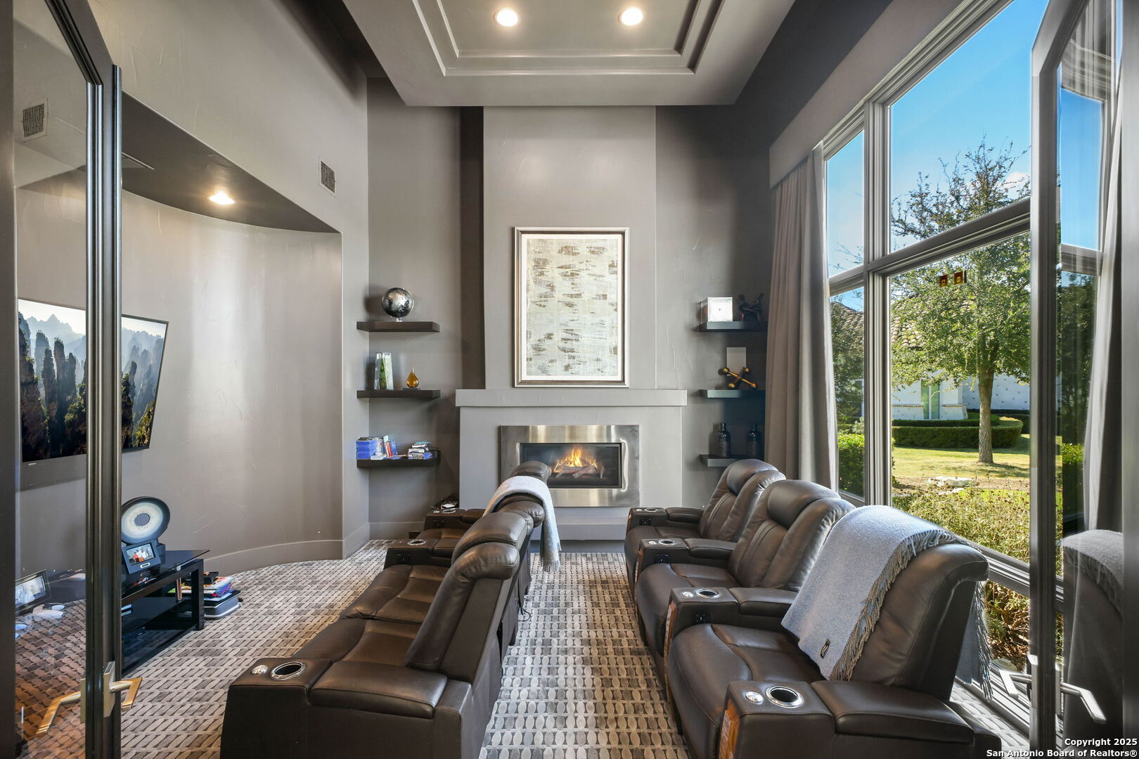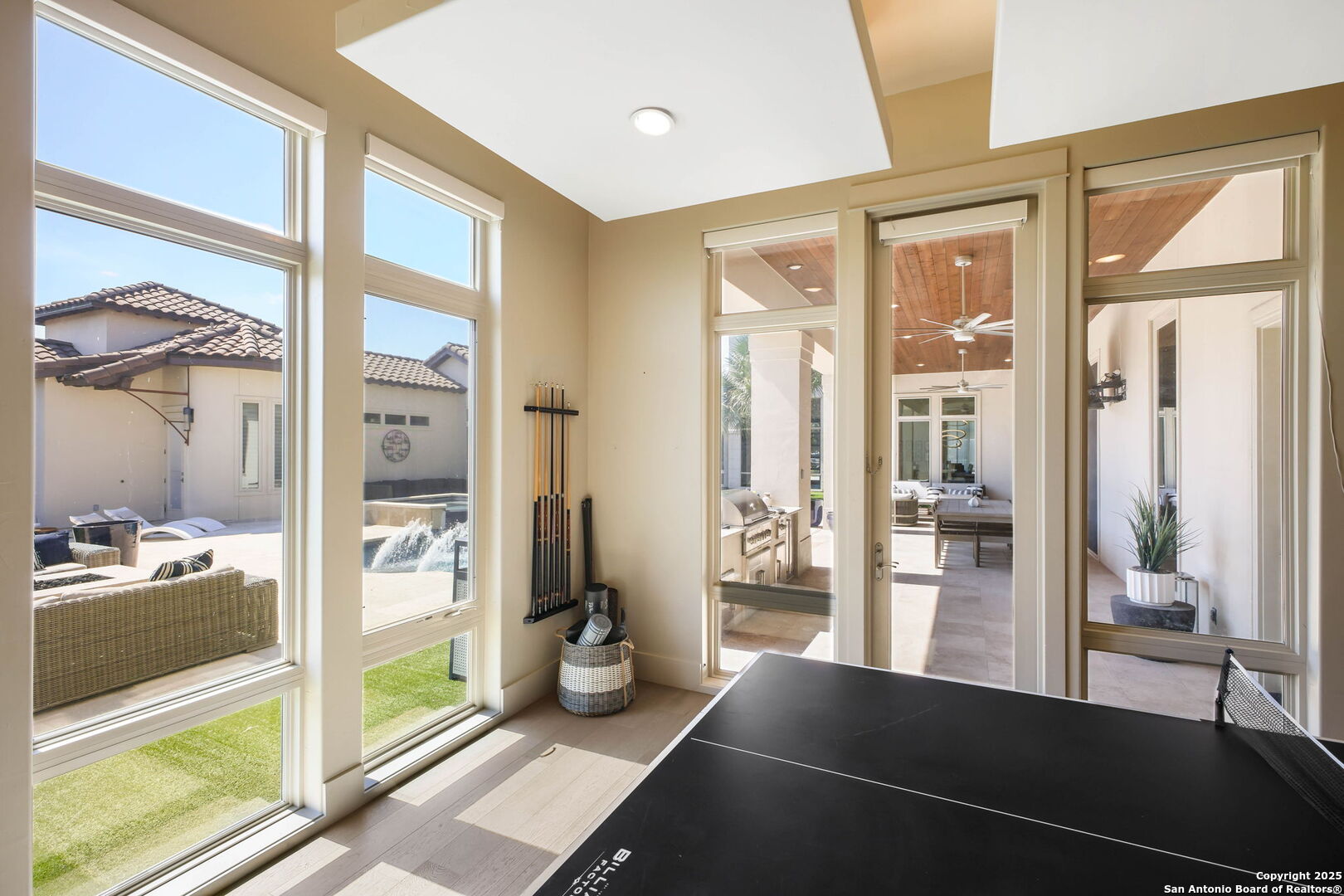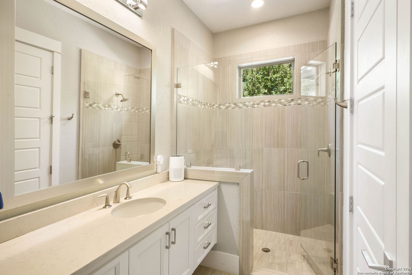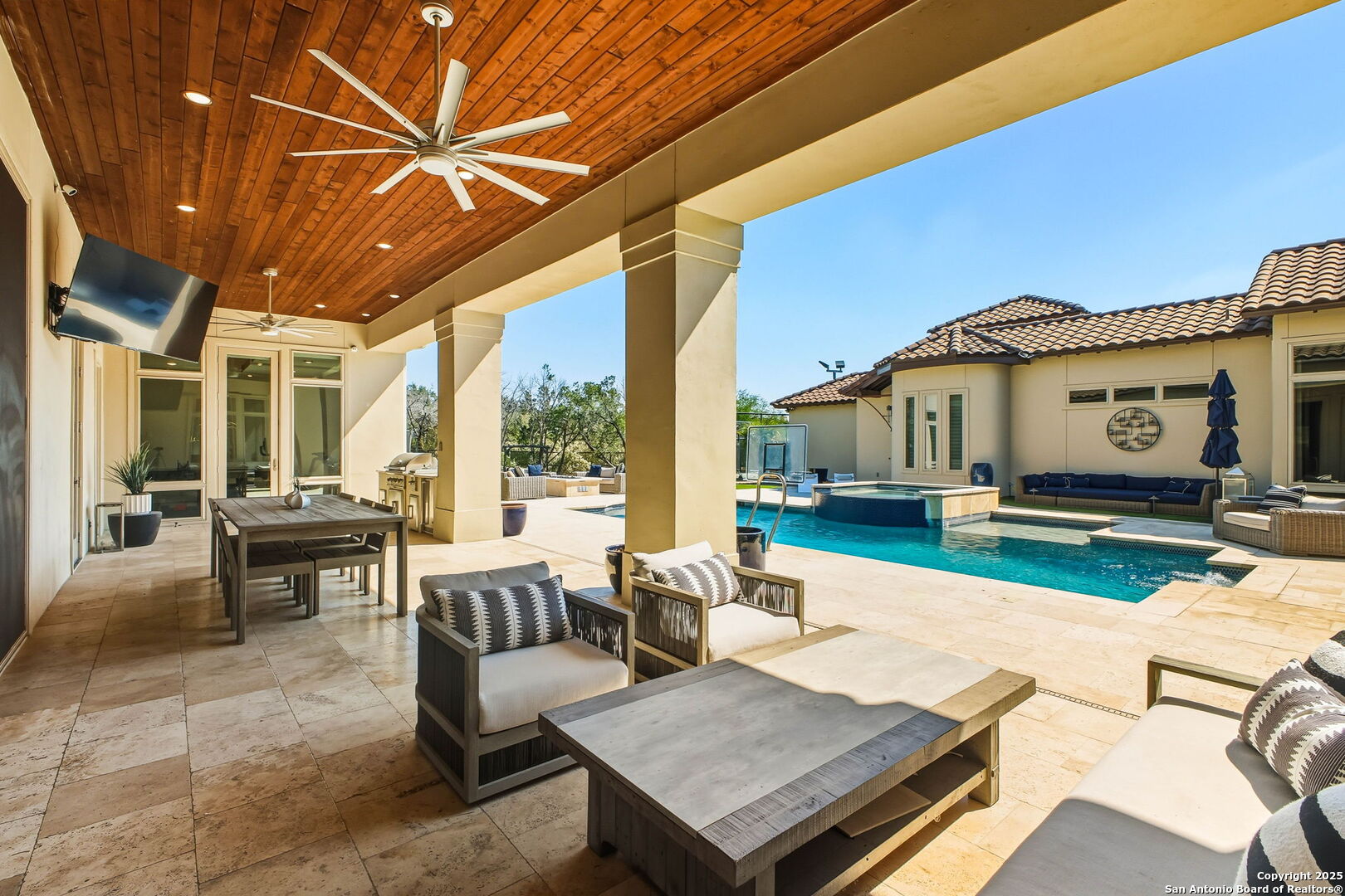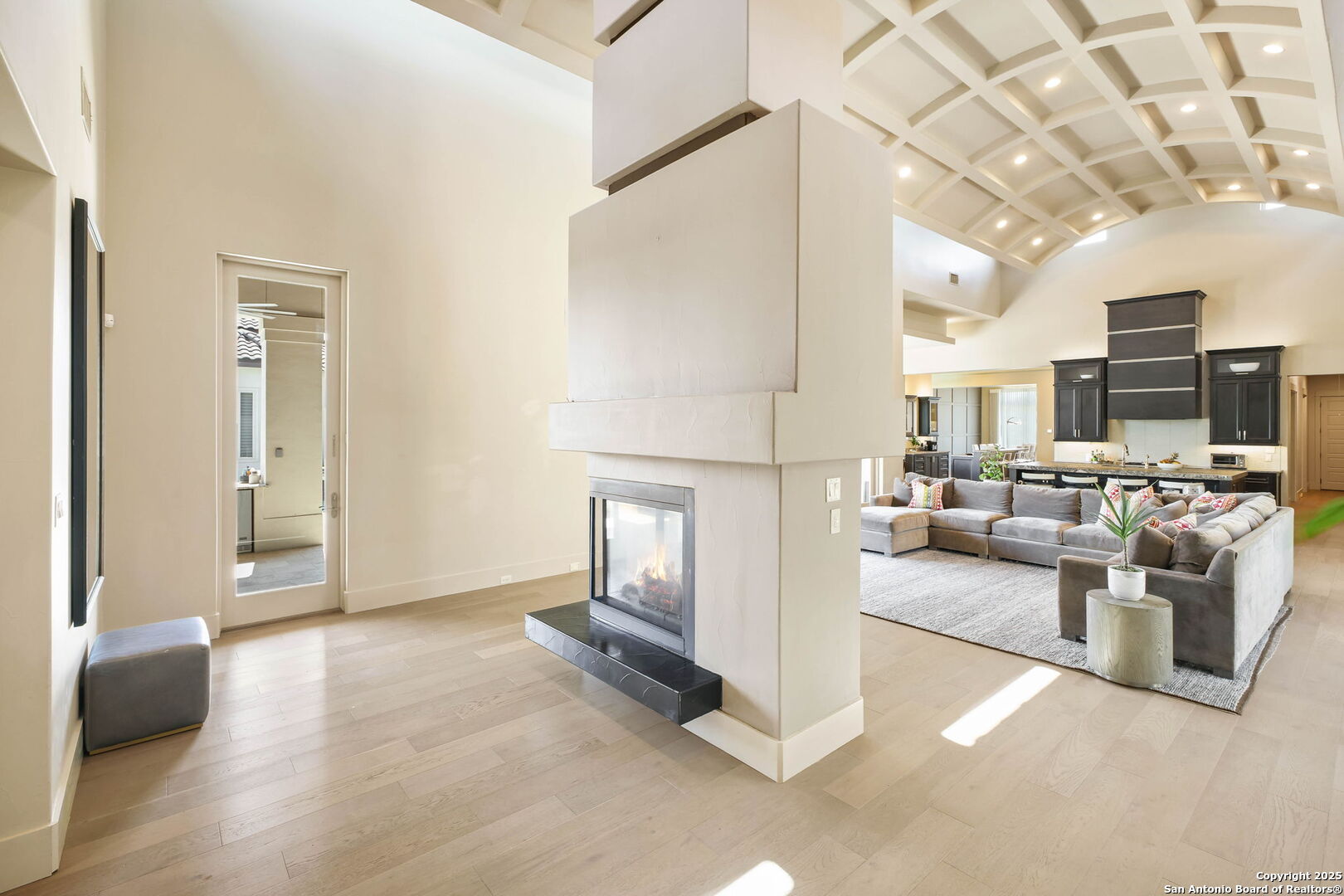 Welcome to this one-story Modern Transitional estate which embodies show stopping detail and sophistication in San Antonio's most prestigious gated communities-Huntington at Shavano Park. This Paul Allen custom home is over 6400 sq/ft and features unsurpassed craftsmanship and design elements that showcase the open floor plan with walls of sliding glass doors that seamlessly integrate indoor and outdoor living. The chef's kitchen features top of the line appliances, an expansive custom island that flows into the living room with custom architectural/ceiling detail, a dramatic fireplace, large separate breakfast and dining areas and a full walk up bar. The interior is detailed with oak floors, smoothly finished walls and designer light fixtures. The oversized master retreat boasts a luxurious spa-like bathroom and a massive walk-in closet with extensive custom cabinetry/built-ins and outdoor access. Impeccable craftsmanship prevails with four spacious guest bedrooms, all with en-suite bathrooms. Additional features include a large office & an oversized game room with a wet bar and patio access leading out to a large covered patio with a full outdoor kitchen. The resort style outdoor area features an oversized patio, a large spacious yard that offers full privacy backing up to a greenbelt, custom pool/spa and a sports court. An oversized 3-car garage offers ample parking and storage. This property must be experienced in person to be able to take in all it has to offer. This desired location offers a private retreat while keeping you close to premier dining, shopping, and entertainment, with effortless access to Loop 1604 and I-10.