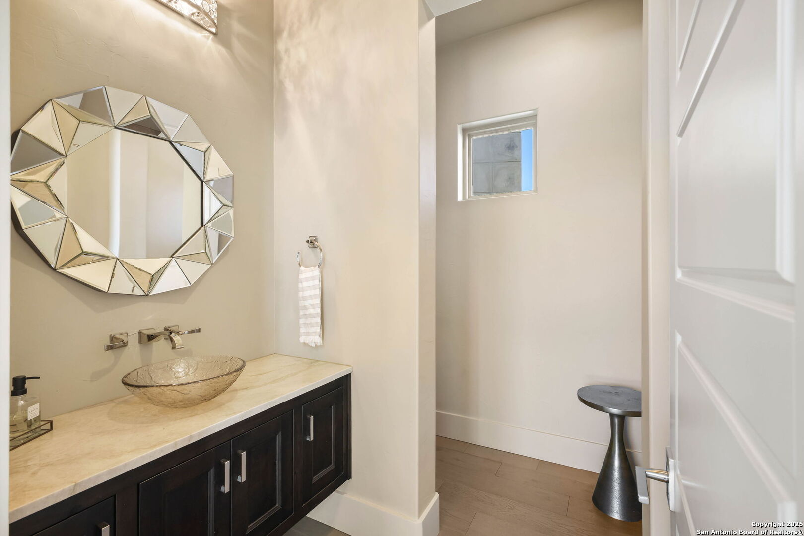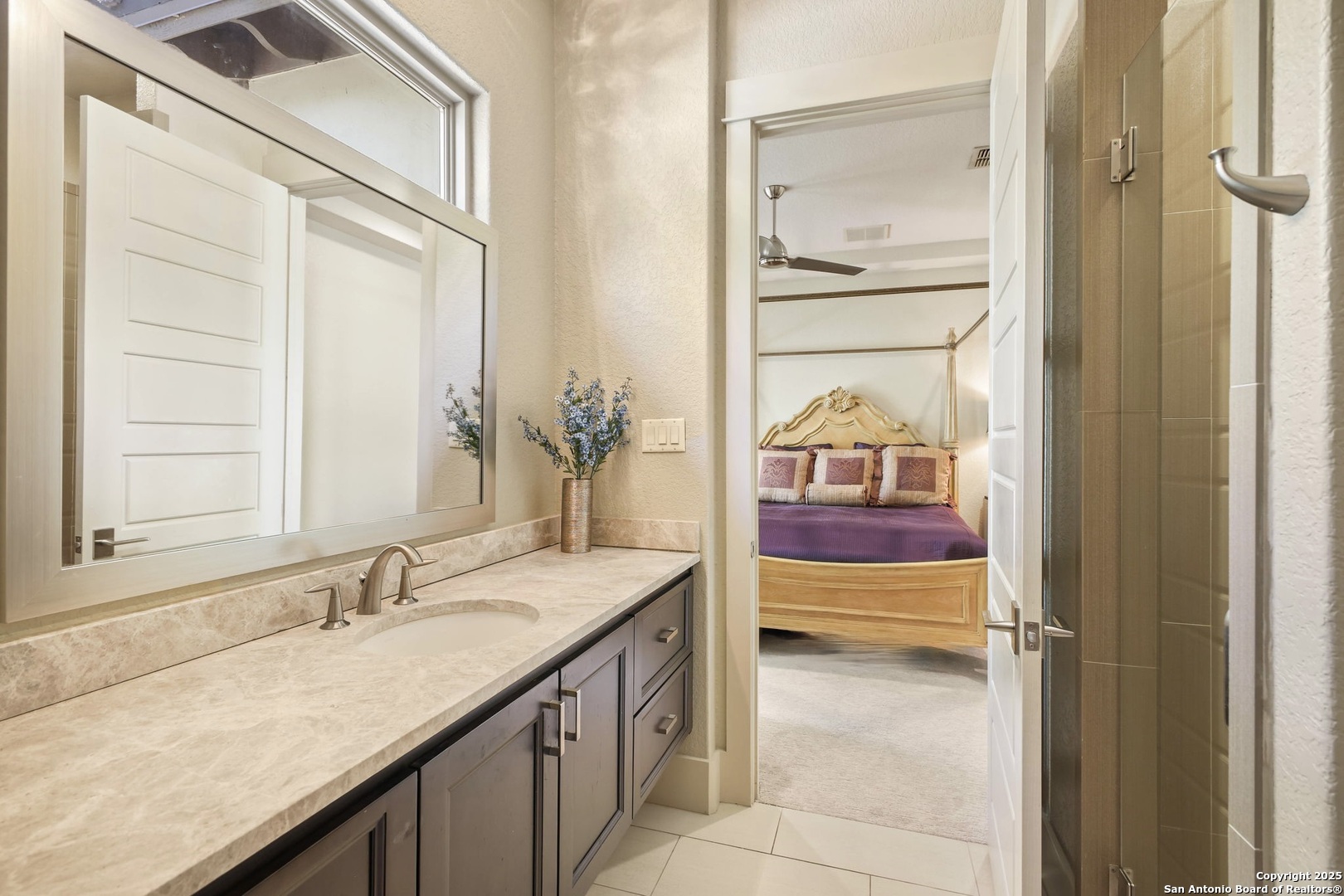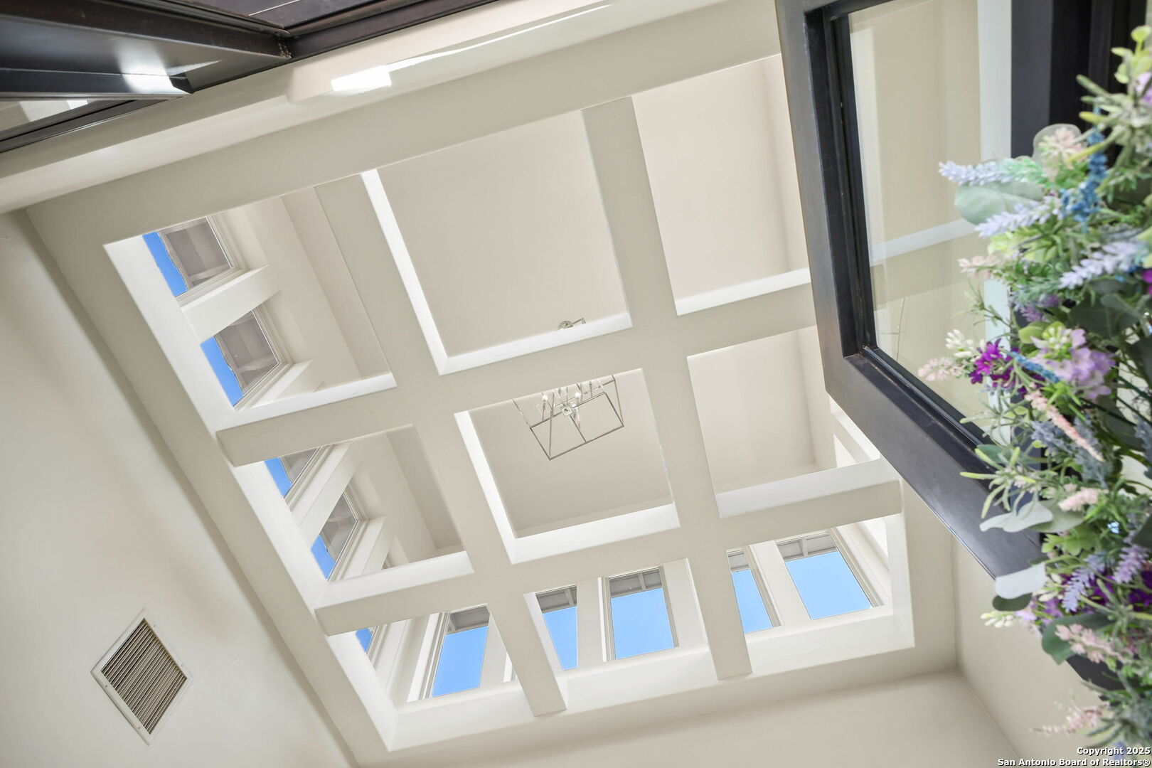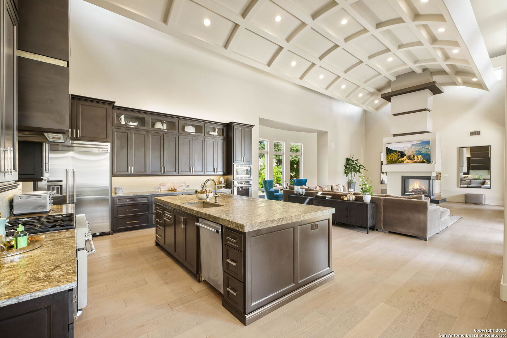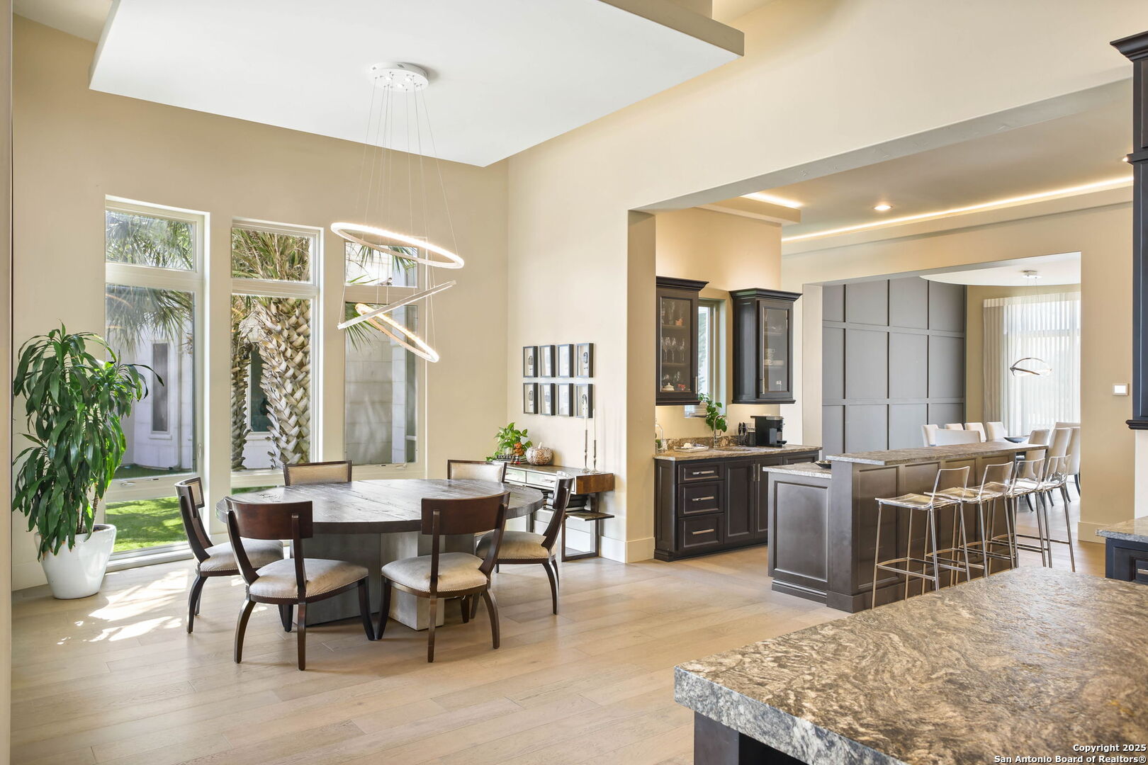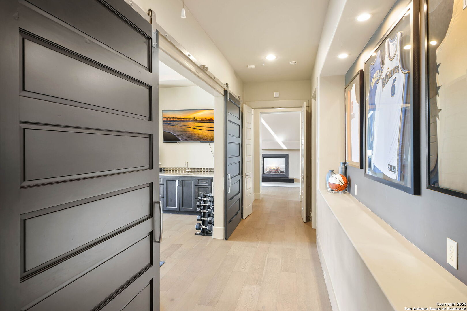 Welcome to this one-story Modern Transitional estate which embodies show stopping detail and sophistication in San Antonio's most prestigious gated communities-Huntington at Shavano Park. This Paul Allen custom home is over 6400 sq/ft and features unsurpassed craftsmanship and design elements that showcase the open floor plan with walls of sliding glass doors that seamlessly integrate indoor and outdoor living. The chef's kitchen features top of the line appliances, an expansive custom island that flows into the living room with custom architectural/ceiling detail, a dramatic fireplace, large separate breakfast and dining areas and a full walk up bar. The interior is detailed with oak floors, smoothly finished walls and designer light fixtures. The oversized master retreat boasts a luxurious spa-like bathroom and a massive walk-in closet with extensive custom cabinetry/built-ins and outdoor access. Impeccable craftsmanship prevails with four spacious guest bedrooms, all with en-suite bathrooms. Additional features include a large office & an oversized game room with a wet bar and patio access leading out to a large covered patio with a full outdoor kitchen. The resort style outdoor area features an oversized patio, a large spacious yard that offers full privacy backing up to a greenbelt, custom pool/spa and a sports court. An oversized 3-car garage offers ample parking and storage. This property must be experienced in person to be able to take in all it has to offer. This desired location offers a private retreat while keeping you close to premier dining, shopping, and entertainment, with effortless access to Loop 1604 and I-10.