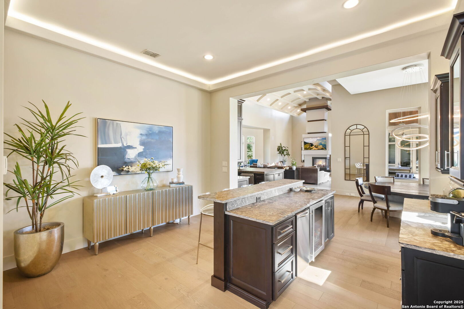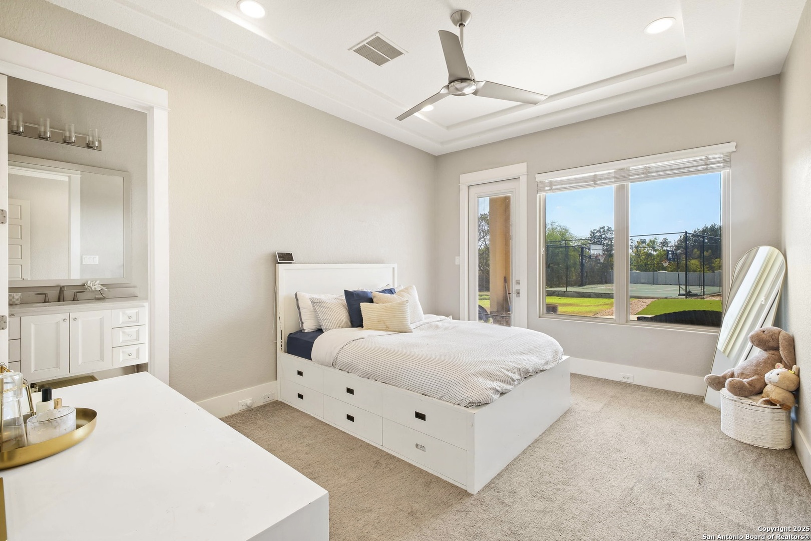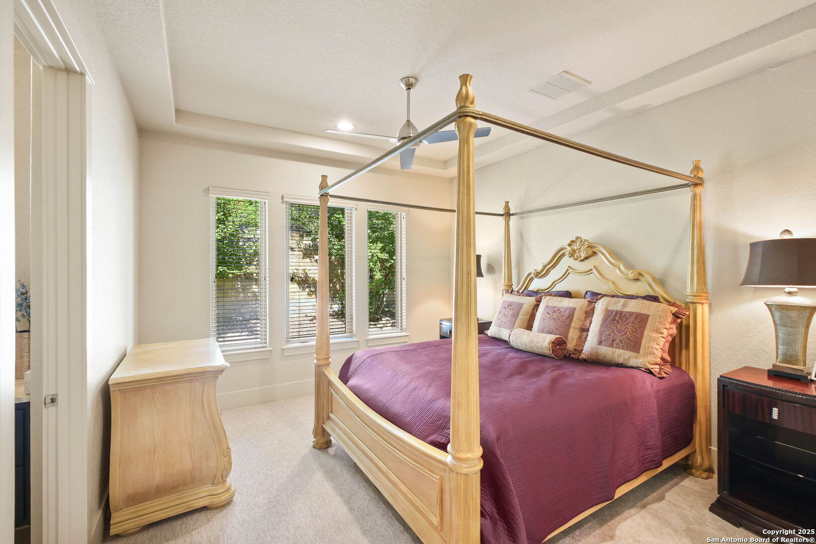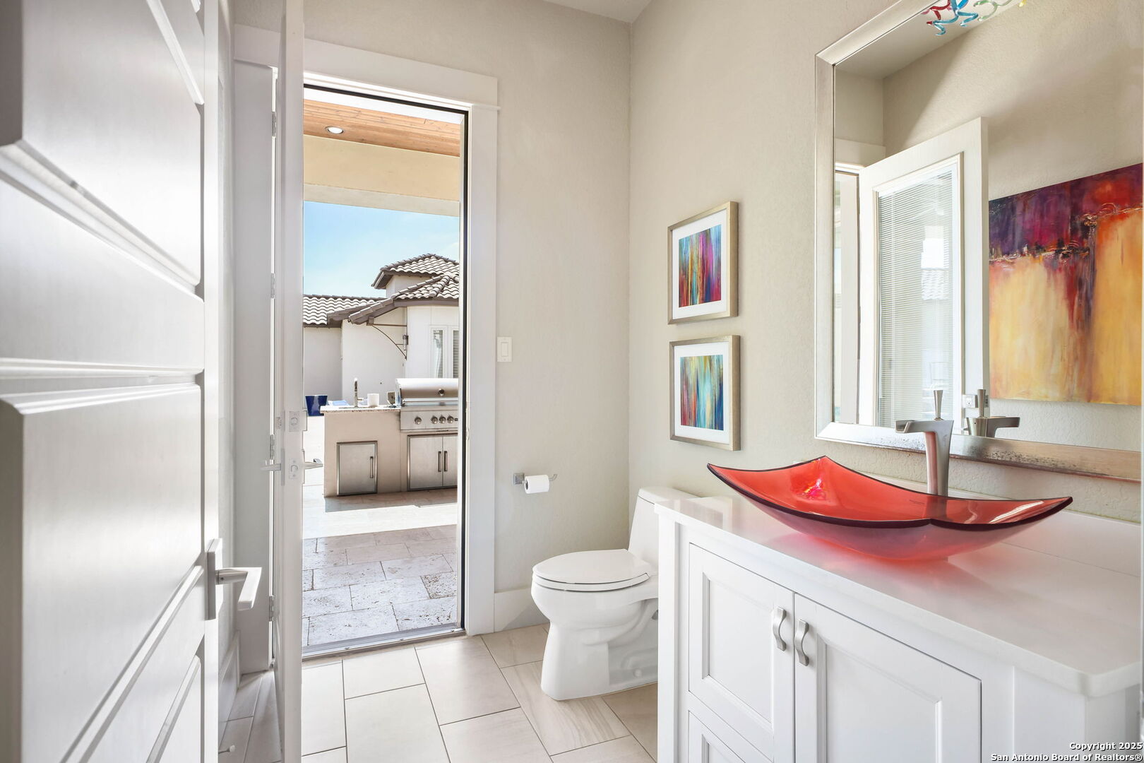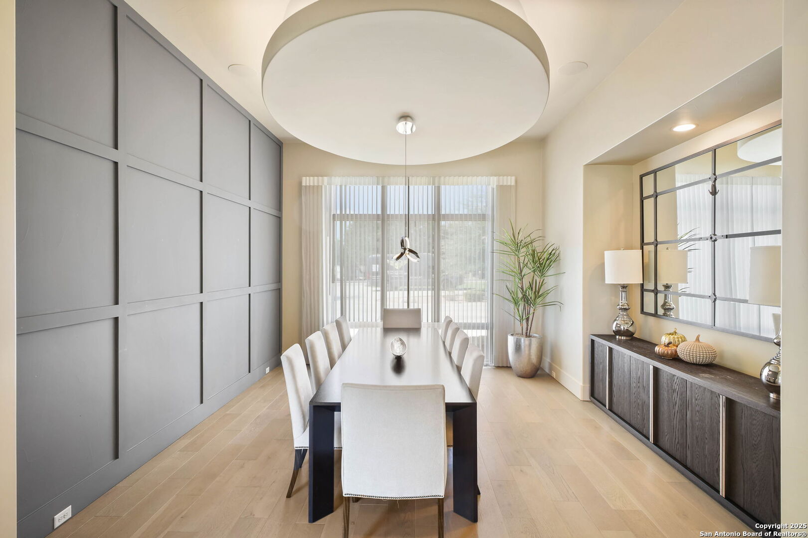 Welcome to this one-story Modern Transitional estate which embodies show stopping detail and sophistication in San Antonio's most prestigious gated communities-Huntington at Shavano Park. This Paul Allen custom home is over 6400 sq/ft and features unsurpassed craftsmanship and design elements that showcase the open floor plan with walls of sliding glass doors that seamlessly integrate indoor and outdoor living. The chef's kitchen features top of the line appliances, an expansive custom island that flows into the living room with custom architectural/ceiling detail, a dramatic fireplace, large separate breakfast and dining areas and a full walk up bar. The interior is detailed with oak floors, smoothly finished walls and designer light fixtures. The oversized master retreat boasts a luxurious spa-like bathroom and a massive walk-in closet with extensive custom cabinetry/built-ins and outdoor access. Impeccable craftsmanship prevails with four spacious guest bedrooms, all with en-suite bathrooms. Additional features include a large office & an oversized game room with a wet bar and patio access leading out to a large covered patio with a full outdoor kitchen. The resort style outdoor area features an oversized patio, a large spacious yard that offers full privacy backing up to a greenbelt, custom pool/spa and a sports court. An oversized 3-car garage offers ample parking and storage. This property must be experienced in person to be able to take in all it has to offer. This desired location offers a private retreat while keeping you close to premier dining, shopping, and entertainment, with effortless access to Loop 1604 and I-10.