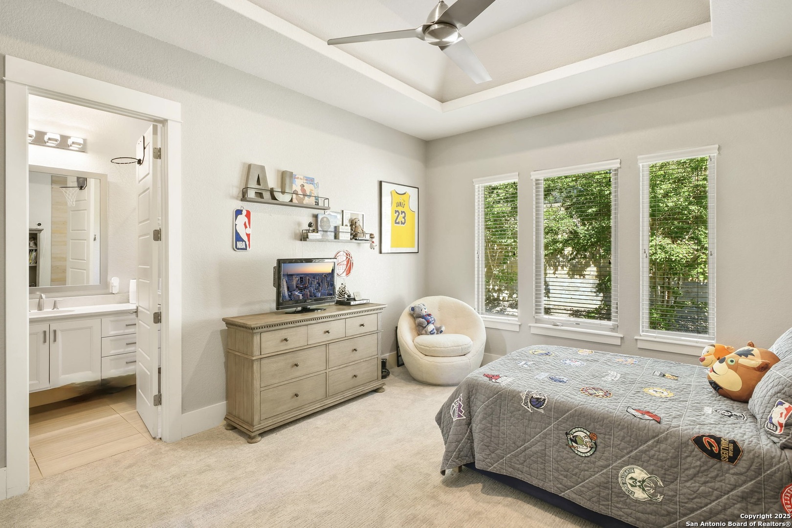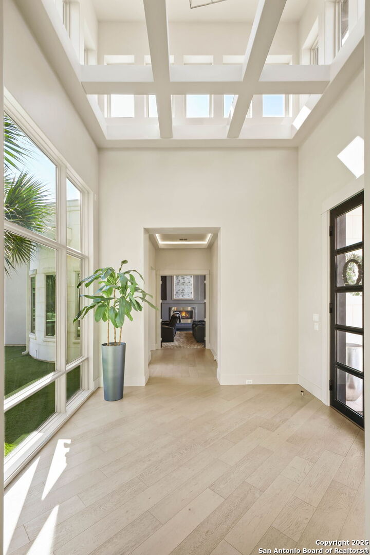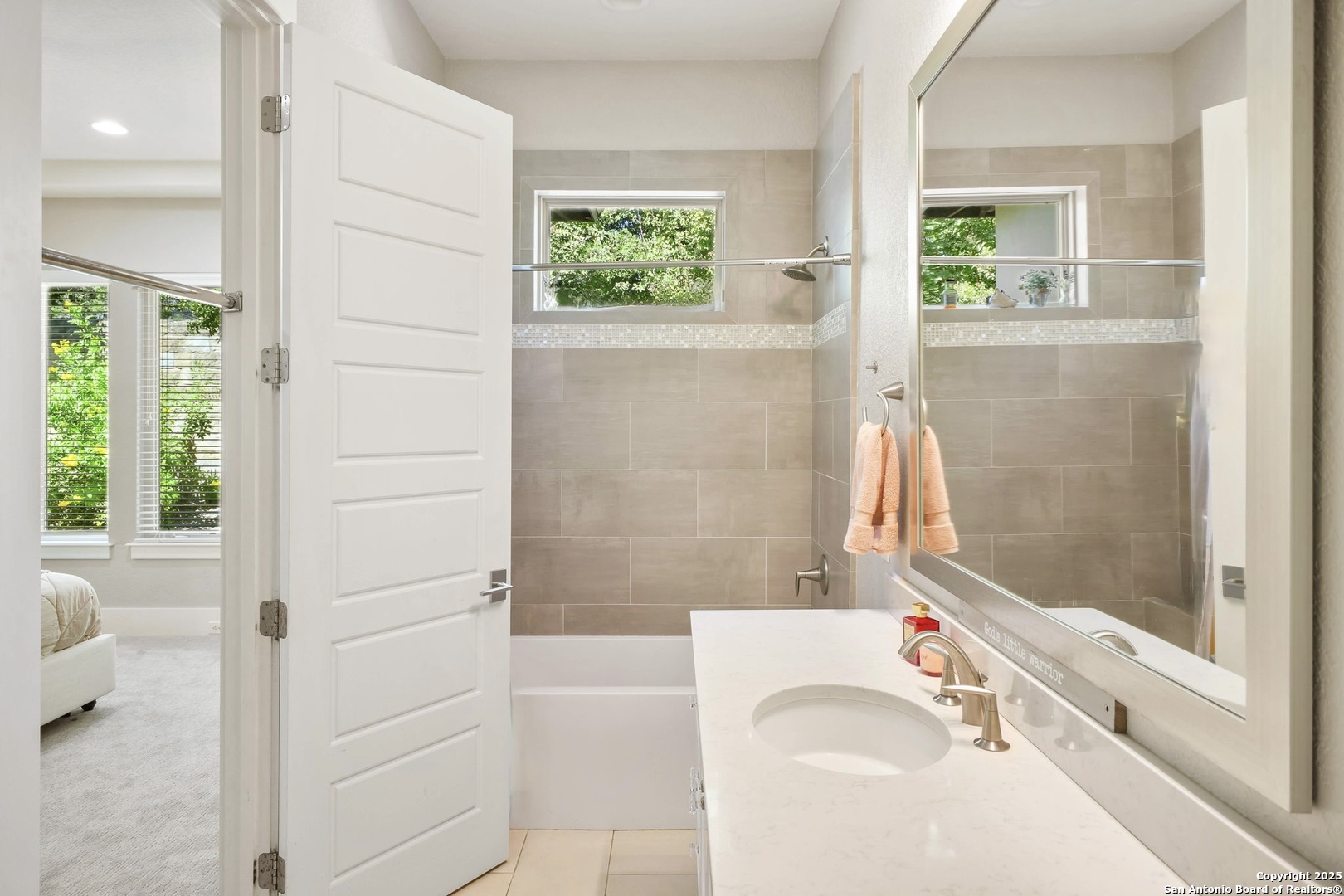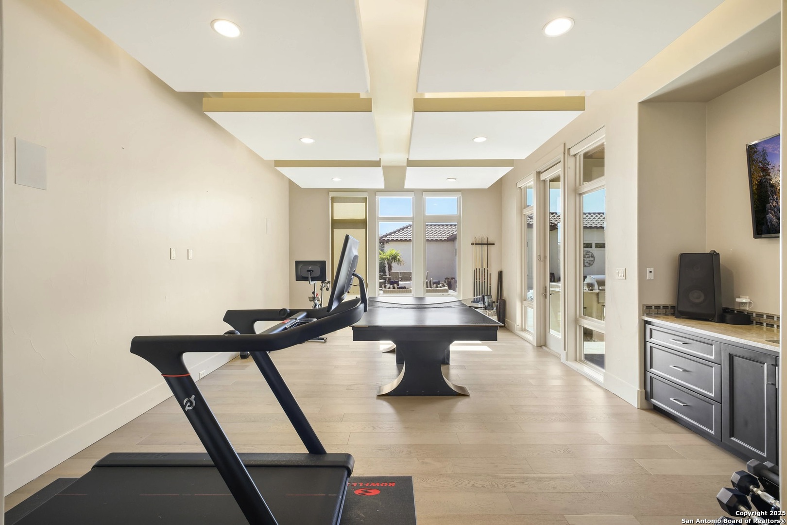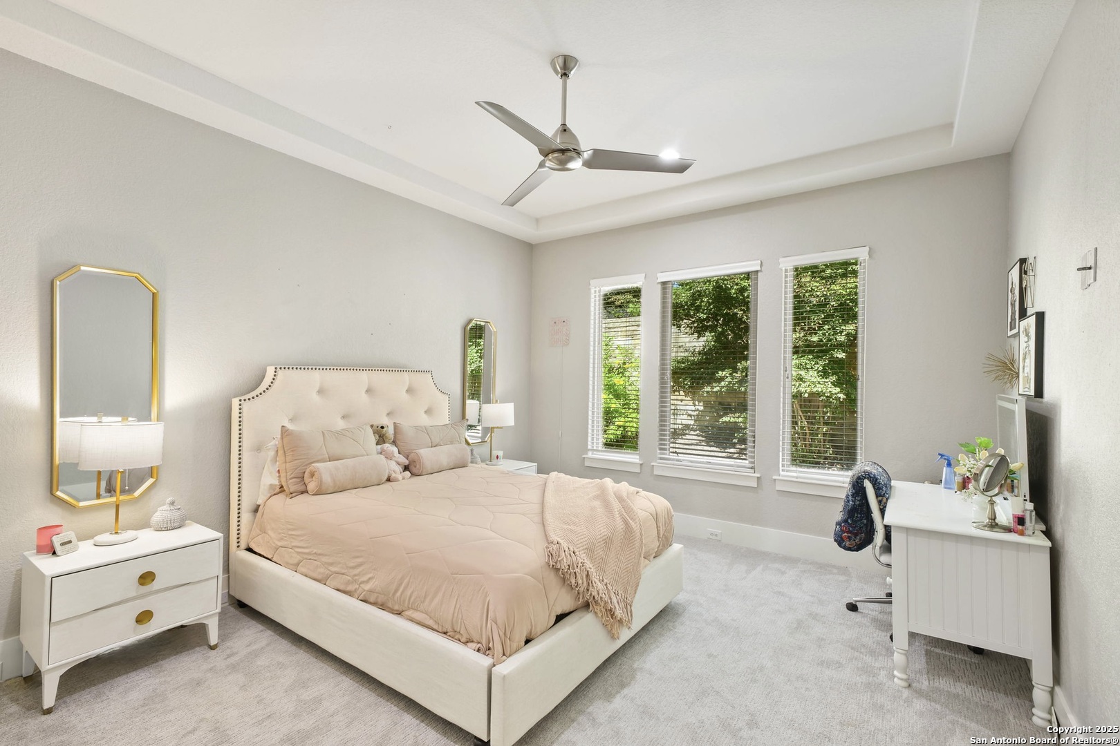Welcome to this one-story Modern Transitional estate which embodies show stopping detail and sophistication in San Antonio's most prestigious gated communities-Huntington at Shavano Park. This Paul Allen custom home is over 6400 sq/ft and features unsurpassed craftsmanship and design elements that showcase the open floor plan with walls of sliding glass doors that seamlessly integrate indoor and outdoor living. The chef's kitchen features top of the line appliances, an expansive custom island that flows into the living room with custom architectural/ceiling detail, a dramatic fireplace, large separate breakfast and dining areas and a full walk up bar. The interior is detailed with oak floors, smoothly finished walls and designer light fixtures. The oversized master retreat boasts a luxurious spa-like bathroom and a massive walk-in closet with extensive custom cabinetry/built-ins and outdoor access. Impeccable craftsmanship prevails with four spacious guest bedrooms, all with en-suite bathrooms. Additional features include a large office & an oversized game room with a wet bar and patio access leading out to a large covered patio with a full outdoor kitchen. The resort style outdoor area features an oversized patio, a large spacious yard that offers full privacy backing up to a greenbelt, custom pool/spa and a sports court. An oversized 3-car garage offers ample parking and storage. This property must be experienced in person to be able to take in all it has to offer. This desired location offers a private retreat while keeping you close to premier dining, shopping, and entertainment, with effortless access to Loop 1604 and I-10.