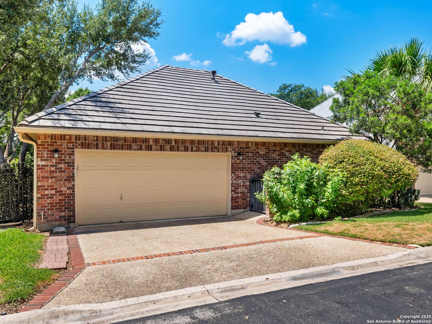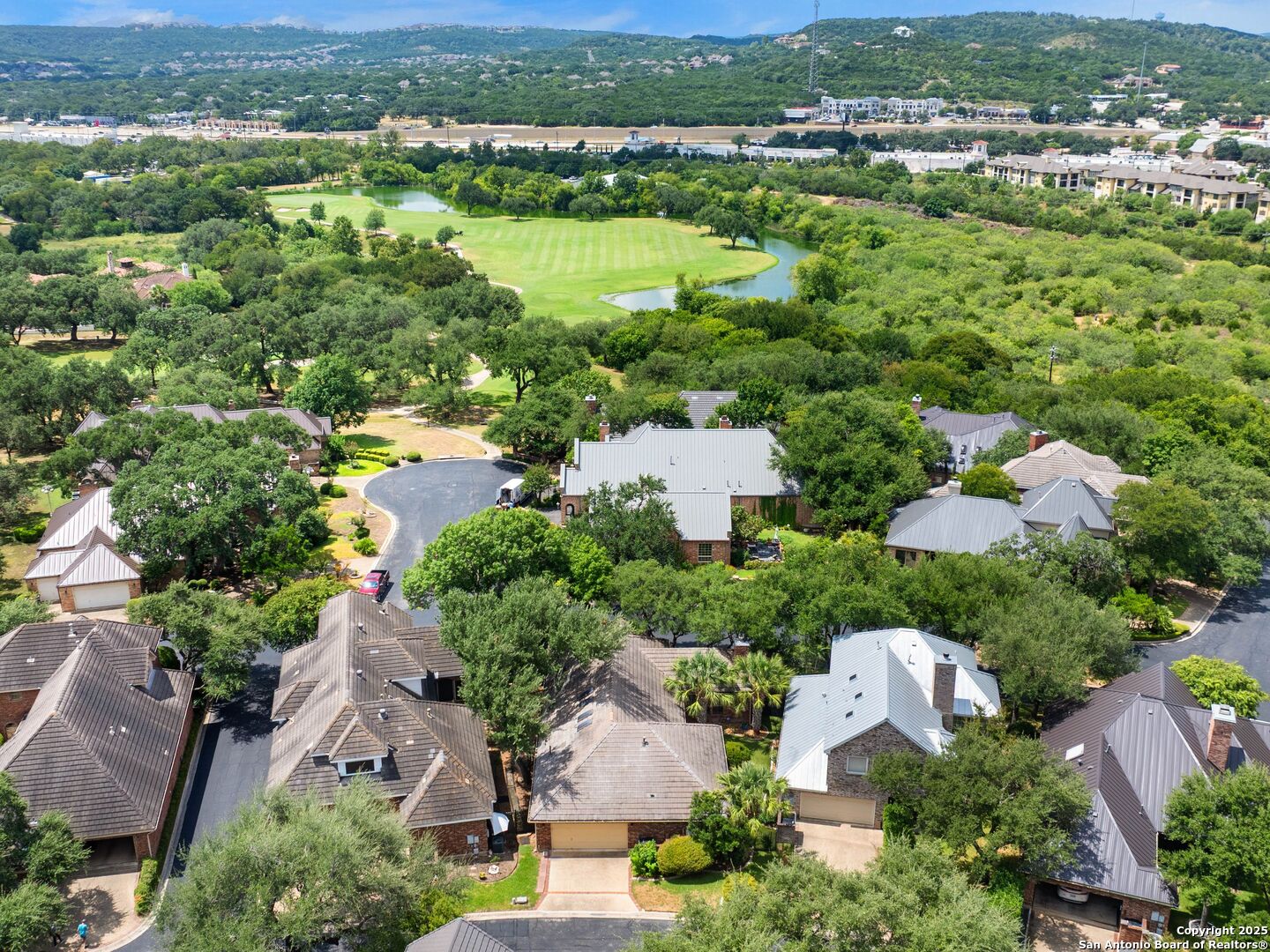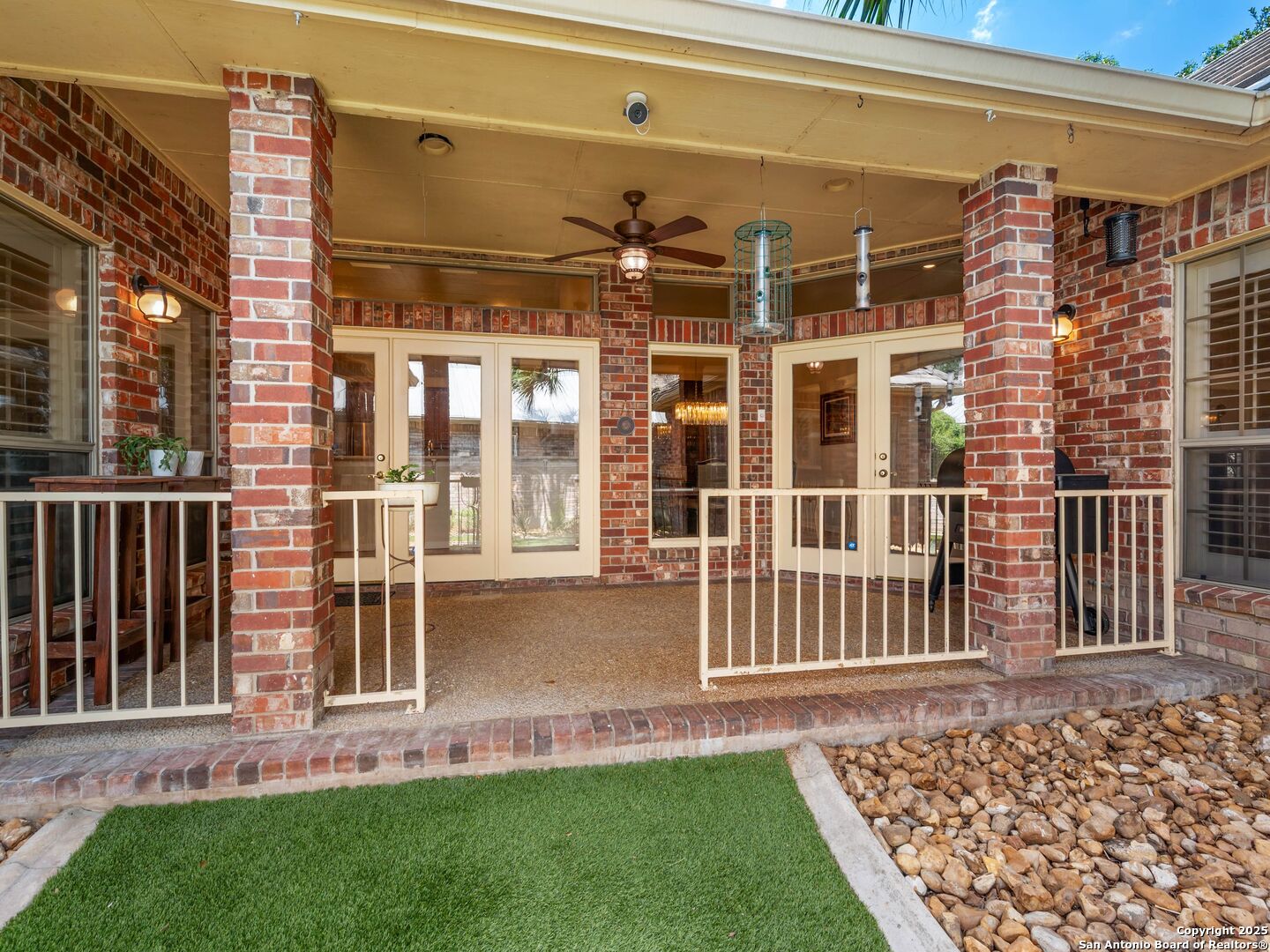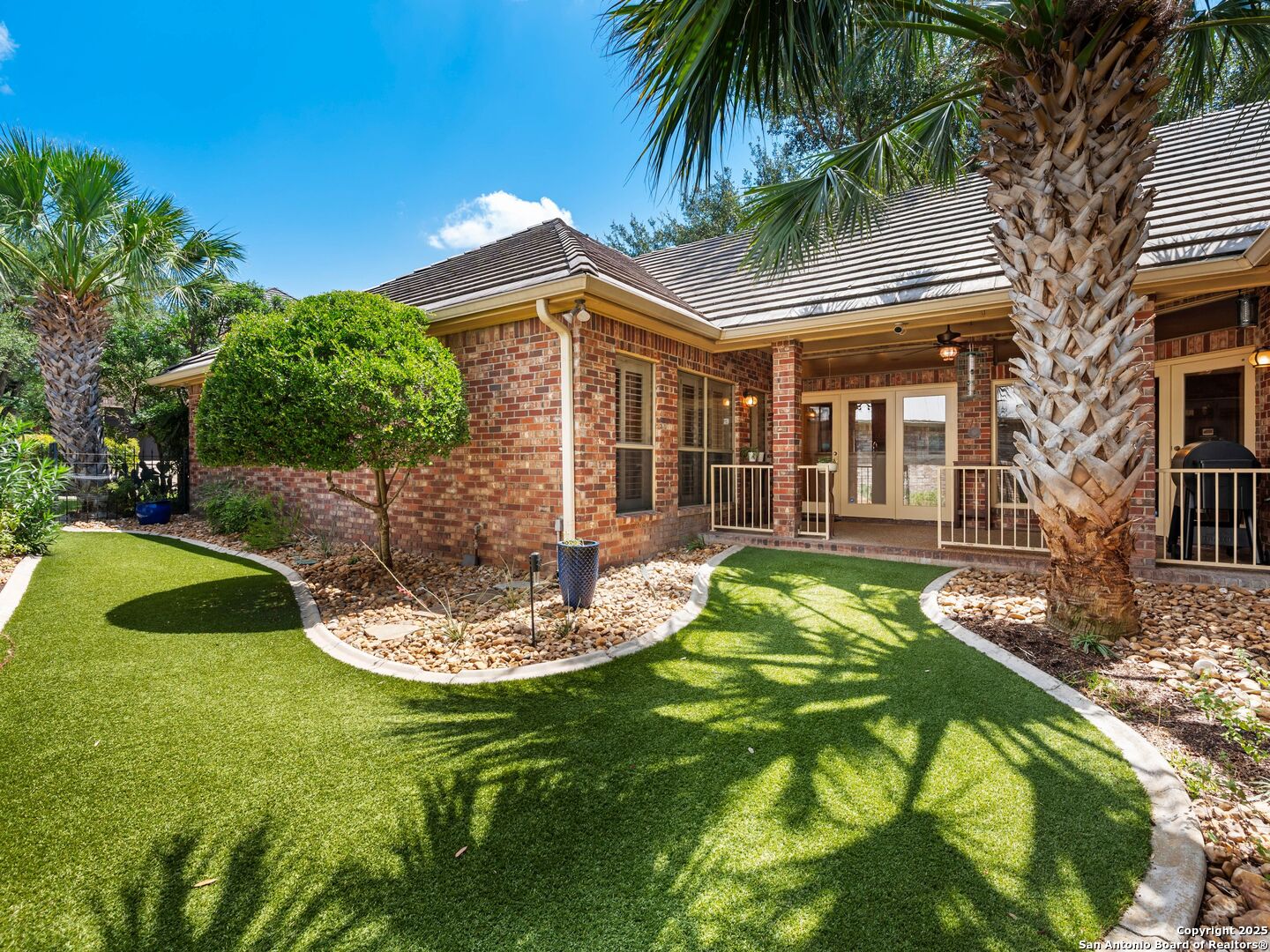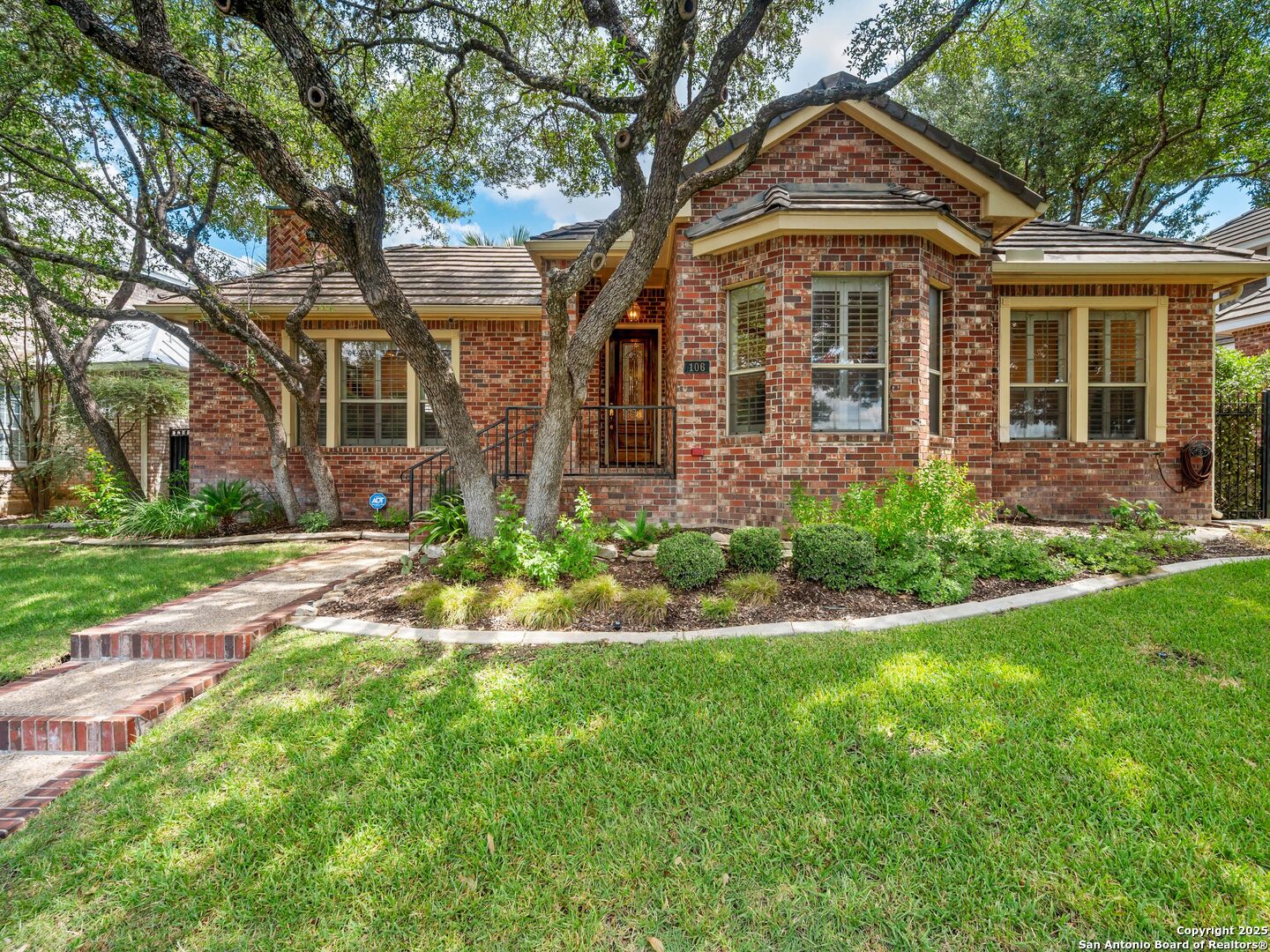 Pristine! Updated single-story home by Burdick Custom Homes nestled in the guard gated The Gardens at The Dominion. This residence showcases immense character, meticulous craftsmanship with soaring vaulted ceilings, abundant natural light from walls of windows, upgraded lighting, true hardwood floors, and elegant plantation shutters throughout. The spacious family room invites relaxation with its fireplace and custom built-ins, while the expansive kitchen is a chef's dream-featuring recently installed Taj Majal quartzite countertops, designer selected backsplash, an oversized island, gas cooking, and double ovens perfect for entertaining. Double doors lead you to the private primary suite, complete with a partially updated bathroom offering dual vanities, a walk-in shower, soaking tub, and two generous walk-in closets. Secondary bedrooms are well-sized, and offer great versatility. Enjoy tranquil outdoor living in the secluded backyard, featuring a covered patio, lush landscaping, and low-maintenance artificial turf-perfect for a lock-and-leave lifestyle. A rear-entry two-car garage provides ample storage and convenience. This exceptional home offers a rare blend of luxury, privacy, and low-maintenance living in one of San Antonio's most prestigious communities.