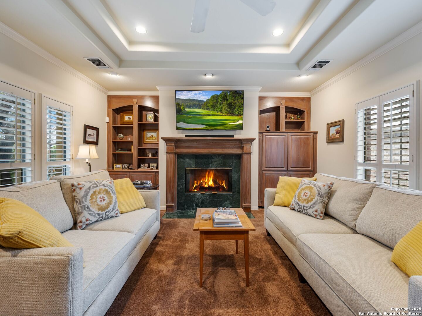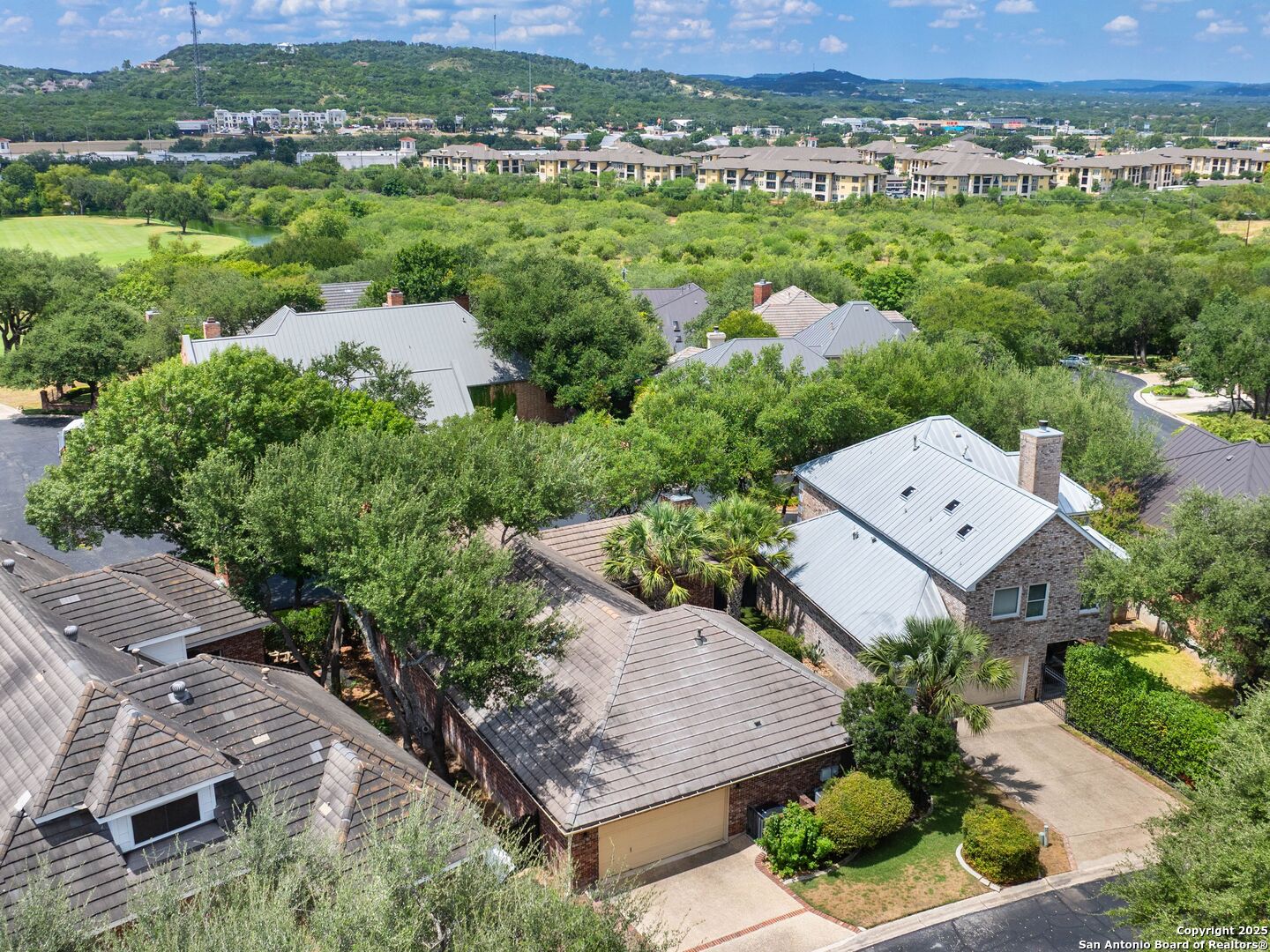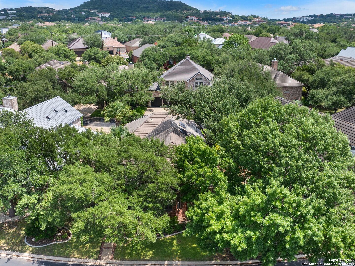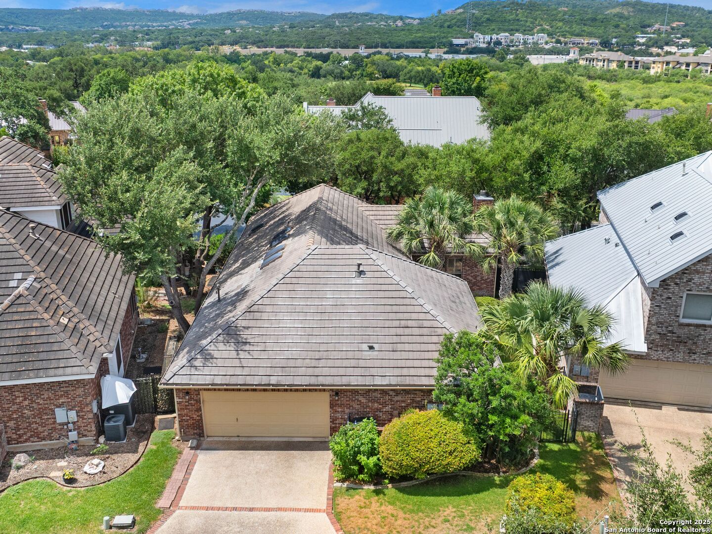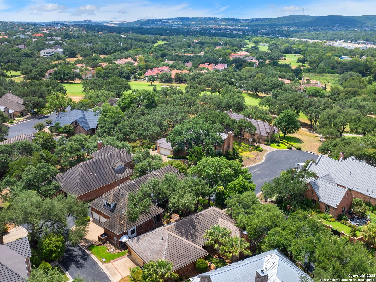 Pristine! Updated single-story home by Burdick Custom Homes nestled in the guard gated The Gardens at The Dominion. This residence showcases immense character, meticulous craftsmanship with soaring vaulted ceilings, abundant natural light from walls of windows, upgraded lighting, true hardwood floors, and elegant plantation shutters throughout. The spacious family room invites relaxation with its fireplace and custom built-ins, while the expansive kitchen is a chef's dream-featuring recently installed Taj Majal quartzite countertops, designer selected backsplash, an oversized island, gas cooking, and double ovens perfect for entertaining. Double doors lead you to the private primary suite, complete with a partially updated bathroom offering dual vanities, a walk-in shower, soaking tub, and two generous walk-in closets. Secondary bedrooms are well-sized, and offer great versatility. Enjoy tranquil outdoor living in the secluded backyard, featuring a covered patio, lush landscaping, and low-maintenance artificial turf-perfect for a lock-and-leave lifestyle. A rear-entry two-car garage provides ample storage and convenience. This exceptional home offers a rare blend of luxury, privacy, and low-maintenance living in one of San Antonio's most prestigious communities.