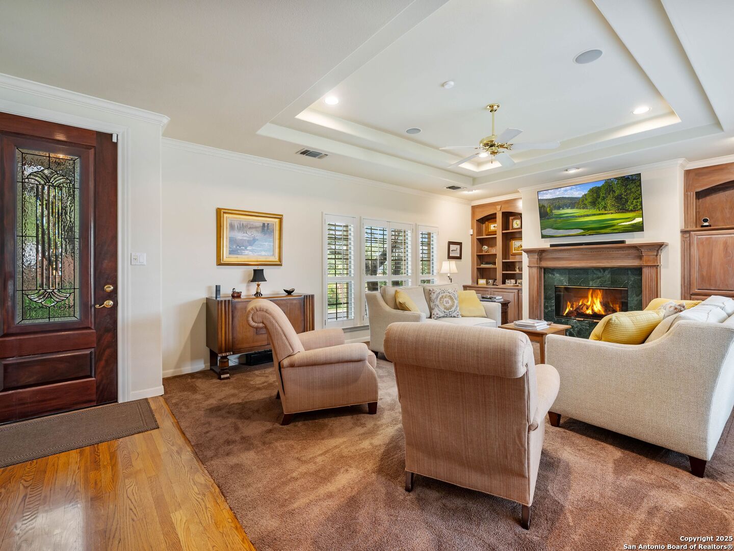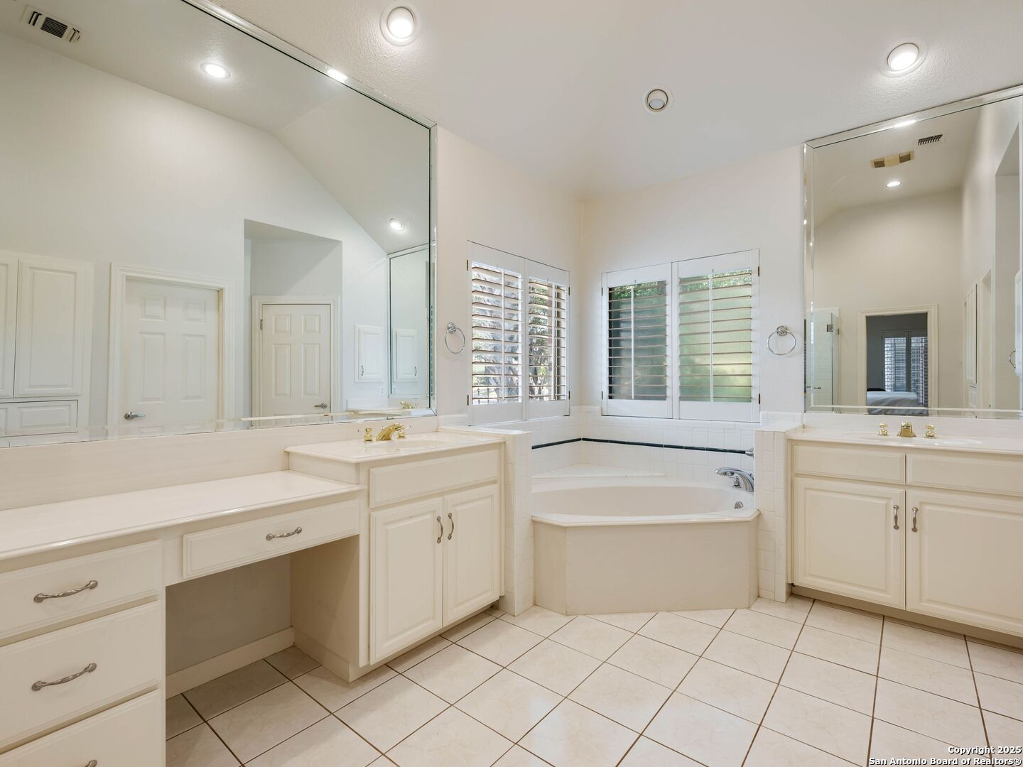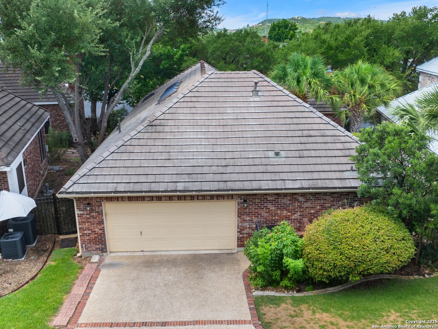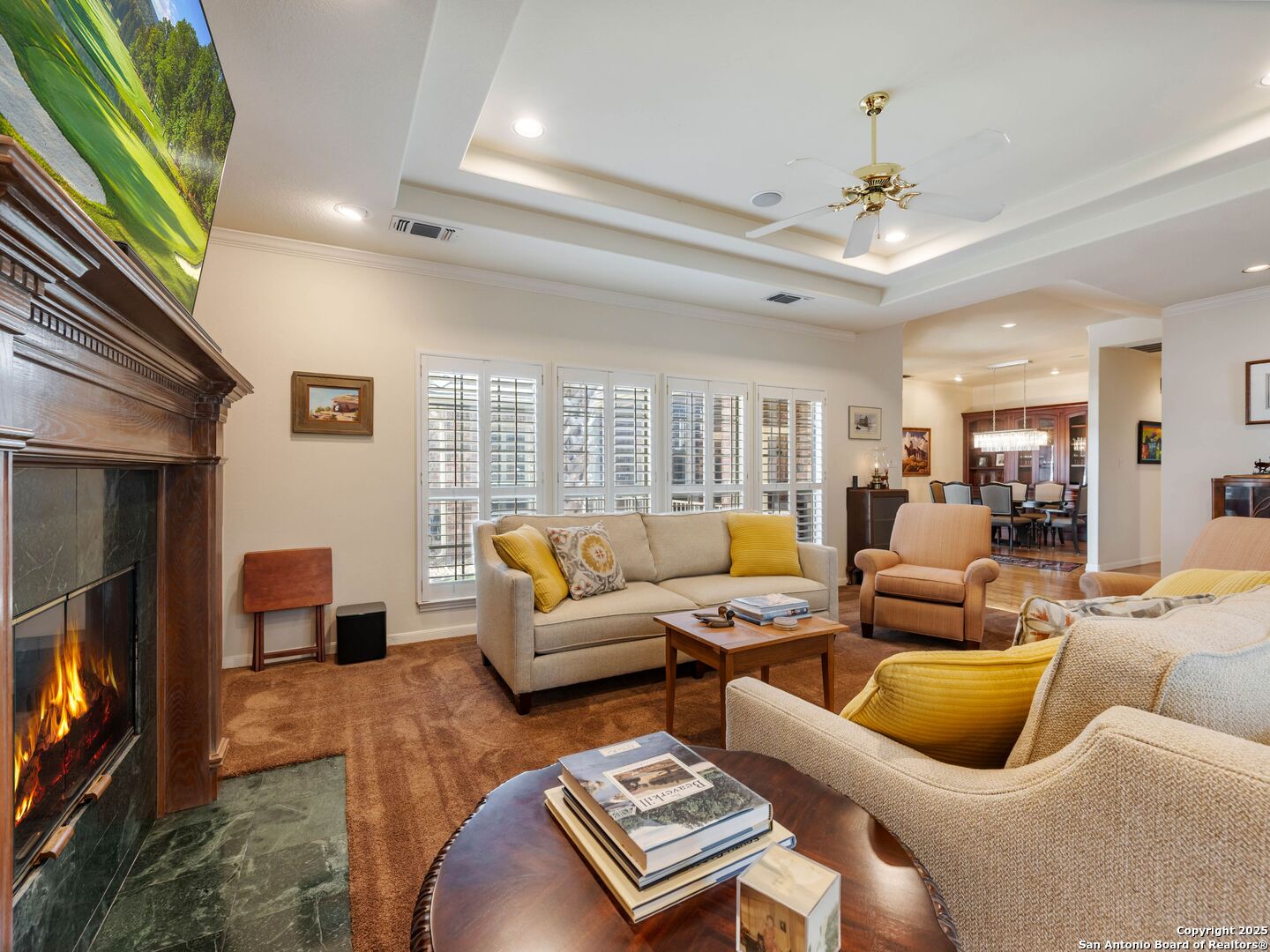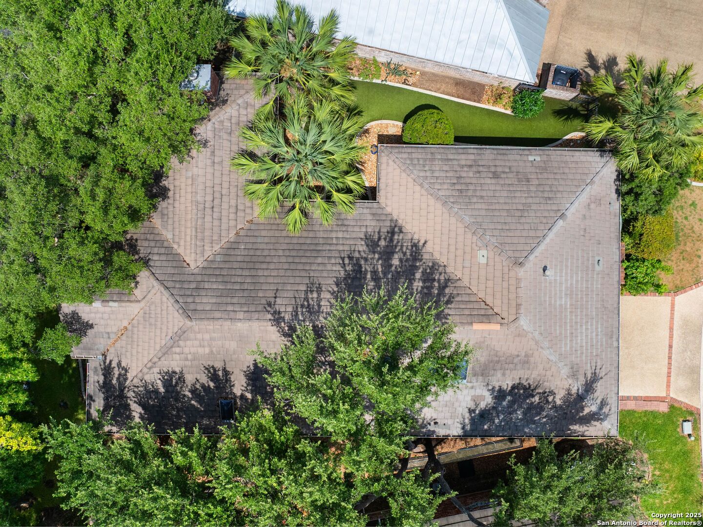 Pristine! Updated single-story home by Burdick Custom Homes nestled in the guard gated The Gardens at The Dominion. This residence showcases immense character, meticulous craftsmanship with soaring vaulted ceilings, abundant natural light from walls of windows, upgraded lighting, true hardwood floors, and elegant plantation shutters throughout. The spacious family room invites relaxation with its fireplace and custom built-ins, while the expansive kitchen is a chef's dream-featuring recently installed Taj Majal quartzite countertops, designer selected backsplash, an oversized island, gas cooking, and double ovens perfect for entertaining. Double doors lead you to the private primary suite, complete with a partially updated bathroom offering dual vanities, a walk-in shower, soaking tub, and two generous walk-in closets. Secondary bedrooms are well-sized, and offer great versatility. Enjoy tranquil outdoor living in the secluded backyard, featuring a covered patio, lush landscaping, and low-maintenance artificial turf-perfect for a lock-and-leave lifestyle. A rear-entry two-car garage provides ample storage and convenience. This exceptional home offers a rare blend of luxury, privacy, and low-maintenance living in one of San Antonio's most prestigious communities.