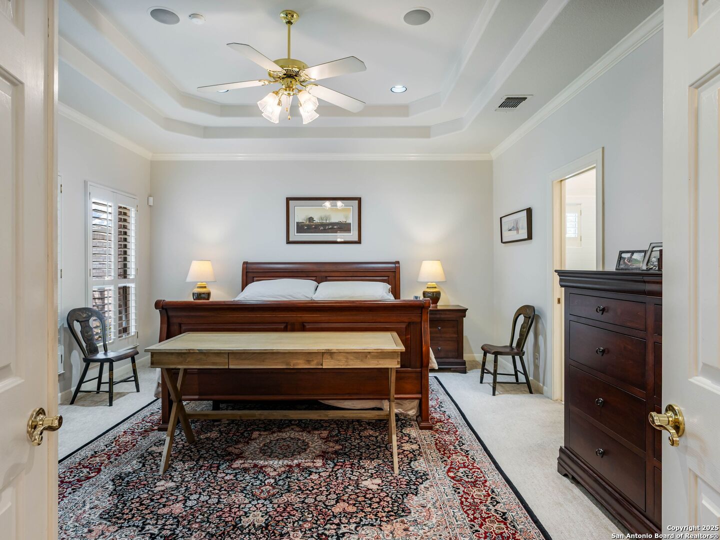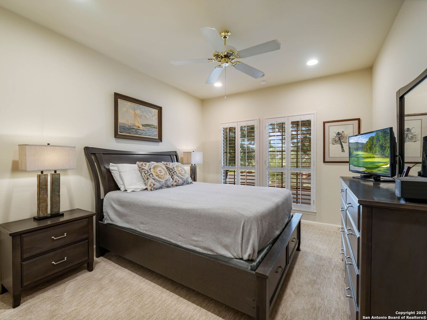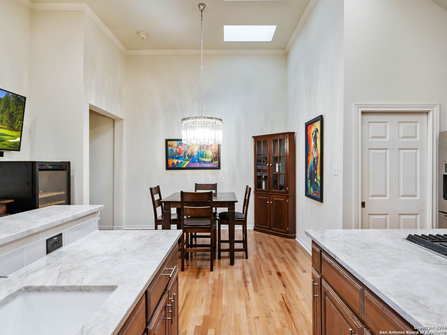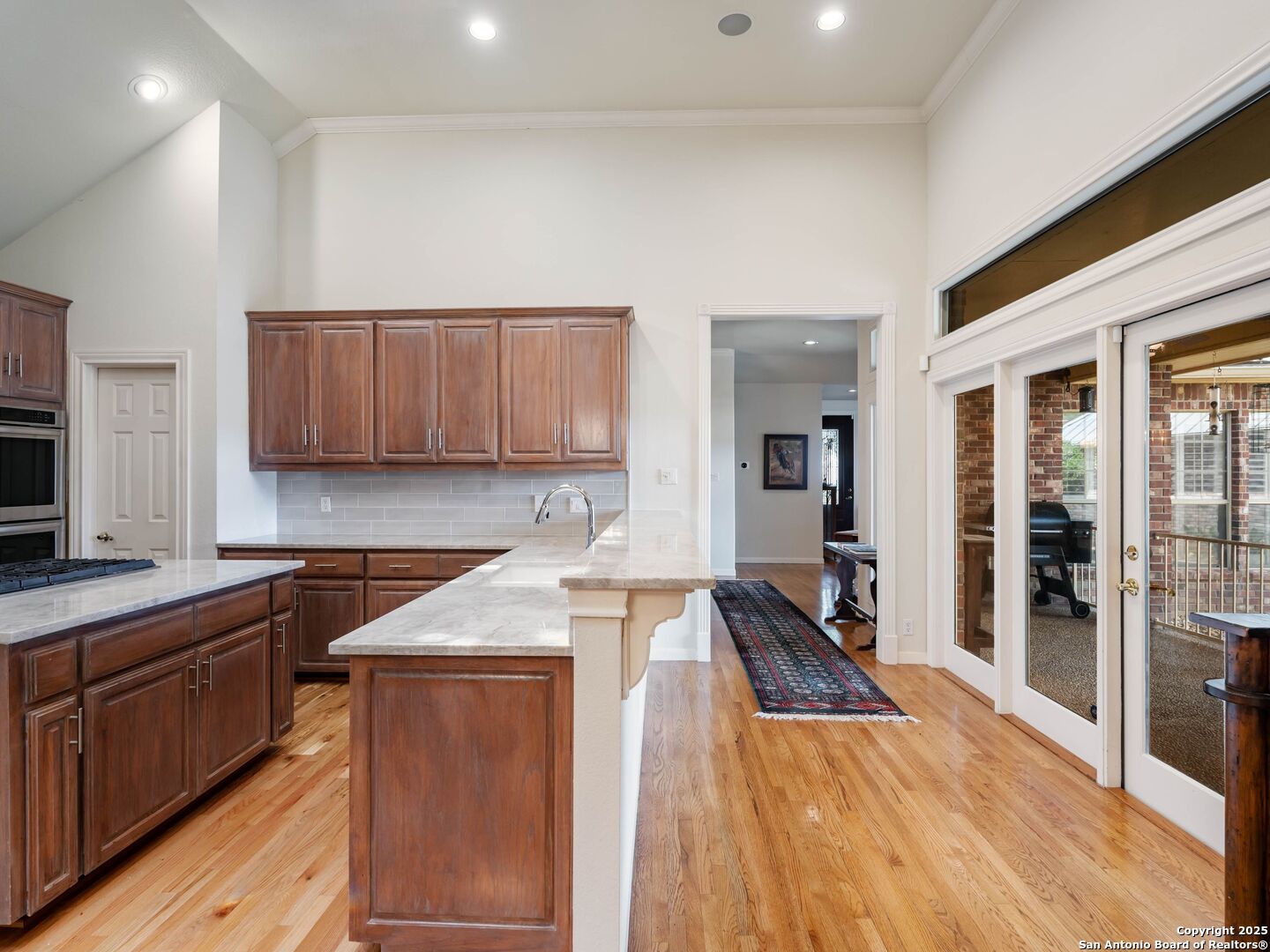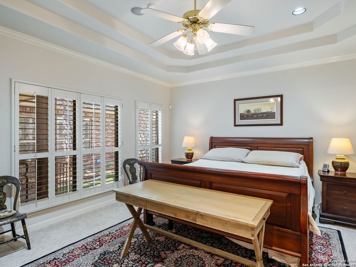 Pristine! Updated single-story home by Burdick Custom Homes nestled in the guard gated The Gardens at The Dominion. This residence showcases immense character, meticulous craftsmanship with soaring vaulted ceilings, abundant natural light from walls of windows, upgraded lighting, true hardwood floors, and elegant plantation shutters throughout. The spacious family room invites relaxation with its fireplace and custom built-ins, while the expansive kitchen is a chef's dream-featuring recently installed Taj Majal quartzite countertops, designer selected backsplash, an oversized island, gas cooking, and double ovens perfect for entertaining. Double doors lead you to the private primary suite, complete with a partially updated bathroom offering dual vanities, a walk-in shower, soaking tub, and two generous walk-in closets. Secondary bedrooms are well-sized, and offer great versatility. Enjoy tranquil outdoor living in the secluded backyard, featuring a covered patio, lush landscaping, and low-maintenance artificial turf-perfect for a lock-and-leave lifestyle. A rear-entry two-car garage provides ample storage and convenience. This exceptional home offers a rare blend of luxury, privacy, and low-maintenance living in one of San Antonio's most prestigious communities.