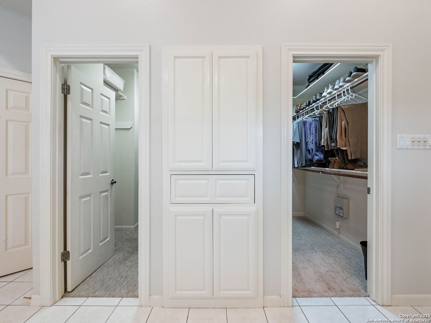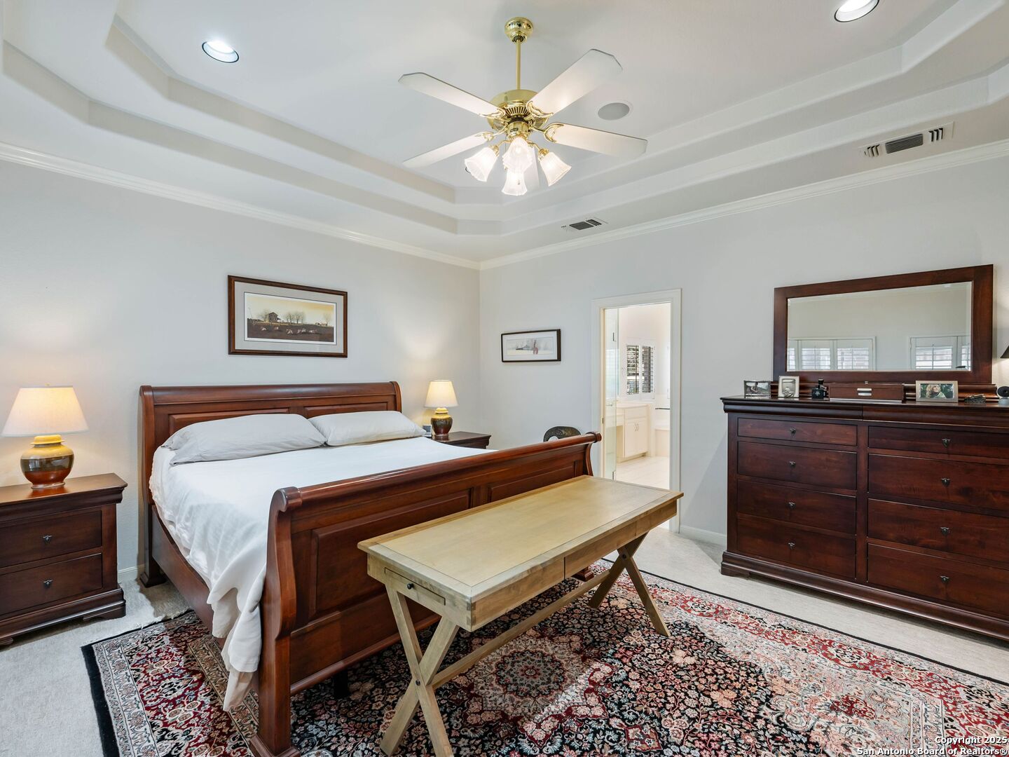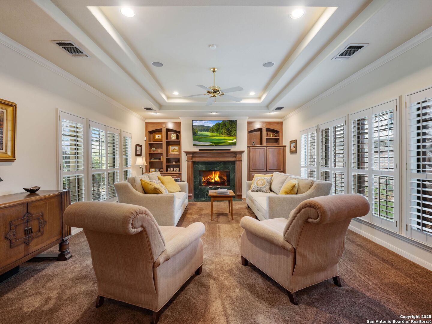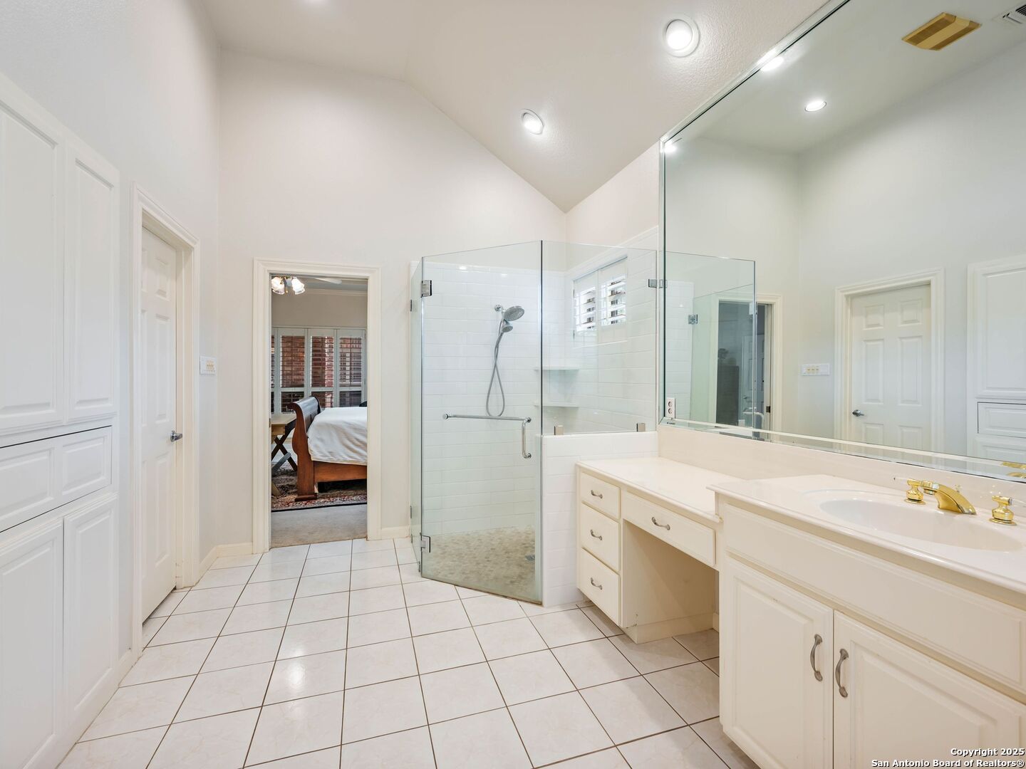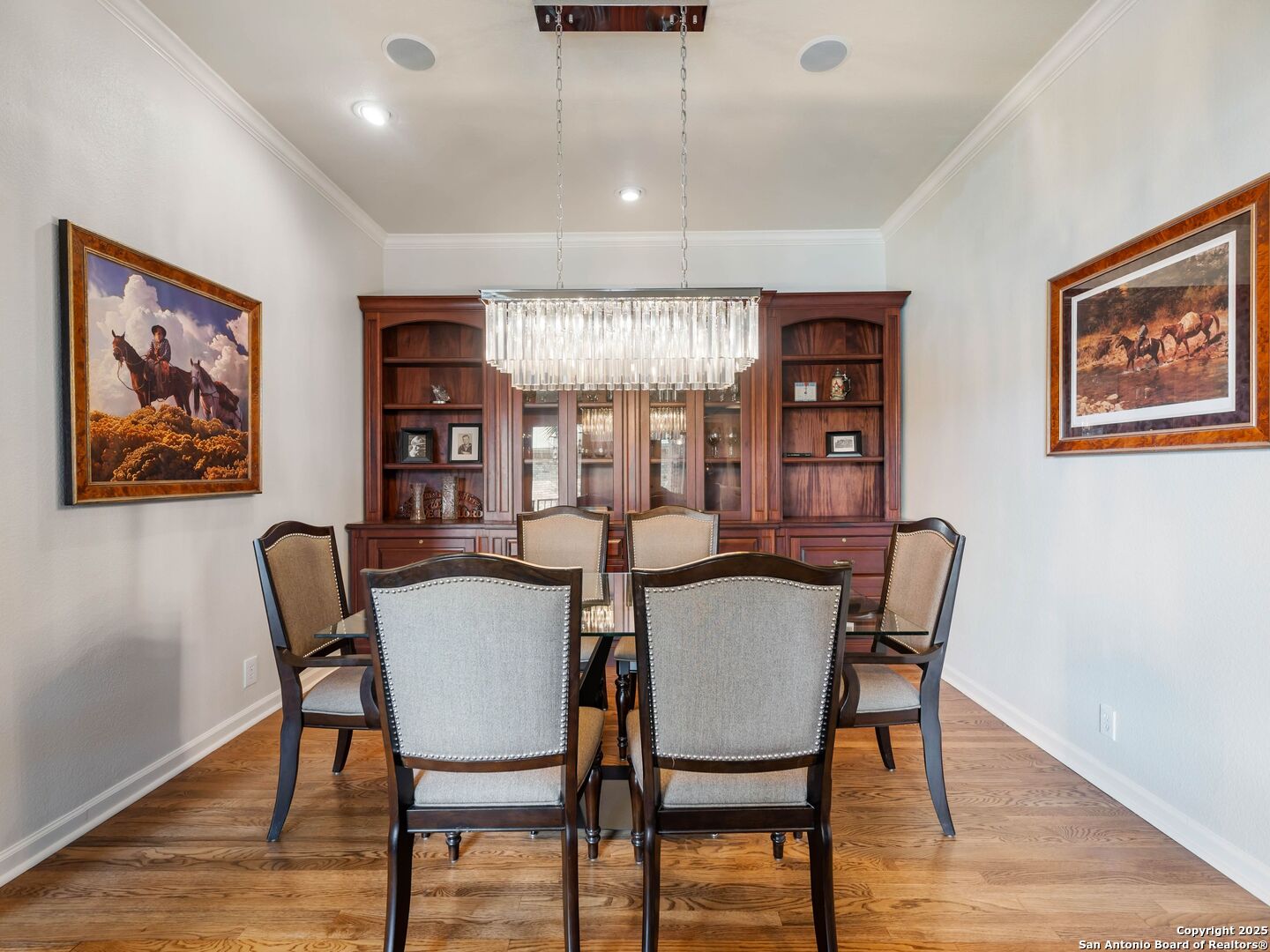 Pristine! Updated single-story home by Burdick Custom Homes nestled in the guard gated The Gardens at The Dominion. This residence showcases immense character, meticulous craftsmanship with soaring vaulted ceilings, abundant natural light from walls of windows, upgraded lighting, true hardwood floors, and elegant plantation shutters throughout. The spacious family room invites relaxation with its fireplace and custom built-ins, while the expansive kitchen is a chef's dream-featuring recently installed Taj Majal quartzite countertops, designer selected backsplash, an oversized island, gas cooking, and double ovens perfect for entertaining. Double doors lead you to the private primary suite, complete with a partially updated bathroom offering dual vanities, a walk-in shower, soaking tub, and two generous walk-in closets. Secondary bedrooms are well-sized, and offer great versatility. Enjoy tranquil outdoor living in the secluded backyard, featuring a covered patio, lush landscaping, and low-maintenance artificial turf-perfect for a lock-and-leave lifestyle. A rear-entry two-car garage provides ample storage and convenience. This exceptional home offers a rare blend of luxury, privacy, and low-maintenance living in one of San Antonio's most prestigious communities.