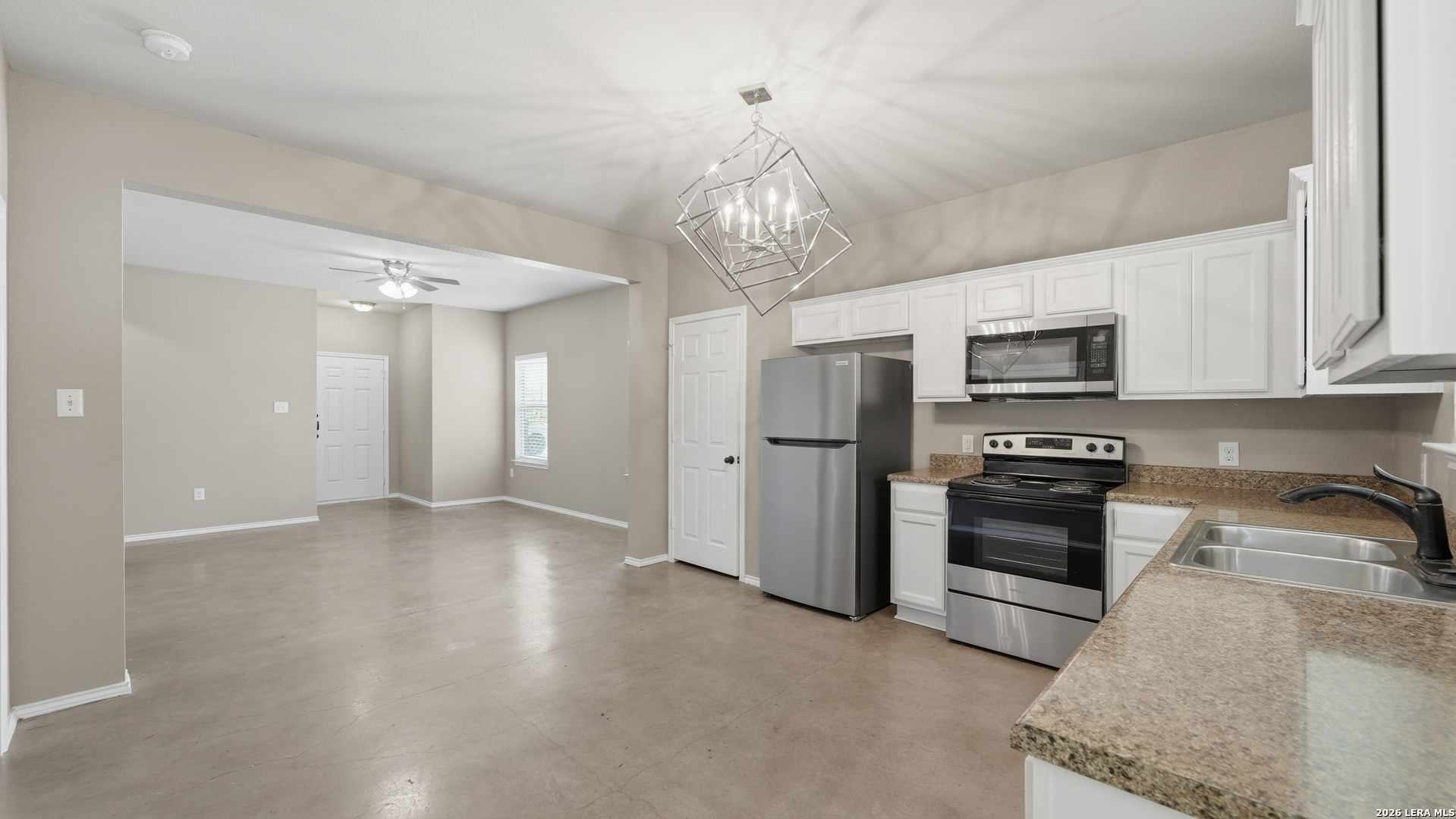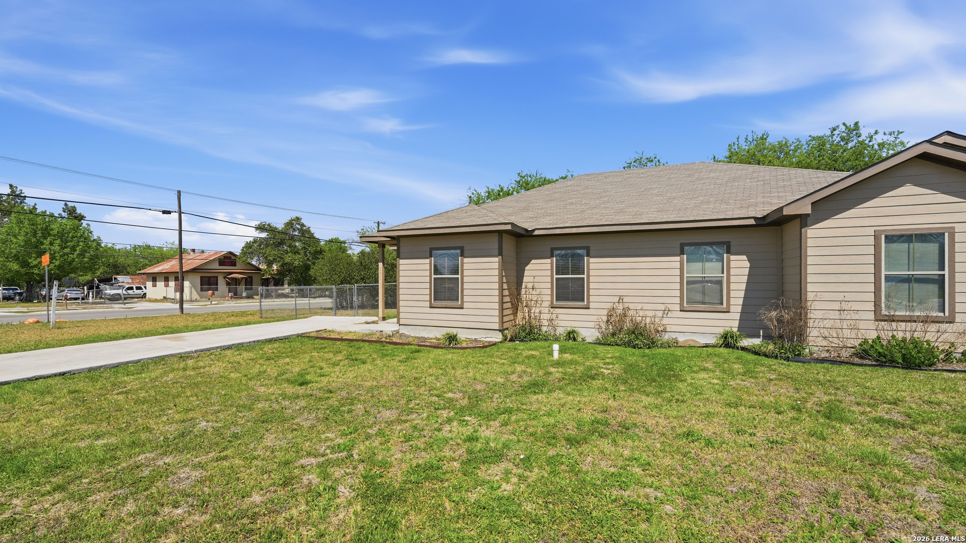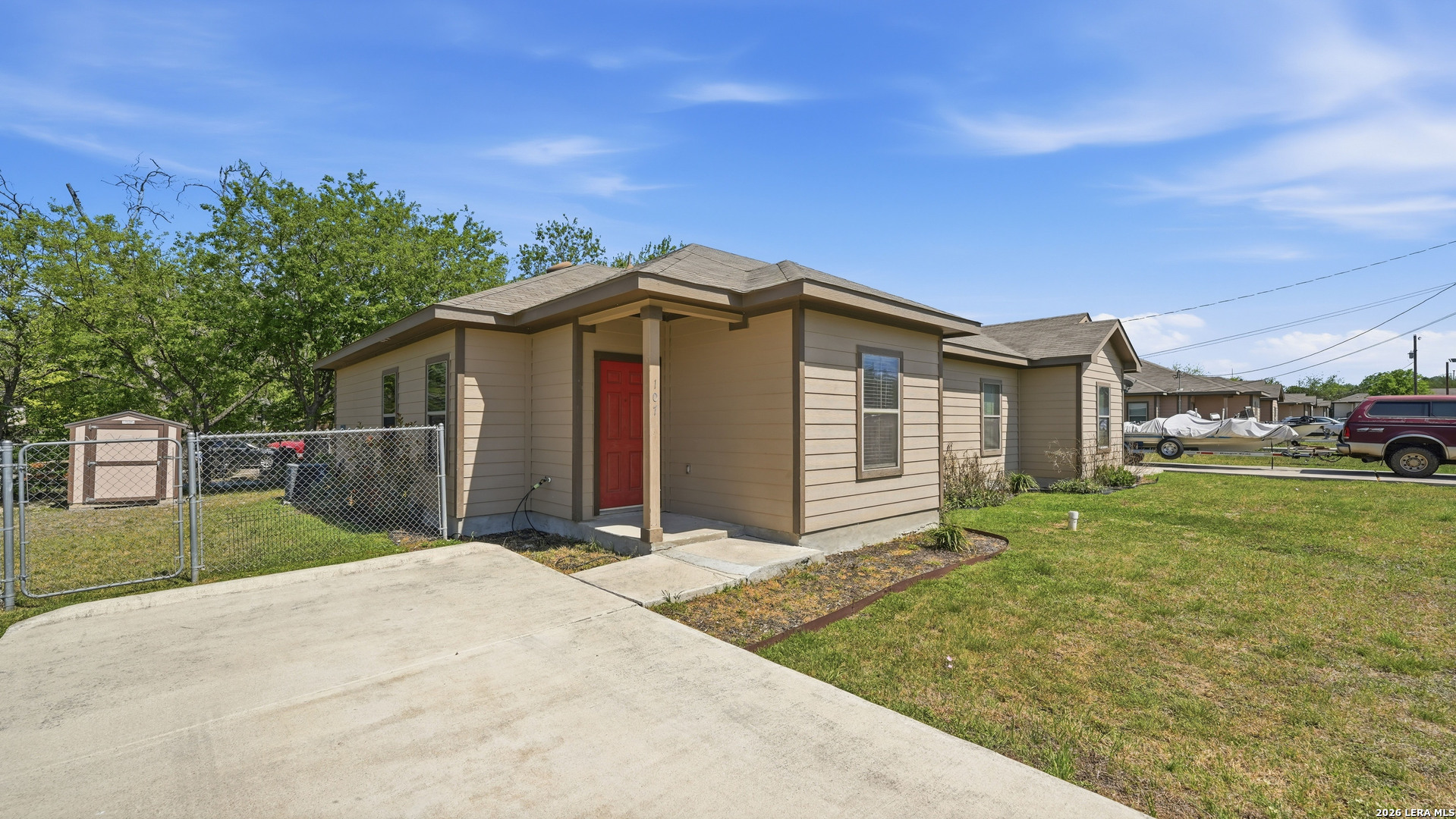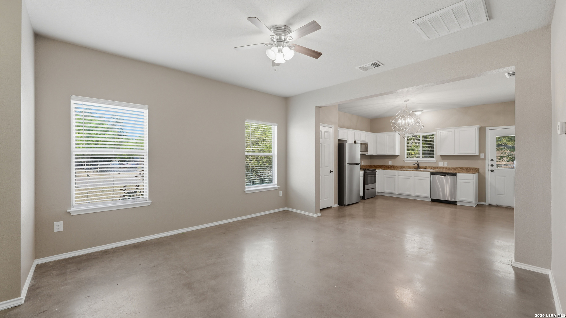 Renovated duplex in New Braunfels with an open floor plan and stained concrete floors. The kitchen features updated shaker cabinets and stainless steel appliances, refrigerator and microwave included!! The primary suite includes a private shower and walk-in closet, with secondary bedrooms located on the opposite side of the home. A separate laundry room offers washer and dryer hookups with a convenient storage shelf above. Outside, the corner lot provides a large backyard with a storage shed. Conveniently located near the new library with quick access to I-35 for easy travel to San Antonio or Austin! Contact today for your private showing!