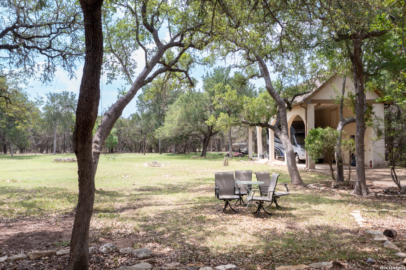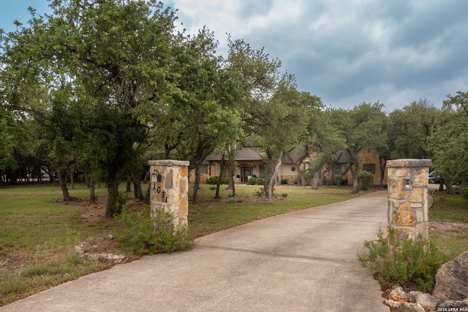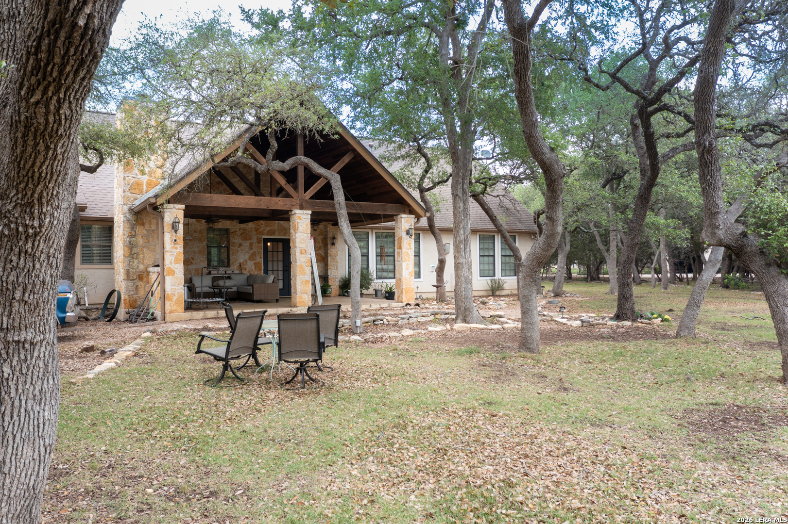 Don't miss out on this custom home on 2.04 acres in the desirable Glenwood gated neighborhood. This charming one-story home has crown molding, coffered ceilings, built in bookcases, a home office, and exquisite kitchen complete with 5-burner gas cooktop, built-in oven and microwave, wine fridge, and prep sink in the oversized island. Perfect for entertaining! The master bedroom has hardwood floors and the suite includes large shower, separate jetted tub, and walk in closet. A second bedroom boasts a built in desk/storage area perfect for a second office space or sewing/craft area and bedroom #3 has hardwood floors and ample closet space. The mud room/laundry room leads to a 3-car garage that includes a finished workshop space. Enjoy views from either of the large covered porches complete with porch swing out front or outdoor rock fireplace from the back patio. There's room for the RV in a 16x50 RV carport with full hookups and storage closets. Enjoy summer days just across the street at the refreshing community pool and community center. Experience the perfect blend of sophisticated living and rural tranquility in this sought-after neighborhood. This perfect Hill Country setting is near local shopping and just minutes from San Antonio, Boerne, and New Braunfels.