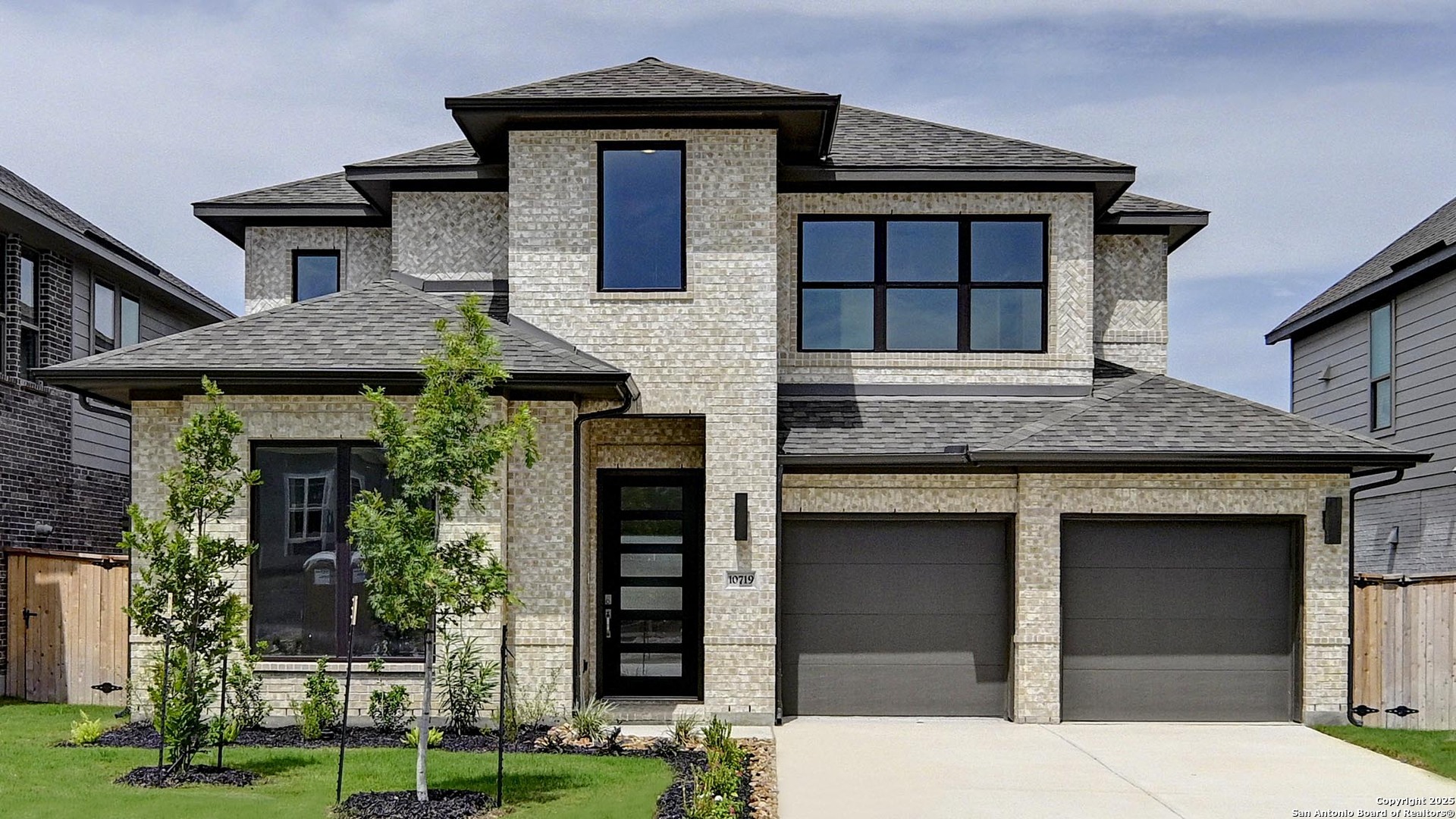 Home office frames entry with 19-foot ceiling. Family room offers a wall of windows and extends to dining area. Island kitchen with built-in seating space, 5-burner gas cooktop and a walk-in pantry. Private primary suite. Primary bathroom offers dual vanities, garden tub, separate glass enclosed shower and a walk-in closet. Additional bedroom on first floor. Second floor hosts a large game room and three bedrooms with walk-in closets. Utility room. Extended covered backyard patio and 5-zone sprinkler system. Mud room just off the two-car garage.