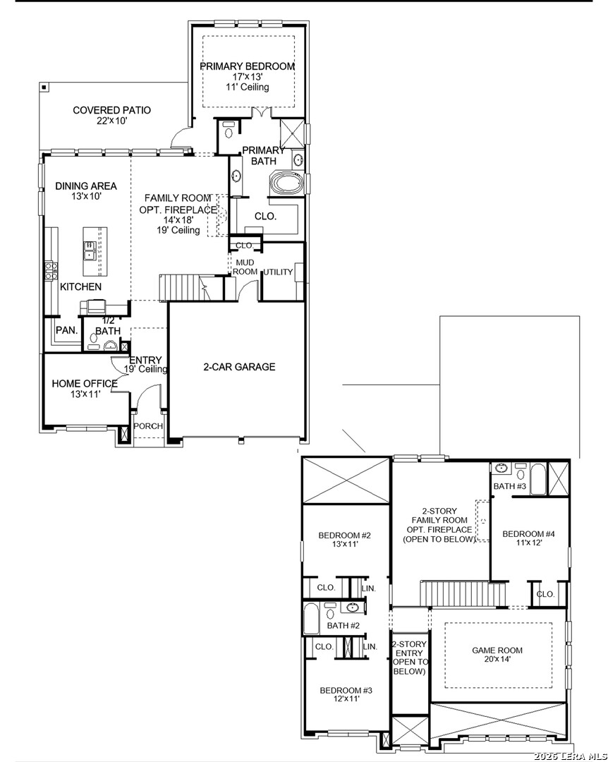 Home office set at entry with 19-foot ceiling. Open family room with 19-foot ceilings and a grand wall of windows that extend to the dining area. Kitchen features an island with built-in seating space, 5-burner gas cooktop, and a corner walk-in pantry. Primary bedroom with three large windows. Primary bathroom hosts a French door entry, dual vanities, garden tub, and a large walk-in closet. Second floor hosts a guest suite with full bathroom, additional bedrooms, two linen closets and a large game room. Landscaping features a 5-zone sprinkler system. Mud room and utility room just off the two-car garage.