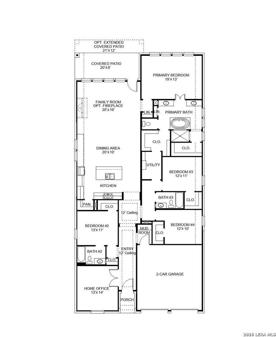 Welcoming entry framed by home office with French doors. Generous family room with a wall of windows extends to the kitchen and dining area. Island kitchen with built-in seating space offers a corner pantry and a 5-burner gas cooktop. Private primary suite with a large wall of windows. Primary bathroom features a French door entry, dual vanities, a freestanding tub, separate glass enclosed shower, a linen closet, two walk-in closets and private access to the utility room. Guest suite with a full bathroom and walk-in closet and secondary bedrooms with walk-in closets complete this spacious design. Extended covered backyard patio. Landscape features a 5-zone sprinkler system. Mud room just off the two-car garage.