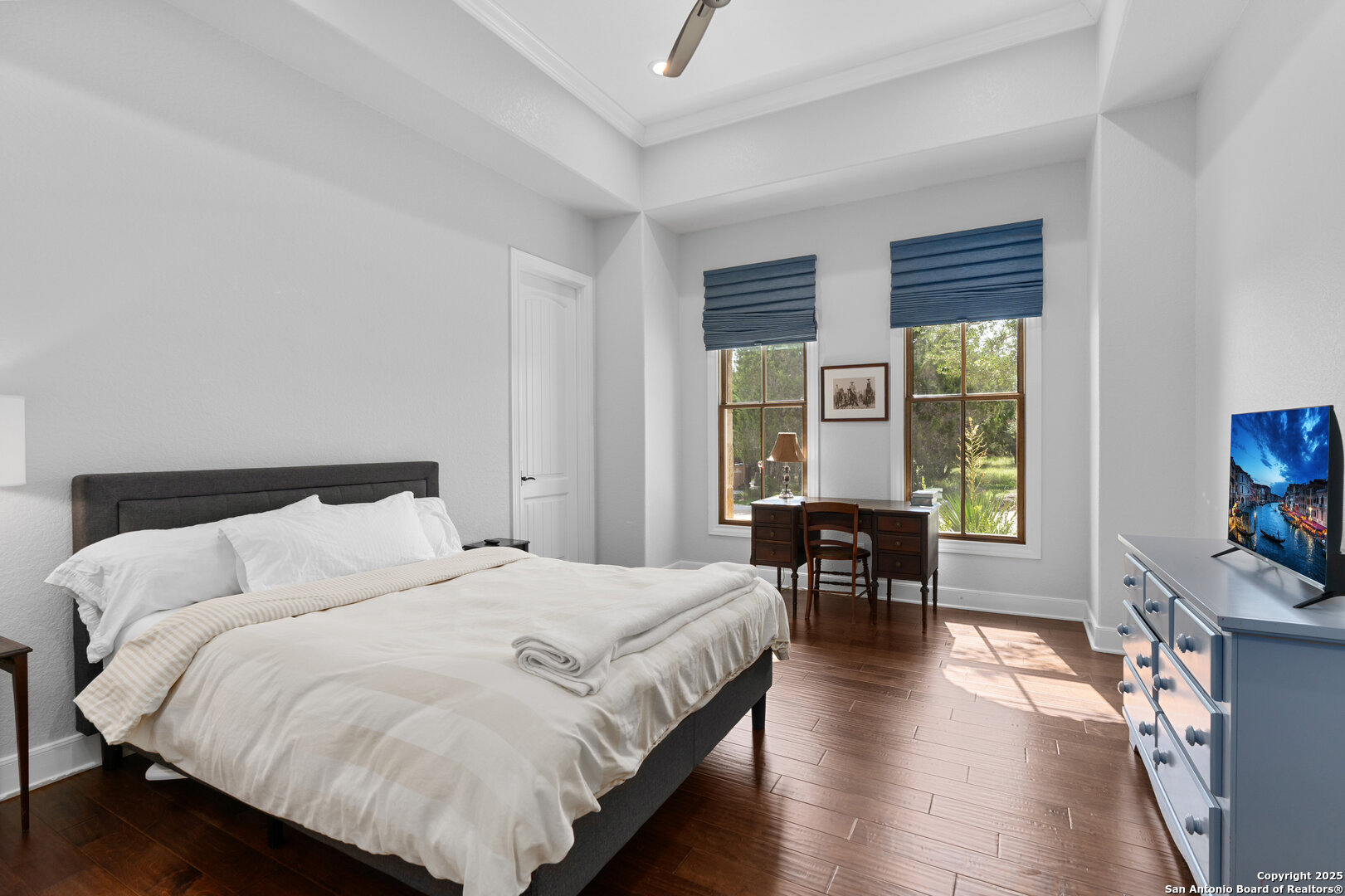 Nestled on a tranquil cul-de-sac, close to the Guadalupe River and private parks, this remarkable single-level luxury residence at 108 Cornerstone epitomizes sophisticated Hill Country living within the prestigious gates of the Cordillera Ranch private golfing community offering a unique lifestyle experience- the combination of private outdoor recreation and the exclusive community amenities. This recently remodeled sanctuary encompasses 4,530 square feet of meticulously crafted living space, featuring four bedrooms and three and one-half bathrooms designed with exceptional attention to architectural detail and sits on your private enclave of 5.6 acres. The dramatic open floor plan showcases walls of windows that flood the interior with natural light, creating seamless transitions between living spaces. The gourmet kitchen serves as the home's culinary centerpiece, boasting striking countertops, abundant storage solutions, Viking appliances, and a spacious working island perfect for both preparation and entertaining. Adjacent to the kitchen, a two-way fireplace enhances the dining area, providing romantic ambiance for intimate gatherings. The expansive primary bedroom retreat opens directly onto the patio, complemented by a spacious bathroom and generous walk-in closet with extensive built-ins. Additional en-suite bedrooms ensure privacy and comfort for family and guests alike. Outdoor living reaches extraordinary heights with multiple expansive patios featuring a welcoming fireplace, diverse seating arrangements, and an outdoor kitchen that transforms al fresco dining into culinary adventures. The fenced and gated property includes your very own half-mile trail system, ideal for family recreation and adventurous gatherings. Practical amenities include an additional fenced area suitable for paddock use or approved animals. Quality construction seamlessly blends modern conveniences with authentic Hill Country aesthetics throughout this meticulous home. Cordillera Ranch Master Golf Membership option provides access to championship golf facilities, pickle ball, tennis courts, multiple pools, diverse dining establishments, walking trails, parks, equestrian facilities, and shooting sports areas. The prestigious golf membership opportunity may be purchased separately, completing this exceptional lifestyle offering that encourages both relaxation and revitalization within one of Texas's most sought after communities.