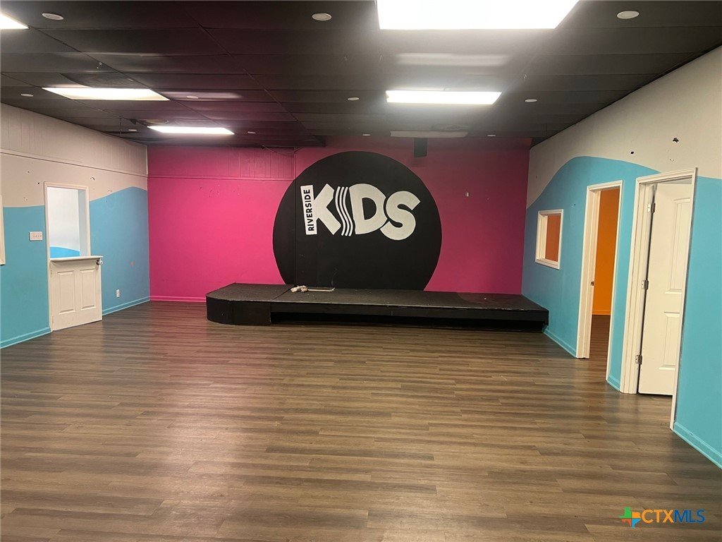 Commercial flex space in a strip lease center. Was last used as a Youth Center and Nursery for a church. 2550 estimated sq ft. Has a garage door entry is needed. Is covered by a stage inside. The building has 4 offices, a nursery area, a youth rec area, a small kitchen, and two bathrooms with storage rooms. Ample shared parking outside.