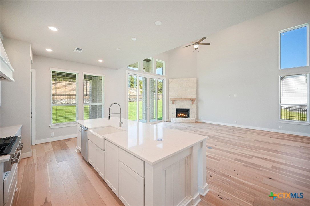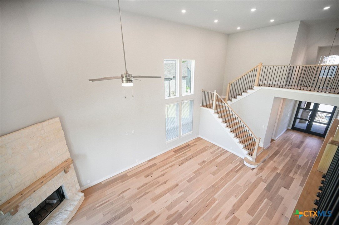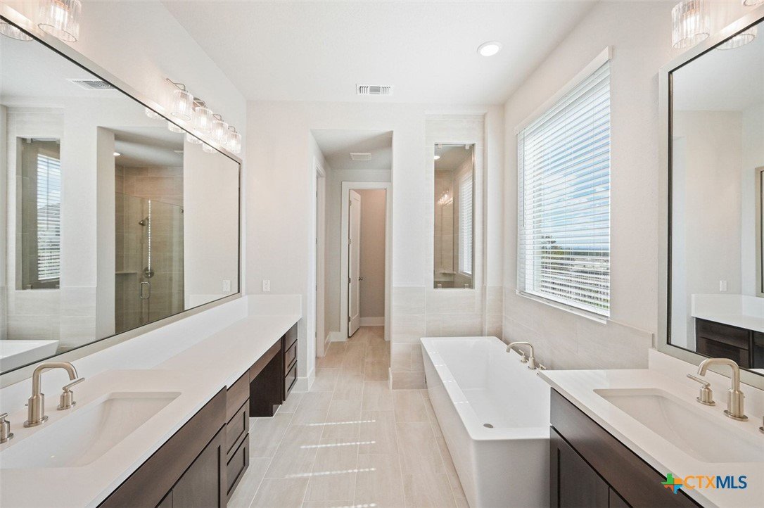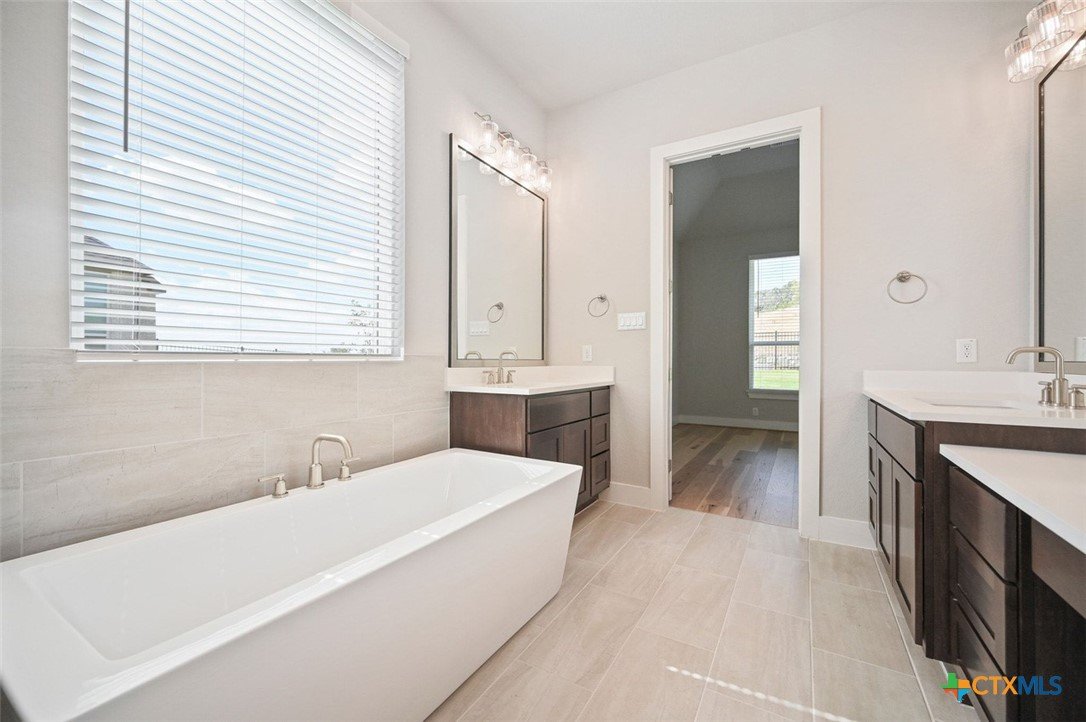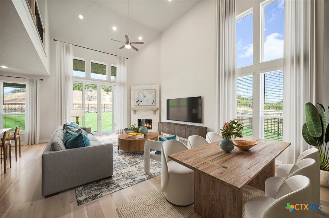 Open plan with 2 bedrooms/bath down, Study and Entertainment room. Soaring ceilings in family/dining. Backs to open space. Fireplace (at Family Room), Powder, Private Bath, Exterior Stone, Bedroom w/Bath, Exp Bedrooms w/Full Baths ilo Lifestyle, Sliding Glass Doors (at Patio), 16' Garage Door ilo (2) 8' Doors, Shower ilo Tub-Secondary - Dropped Pan, Freestanding Tub (67" rectangular)