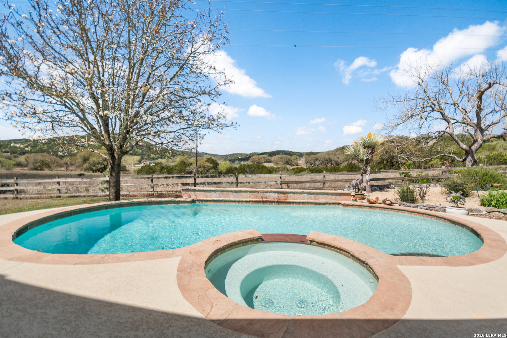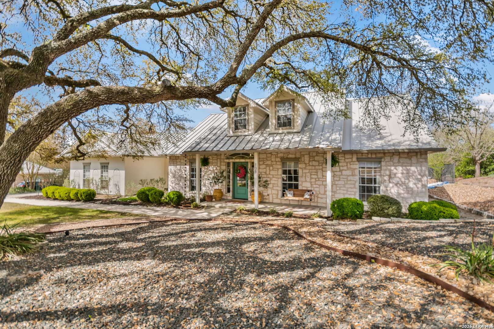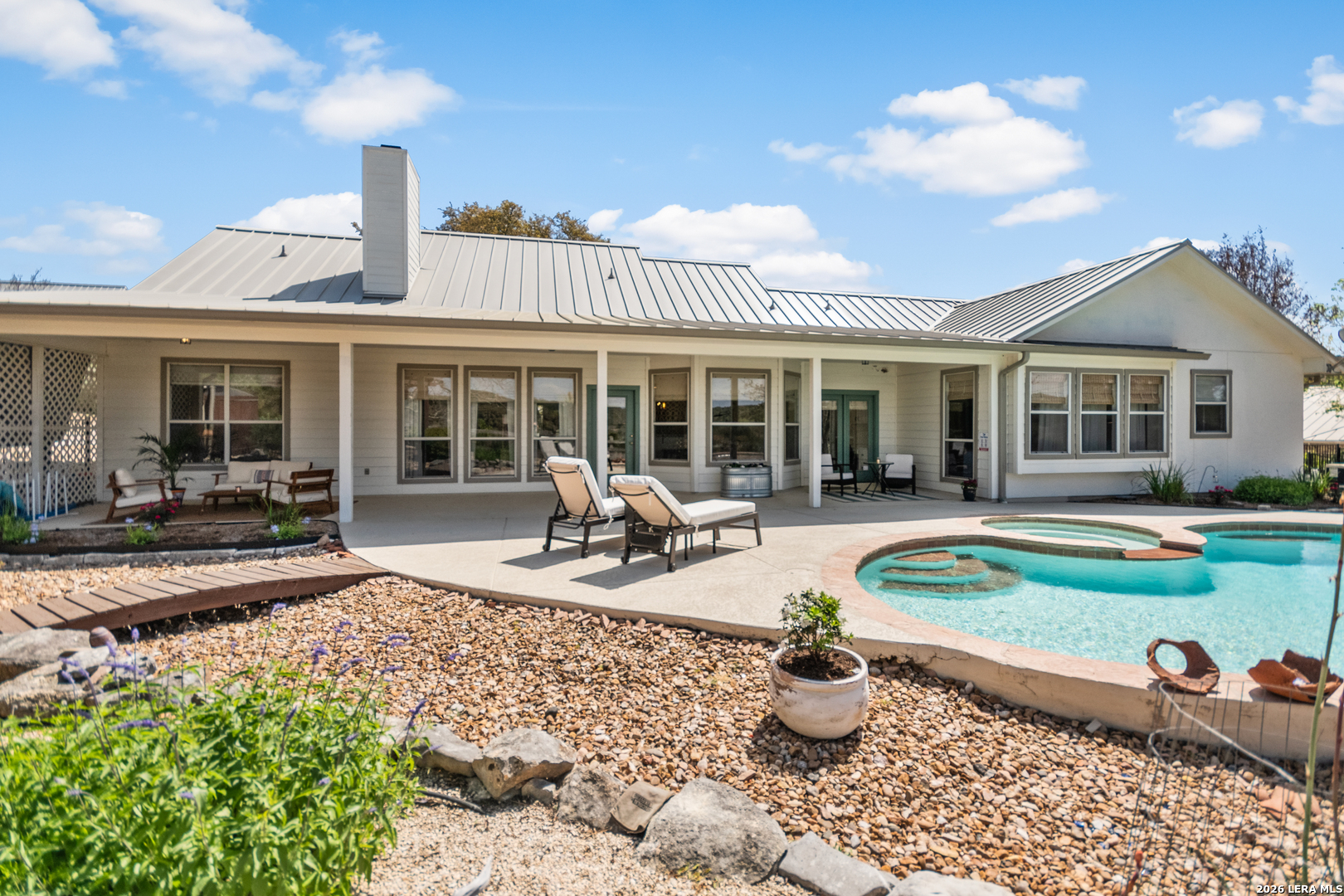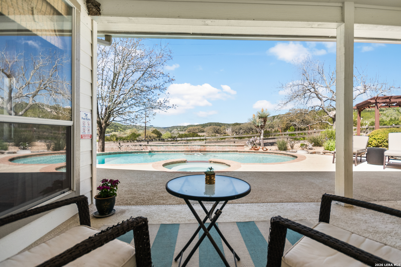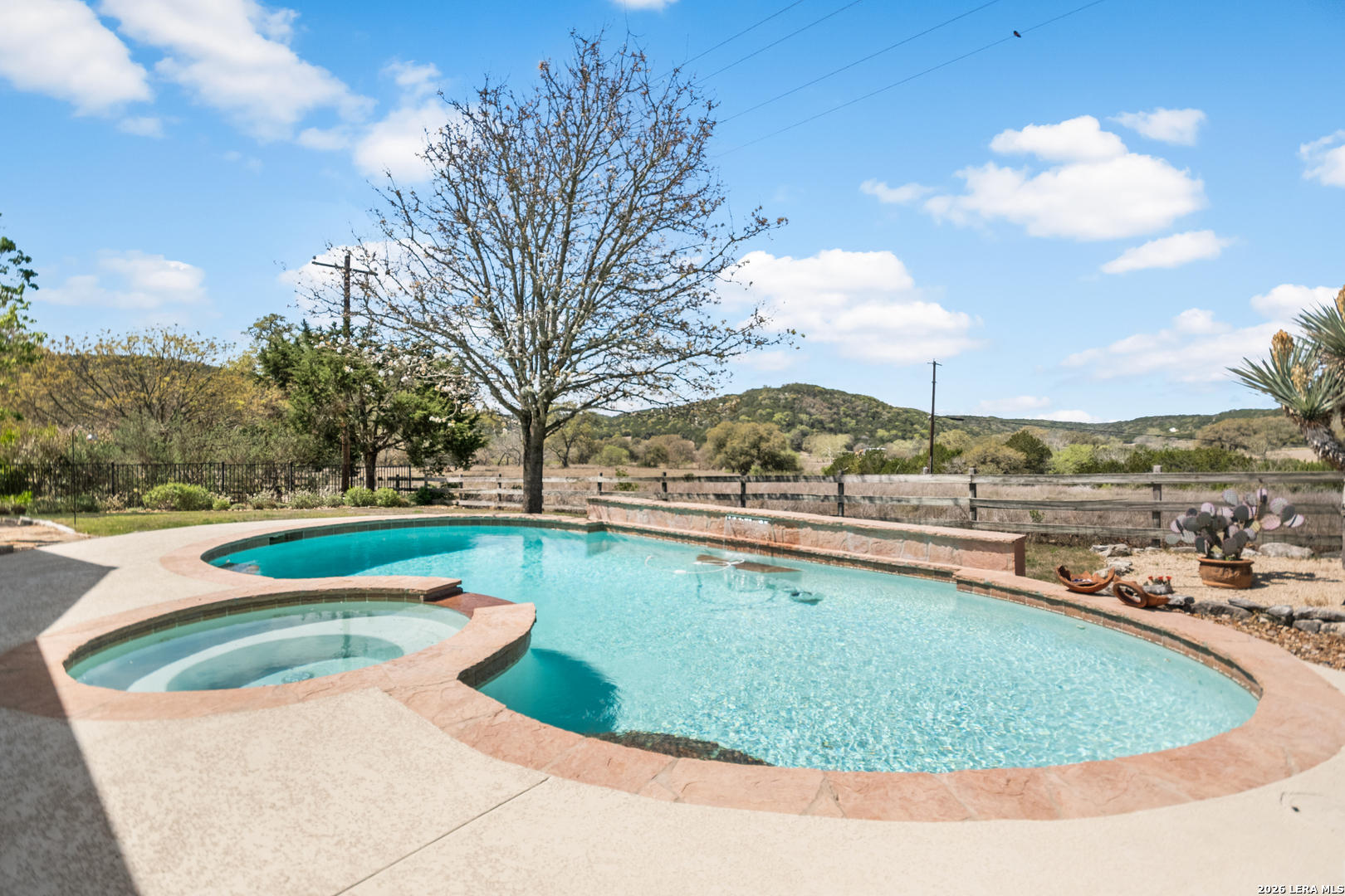 Nestled on a quiet cul-de-sac within the sought-after Tapatio Springs community, this beautifully curated one-story ranch-style residence offers an exceptional blend of refined comfort, thoughtful upgrades, and timeless Hill Country charm. Spanning 2,236 square feet, the home features 3 bedrooms, 2 baths, and a versatile study with a closet-ideal as a fourth bedroom, private office, or guest retreat. The expansive primary suite serves as a true sanctuary, complete with dual vanities and two spacious walk-in closets, delivering both luxury and functionality. Extensively updated, the home showcases fresh interior and exterior paint-including the garage-along with a durable metal roof (approximately 3-4 years old). In the kitchen, recently updated appliances include a microwave and dishwasher, while custom window treatments elevate the living, kitchen, and primary spaces. The living areas are thoughtfully designed with a warm palette that complements the classic German limestone and distinctive schmear finish, anchored by a custom fireplace. Outdoor living is nothing short of exceptional. The private backyard retreat is framed by mature trees and features a sparkling pool and spa with a brand-new pump, heater, and cleaner. A newly rebuilt sun deck (with a 10-year warranty), covered patio, and additional pergola create multiple spaces for relaxation and entertaining. A rainwater catchment system efficiently collects and redistributes water to support the landscape and assist with pool maintenance. Seasonal beauty surrounds the property-from the blooming Bradford pear near the pool in spring to the vibrant orange hues of the bigtooth maple in the fall, reminiscent of Lost Maples. The front porch exudes classic Southern charm with its haint blue ceiling and inviting swing, while recently trimmed and treated oak trees enhance the home's curb appeal. With a recently filled propane tank supporting the pool and spa, upgraded finishes throughout, and a rare combination of privacy, efficiency, and design, this exceptional property captures the essence of elevated Hill Country living.
