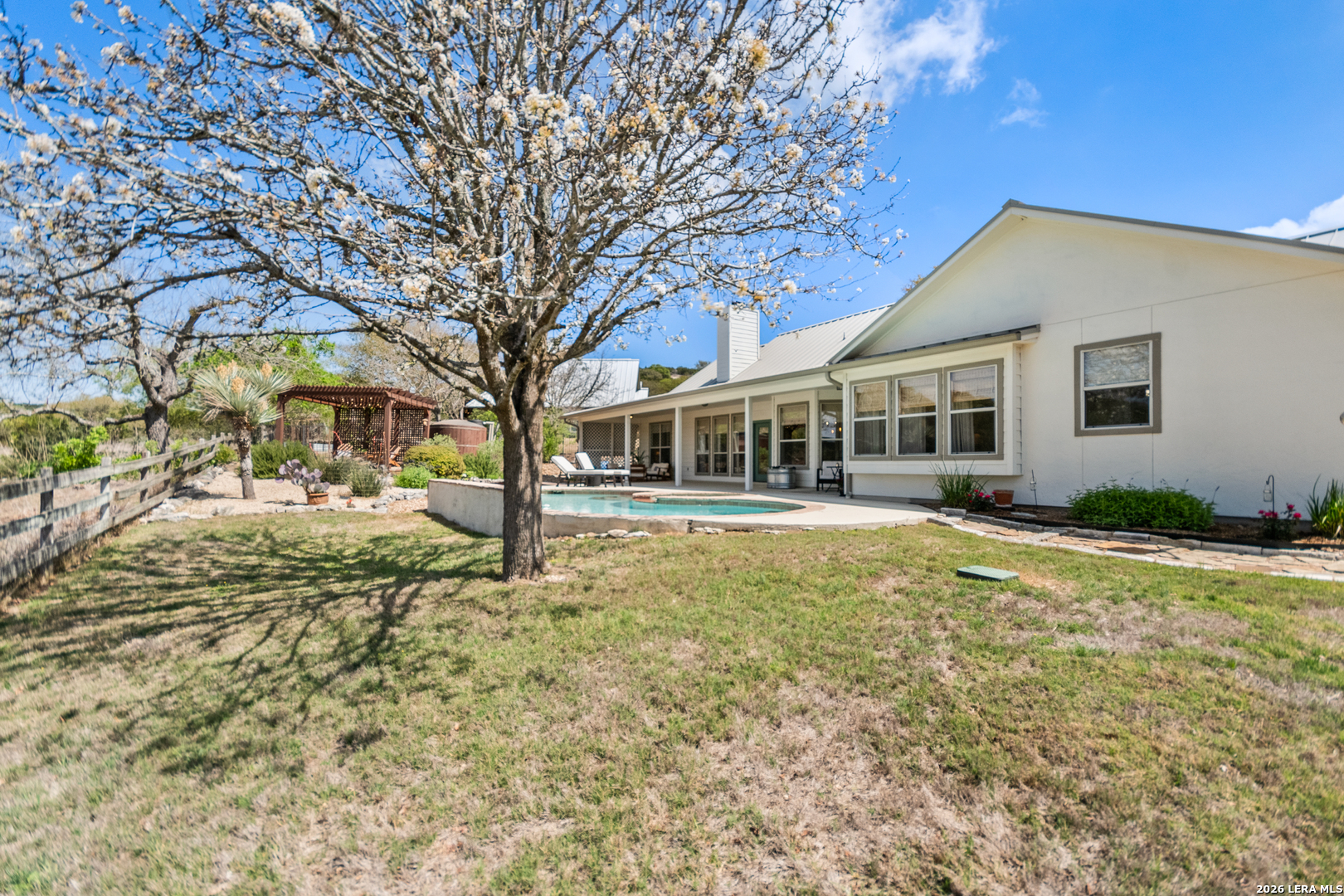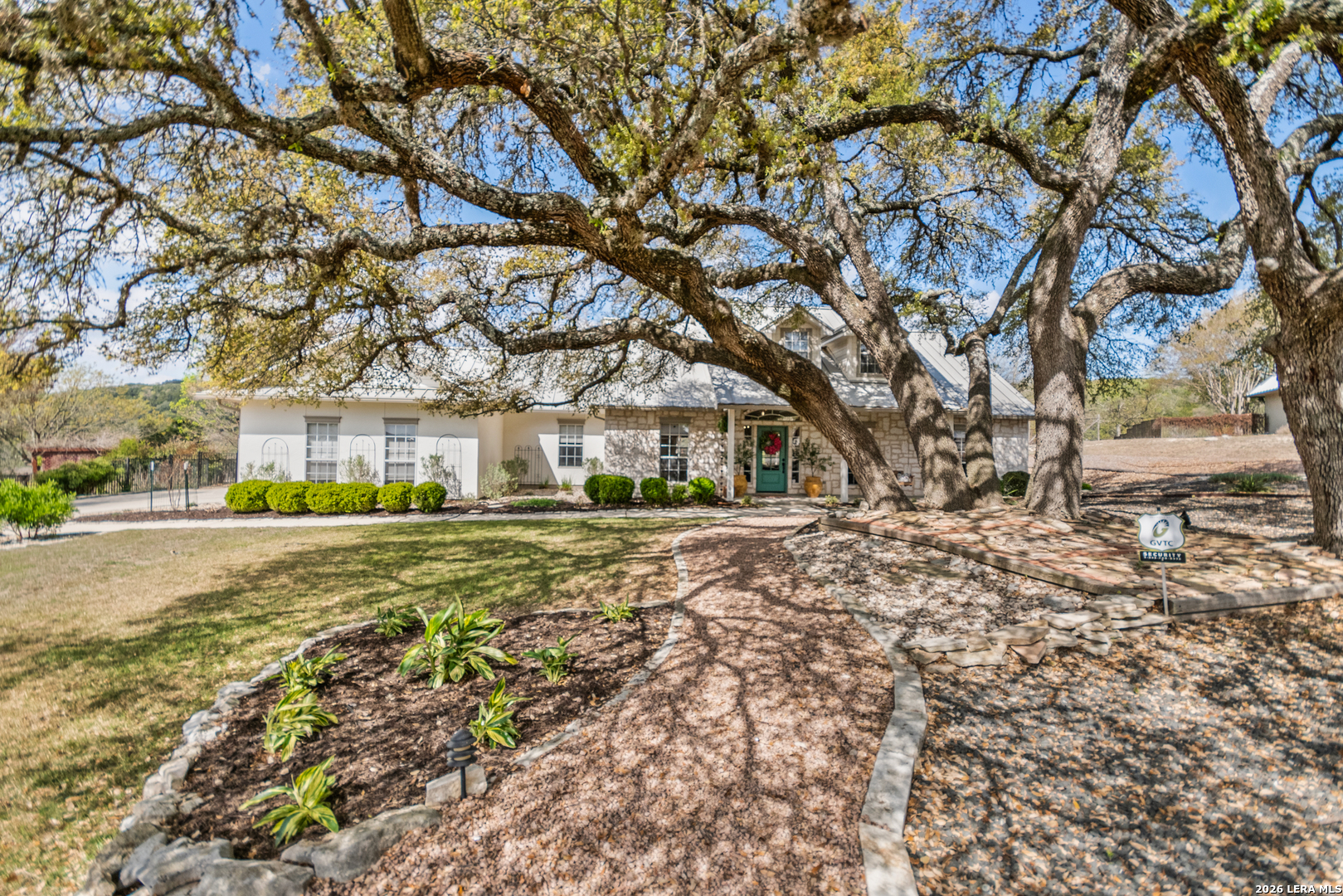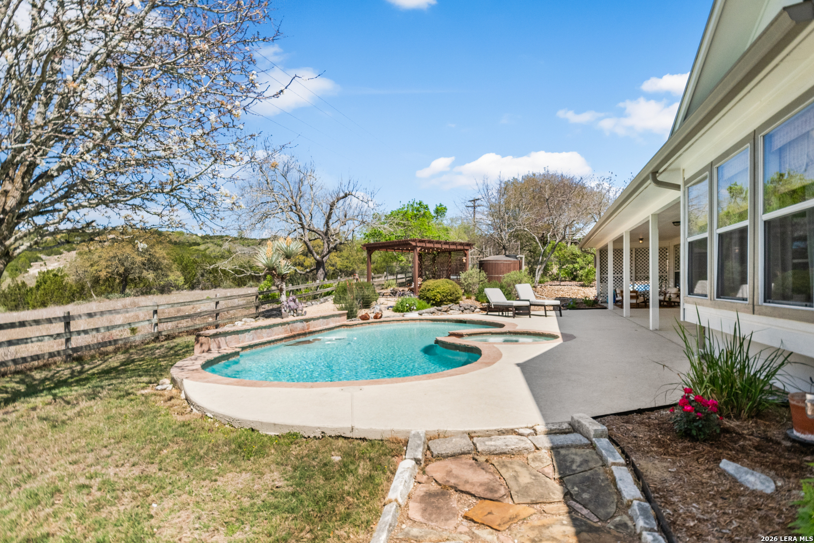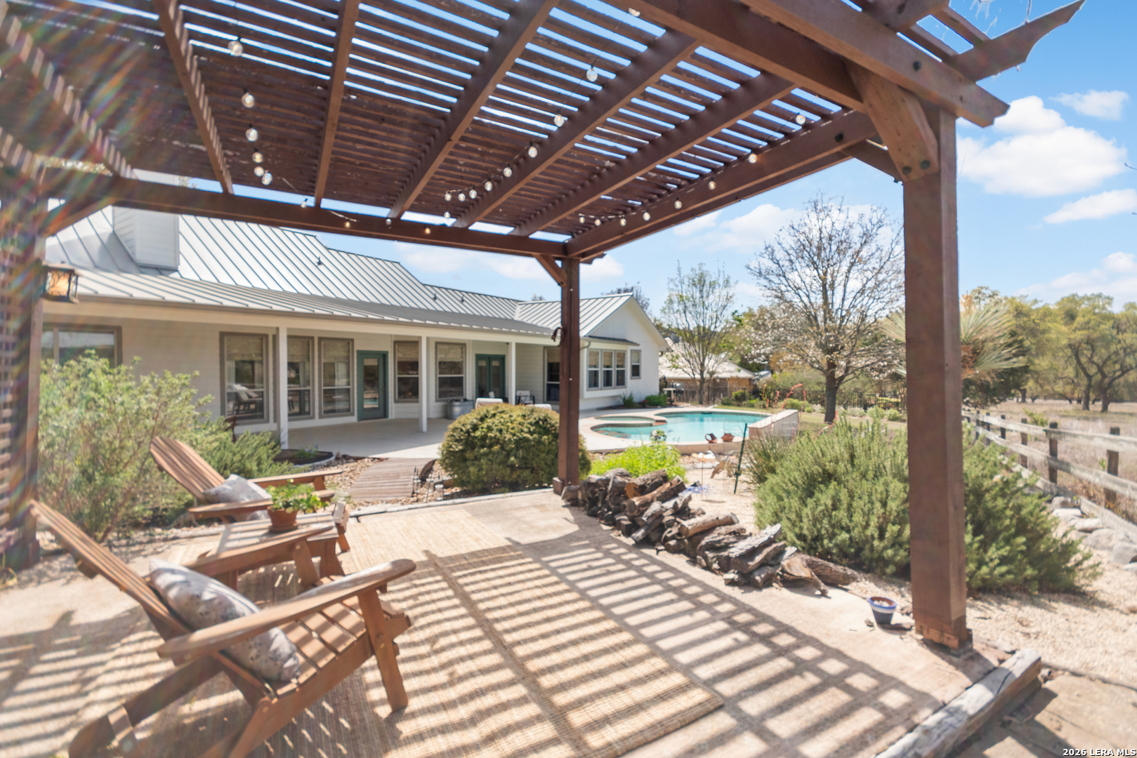 Nestled on a quiet cul-de-sac within the sought-after Tapatio Springs community, this beautifully curated one-story ranch-style residence offers an exceptional blend of refined comfort, thoughtful upgrades, and timeless Hill Country charm. Spanning 2,236 square feet, the home features 3 bedrooms, 2 baths, and a versatile study with a closet-ideal as a fourth bedroom, private office, or guest retreat. The expansive primary suite serves as a true sanctuary, complete with dual vanities and two spacious walk-in closets, delivering both luxury and functionality. Extensively updated, the home showcases fresh interior and exterior paint-including the garage-along with a durable metal roof (approximately 3-4 years old). In the kitchen, recently updated appliances include a microwave and dishwasher, while custom window treatments elevate the living, kitchen, and primary spaces. The living areas are thoughtfully designed with a warm palette that complements the classic German limestone and distinctive schmear finish, anchored by a custom fireplace. Outdoor living is nothing short of exceptional. The private backyard retreat is framed by mature trees and features a sparkling pool and spa with a brand-new pump, heater, and cleaner. A newly rebuilt sun deck (with a 10-year warranty), covered patio, and additional pergola create multiple spaces for relaxation and entertaining. A rainwater catchment system efficiently collects and redistributes water to support the landscape and assist with pool maintenance. Seasonal beauty surrounds the property-from the blooming Bradford pear near the pool in spring to the vibrant orange hues of the bigtooth maple in the fall, reminiscent of Lost Maples. The front porch exudes classic Southern charm with its haint blue ceiling and inviting swing, while recently trimmed and treated oak trees enhance the home's curb appeal. With a recently filled propane tank supporting the pool and spa, upgraded finishes throughout, and a rare combination of privacy, efficiency, and design, this exceptional property captures the essence of elevated Hill Country living.