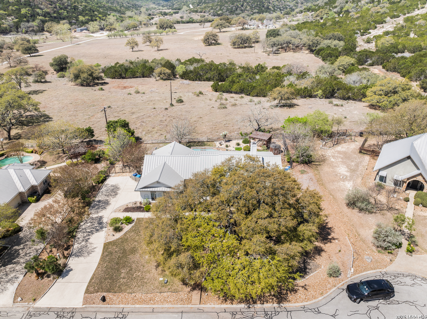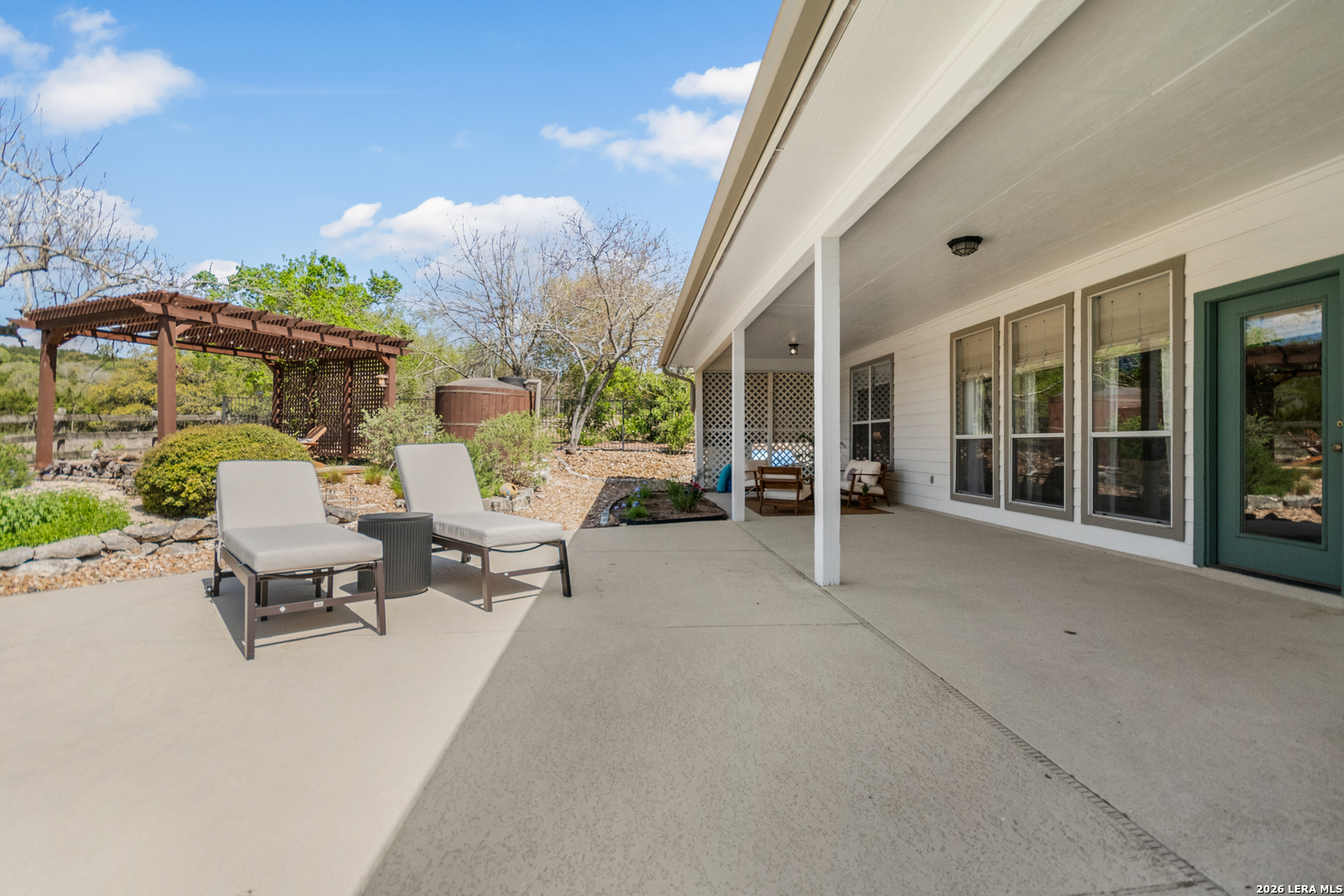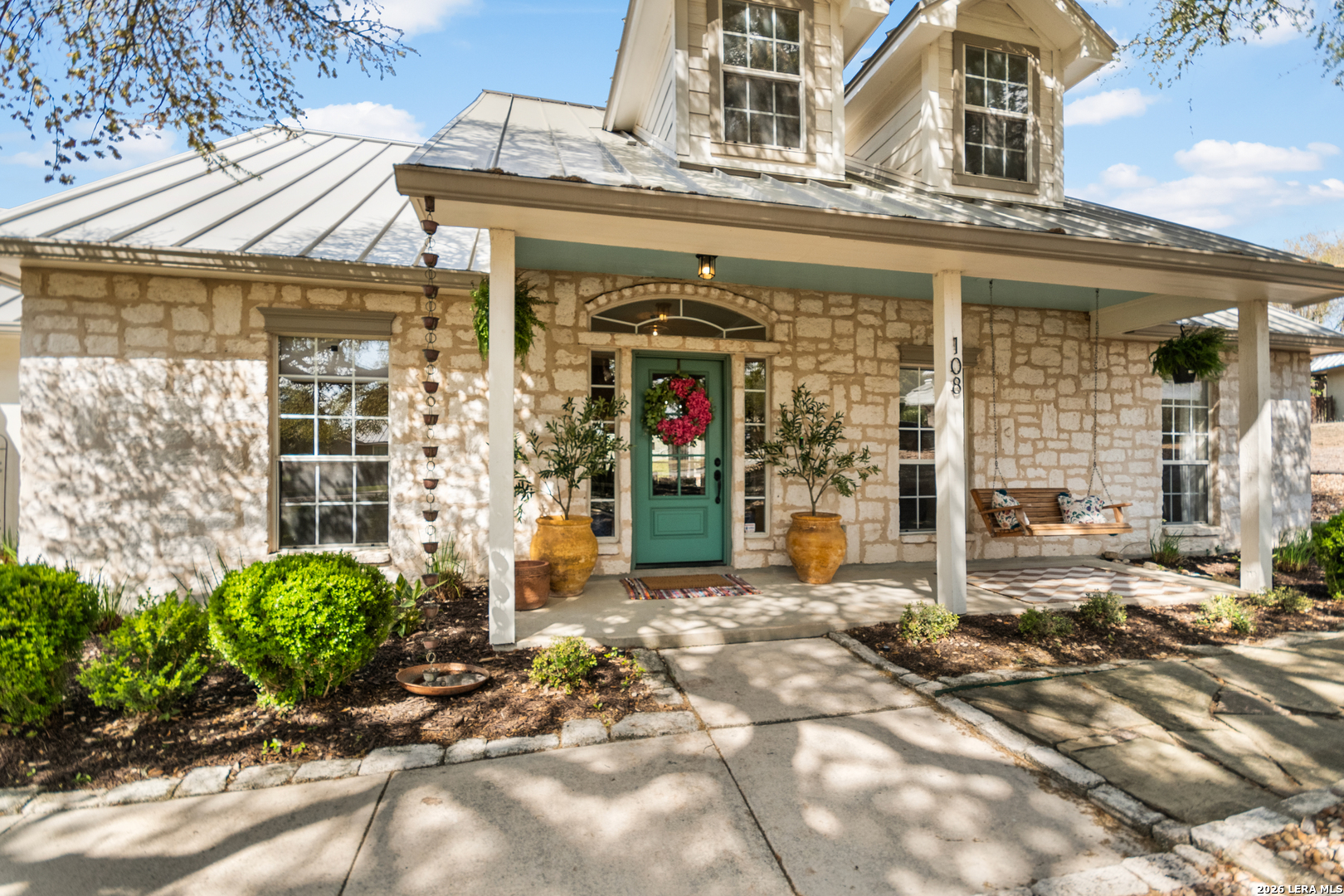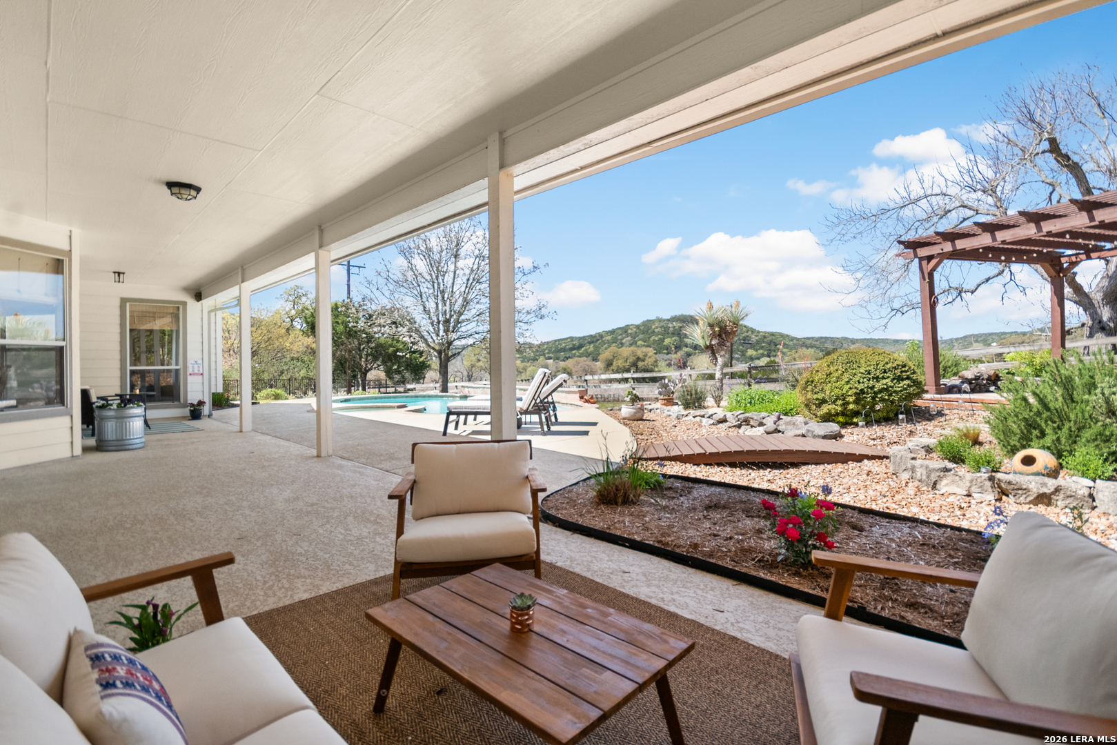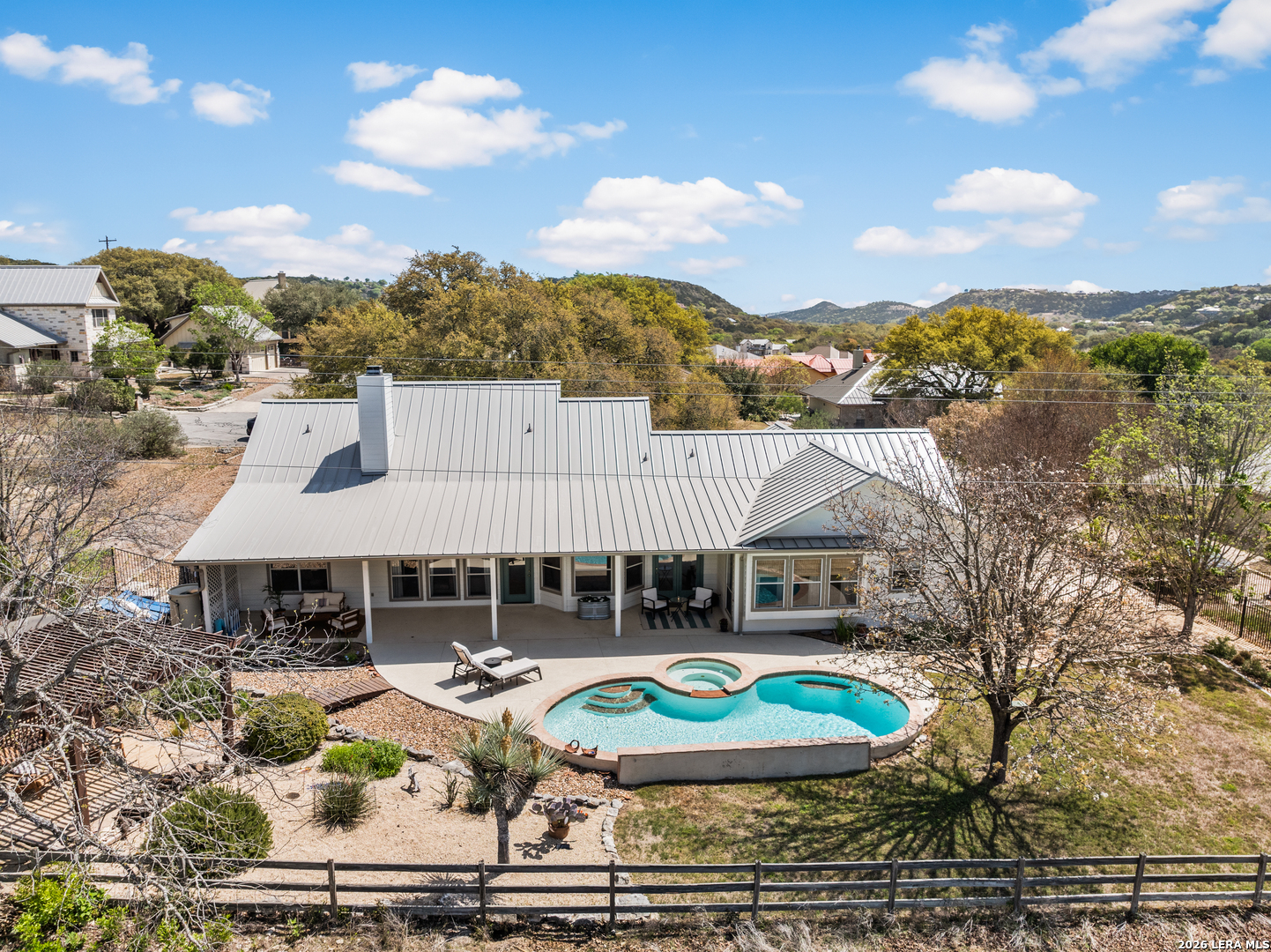 Nestled on a quiet cul-de-sac within the sought-after Tapatio Springs community, this beautifully curated one-story ranch-style residence offers an exceptional blend of refined comfort, thoughtful upgrades, and timeless Hill Country charm. Spanning 2,236 square feet, the home features 3 bedrooms, 2 baths, and a versatile study with a closet-ideal as a fourth bedroom, private office, or guest retreat. The expansive primary suite serves as a true sanctuary, complete with dual vanities and two spacious walk-in closets, delivering both luxury and functionality. Extensively updated, the home showcases fresh interior and exterior paint-including the garage-along with a durable metal roof (approximately 3-4 years old). In the kitchen, recently updated appliances include a microwave and dishwasher, while custom window treatments elevate the living, kitchen, and primary spaces. The living areas are thoughtfully designed with a warm palette that complements the classic German limestone and distinctive schmear finish, anchored by a custom fireplace. Outdoor living is nothing short of exceptional. The private backyard retreat is framed by mature trees and features a sparkling pool and spa with a brand-new pump, heater, and cleaner. A newly rebuilt sun deck (with a 10-year warranty), covered patio, and additional pergola create multiple spaces for relaxation and entertaining. A rainwater catchment system efficiently collects and redistributes water to support the landscape and assist with pool maintenance. Seasonal beauty surrounds the property-from the blooming Bradford pear near the pool in spring to the vibrant orange hues of the bigtooth maple in the fall, reminiscent of Lost Maples. The front porch exudes classic Southern charm with its haint blue ceiling and inviting swing, while recently trimmed and treated oak trees enhance the home's curb appeal. With a recently filled propane tank supporting the pool and spa, upgraded finishes throughout, and a rare combination of privacy, efficiency, and design, this exceptional property captures the essence of elevated Hill Country living.