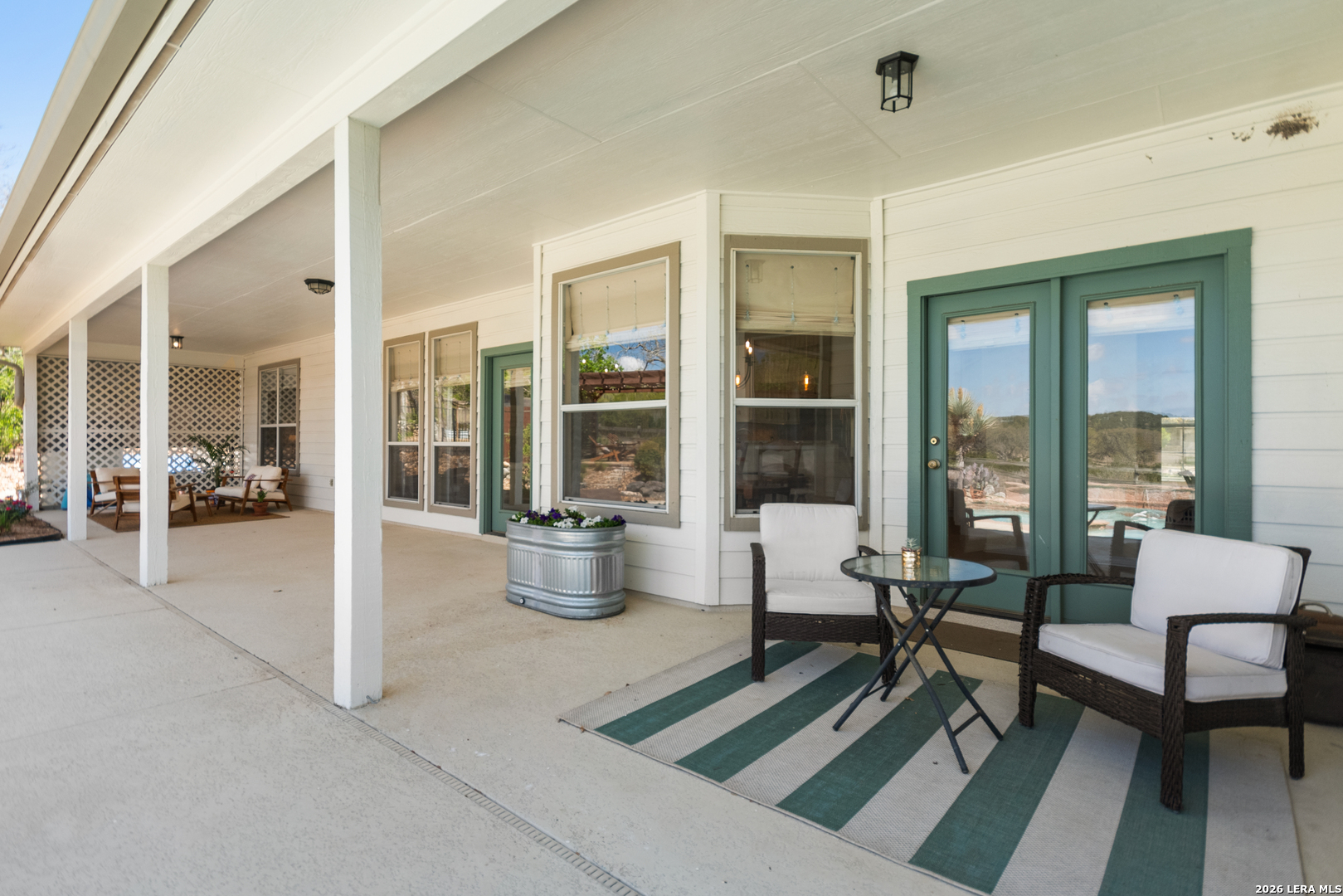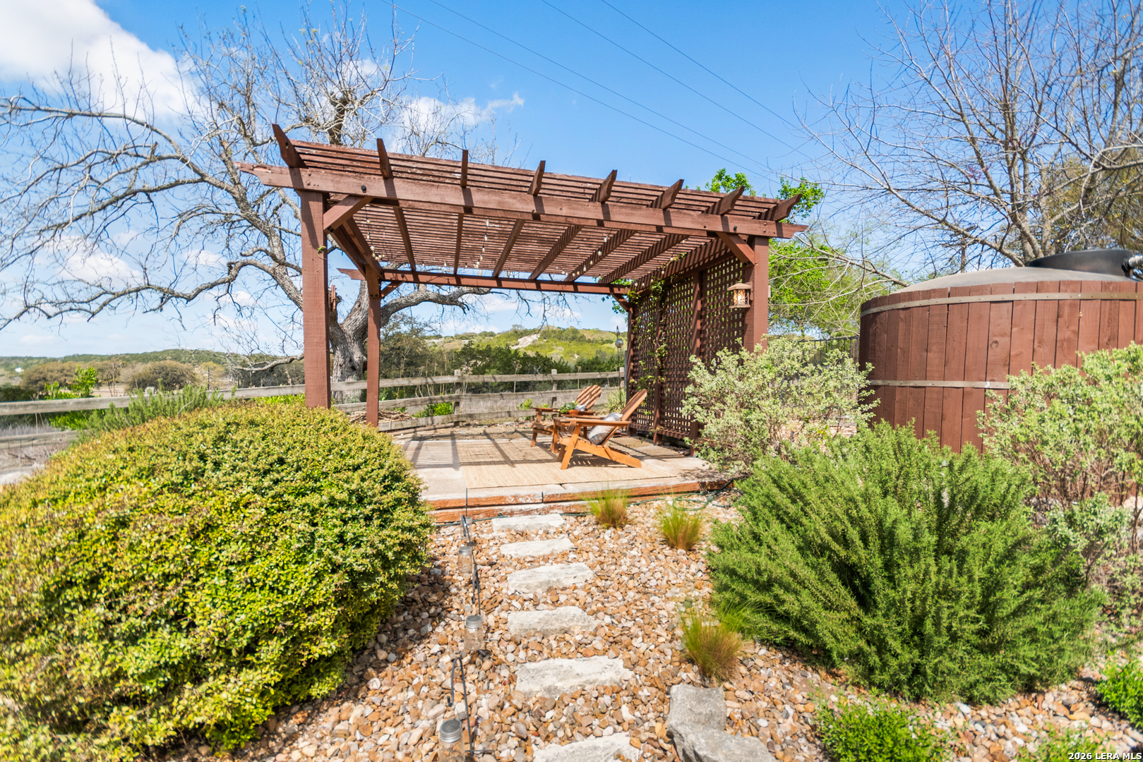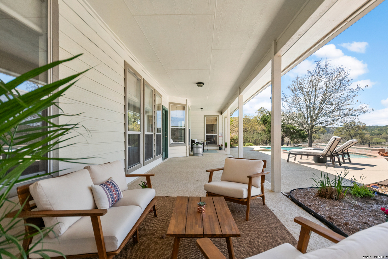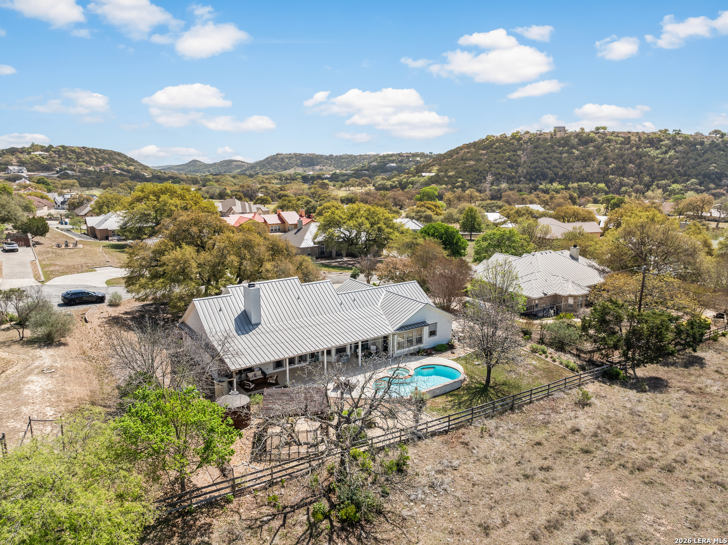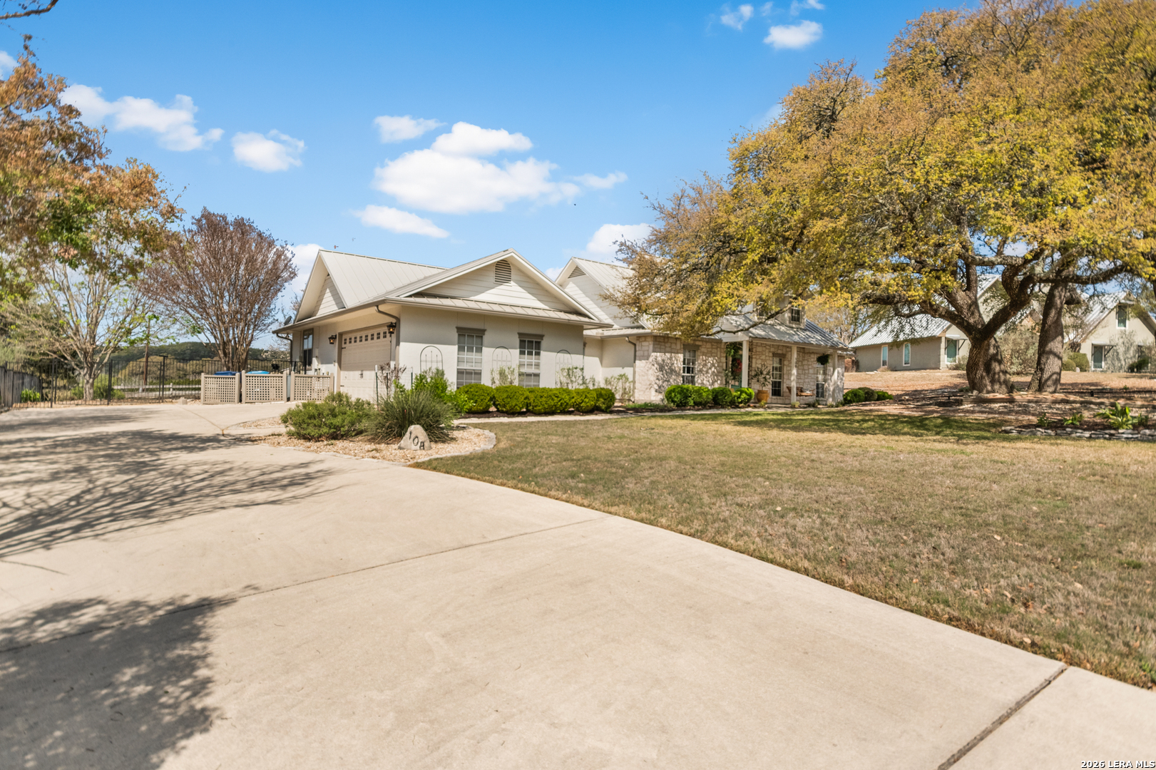 Nestled on a quiet cul-de-sac within the sought-after Tapatio Springs community, this beautifully curated one-story ranch-style residence offers an exceptional blend of refined comfort, thoughtful upgrades, and timeless Hill Country charm. Spanning 2,236 square feet, the home features 3 bedrooms, 2 baths, and a versatile study with a closet-ideal as a fourth bedroom, private office, or guest retreat. The expansive primary suite serves as a true sanctuary, complete with dual vanities and two spacious walk-in closets, delivering both luxury and functionality. Extensively updated, the home showcases fresh interior and exterior paint-including the garage-along with a durable metal roof (approximately 3-4 years old). In the kitchen, recently updated appliances include a microwave and dishwasher, while custom window treatments elevate the living, kitchen, and primary spaces. The living areas are thoughtfully designed with a warm palette that complements the classic German limestone and distinctive schmear finish, anchored by a custom fireplace. Outdoor living is nothing short of exceptional. The private backyard retreat is framed by mature trees and features a sparkling pool and spa with a brand-new pump, heater, and cleaner. A newly rebuilt sun deck (with a 10-year warranty), covered patio, and additional pergola create multiple spaces for relaxation and entertaining. A rainwater catchment system efficiently collects and redistributes water to support the landscape and assist with pool maintenance. Seasonal beauty surrounds the property-from the blooming Bradford pear near the pool in spring to the vibrant orange hues of the bigtooth maple in the fall, reminiscent of Lost Maples. The front porch exudes classic Southern charm with its haint blue ceiling and inviting swing, while recently trimmed and treated oak trees enhance the home's curb appeal. With a recently filled propane tank supporting the pool and spa, upgraded finishes throughout, and a rare combination of privacy, efficiency, and design, this exceptional property captures the essence of elevated Hill Country living.