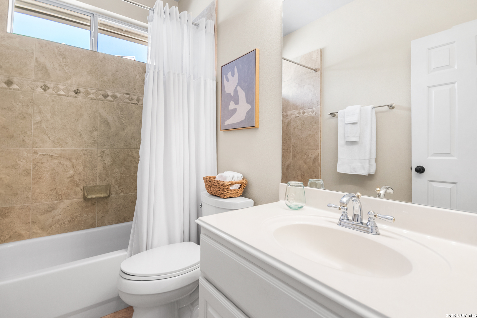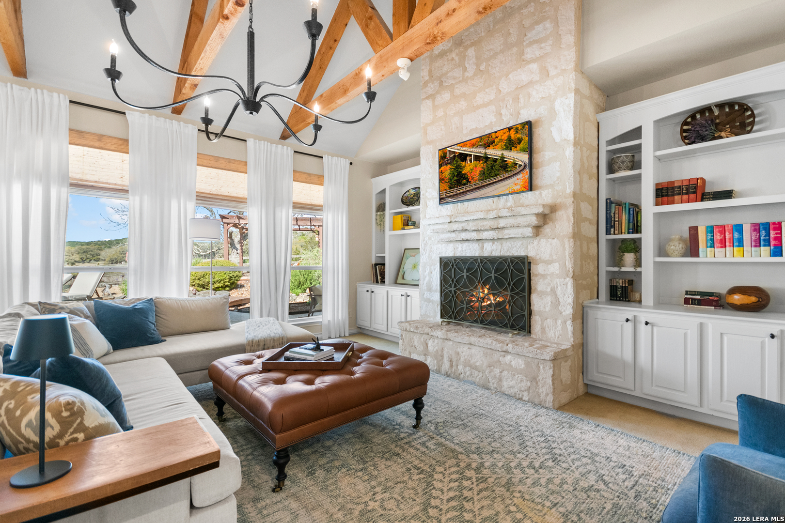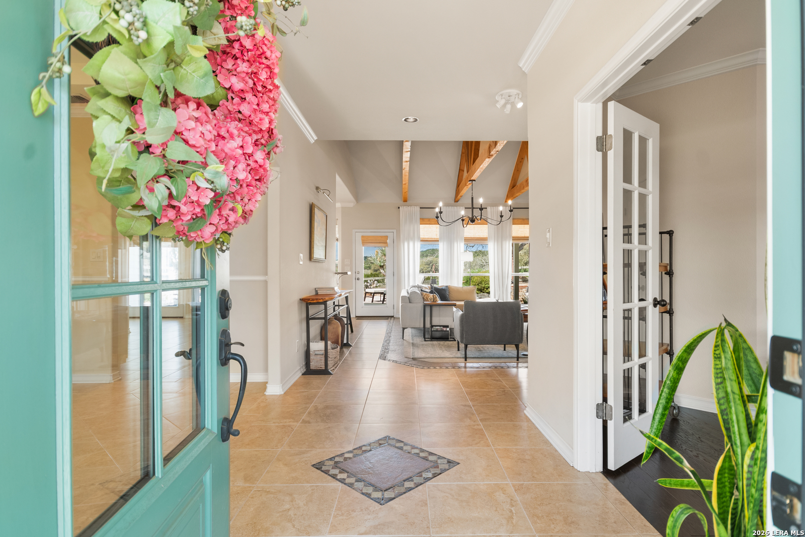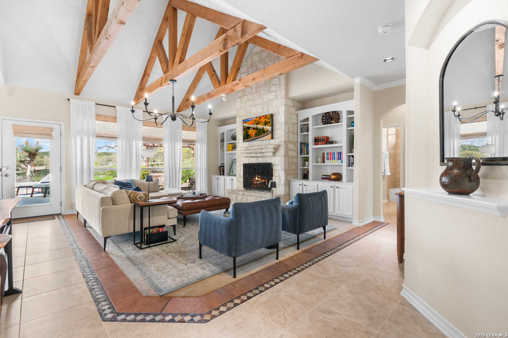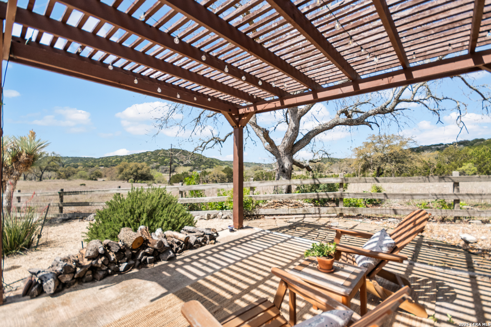 Nestled on a quiet cul-de-sac within the sought-after Tapatio Springs community, this beautifully curated one-story ranch-style residence offers an exceptional blend of refined comfort, thoughtful upgrades, and timeless Hill Country charm. Spanning 2,236 square feet, the home features 3 bedrooms, 2 baths, and a versatile study with a closet-ideal as a fourth bedroom, private office, or guest retreat. The expansive primary suite serves as a true sanctuary, complete with dual vanities and two spacious walk-in closets, delivering both luxury and functionality. Extensively updated, the home showcases fresh interior and exterior paint-including the garage-along with a durable metal roof (approximately 3-4 years old). In the kitchen, recently updated appliances include a microwave and dishwasher, while custom window treatments elevate the living, kitchen, and primary spaces. The living areas are thoughtfully designed with a warm palette that complements the classic German limestone and distinctive schmear finish, anchored by a custom fireplace. Outdoor living is nothing short of exceptional. The private backyard retreat is framed by mature trees and features a sparkling pool and spa with a brand-new pump, heater, and cleaner. A newly rebuilt sun deck (with a 10-year warranty), covered patio, and additional pergola create multiple spaces for relaxation and entertaining. A rainwater catchment system efficiently collects and redistributes water to support the landscape and assist with pool maintenance. Seasonal beauty surrounds the property-from the blooming Bradford pear near the pool in spring to the vibrant orange hues of the bigtooth maple in the fall, reminiscent of Lost Maples. The front porch exudes classic Southern charm with its haint blue ceiling and inviting swing, while recently trimmed and treated oak trees enhance the home's curb appeal. With a recently filled propane tank supporting the pool and spa, upgraded finishes throughout, and a rare combination of privacy, efficiency, and design, this exceptional property captures the essence of elevated Hill Country living.