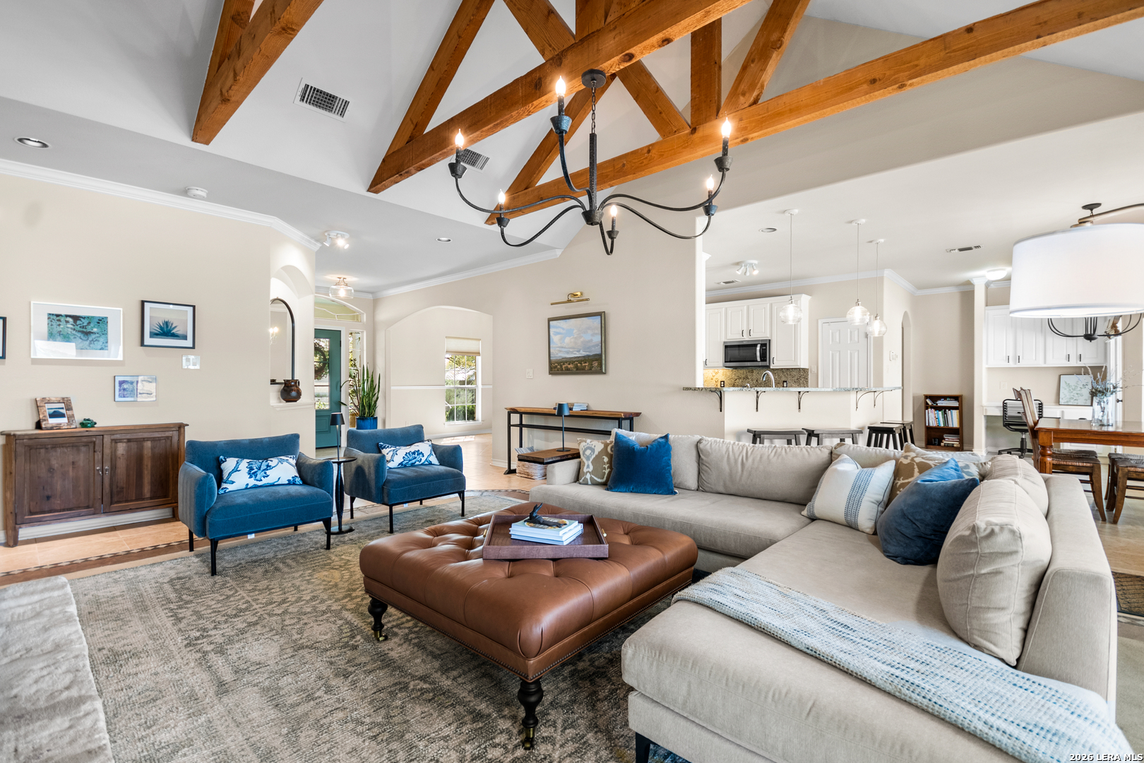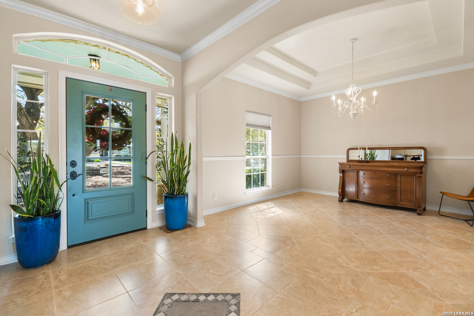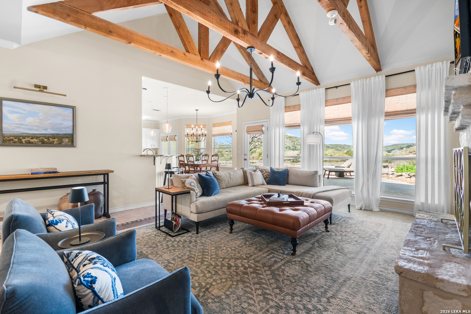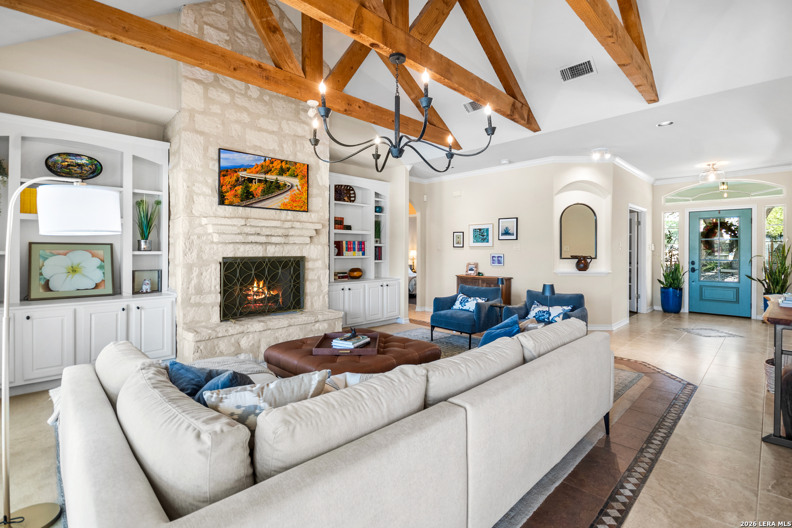 Nestled on a quiet cul-de-sac within the sought-after Tapatio Springs community, this beautifully curated one-story ranch-style residence offers an exceptional blend of refined comfort, thoughtful upgrades, and timeless Hill Country charm. Spanning 2,236 square feet, the home features 3 bedrooms, 2 baths, and a versatile study with a closet-ideal as a fourth bedroom, private office, or guest retreat. The expansive primary suite serves as a true sanctuary, complete with dual vanities and two spacious walk-in closets, delivering both luxury and functionality. Extensively updated, the home showcases fresh interior and exterior paint-including the garage-along with a durable metal roof (approximately 3-4 years old). In the kitchen, recently updated appliances include a microwave and dishwasher, while custom window treatments elevate the living, kitchen, and primary spaces. The living areas are thoughtfully designed with a warm palette that complements the classic German limestone and distinctive schmear finish, anchored by a custom fireplace. Outdoor living is nothing short of exceptional. The private backyard retreat is framed by mature trees and features a sparkling pool and spa with a brand-new pump, heater, and cleaner. A newly rebuilt sun deck (with a 10-year warranty), covered patio, and additional pergola create multiple spaces for relaxation and entertaining. A rainwater catchment system efficiently collects and redistributes water to support the landscape and assist with pool maintenance. Seasonal beauty surrounds the property-from the blooming Bradford pear near the pool in spring to the vibrant orange hues of the bigtooth maple in the fall, reminiscent of Lost Maples. The front porch exudes classic Southern charm with its haint blue ceiling and inviting swing, while recently trimmed and treated oak trees enhance the home's curb appeal. With a recently filled propane tank supporting the pool and spa, upgraded finishes throughout, and a rare combination of privacy, efficiency, and design, this exceptional property captures the essence of elevated Hill Country living.