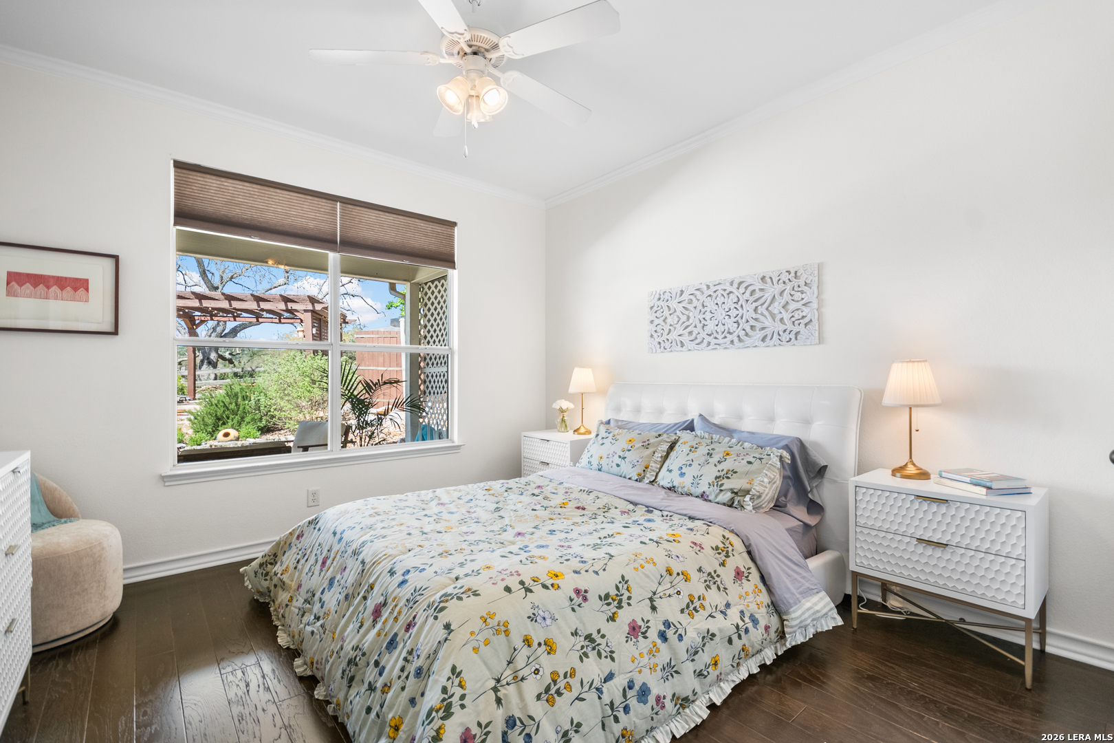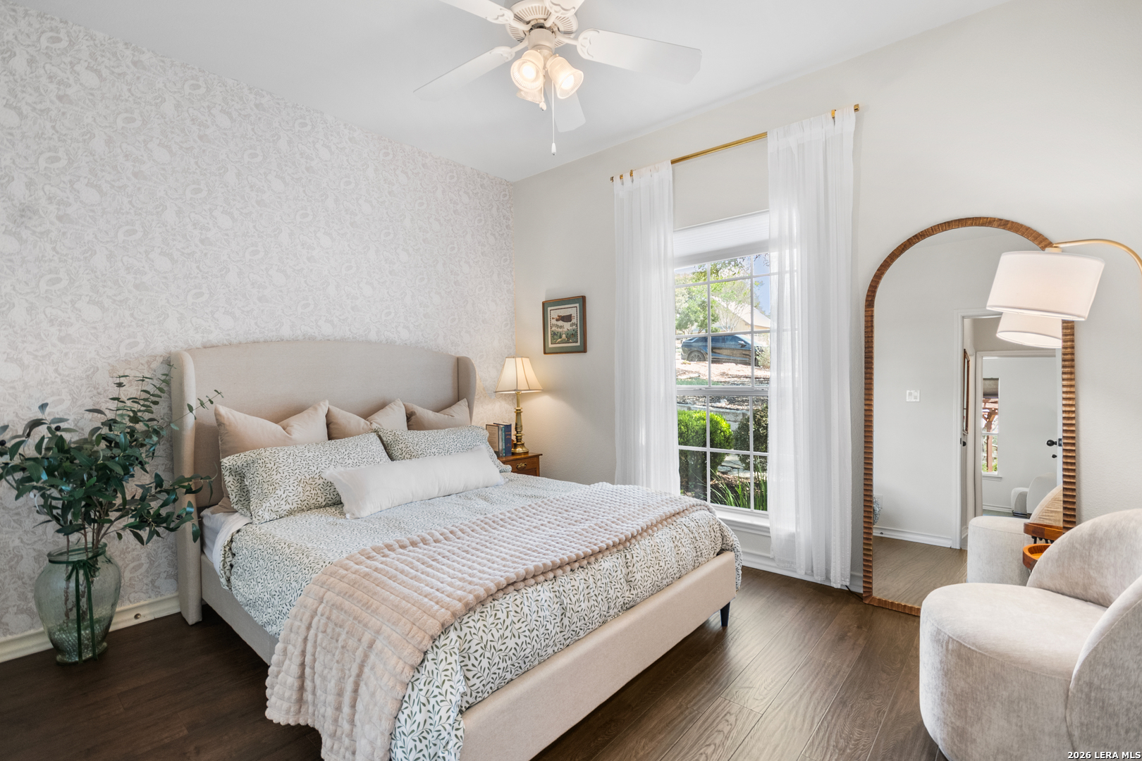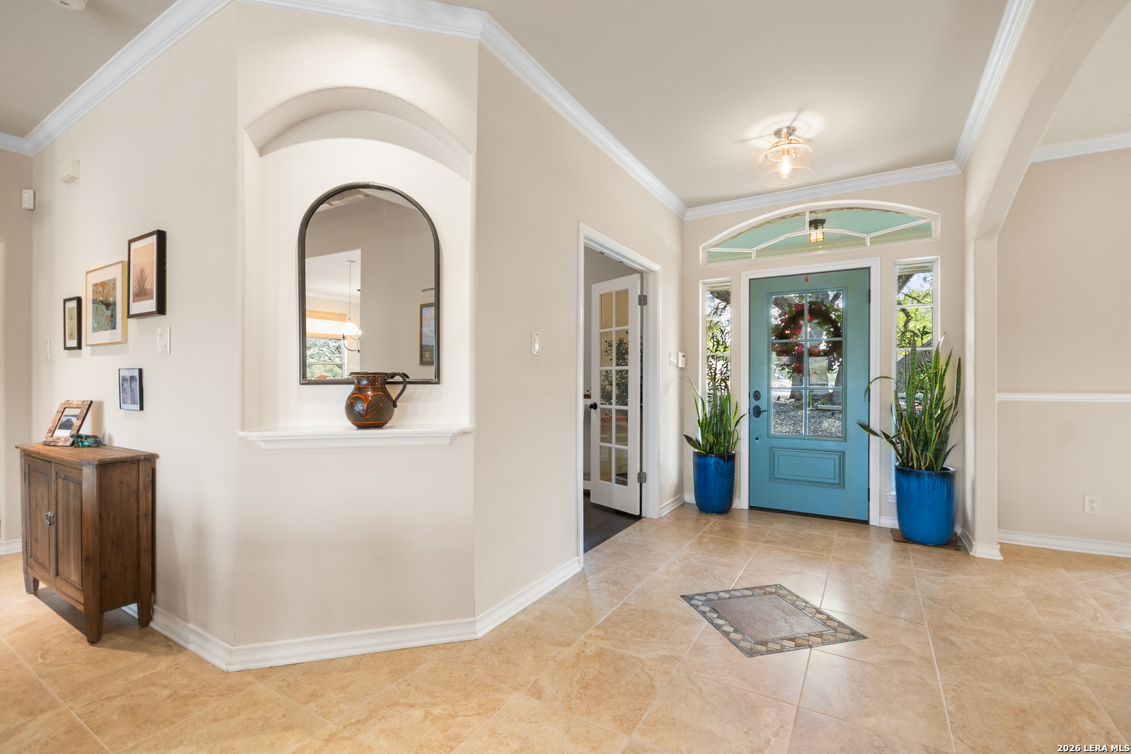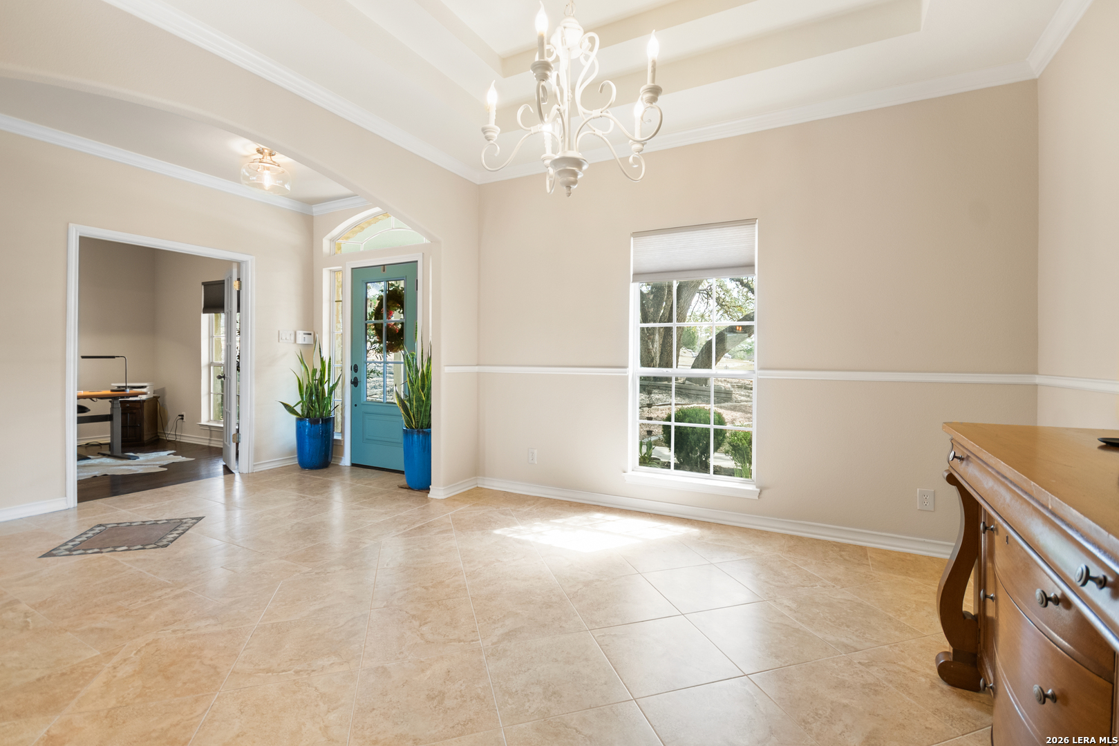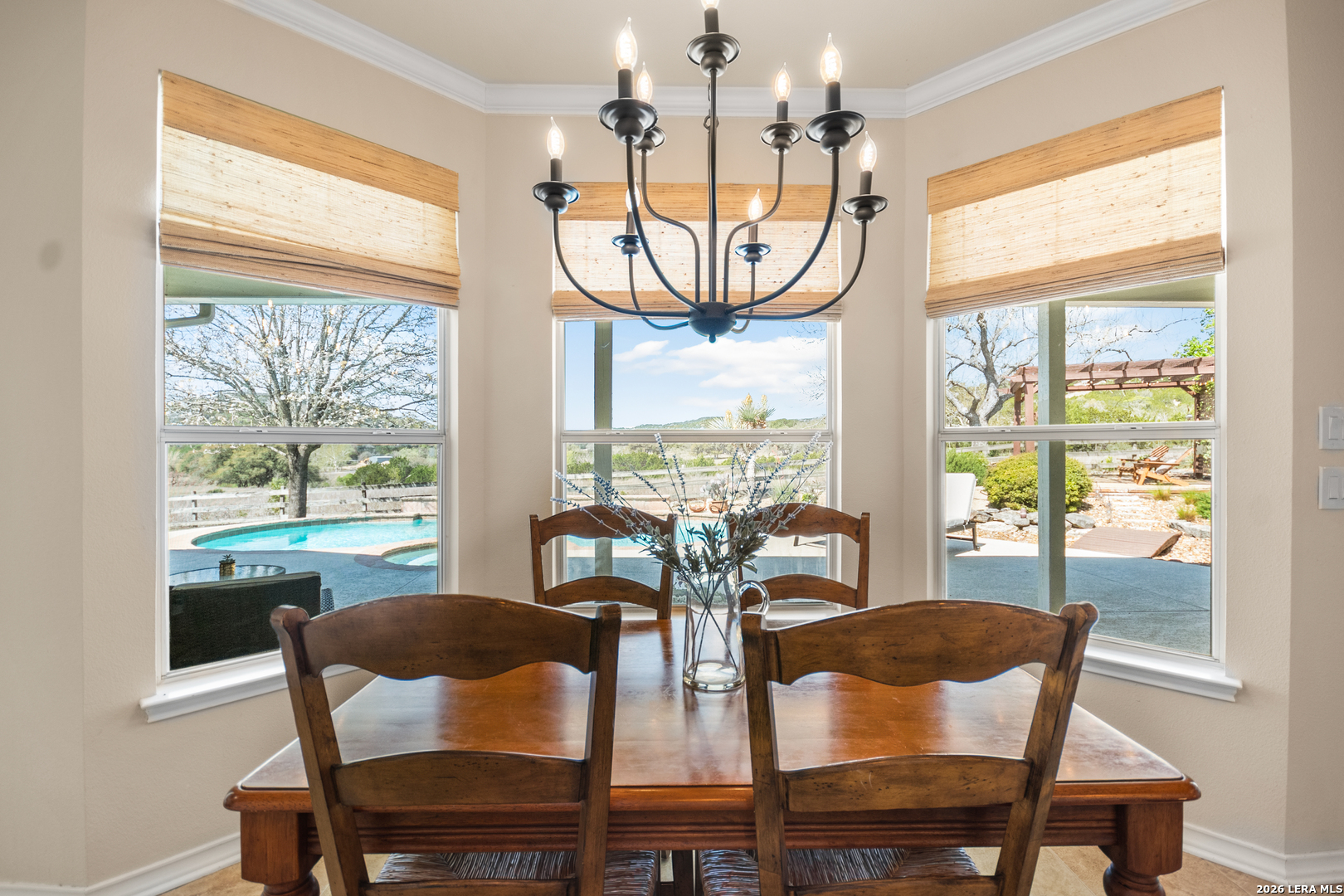Nestled on a quiet cul-de-sac within the sought-after Tapatio Springs community, this beautifully curated one-story ranch-style residence offers an exceptional blend of refined comfort, thoughtful upgrades, and timeless Hill Country charm. Spanning 2,236 square feet, the home features 3 bedrooms, 2 baths, and a versatile study with a closet-ideal as a fourth bedroom, private office, or guest retreat. The expansive primary suite serves as a true sanctuary, complete with dual vanities and two spacious walk-in closets, delivering both luxury and functionality. Extensively updated, the home showcases fresh interior and exterior paint-including the garage-along with a durable metal roof (approximately 3-4 years old). In the kitchen, recently updated appliances include a microwave and dishwasher, while custom window treatments elevate the living, kitchen, and primary spaces. The living areas are thoughtfully designed with a warm palette that complements the classic German limestone and distinctive schmear finish, anchored by a custom fireplace. Outdoor living is nothing short of exceptional. The private backyard retreat is framed by mature trees and features a sparkling pool and spa with a brand-new pump, heater, and cleaner. A newly rebuilt sun deck (with a 10-year warranty), covered patio, and additional pergola create multiple spaces for relaxation and entertaining. A rainwater catchment system efficiently collects and redistributes water to support the landscape and assist with pool maintenance. Seasonal beauty surrounds the property-from the blooming Bradford pear near the pool in spring to the vibrant orange hues of the bigtooth maple in the fall, reminiscent of Lost Maples. The front porch exudes classic Southern charm with its haint blue ceiling and inviting swing, while recently trimmed and treated oak trees enhance the home's curb appeal. With a recently filled propane tank supporting the pool and spa, upgraded finishes throughout, and a rare combination of privacy, efficiency, and design, this exceptional property captures the essence of elevated Hill Country living.