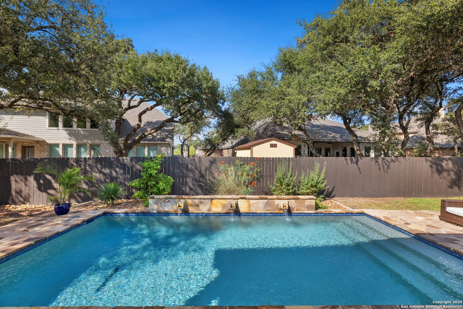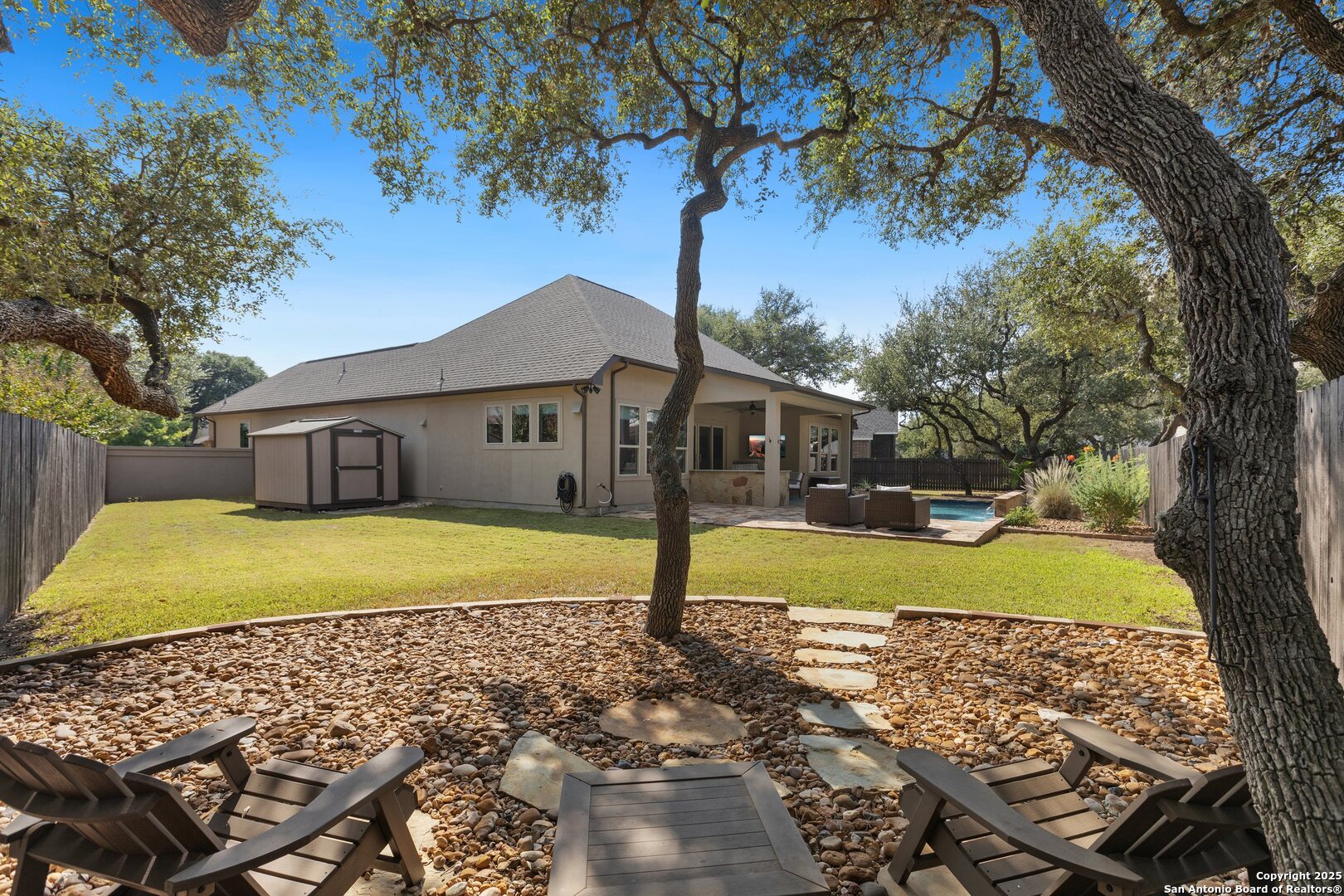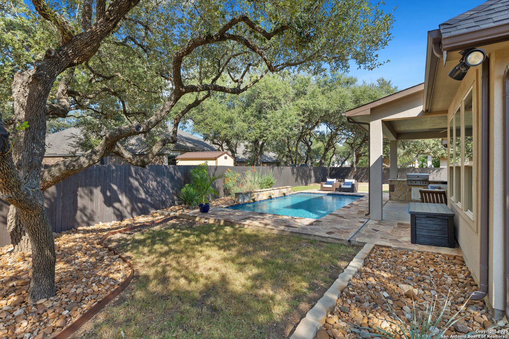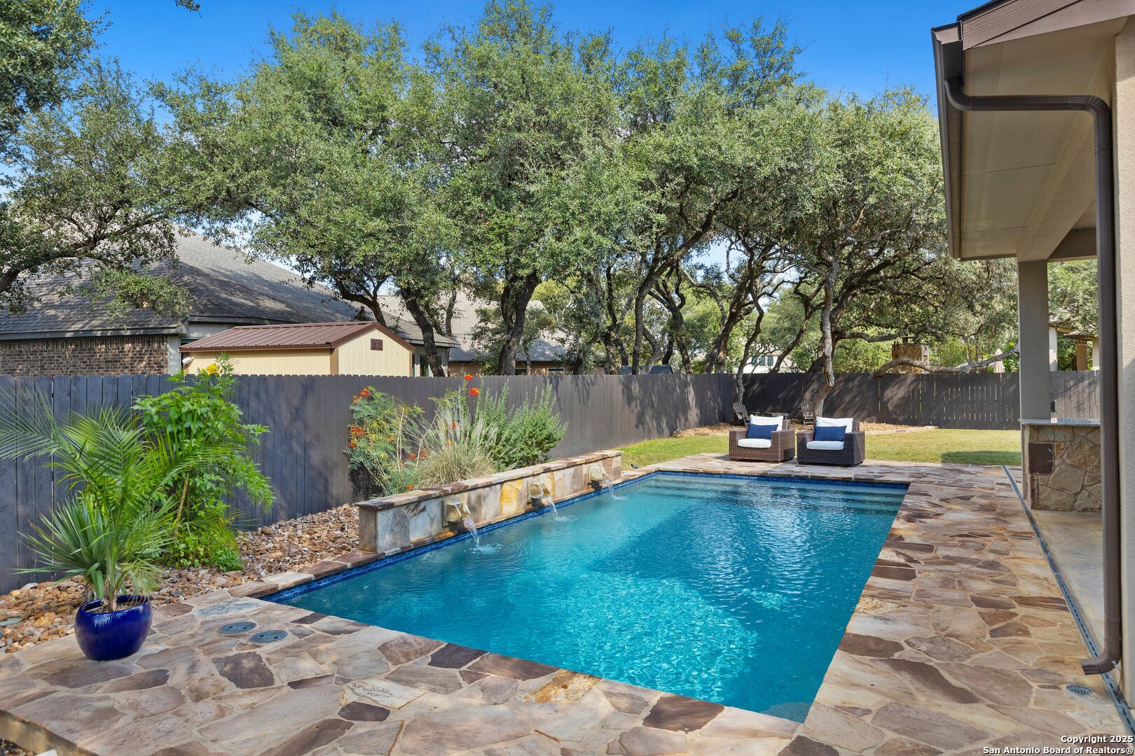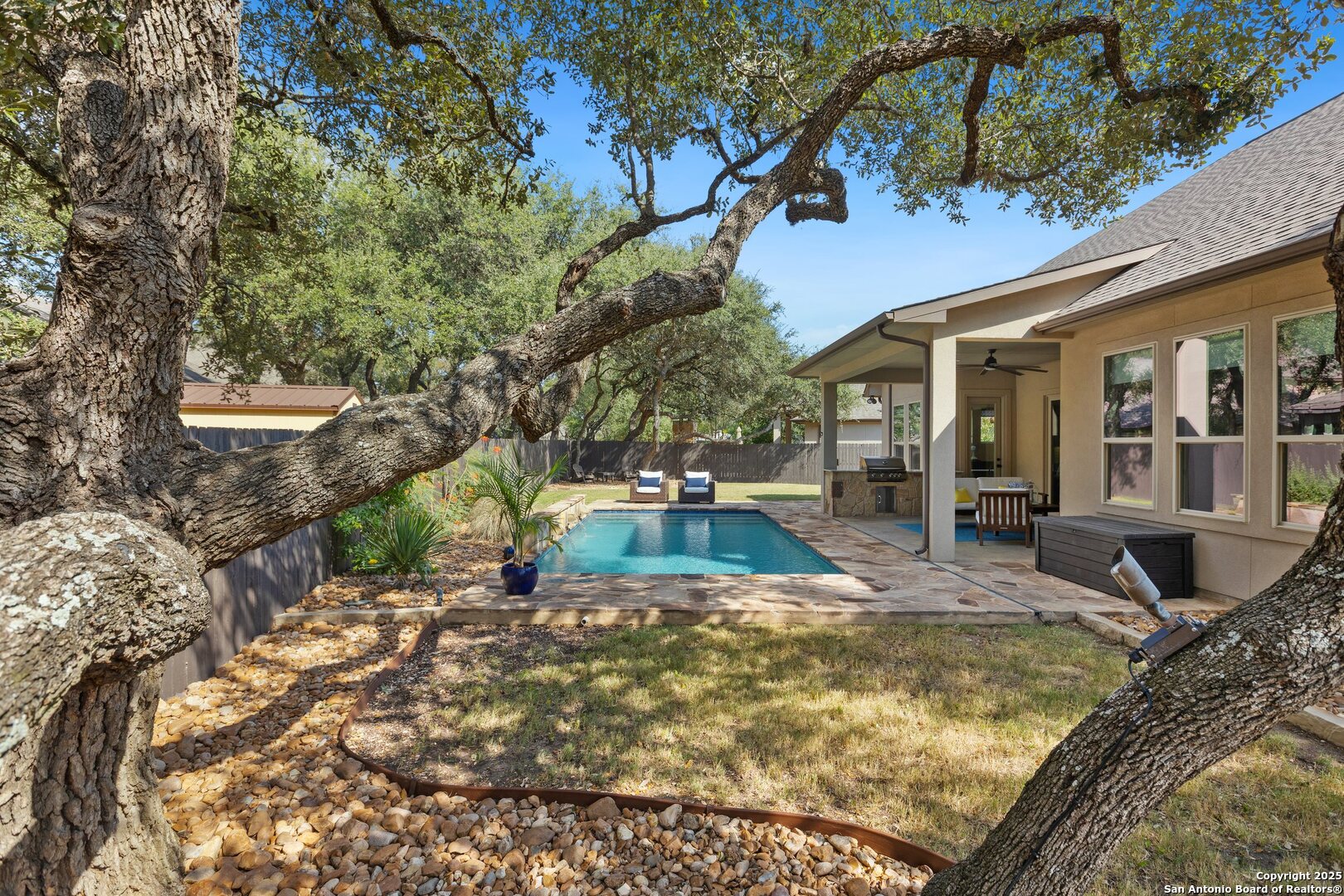 Welcome to this beautifully maintained single-story home in Boerne, TX! This 4-bedroom, 3-bathroom gem offers effortless living with exceptional outdoor amenities. Step outside to your private backyard oasis featuring a sparkling Keith Zars pool, complete with an outdoor kitchen perfect for entertaining. Multiple sitting areas throughout the professionally landscaped yard provide ideal spots to relax under the shade of mature oak trees. A charming corner sitting area adds to the outdoor appeal, while a convenient storage shed offers extra space for all your needs. Inside, you'll appreciate the thoughtful upgrades including custom California Closets built-in desk and storage cabinets, epoxy-coated garage floors with overhead storage, two 220V/EV chargers in the garage, and an Alamo Water Systems water softener for comfort and convenience. The front of the home welcomes you with a gated private courtyard-a charming space perfect for morning coffee or evening relaxation. The professional landscaping creates wonderful curb appeal and a welcoming first impression. This easy-to-maintain home is nestled in a friendly neighborhood with wonderful neighbors. It's truly a special property that's ready for you to create your own memories. Don't miss this opportunity to own a home that combines comfort, style, and effortless living!