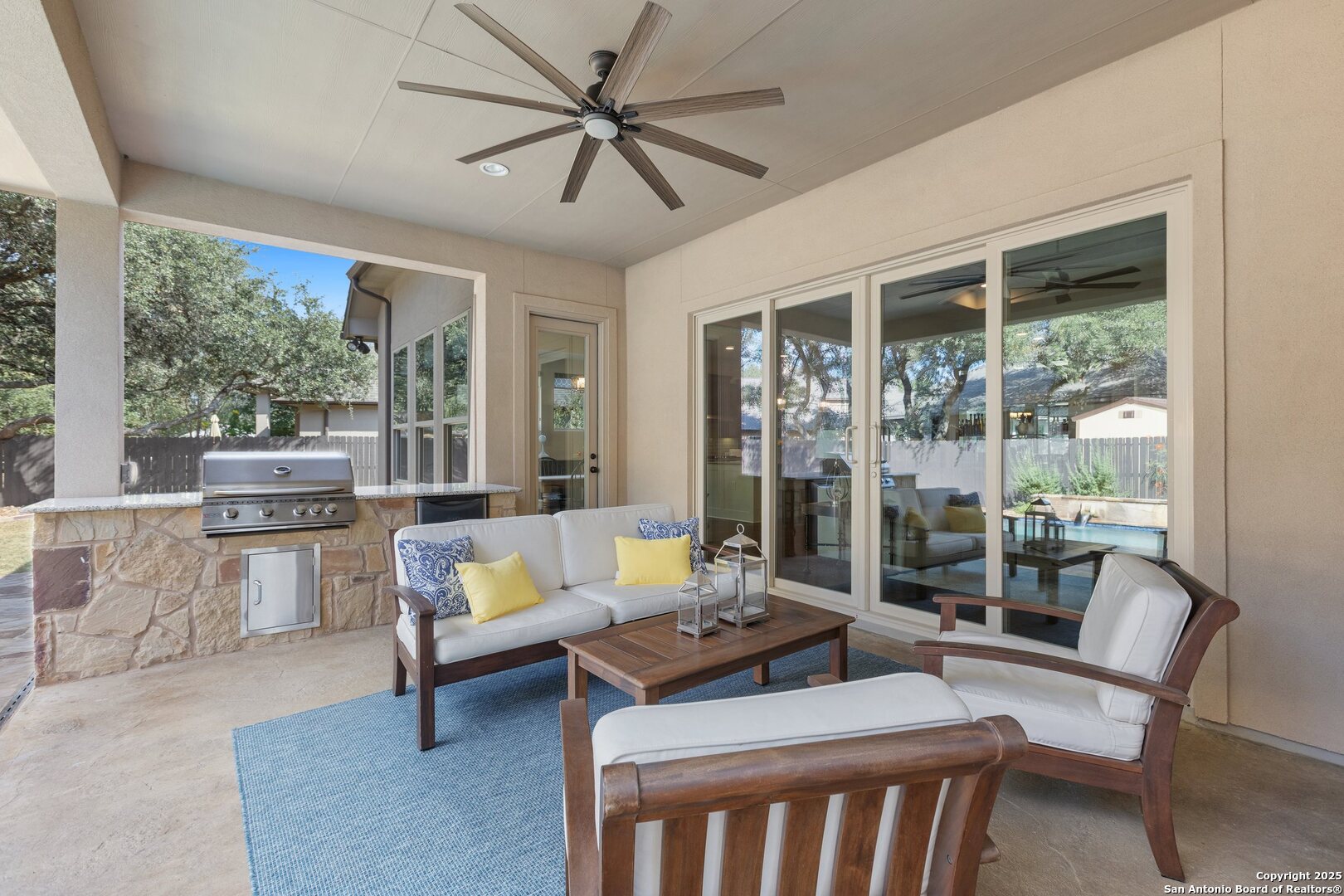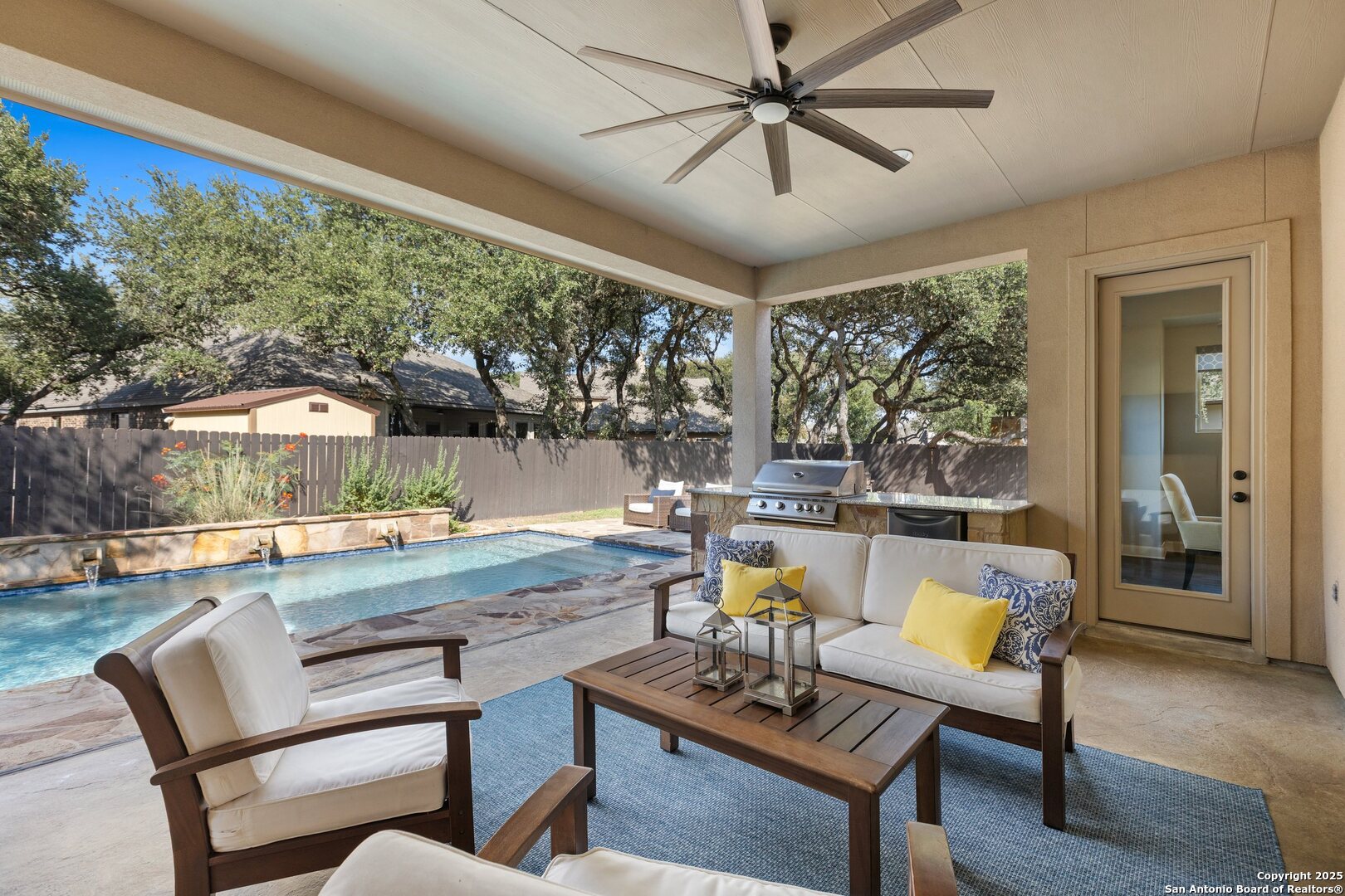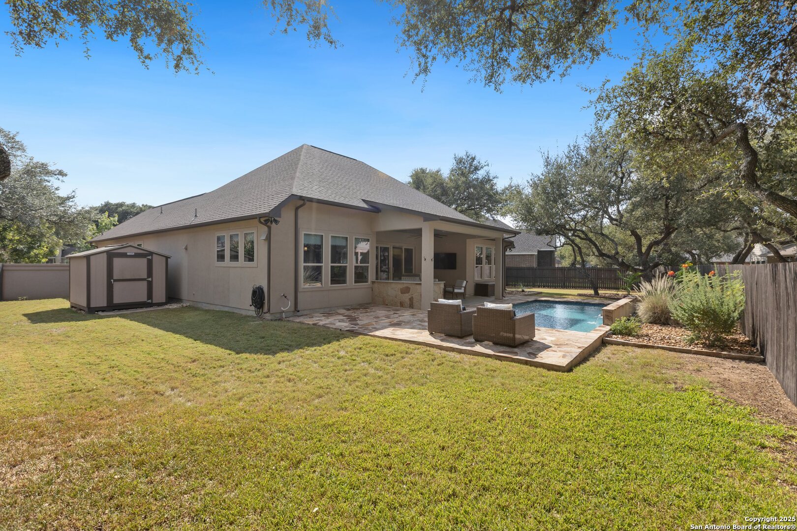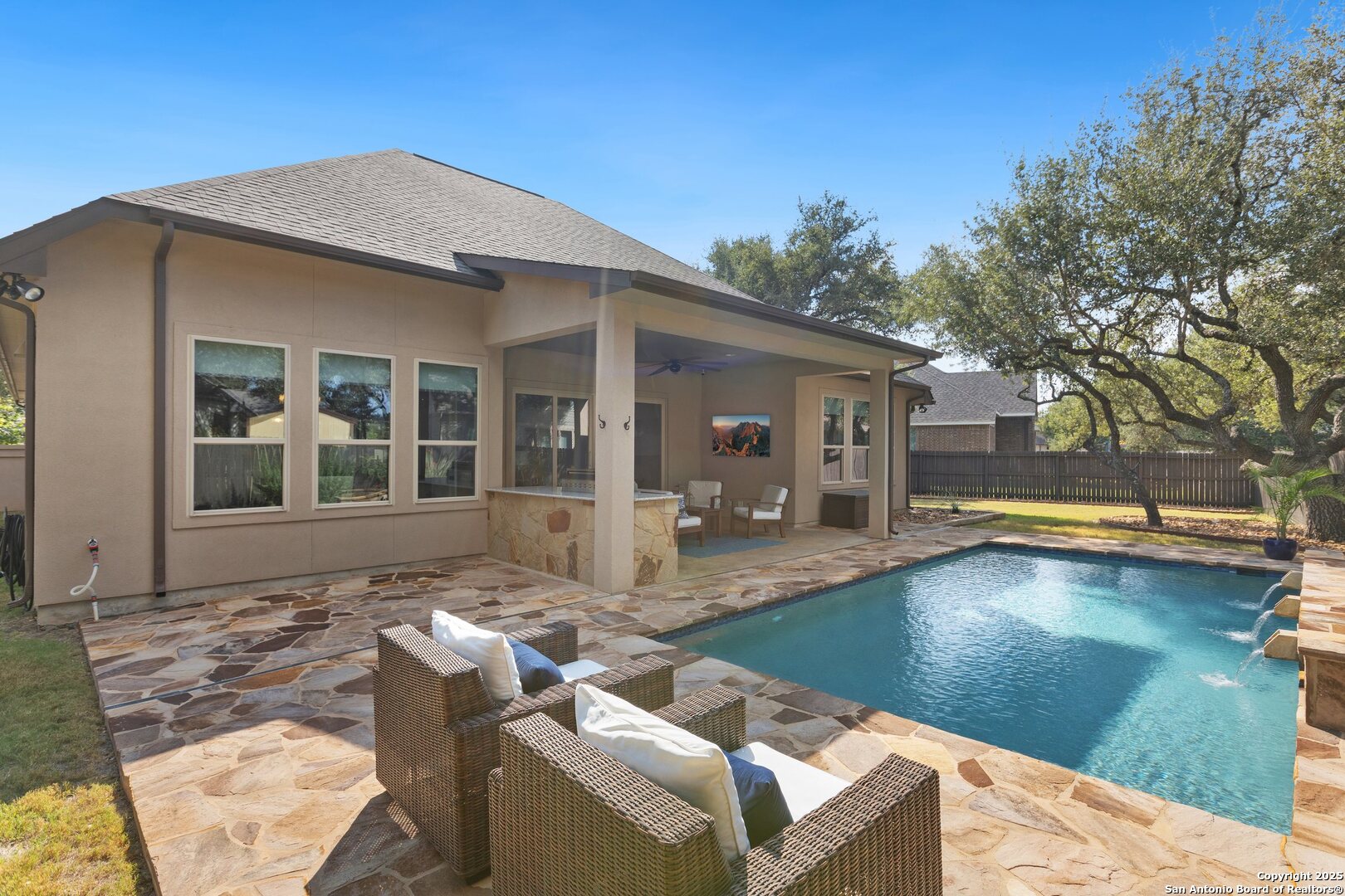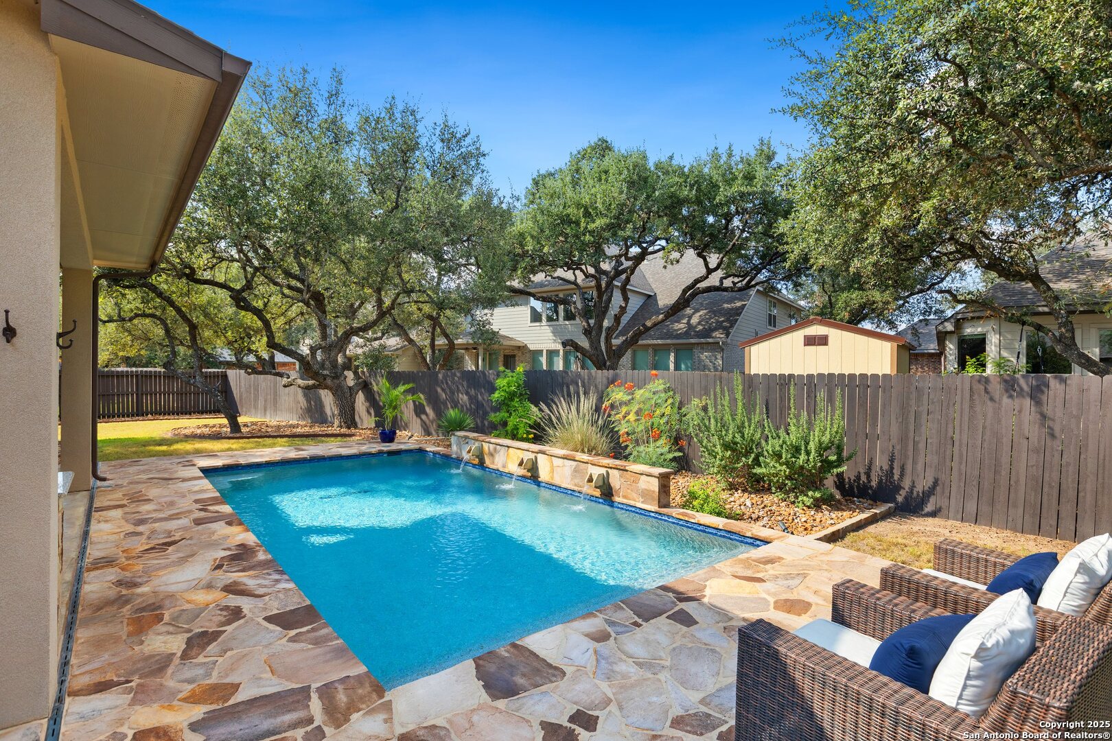Welcome to this beautifully maintained single-story home in Boerne, TX! This 4-bedroom, 3-bathroom gem offers effortless living with exceptional outdoor amenities. Step outside to your private backyard oasis featuring a sparkling Keith Zars pool, complete with an outdoor kitchen perfect for entertaining. Multiple sitting areas throughout the professionally landscaped yard provide ideal spots to relax under the shade of mature oak trees. A charming corner sitting area adds to the outdoor appeal, while a convenient storage shed offers extra space for all your needs. Inside, you'll appreciate the thoughtful upgrades including custom California Closets built-in desk and storage cabinets, epoxy-coated garage floors with overhead storage, two 220V/EV chargers in the garage, and an Alamo Water Systems water softener for comfort and convenience. The front of the home welcomes you with a gated private courtyard-a charming space perfect for morning coffee or evening relaxation. The professional landscaping creates wonderful curb appeal and a welcoming first impression. This easy-to-maintain home is nestled in a friendly neighborhood with wonderful neighbors. It's truly a special property that's ready for you to create your own memories. Don't miss this opportunity to own a home that combines comfort, style, and effortless living!