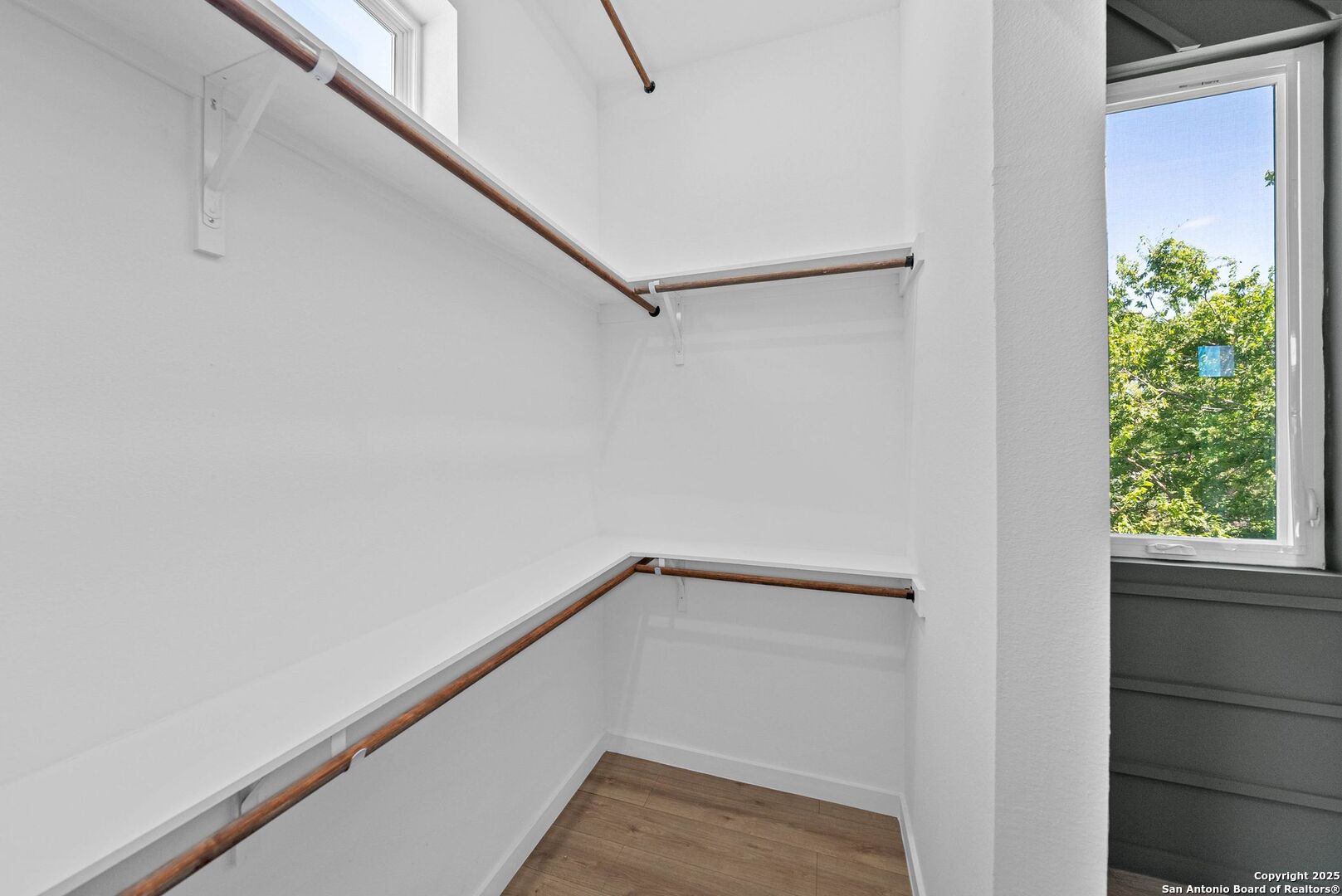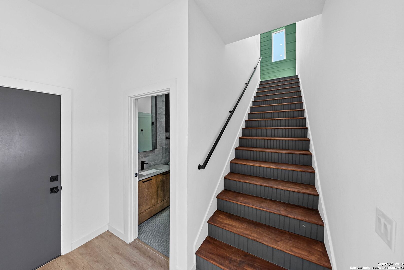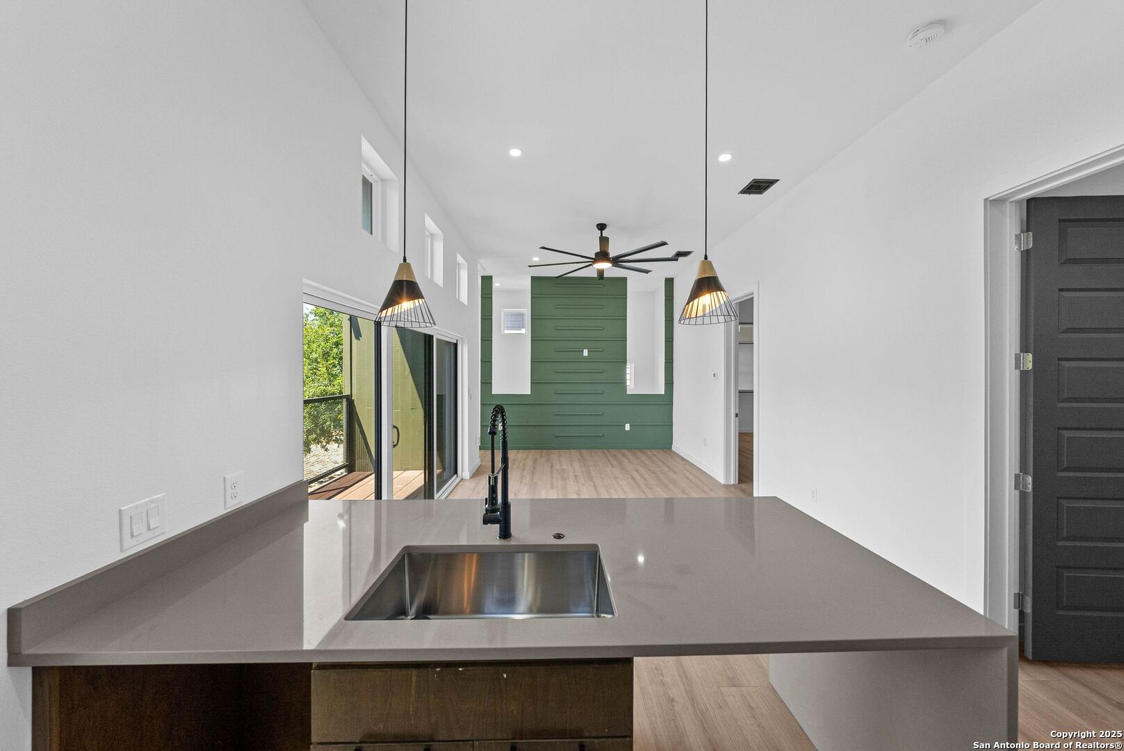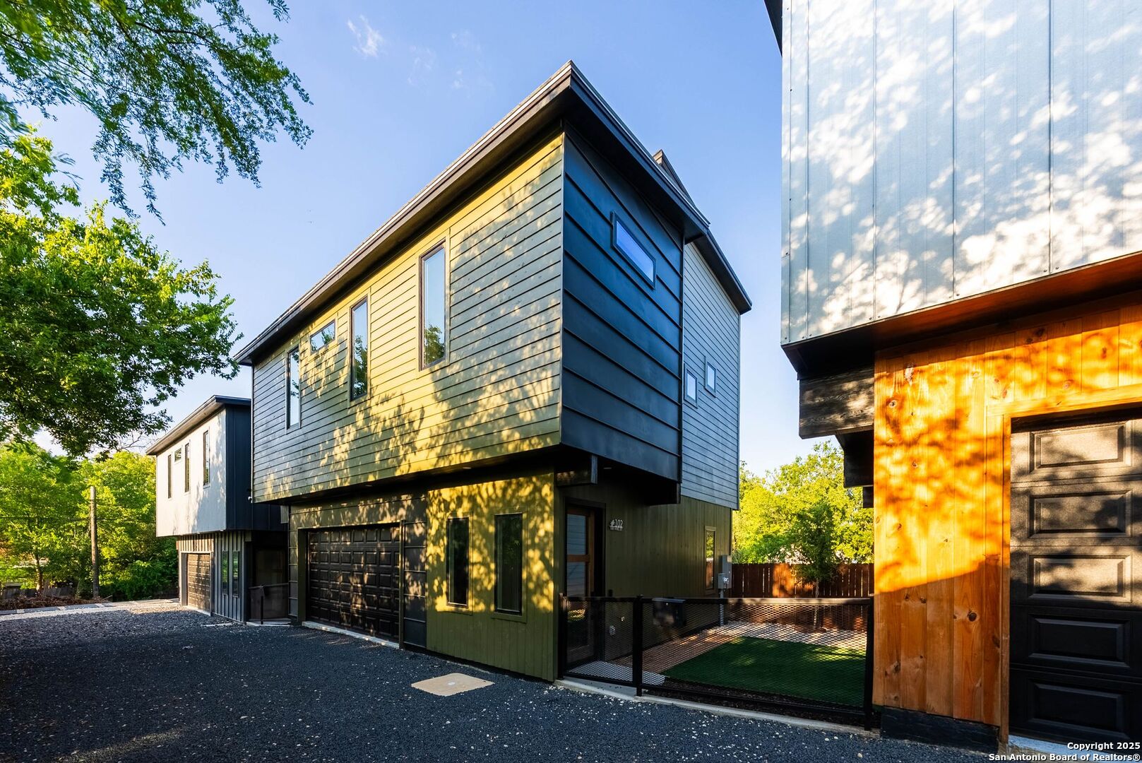 Modern living in the heart of downtown San Antonio! Welcome to Unit 102 - a thoughtfully designed 2-bedroom, 2-bath home with an office and a spacious utility room, maximizing its 1,681 square feet (including garage). The main living spaces are located on the second floor, offering elevated views, abundant natural light, and striking vaulted ceilings. The sleek kitchen boasts quartz countertops, custom cabinetry, a full decorative backsplash, stainless steel appliances, a pot filler, and a vent hood - perfect for both everyday use and entertaining. Enjoy seamless indoor-outdoor living with a metal-railed balcony accessed through oversized sliding doors. Stylish finishes throughout include modern lighting, accent walls in key rooms, and carefully curated bath designs. A low-maintenance xeriscape yard and a modern metal privacy fence elevate the outdoor appeal. The attached 2-car garage provides ample storage. A rare opportunity for sophisticated downtown living!