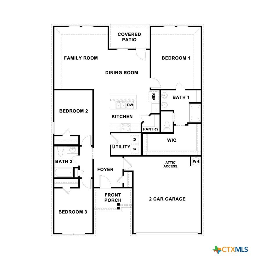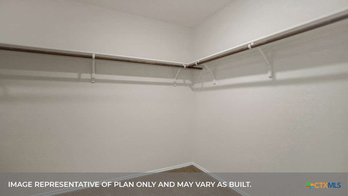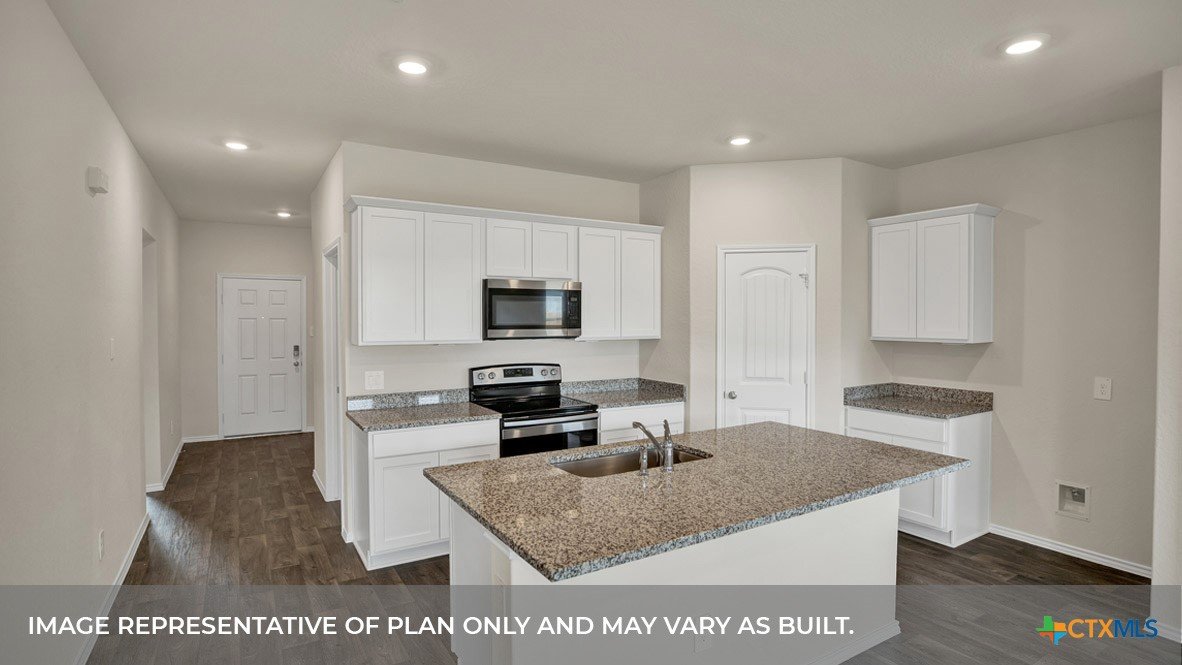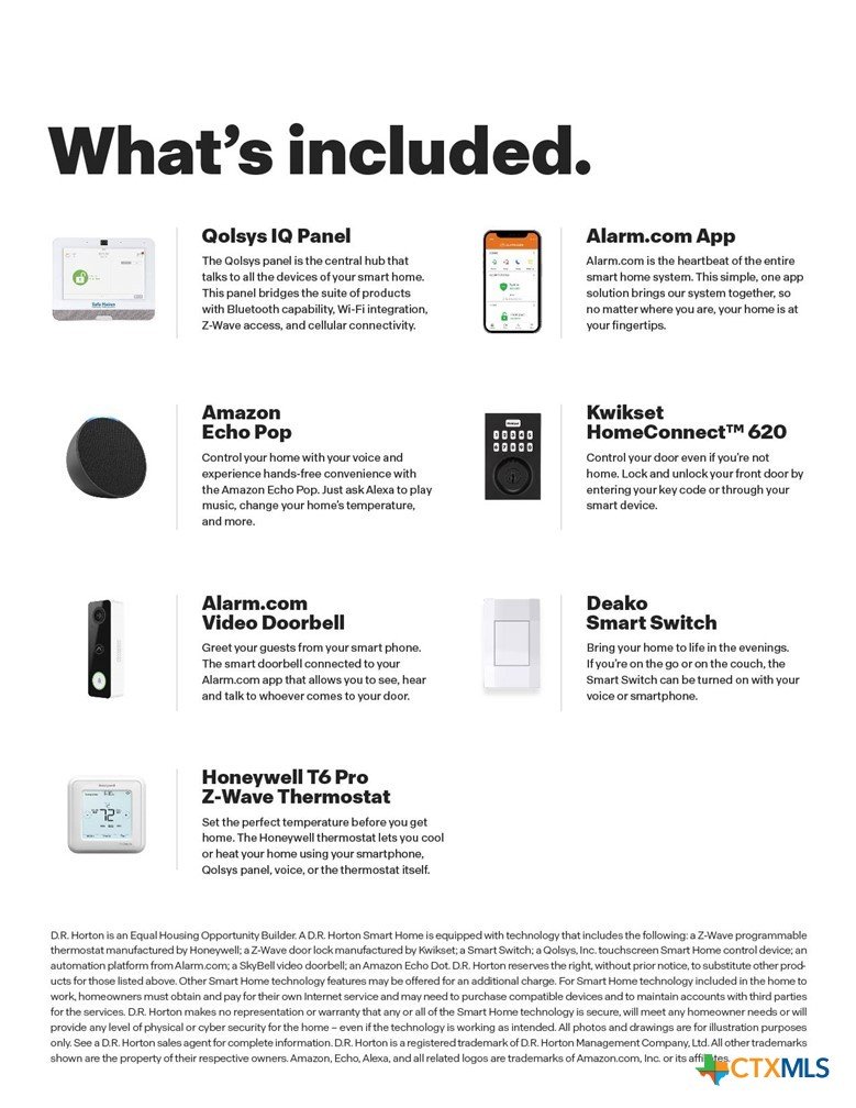 MARCH/APRIL COMPLETION. COMMUNITY HAS LOT OF AMENITIES AND THE ELEMENTARY SCHOOL IS IN THE COMMUNITY. Step into the Denton at Trace, one of our communities in San Marcos, Texas. This one-story home is perfect for small families looking for extra space. Inside this 1,566 square foot home, you will find 3 bedrooms, 2 bathrooms and a 2-car garage. Our homes in Trace feature farmhouse exteriors. Coming into the house from the covered front porch, you’ll find a foyer and hallway that takes you to the heart of the house, the living space. The open concept design of kitchen, dining room and family room allows for easy entertaining and everyday living. The L-shaped kitchen includes quartz countertops, a large island with an undermount sink, a corner pantry closet, stainless-steel appliances and 36’’ upper cabinets. The primary bedroom is off the dining room and has its own attached bathroom. Enjoy the 5’ walk in shower, vanity, and separate door to the toilet for privacy. A huge walk-in closet with generous shelving is connected to the bathroom. You will have plenty of space in this closet for your accessories or prized possessions. The secondary bedrooms are off the foyer at the front of the home. In the hall between the bedrooms is the secondary bathroom, which includes a tub/shower combination. Each bedroom includes a closet with shelving. The utility room is tucked away between the foyer and kitchen, convenient to all bedrooms once the clothes are cleaned. The Denton includes vinyl flooring throughout the common areas of the home, and carpet in the bedrooms. All our new homes feature a covered back patio, full sod, an irrigation system in the front and back yard, and a 6’ privacy fence around the back yard. This home features our America’s Smart Home base package, which includes the Video Front Doorbell, Front Door Deadbolt Lock, Home Hub, Thermostat.