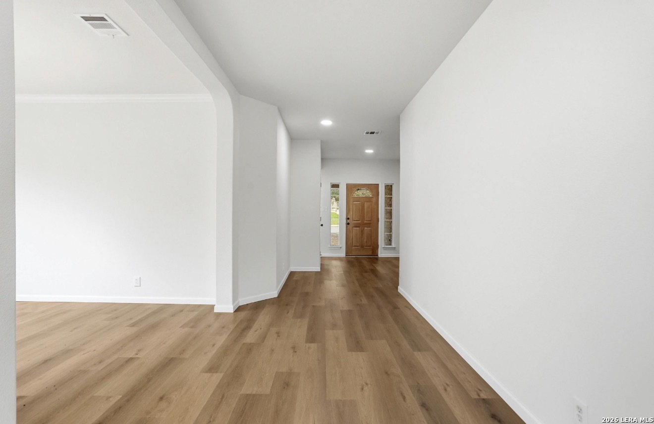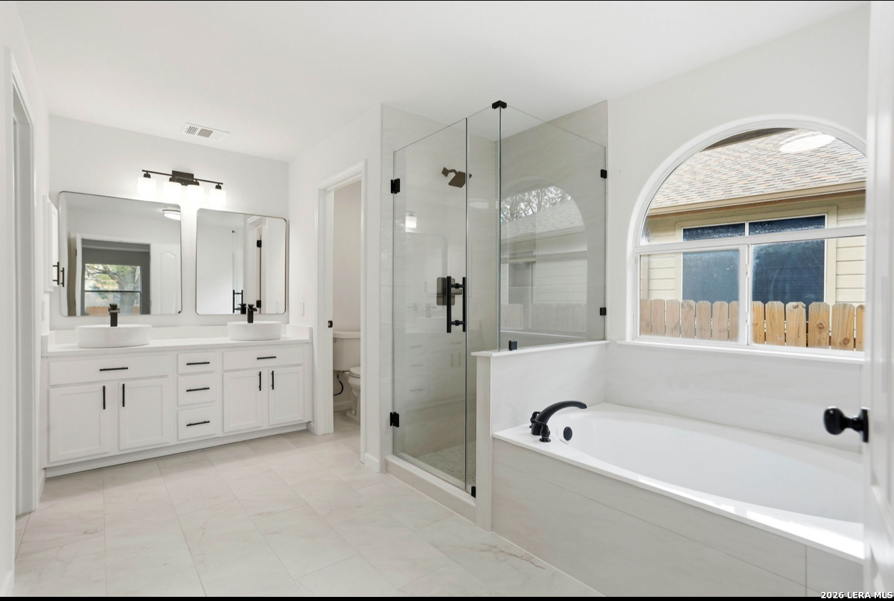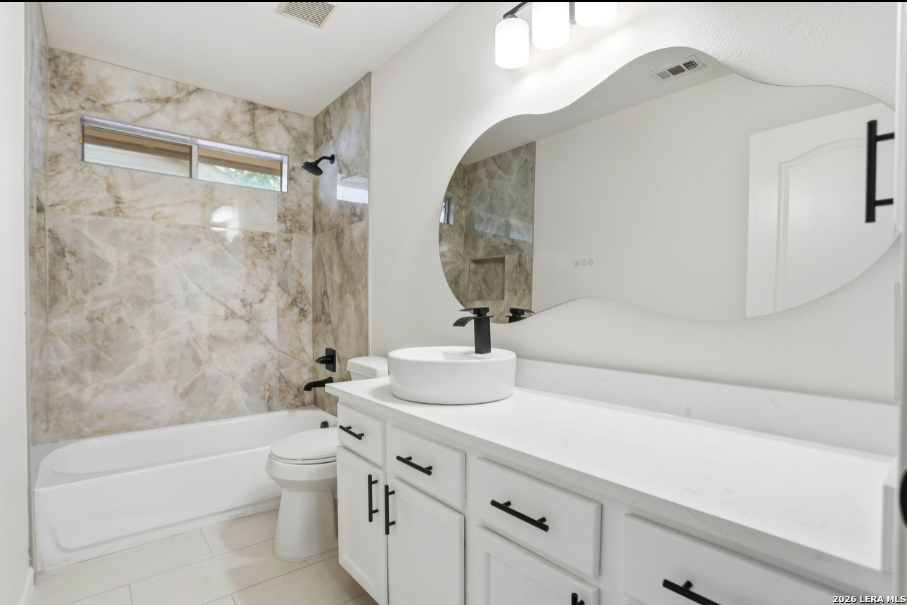 Welcome to this charming spacious renovated home that offers an open floor plan with an office/study big enough to be used for an additional bedroom if desired. This property features a formal dining area with an updated kitchen to include new quartz countertops an eat in kitchen nook making this great for entertaining.The main living area is designed for comfort featuring luxury vinyl plank flooring throughout the main areas of the home. The master retreat offers a peaceful escape with a dual quartz vanity a frameless shower glass and garden tub bath with a large walk-in closet, while two additional bedrooms provide flexibility for family/guest needs. Outside you will find a nice covered patio with mature trees on a greenbelt. This property is conveniently located near Loop 1604 minuets away from shopping schools and entertainment. Come tour this beauty today