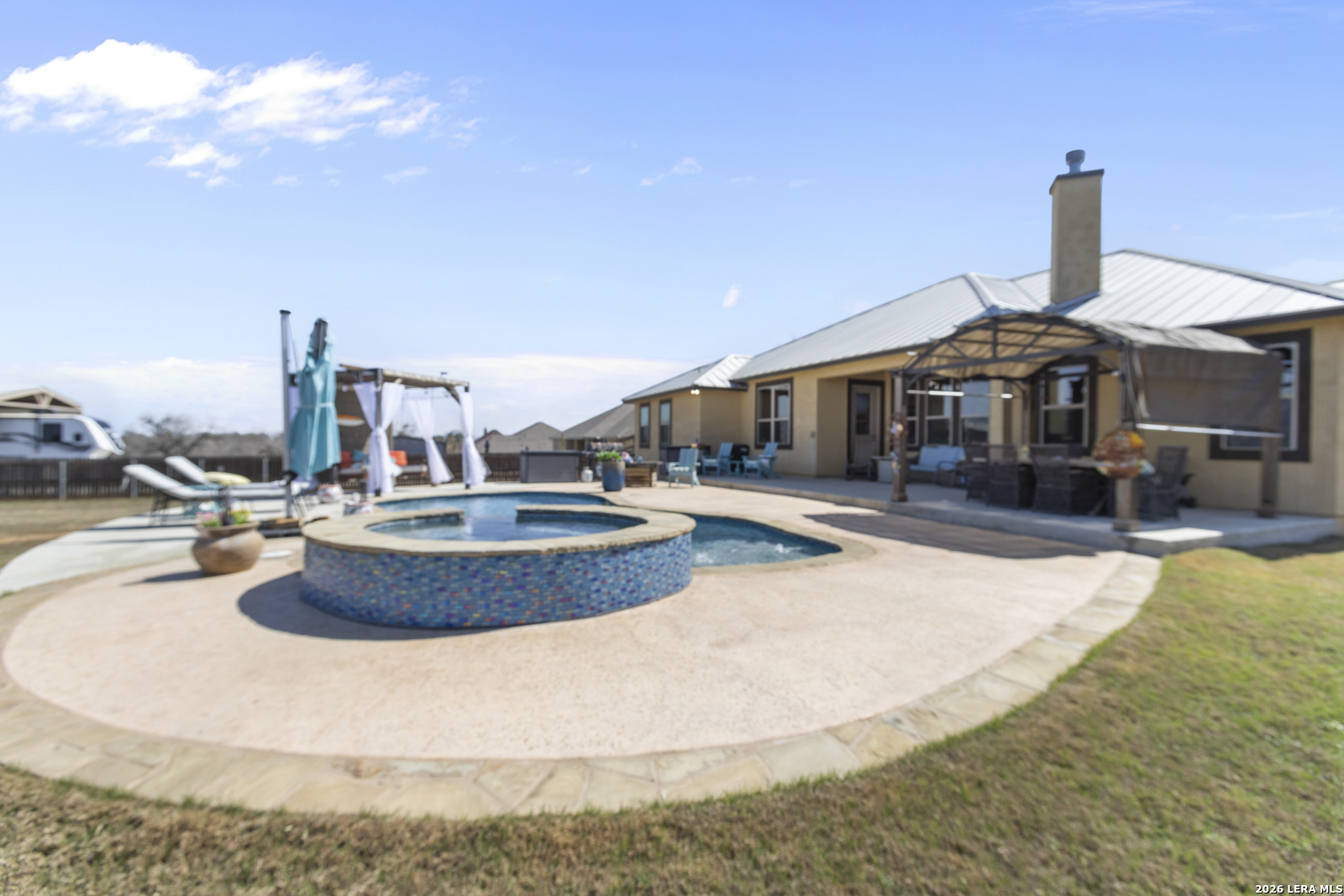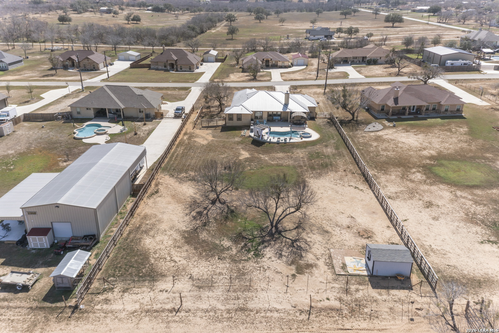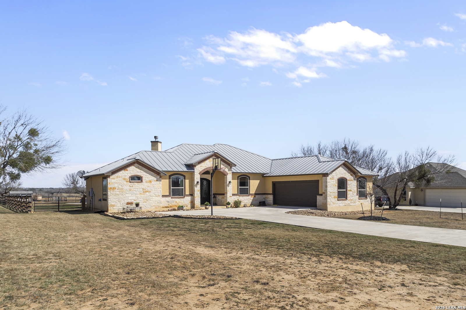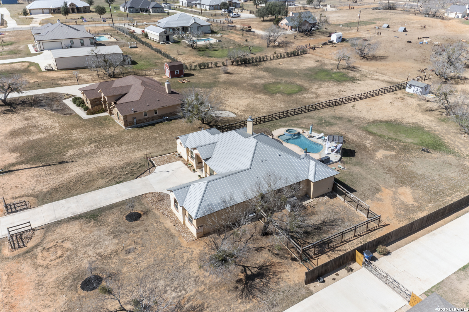 Welcome to 109 Colibro Creek in La Vernia, TX 78121. This absolutely gorgeous single story home sits on a full acre in a quiet one street community with only 12 homes. Offering over 2,700 square feet, this 4 bedroom, 3.5 bath residence is filled with quality details throughout. From the moment you arrive, the oversized metal front doors make a stunning first impression. Inside, you will find an open floor plan with LVP flooring and hand textured walls. The spacious living room features a beautiful fireplace and flows seamlessly into the large kitchen, creating the perfect space for everyday living and entertaining. The kitchen offers a generous island, stainless steel appliances, abundant cabinet space, and plenty of room to gather. The primary suite is a true retreat with a large bedroom and a luxurious bathroom that includes a whirlpool tub, separate shower, dual vanities, and his and hers walk in closets. One secondary bedroom has its own full bath, while two additional bedrooms share a convenient Jack and Jill bathroom. There is also an additional half bath for guests. At the front of the home, you will find a dedicated office space. A large utility room and an extra wide two car garage provide added functionality. This all electric home is built for efficiency with spray foam insulation and a durable metal roof to help keep energy costs down. Step outside to enjoy the covered back patio overlooking a beautiful in ground pool and a spacious backyard with plenty of room to relax or entertain. If you are looking for space, privacy, and quality craftsmanship in La Vernia, this home has it all.