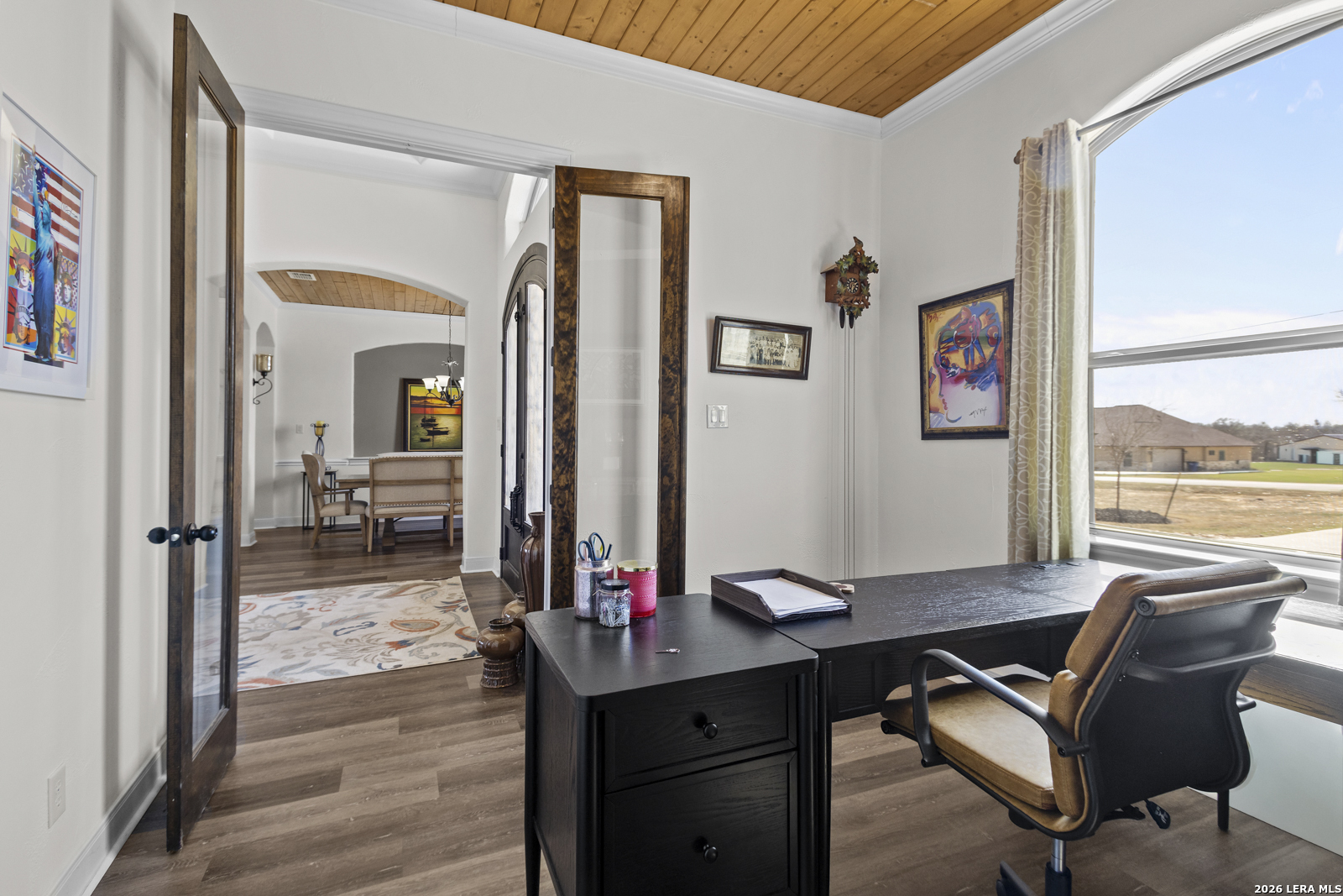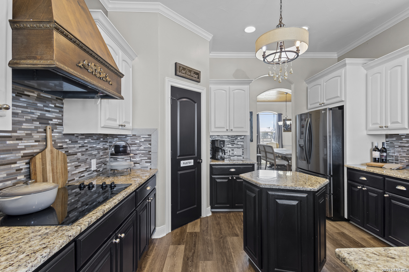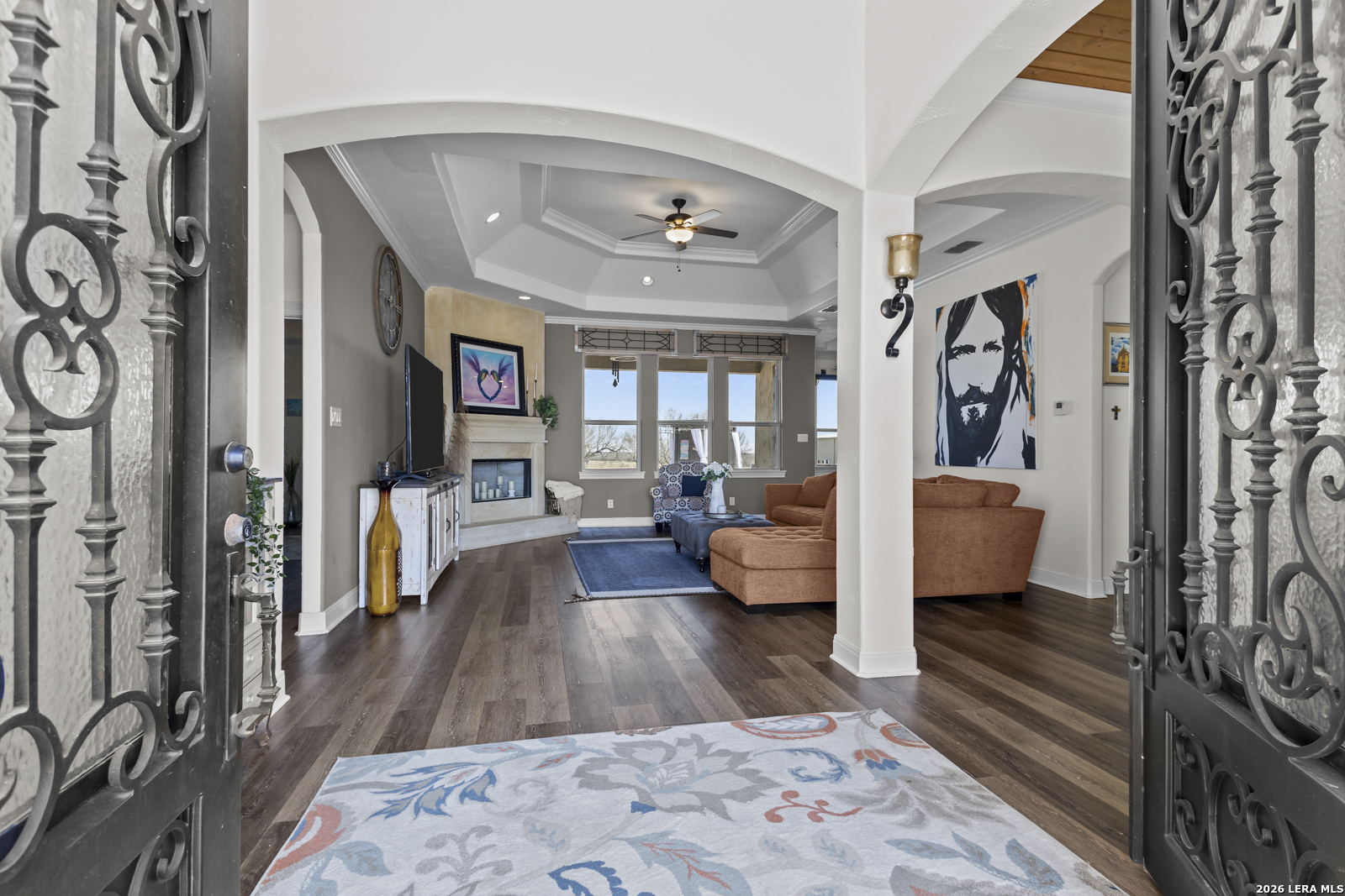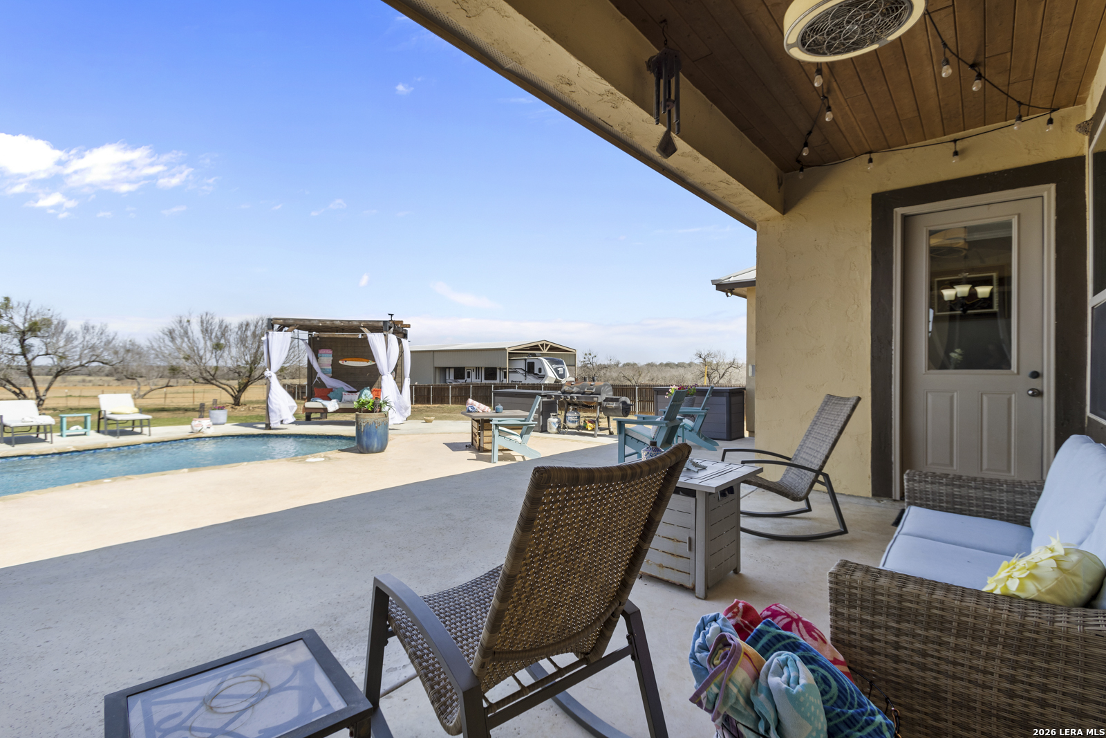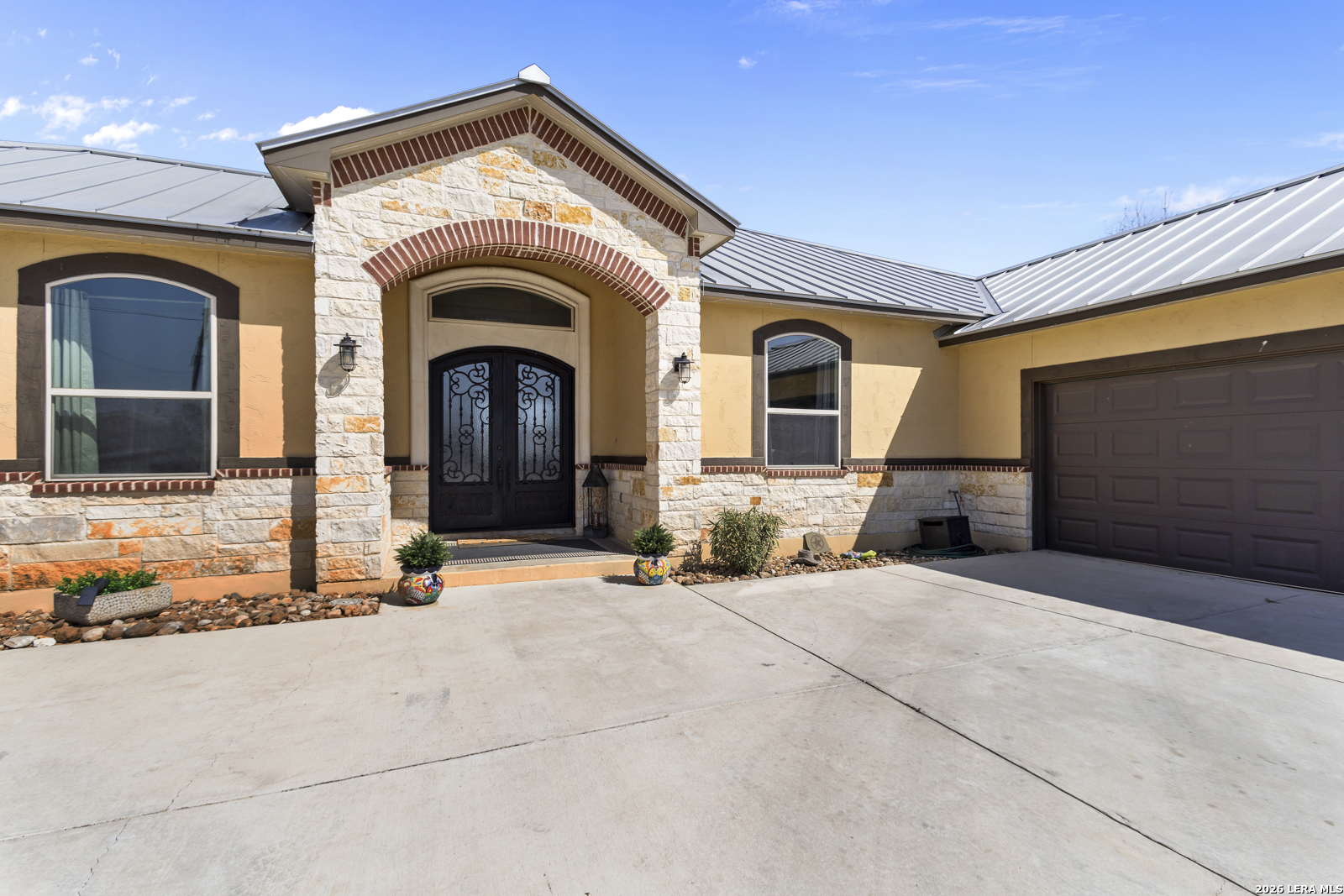 Welcome to 109 Colibro Creek in La Vernia, TX 78121. This absolutely gorgeous single story home sits on a full acre in a quiet one street community with only 12 homes. Offering over 2,700 square feet, this 4 bedroom, 3.5 bath residence is filled with quality details throughout. From the moment you arrive, the oversized metal front doors make a stunning first impression. Inside, you will find an open floor plan with LVP flooring and hand textured walls. The spacious living room features a beautiful fireplace and flows seamlessly into the large kitchen, creating the perfect space for everyday living and entertaining. The kitchen offers a generous island, stainless steel appliances, abundant cabinet space, and plenty of room to gather. The primary suite is a true retreat with a large bedroom and a luxurious bathroom that includes a whirlpool tub, separate shower, dual vanities, and his and hers walk in closets. One secondary bedroom has its own full bath, while two additional bedrooms share a convenient Jack and Jill bathroom. There is also an additional half bath for guests. At the front of the home, you will find a dedicated office space. A large utility room and an extra wide two car garage provide added functionality. This all electric home is built for efficiency with spray foam insulation and a durable metal roof to help keep energy costs down. Step outside to enjoy the covered back patio overlooking a beautiful in ground pool and a spacious backyard with plenty of room to relax or entertain. If you are looking for space, privacy, and quality craftsmanship in La Vernia, this home has it all.