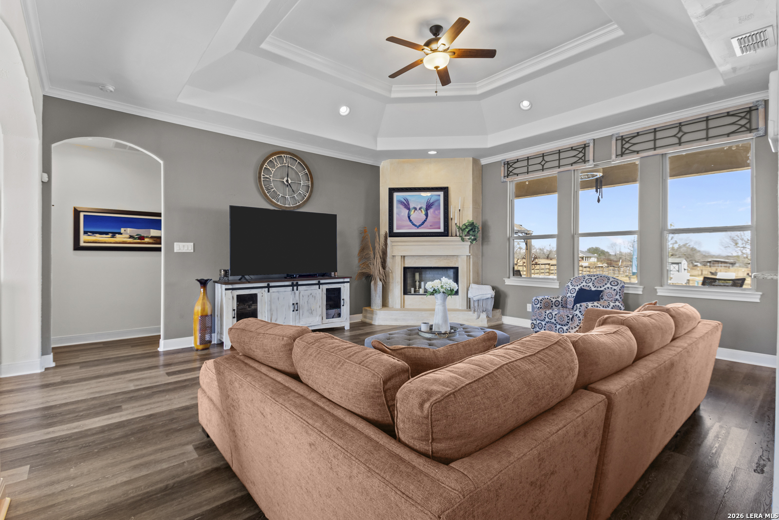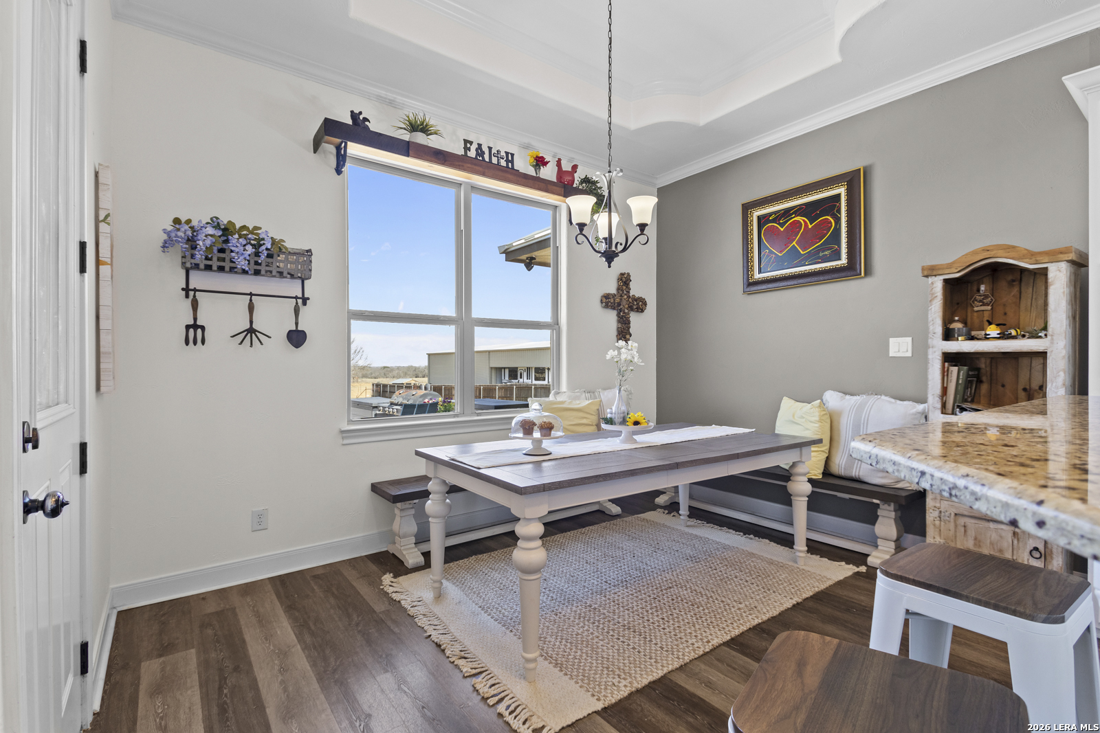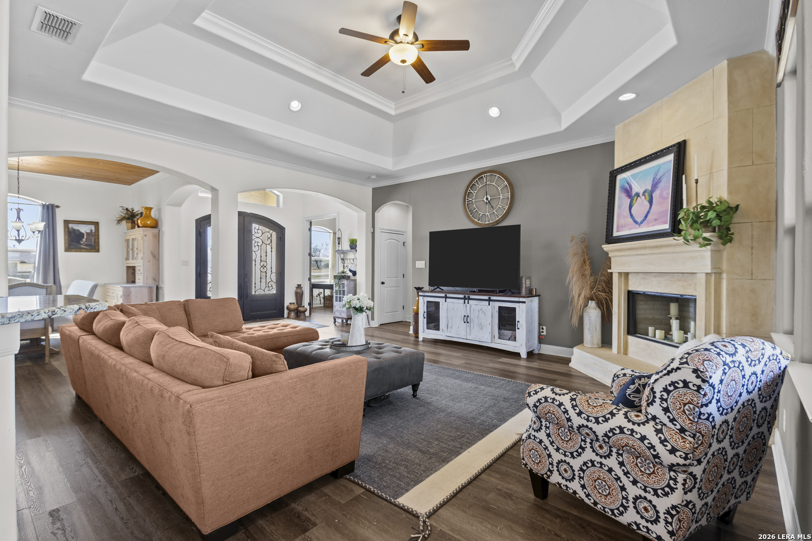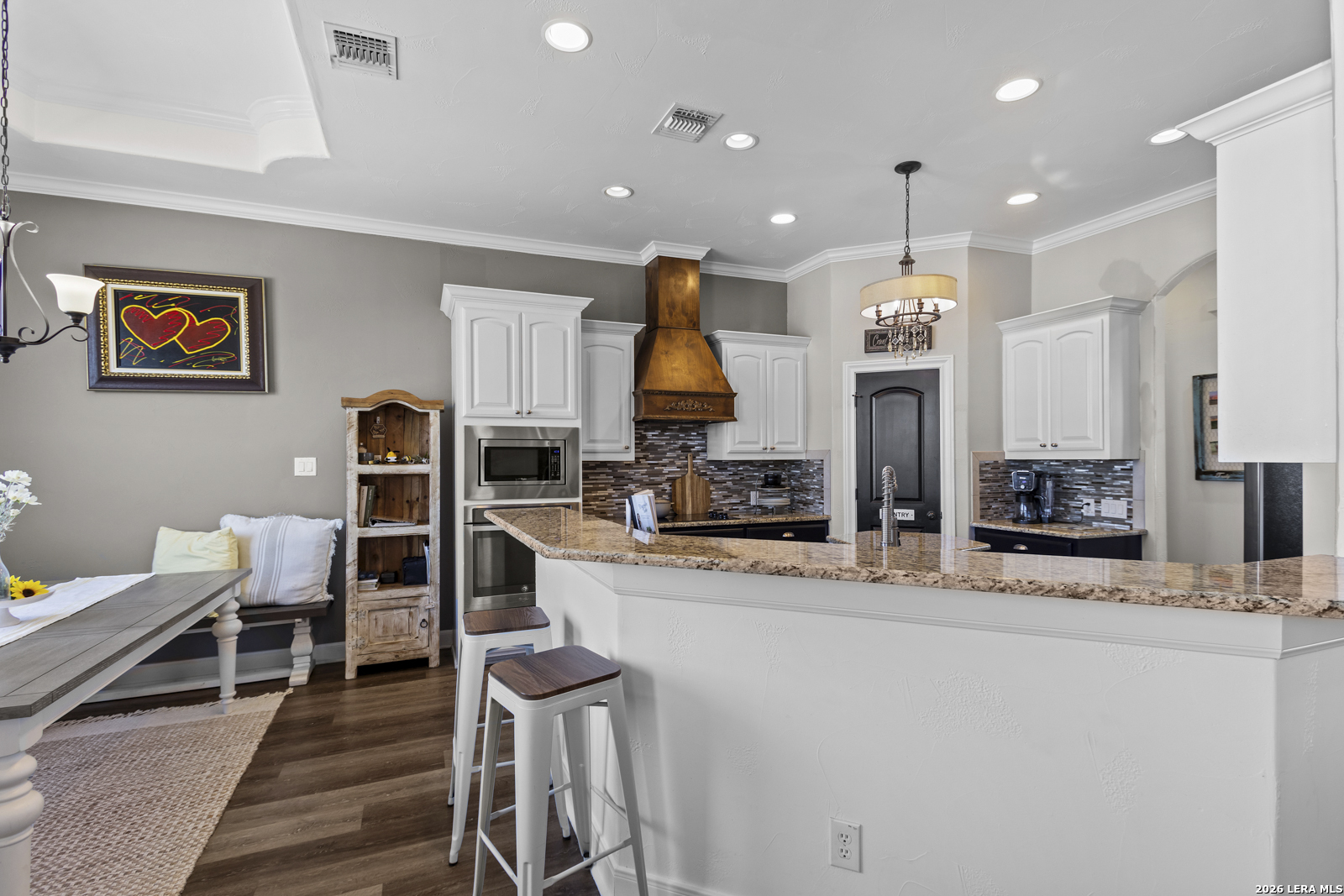 Welcome to 109 Colibro Creek in La Vernia, TX 78121. This absolutely gorgeous single story home sits on a full acre in a quiet one street community with only 12 homes. Offering over 2,700 square feet, this 4 bedroom, 3.5 bath residence is filled with quality details throughout. From the moment you arrive, the oversized metal front doors make a stunning first impression. Inside, you will find an open floor plan with LVP flooring and hand textured walls. The spacious living room features a beautiful fireplace and flows seamlessly into the large kitchen, creating the perfect space for everyday living and entertaining. The kitchen offers a generous island, stainless steel appliances, abundant cabinet space, and plenty of room to gather. The primary suite is a true retreat with a large bedroom and a luxurious bathroom that includes a whirlpool tub, separate shower, dual vanities, and his and hers walk in closets. One secondary bedroom has its own full bath, while two additional bedrooms share a convenient Jack and Jill bathroom. There is also an additional half bath for guests. At the front of the home, you will find a dedicated office space. A large utility room and an extra wide two car garage provide added functionality. This all electric home is built for efficiency with spray foam insulation and a durable metal roof to help keep energy costs down. Step outside to enjoy the covered back patio overlooking a beautiful in ground pool and a spacious backyard with plenty of room to relax or entertain. If you are looking for space, privacy, and quality craftsmanship in La Vernia, this home has it all.