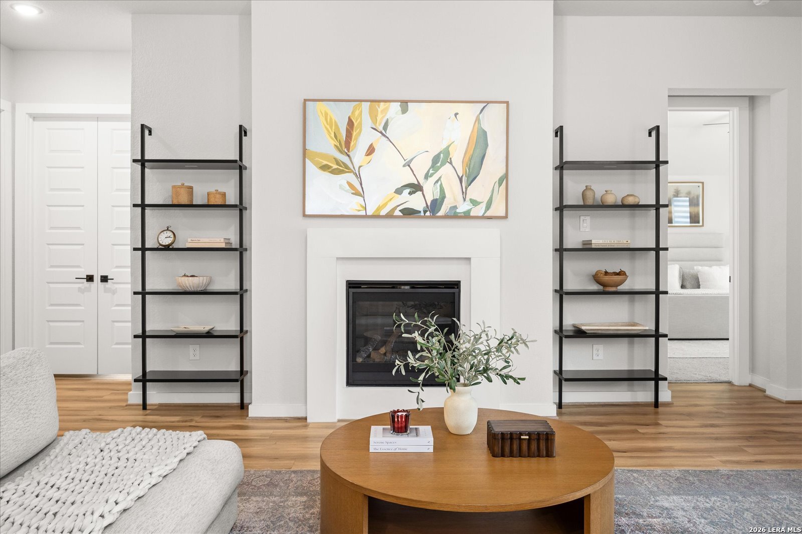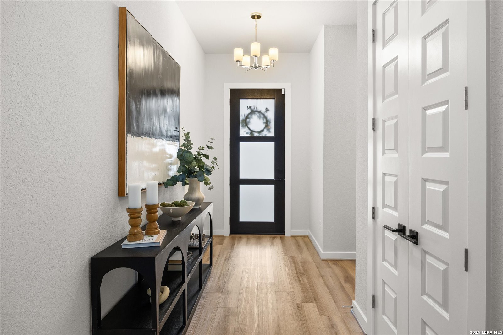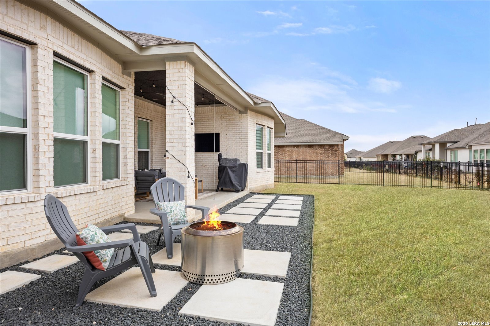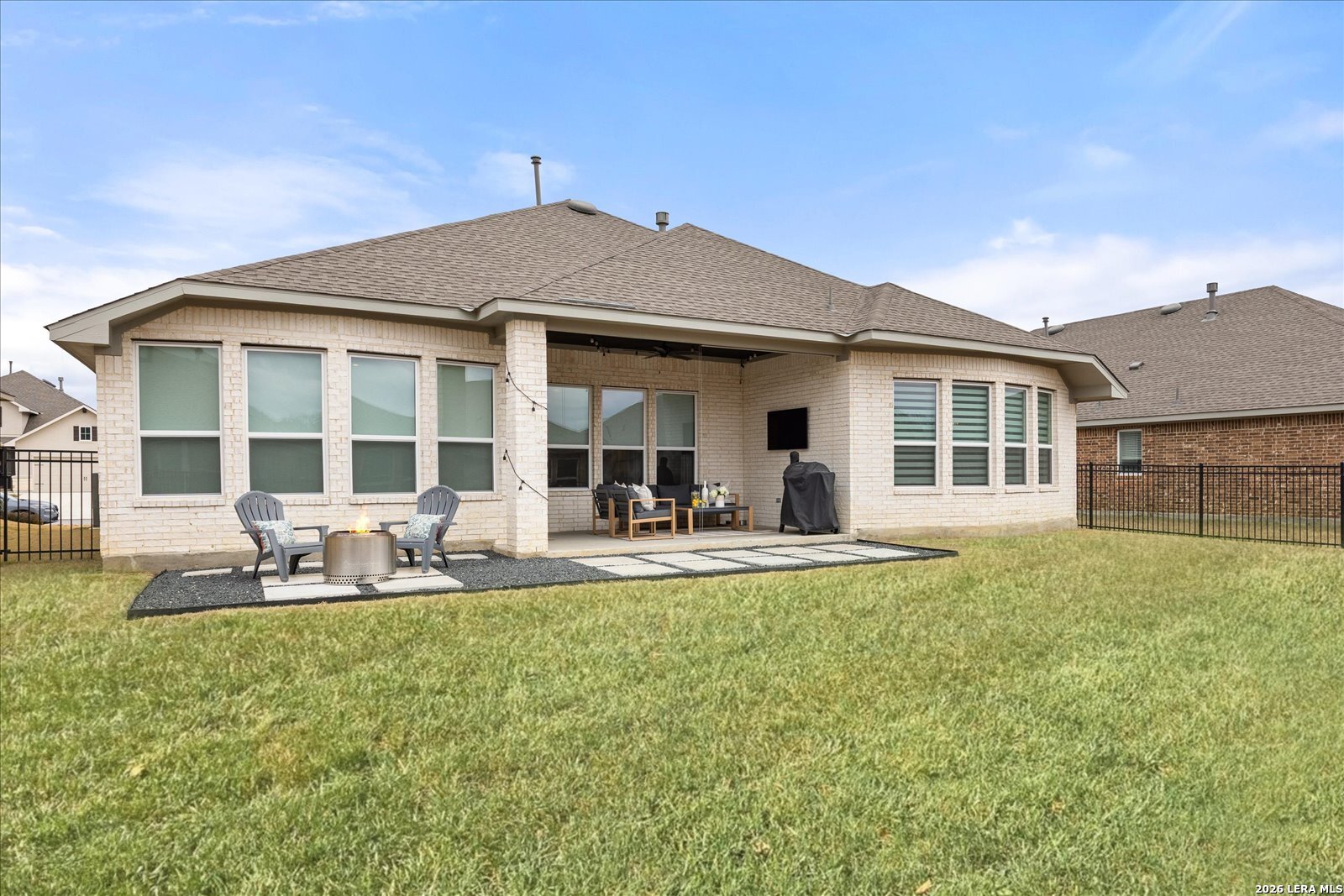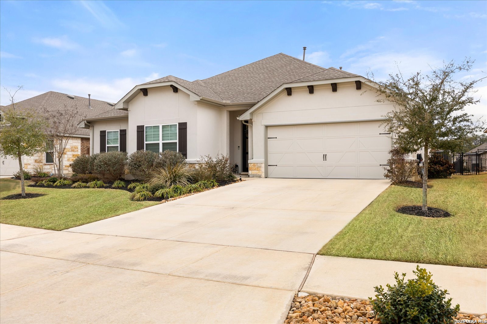 Welcome to 109 Valencia, a stunning Scott Felder-built home located in the award-winning community of Esperanza. Impeccably maintained and truly turn-key, this home showcases modern finishes, a beautifully curated color palette, a thoughtful layout and a warm, welcoming atmosphere that immediately feels just like home the moment you step inside! You're greeted by an elegant gallery-style entry, golden vinyl flooring and 8-foot interior doors throughout, setting the tone for the home's upscale design. The light-filled, open-concept floor plan centers around an oversized family room with a gas fireplace and custom shelving creating an inviting space for both everyday living and entertaining. The spacious kitchen is a true focal point, featuring a large center island with bar seating, quartz countertops, stainless steel appliances, a gas cooktop, soft close drawers, abundant cabinetry, upgraded faucets, and modern pendant lighting, with seamless flow into the dining space. Remote-controlled window coverings are present for both convenience and privacy. The primary suite is a serene private retreat, complete with gorgeous windows, a spa-like bathroom, dual vanities complemented with upgraded mirrors, a glass-enclosed all tile shower, and two oversized walk-in closets. Carpet is thoughtfully limited to the bedrooms, making for cozy, comfortable spaces while allowing for durability and easy maintenance throughout the main living areas. Two secondary bedrooms are privately tucked away in their own wing of the home, while a dedicated home gym or flex space adds great versatility. Perfect for your lifestyle of fitness, working from home, a darling nursery, or any of your personal hobbies. Step into the backyard and enjoy an extended covered patio complete with electric remote-controlled screens, concrete pavers that expand outdoor living, a full-yard sprinkler system and gas and water pre-plumbed for a future outdoor kitchen. A perfect setting to enjoy the Texas Hill Country year-round. Inside and out, thoughtful upgrades include a whole-home water filtration system, decorator designs, mudroom / coat rack, double-pane windows, front gutters, and plenty of lush existing landscaping that overall showcases the exceptional quality this home has to offer. Residents of Esperanza enjoy unmatched neighborhood amenities, including a resort-style pool, lazy river, kids splash pad, fitness center, sand volleyball courts, dog parks, and more! This home offers the perfect blend of luxury, lifestyle, and location- you could have the best of Esperanza living without having the wait to build! Schedule your showing today!