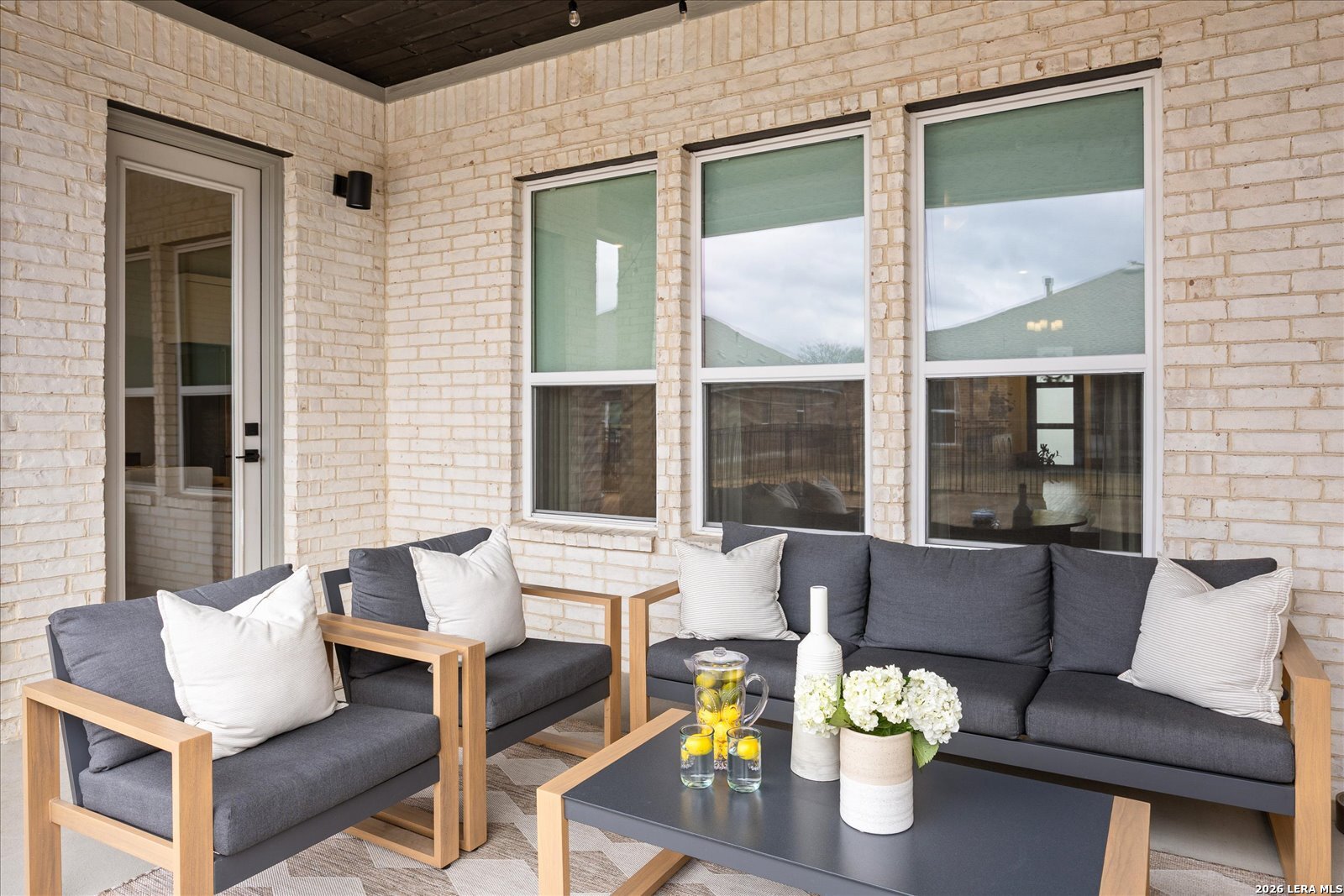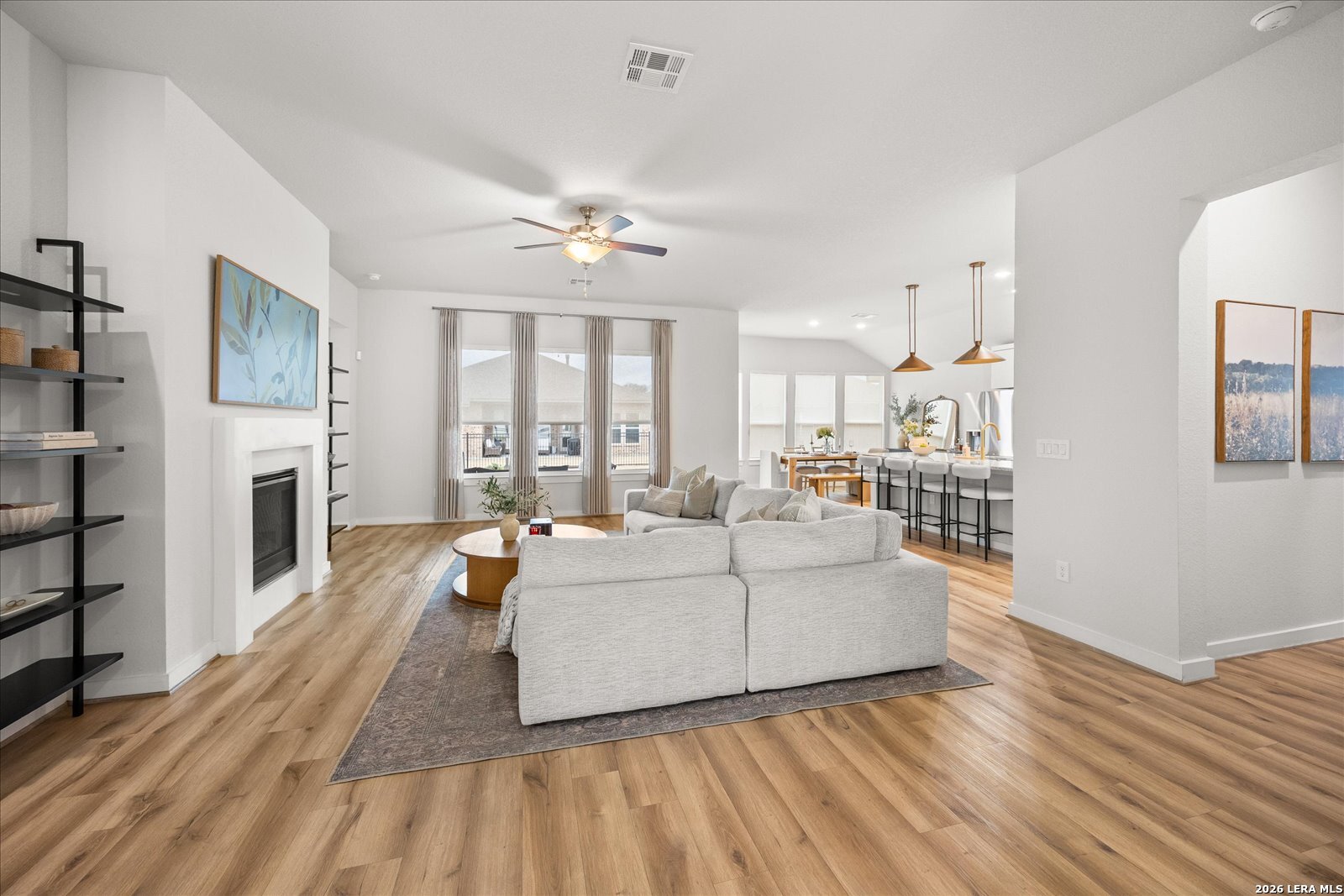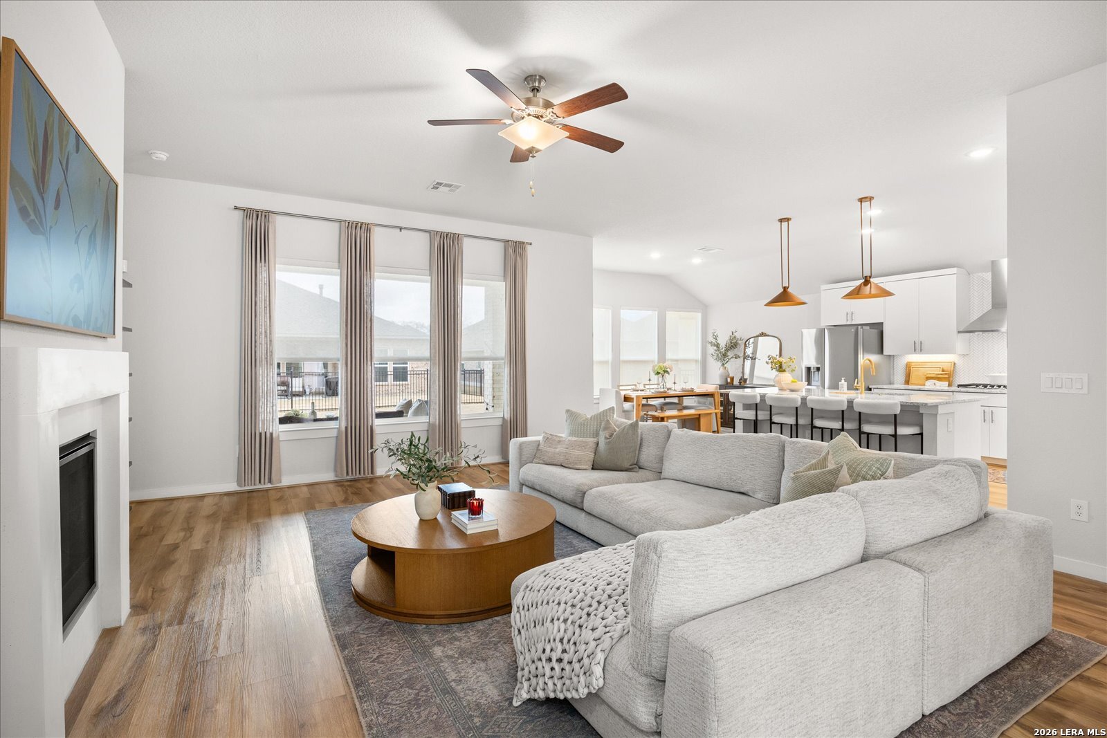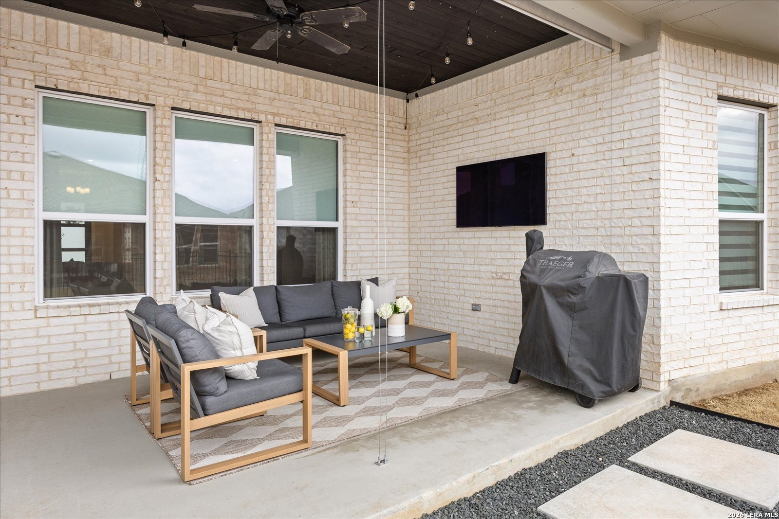 Welcome to 109 Valencia, a stunning Scott Felder-built home located in the award-winning community of Esperanza. Impeccably maintained and truly turn-key, this home showcases modern finishes, a beautifully curated color palette, a thoughtful layout and a warm, welcoming atmosphere that immediately feels just like home the moment you step inside! You're greeted by an elegant gallery-style entry, golden vinyl flooring and 8-foot interior doors throughout, setting the tone for the home's upscale design. The light-filled, open-concept floor plan centers around an oversized family room with a gas fireplace and custom shelving creating an inviting space for both everyday living and entertaining. The spacious kitchen is a true focal point, featuring a large center island with bar seating, quartz countertops, stainless steel appliances, a gas cooktop, soft close drawers, abundant cabinetry, upgraded faucets, and modern pendant lighting, with seamless flow into the dining space. Remote-controlled window coverings are present for both convenience and privacy. The primary suite is a serene private retreat, complete with gorgeous windows, a spa-like bathroom, dual vanities complemented with upgraded mirrors, a glass-enclosed all tile shower, and two oversized walk-in closets. Carpet is thoughtfully limited to the bedrooms, making for cozy, comfortable spaces while allowing for durability and easy maintenance throughout the main living areas. Two secondary bedrooms are privately tucked away in their own wing of the home, while a dedicated home gym or flex space adds great versatility. Perfect for your lifestyle of fitness, working from home, a darling nursery, or any of your personal hobbies. Step into the backyard and enjoy an extended covered patio complete with electric remote-controlled screens, concrete pavers that expand outdoor living, a full-yard sprinkler system and gas and water pre-plumbed for a future outdoor kitchen. A perfect setting to enjoy the Texas Hill Country year-round. Inside and out, thoughtful upgrades include a whole-home water filtration system, decorator designs, mudroom / coat rack, double-pane windows, front gutters, and plenty of lush existing landscaping that overall showcases the exceptional quality this home has to offer. Residents of Esperanza enjoy unmatched neighborhood amenities, including a resort-style pool, lazy river, kids splash pad, fitness center, sand volleyball courts, dog parks, and more! This home offers the perfect blend of luxury, lifestyle, and location- you could have the best of Esperanza living without having the wait to build! Schedule your showing today!