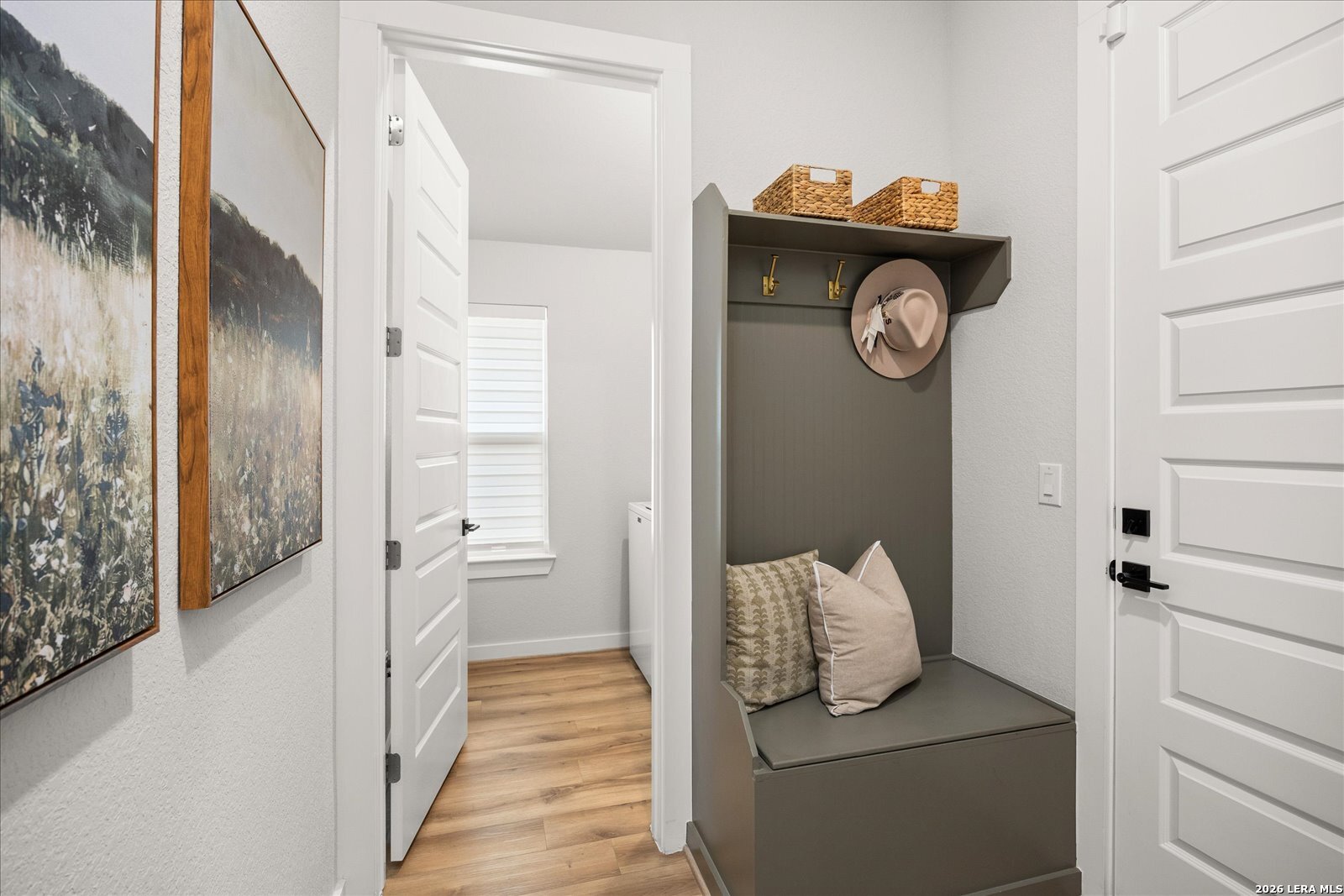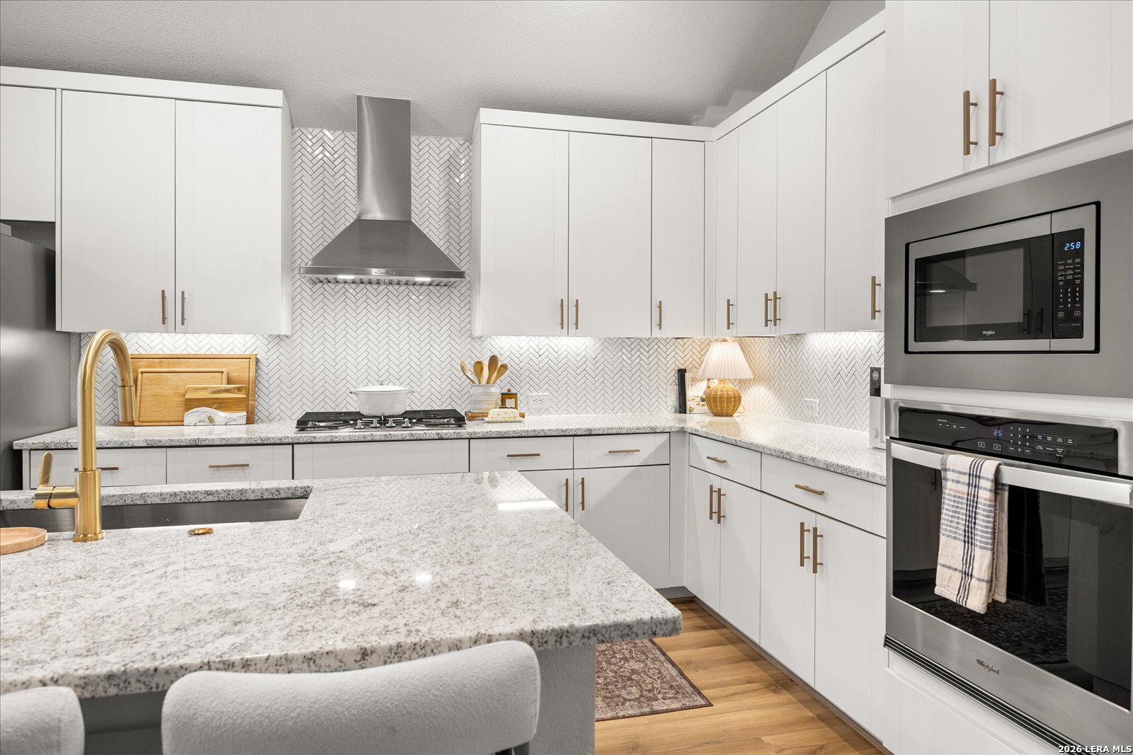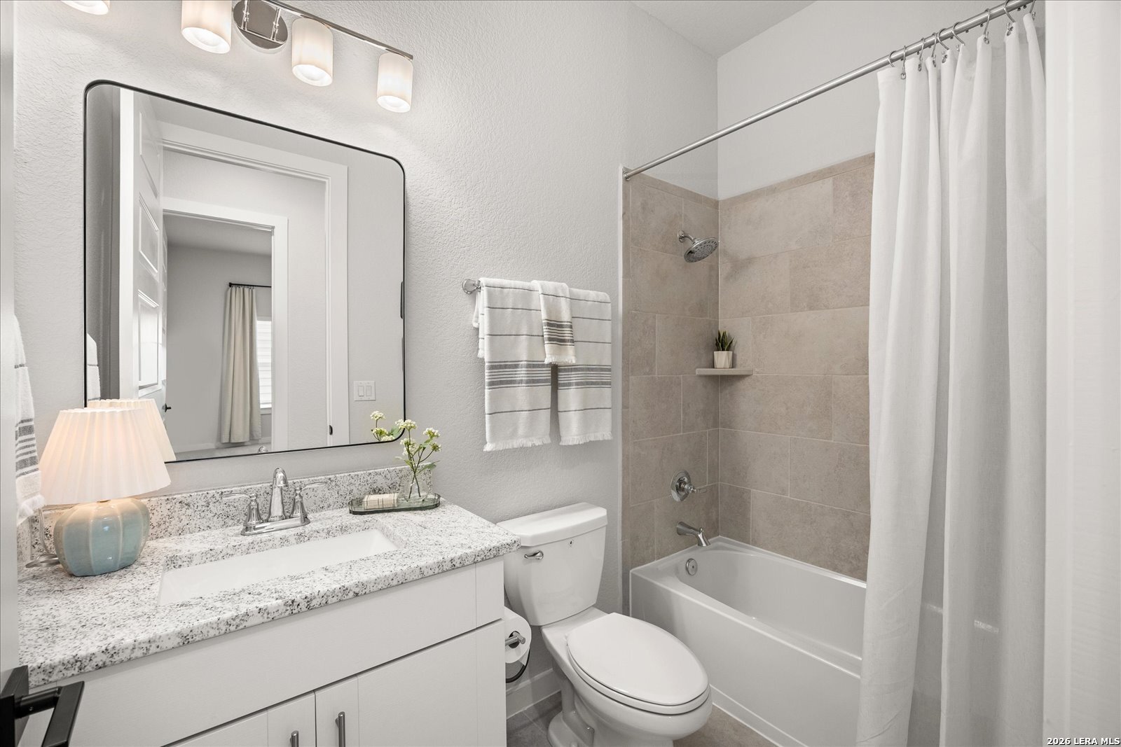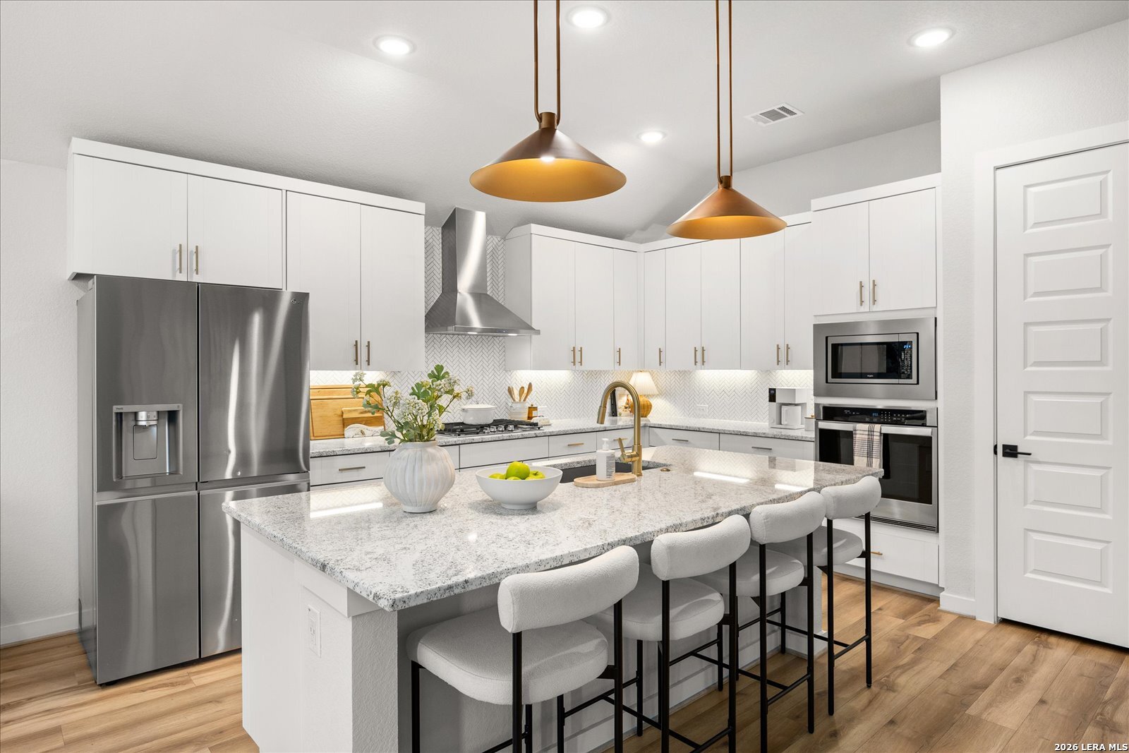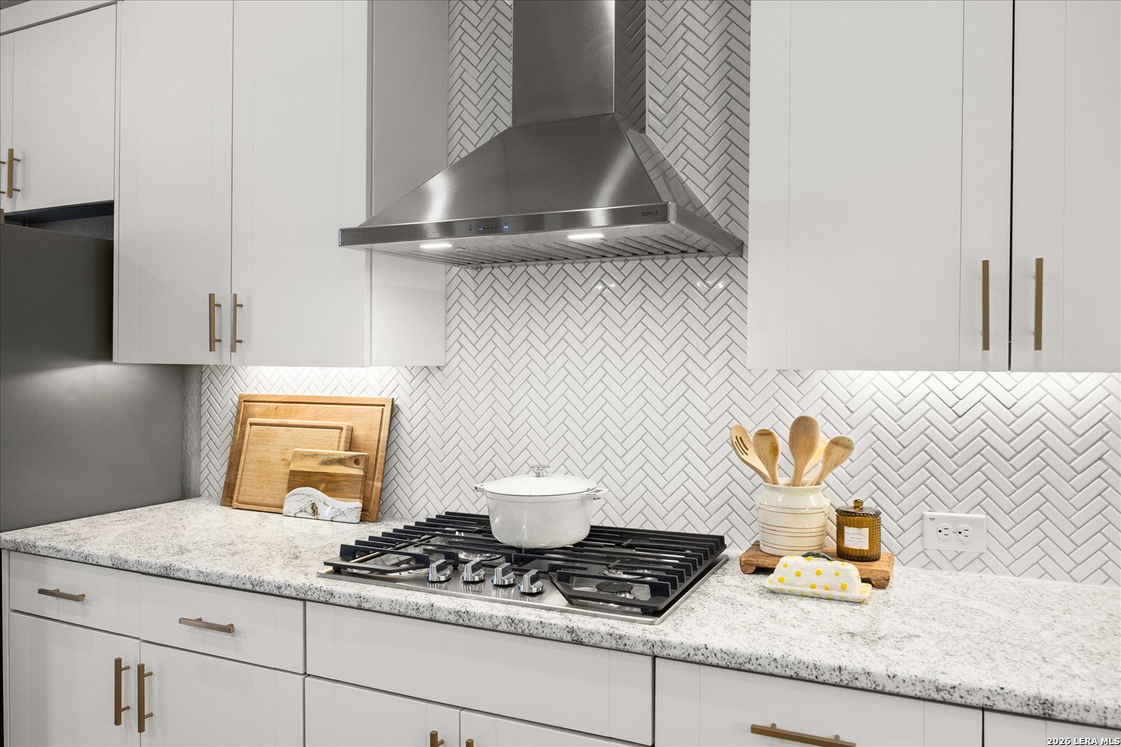 Welcome to 109 Valencia, a stunning Scott Felder-built home located in the award-winning community of Esperanza. Impeccably maintained and truly turn-key, this home showcases modern finishes, a beautifully curated color palette, a thoughtful layout and a warm, welcoming atmosphere that immediately feels just like home the moment you step inside! You're greeted by an elegant gallery-style entry, golden vinyl flooring and 8-foot interior doors throughout, setting the tone for the home's upscale design. The light-filled, open-concept floor plan centers around an oversized family room with a gas fireplace and custom shelving creating an inviting space for both everyday living and entertaining. The spacious kitchen is a true focal point, featuring a large center island with bar seating, quartz countertops, stainless steel appliances, a gas cooktop, soft close drawers, abundant cabinetry, upgraded faucets, and modern pendant lighting, with seamless flow into the dining space. Remote-controlled window coverings are present for both convenience and privacy. The primary suite is a serene private retreat, complete with gorgeous windows, a spa-like bathroom, dual vanities complemented with upgraded mirrors, a glass-enclosed all tile shower, and two oversized walk-in closets. Carpet is thoughtfully limited to the bedrooms, making for cozy, comfortable spaces while allowing for durability and easy maintenance throughout the main living areas. Two secondary bedrooms are privately tucked away in their own wing of the home, while a dedicated home gym or flex space adds great versatility. Perfect for your lifestyle of fitness, working from home, a darling nursery, or any of your personal hobbies. Step into the backyard and enjoy an extended covered patio complete with electric remote-controlled screens, concrete pavers that expand outdoor living, a full-yard sprinkler system and gas and water pre-plumbed for a future outdoor kitchen. A perfect setting to enjoy the Texas Hill Country year-round. Inside and out, thoughtful upgrades include a whole-home water filtration system, decorator designs, mudroom / coat rack, double-pane windows, front gutters, and plenty of lush existing landscaping that overall showcases the exceptional quality this home has to offer. Residents of Esperanza enjoy unmatched neighborhood amenities, including a resort-style pool, lazy river, kids splash pad, fitness center, sand volleyball courts, dog parks, and more! This home offers the perfect blend of luxury, lifestyle, and location- you could have the best of Esperanza living without having the wait to build! Schedule your showing today!