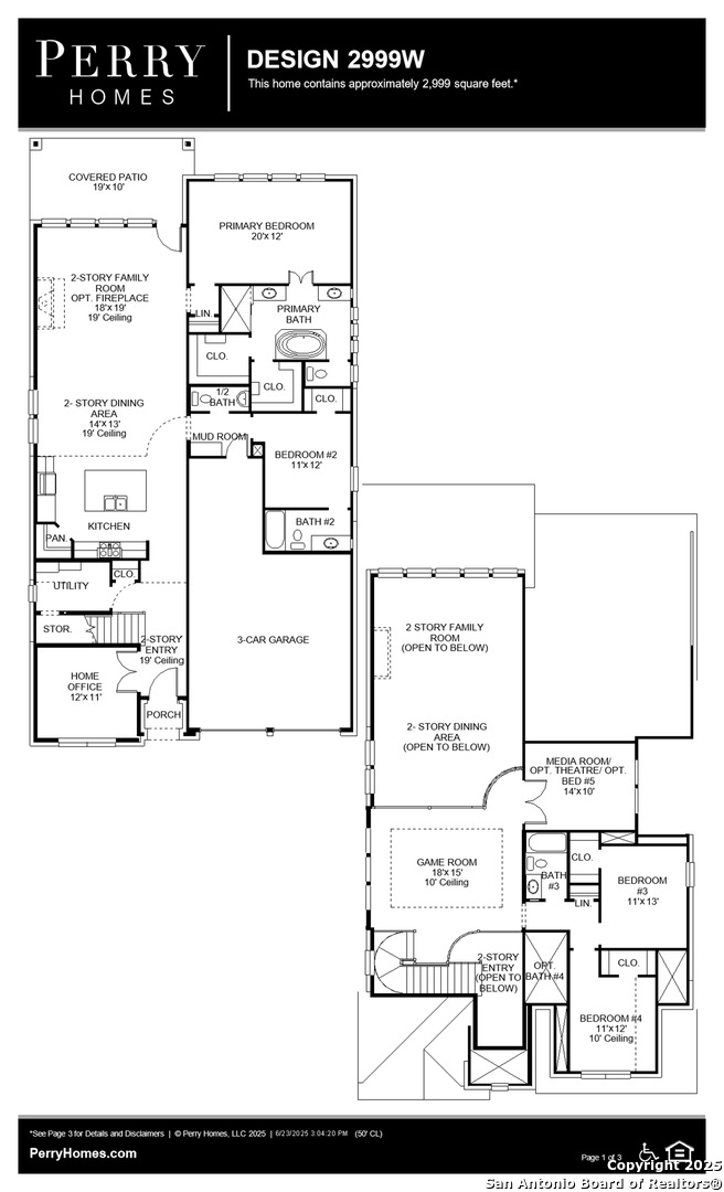 Home office with French doors set at two-story entry. Open kitchen hosts inviting island with built-in seating space. Two-story dining area opens to two-story family room with wall of windows. First-floor primary suite with wall of windows. Dual vanities, garden tub, separate glass-enclosed shower and two walk-in closets in primary bath. A guest suite with full bath is downstairs. Secondary bedrooms, a game room and media room with French doors are upstairs. All bedrooms include walk-in closets. Covered backyard patio. Mud room off three-car garage.