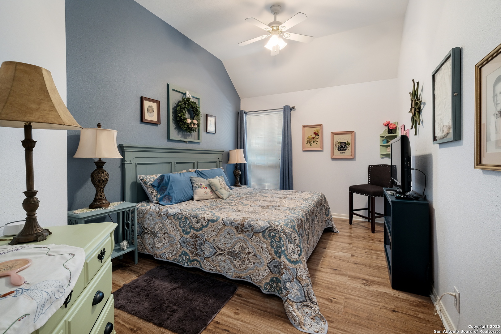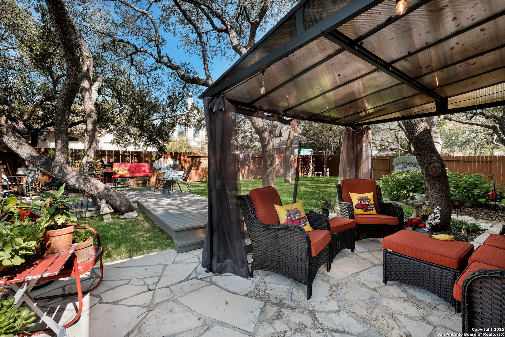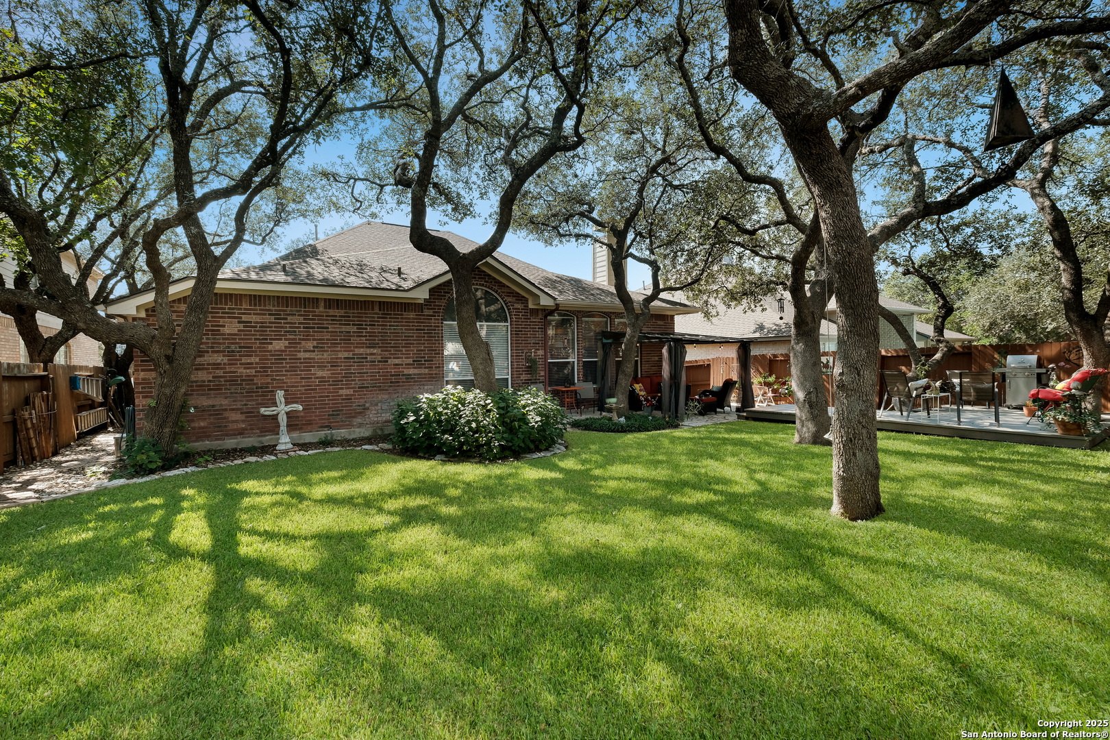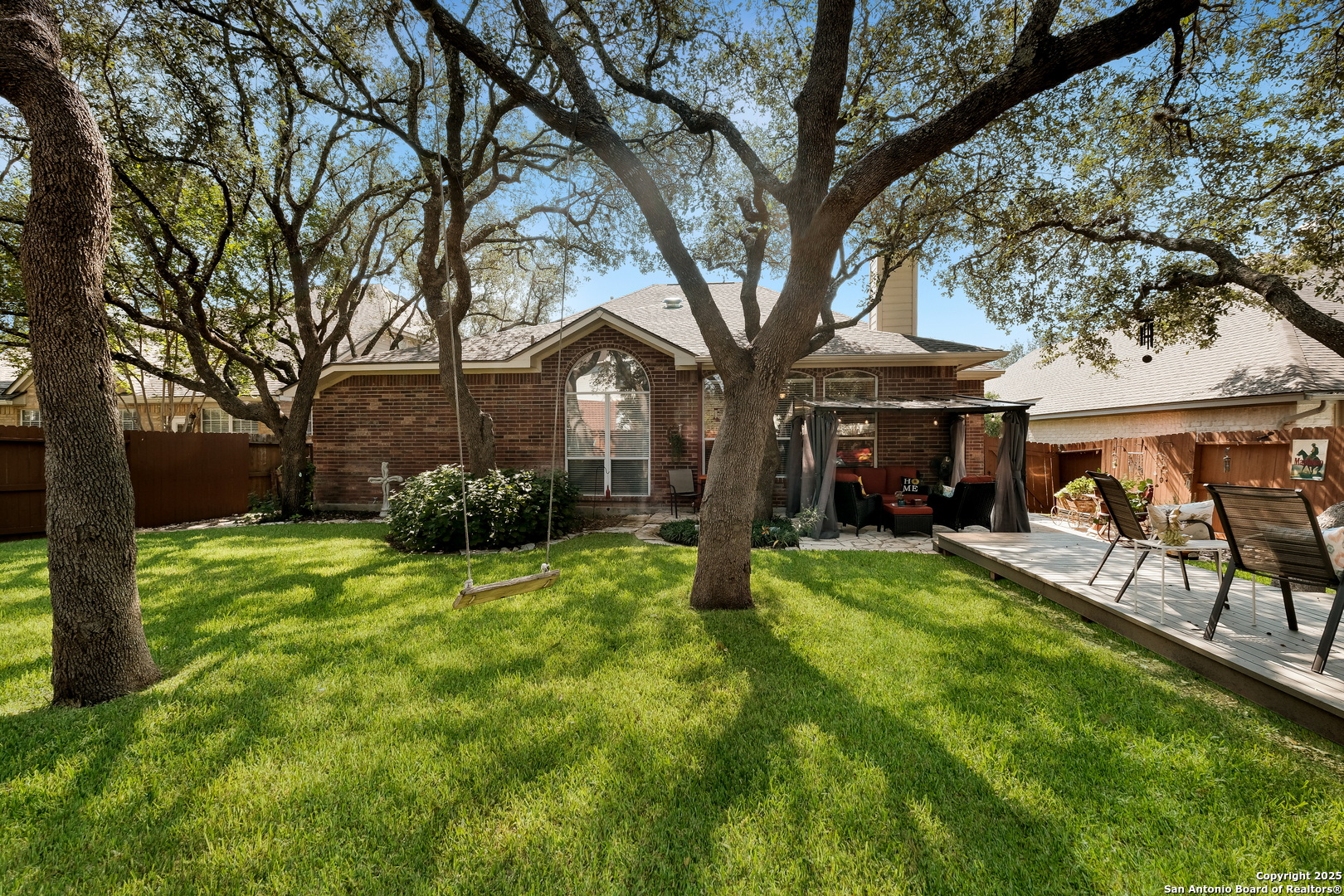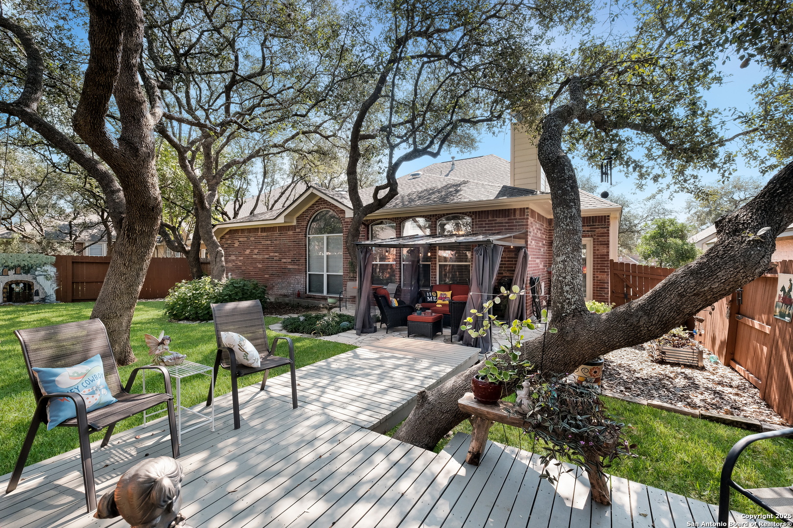 Welcome to this meticulously maintained home tucked away in a quiet cul de sac within a gated community in the heart of Stone Oak. Inside, you'll find a completely carpet free interior and a fresh kitchen with granite countertops and new appliances (2023) including a gas stove, dishwasher, microwave, and refrigerator that will stay. A block carbon water filter has been added under the sink, and a water softener serves the entire home for better water quality. The primary suite features an oversized walk in shower, while the garage offers built in shelving for extra storage. Step outside to your private oasis surrounded by mature oak trees. The backyard has been thoughtfully improved with a new deck, a canopy that will convey and is perfect for relaxing or entertaining. Leaf guard gutters by LeafFilter and a full sprinkler system in the front and back keep maintenance simple. This move in ready home blends comfort, convenience, and peace of mind in one of the community's most desirable locations in Stone Oak.